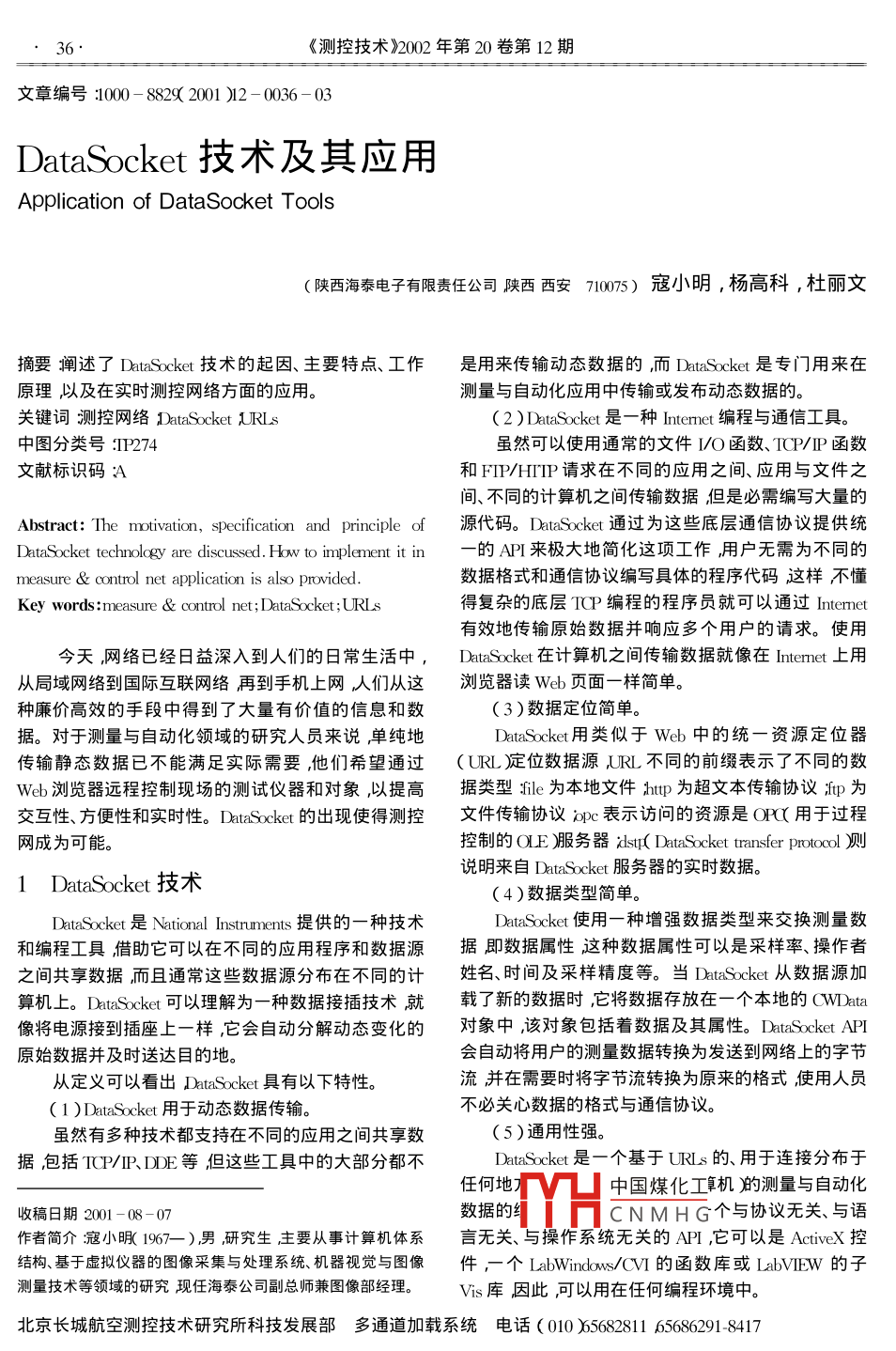 《測(cè)控技術(shù)》2002年第20卷第12期文章編號(hào):1000-88292001)2-0036-03Data Socket技術(shù)及其應(yīng)用Application of Data Socket Tools陜西海泰電子有限責(zé)任公司陜西西安71005)寇小明,楊高科,杜麗文摘要闡述了 DataSocket技術(shù)的起因、主要特點(diǎn)、工作是用來(lái)傳輸動(dòng)態(tài)數(shù)據(jù)的而 Data Socket是專(zhuān)門(mén)用來(lái)在原理以及在實(shí)時(shí)測(cè)控網(wǎng)絡(luò)方面的應(yīng)用。測(cè)量與自動(dòng)化應(yīng)用中傳輸或發(fā)布動(dòng)態(tài)數(shù)據(jù)的。關(guān)鍵詞測(cè)控網(wǎng)絡(luò) ataSocket jRLs(2) DataSocket是一種 Internet編程與通信工具。中圖分類(lèi)號(hào):II274雖然可以使用通常的文件/O函數(shù)、P/m函數(shù)文獻(xiàn)標(biāo)識(shí)碼A和FIP/HIP請(qǐng)求在不同的應(yīng)用之間、應(yīng)用與文件之間、不同的計(jì)算機(jī)之間傳輸數(shù)據(jù)但是必需編寫(xiě)大量的Abstract: The motivation, specification and principle of源代碼。 Datasκket通過(guò)為這些底層通信協(xié)議提供統(tǒng)Data Socket technolagy are discussed. How to implement it in-的A來(lái)極大地簡(jiǎn)化這項(xiàng)工作用戶無(wú)需為不同的measure control net application is also provided數(shù)據(jù)格式和通信協(xié)議編寫(xiě)具體的程序代碼這樣不懂Key words: measure control net Data Socket: URLS得復(fù)雜的底層T(P編程的程序員就可以通過(guò) tenet有效地傳輸原始數(shù)據(jù)并響應(yīng)多個(gè)用戶的請(qǐng)求。使用今天網(wǎng)絡(luò)已經(jīng)日益深入到人們的日常生活中, DataSocket在計(jì)算機(jī)之間傳輸數(shù)據(jù)就像在 Internet上用從局域網(wǎng)絡(luò)到國(guó)際互聯(lián)網(wǎng)絡(luò)再到手機(jī)上網(wǎng)人們從這瀏覽器讀Web頁(yè)面一樣簡(jiǎn)單種廉價(jià)高效的手段中得到了大量有價(jià)值的信息和數(shù)(3)數(shù)據(jù)定位簡(jiǎn)單。據(jù)。對(duì)于測(cè)量與自動(dòng)化領(lǐng)域的研究人員來(lái)說(shuō)單純地Data Socket用類(lèi)似于Web中的統(tǒng)一資源定位器傳輸靜態(tài)數(shù)據(jù)已不能滿足實(shí)際需要,他們希望通過(guò)(UR定位數(shù)據(jù)源JRL不同的前綴表示了不同的數(shù)Wb瀏覽器遠(yuǎn)程控制現(xiàn)場(chǎng)的測(cè)試儀器和對(duì)象,以提高據(jù)類(lèi)型le為本地文件hup為超文本傳輸協(xié)議加為交互性、方便性和實(shí)時(shí)性。 DataSocket的岀現(xiàn)使得測(cè)控文件傳輸協(xié)議c表示訪問(wèn)的資源是Or(用于過(guò)程網(wǎng)成為可能控制的OE服務(wù)器st( Data Socket transfer protocol1 Data Socket技術(shù)說(shuō)明來(lái)自 DataSocket服務(wù)器的實(shí)時(shí)數(shù)據(jù)(4)數(shù)據(jù)類(lèi)型簡(jiǎn)單。DataSocket是№ ational Instruments提供的一種技術(shù)ata Socket使用一種增強(qiáng)數(shù)據(jù)類(lèi)型來(lái)交換測(cè)量數(shù)和編程工具借助它可以在不同的應(yīng)用程序和數(shù)據(jù)源據(jù)即數(shù)據(jù)屬性這種數(shù)據(jù)屬性可以是采樣率、操作者之間共享數(shù)據(jù)而且通常這些數(shù)據(jù)源分布在不同的計(jì)姓名、時(shí)間及采樣精度等。當(dāng) DataSocket從數(shù)據(jù)源加算機(jī)上。Iλ ataSocket可以理解為一種數(shù)據(jù)接插技術(shù)就載了新的數(shù)據(jù)時(shí)它將數(shù)據(jù)存放在一個(gè)本地的(w)t像將電源接到插座上一樣,它會(huì)自動(dòng)分解動(dòng)態(tài)變化的對(duì)象中該對(duì)象包括著數(shù)據(jù)及其屬性。Dta> pocket aPi原始數(shù)據(jù)并及時(shí)送達(dá)目的地。會(huì)自動(dòng)將用戶的測(cè)量數(shù)據(jù)轉(zhuǎn)換為發(fā)送到網(wǎng)絡(luò)上的字節(jié)從定義可以看出 Data Socket具有以下特性流并在需要時(shí)將字節(jié)流轉(zhuǎn)換為原來(lái)的格式使用人員1) DataSocket用于動(dòng)態(tài)數(shù)據(jù)傳輸。不必關(guān)心數(shù)據(jù)的格式與通信協(xié)議。雖然有多種技術(shù)都支持在不同的應(yīng)用之間共享數(shù)(5)通用性強(qiáng)。據(jù)包括TP/、D等但這些工具中的大部分都不Data Socket是一個(gè)基于URLs的、用于連接分布于任何地V凵中國(guó)煤化工算機(jī)測(cè)量與自動(dòng)化收稿日期2001-08-07數(shù)據(jù)的CNMHG個(gè)與協(xié)議無(wú)關(guān)、與語(yǔ)作者簡(jiǎn)介寇小眠1967—),男,研究生主要從事計(jì)算機(jī)體系言無(wú)關(guān)、與操作系統(tǒng)無(wú)關(guān)的A,它可以是 Activex控結(jié)構(gòu)、基于虛擬儀器的圖像采集與處理系統(tǒng)、機(jī)器視覺(jué)與圖像件,個(gè) Labwindo/CⅥ的函數(shù)庫(kù)或 LabVIEw的子測(cè)量技術(shù)等領(lǐng)域的研究現(xiàn)任海泰公司副總師兼圖像部經(jīng)理。Ⅴs庫(kù)因此可以用在任何編程環(huán)境中。北京長(zhǎng)城航空測(cè)控技術(shù)研究所科技發(fā)展部多通道加載系統(tǒng)電話(010)5682811656862918417Data Socket技術(shù)及其應(yīng)用2 DataSocket的工作原理后為Fale;對(duì)Is寫(xiě)來(lái)講,不寫(xiě)時(shí)為 False,寫(xiě)以后為T(mén)ru。后兩種模式是在數(shù)據(jù)發(fā)生變化時(shí)自動(dòng)引發(fā)讀/圖1描述了 DataSocket的體系結(jié)構(gòu)。 DataSocket服寫(xiě)操作。務(wù)器的界面如圖2所示ata Socket通過(guò)統(tǒng)一資源定位URL來(lái)定位數(shù)據(jù)源和目標(biāo),它支