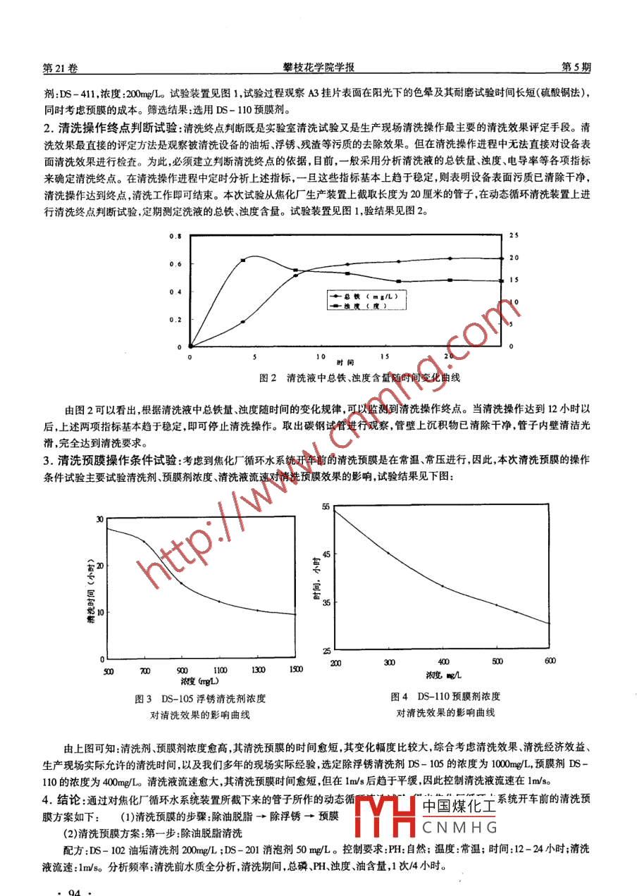 第21卷第5期攀枝花學(xué)院學(xué)報(bào)2004年10月Vol.21. No.5Joumal of Panzhihua UniversityOct.2004.●自然科學(xué)研究.焦化廠(chǎng)循環(huán)水系統(tǒng)開(kāi)車(chē)前的清洗預(yù)膜試驗(yàn)唐酞峰謝桂秀(攀枝花學(xué)院生物與化學(xué)工程系,四川攀枝花617000) (資陽(yáng)市雁江區(qū)第一中學(xué),四川資陽(yáng)641300)摘要本文對(duì)焦化廠(chǎng)循環(huán)水系統(tǒng)開(kāi)車(chē)前的清洗預(yù)膜進(jìn)行了動(dòng)態(tài)循環(huán)清洗預(yù)膜試驗(yàn),通過(guò)試驗(yàn),篩選出了相應(yīng)的清洗劑和預(yù)膜劑,確定出了清洗操作終點(diǎn)時(shí)間;清洗劑、預(yù)膜劑的清洗操作濃度、清洗預(yù)膜液PH、溫度及流速等操作條件,得出了相應(yīng)的焦化廠(chǎng)循環(huán)水系統(tǒng)開(kāi)車(chē)前的清洗預(yù)膜方案。該方案的得出,對(duì)該系統(tǒng)下一步的現(xiàn)場(chǎng)清洗預(yù)膜實(shí)際操作,具有很強(qiáng)的指導(dǎo)意義。關(guān)鍵詞循環(huán)水系統(tǒng);清 洗預(yù)膜;試驗(yàn)焦化廠(chǎng)循環(huán)水系統(tǒng)在開(kāi)車(chē)前,由于設(shè)備、管道中有防腐油脂涂層,同時(shí),設(shè)備、管道在放置安裝過(guò)程中有一些焊渣、浮銹和少量的泥沙。這些污質(zhì)在循環(huán)水運(yùn)行過(guò)程中會(huì)使金屬表面產(chǎn)生沉積物的積聚而形成污垢、微生物粘泥和油垢,將大大降低換熱器的冷卻效果,減少冷卻水通道的截面積和冷卻水的流量,降低冷卻效果;引起金屬的熱點(diǎn)腐蝕、垢下腐蝕,增加冷卻水的耗氧量,降低殺菌滅藻劑的效果;阻礙冷卻水中緩蝕劑和預(yù)膜劑到達(dá)冷卻設(shè)備的金屬表面,使它們難以與金屬反應(yīng)而生成保護(hù)膜,從而降低緩蝕劑和預(yù)膜處理的防護(hù)效果。因此,不論從提高冷卻效果來(lái)考慮,還是從防止腐蝕來(lái)考慮,循環(huán)水系統(tǒng)在開(kāi)車(chē)前必須進(jìn)行化學(xué)清洗與預(yù)膜?;瘜W(xué)清洗就是用專(zhuān)用化學(xué)清洗劑使金屬表面恢復(fù)到原來(lái)的清潔狀況。預(yù)膜就是用高濃度的緩蝕劑溶液在金屬表面上形成一層完整而耐蝕的保護(hù)膜?;瘜W(xué)清洗預(yù)膜的技術(shù)關(guān)鍵, -是選用科學(xué)、合理、經(jīng)濟(jì)的清洗劑和預(yù)膜劑,二是制定科學(xué)、合理的清洗預(yù)膜工藝條件和工藝參數(shù)。本次試驗(yàn)是在截取- -段20厘米的攀枝花市某焦化廠(chǎng)循環(huán)水系統(tǒng)管子,在動(dòng)態(tài)循環(huán)清洗裝置上進(jìn)行清洗預(yù)膜試驗(yàn),通過(guò)試驗(yàn)篩選出相應(yīng)的清洗劑和預(yù)膜劑,確定合理的清洗預(yù)膜工藝參數(shù),最后得出相應(yīng)的清洗預(yù)膜方案。1.清洗劑、預(yù)膜劑篩選試驗(yàn)1.1清洗劑選擇:根據(jù)焦化廠(chǎng)循環(huán)水系統(tǒng)在開(kāi)車(chē)前其設(shè)備管道中存在的油脂、浮銹,在清洗劑的選取上分別考慮除油脫脂和除銹,同時(shí),在除油脫脂過(guò)程中產(chǎn)生大量的泡漠,須加人消泡劑;在除浮銹清洗過(guò)程中,為了防止對(duì)設(shè)備、管道的腐蝕,須加入相應(yīng)的緩蝕劑。動(dòng)態(tài)循環(huán)清洗試驗(yàn)裝置如下:1.1.1除油脫脂清洗劑的篩選:本次試驗(yàn)配制了三種復(fù)配油垢清洗劑,分別為DS- 101、DS- 102、DS - 103,濃度為200mn/L,試驗(yàn)條件:PH:自然;溫度:常溫;時(shí)間:15小時(shí);加人的消泡劑:DS- 201 ,濃度:50mg/L。在試驗(yàn)過(guò)程中每4小時(shí)測(cè)定-次循環(huán)水中的總磷、pH值濁度、及油含量。篩選原則:根據(jù)試驗(yàn)結(jié)果,選擇循環(huán)水中總磷濃度低、濁度、油含量高5的油脫脂清洗劑配方,同時(shí)考慮配方的使用成本。篩選結(jié)果:選用DS- 102油垢清洗劑。1.1.2除浮銹清洗劑的篩選:本次試驗(yàn)配制了三種復(fù)配除浮銹清洗劑,分別為DS - 105、DS -106、DS- 107,濃度為800m/L,試驗(yàn)條件: PH:13.5- 5.0;溫度:常溫;時(shí)間:15小時(shí);加人的緩圖1動(dòng)態(tài)循環(huán)清洗預(yù)膜裝置蝕劑:DS - 505,濃度:50mn/L。試驗(yàn)過(guò)程中每21一恒溫調(diào)| 中國(guó)煤化工計(jì),4-泵,5-試驗(yàn)管小時(shí)測(cè)定一次循環(huán)水中的總磷、pH值、濁度、鈣及總鐵含量。篩選原則:根據(jù)試驗(yàn)結(jié)果,選擇循環(huán)水中總磷濃度低、TYHCNMHG配方,同時(shí)考慮配方的使用成本。篩選結(jié)果:選用DS- 105除浮銹清洗劑。1.2預(yù)膜劑的選擇:根據(jù)系統(tǒng)管道材質(zhì)主要為碳鋼的特點(diǎn),本次試驗(yàn)配制了三種復(fù)配預(yù)膜劑,分別為DS- 110、DS- 11、DS-112,濃度為450mg/L,試驗(yàn)條件:PH:6.0- 7.0;溫度:常溫;時(shí)間: 38小時(shí);加人的預(yù)膜緩蝕劑:DS - FSI03,濃度: 10m/L;分散93..第21卷攀枝花學(xué)院學(xué)報(bào)第5期劑:DS- 411,濃度:00mg/Lo試驗(yàn)裝置見(jiàn)圖1,試驗(yàn)過(guò)程觀(guān)察A3掛片表面在陽(yáng)光下的色暈及其耐磨試驗(yàn)時(shí)間長(zhǎng)短(硫酸銅法),同時(shí)考慮預(yù)膜的成本。篩選結(jié)果:選用DS- 110預(yù)膜劑。2.清洗操作終點(diǎn)判斷試驗(yàn):清洗終點(diǎn)判斷既是實(shí)驗(yàn)室清洗試驗(yàn)又是生產(chǎn)現(xiàn)場(chǎng)清洗操作最主要的清洗效果評(píng)定手段。清洗效果最直接的評(píng)定方法是觀(guān)察被清洗設(shè)備的油垢、浮銹殘?jiān)任圪|(zhì)的去除效果。但