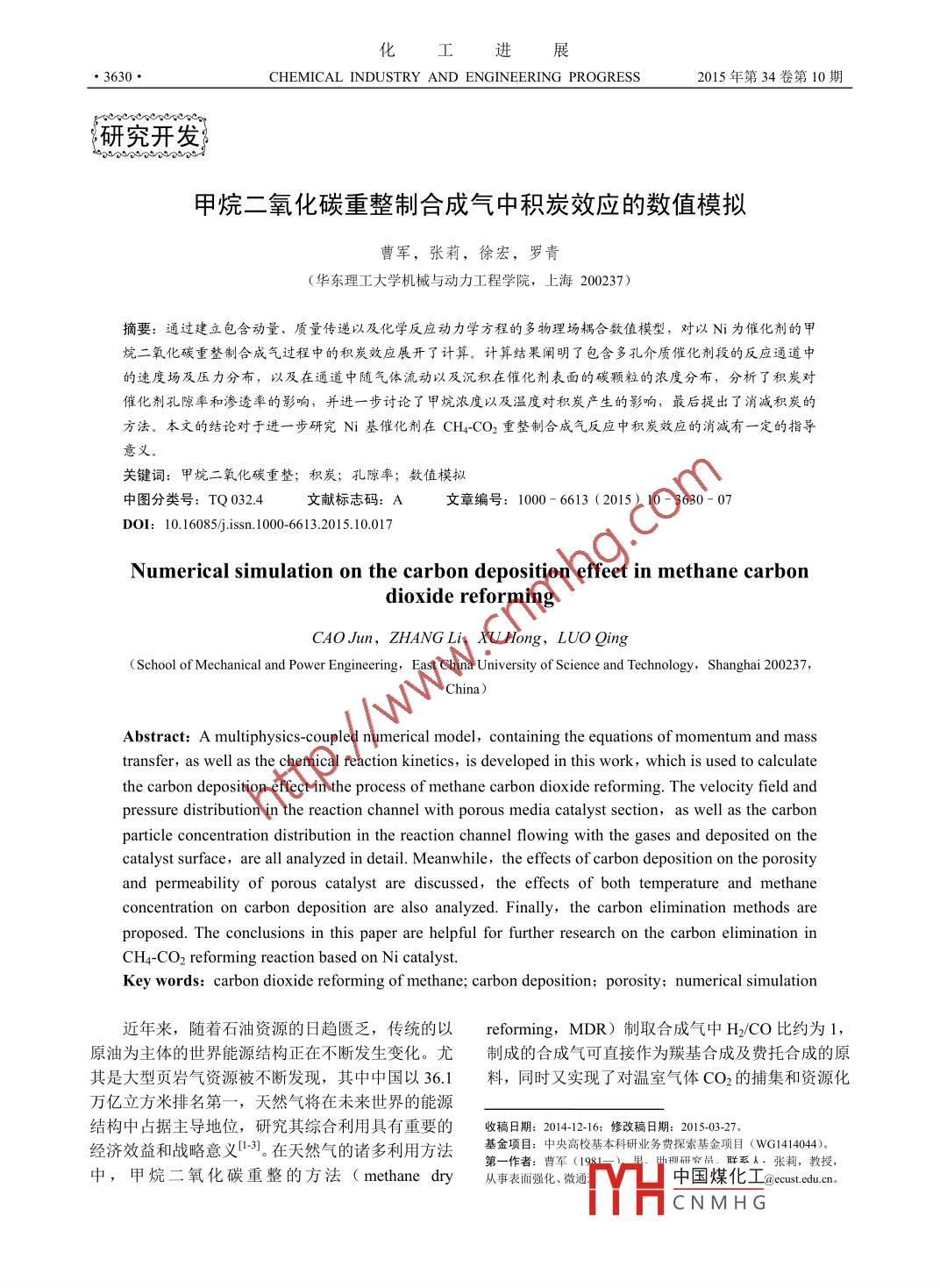 甲烷二氧化碳重整制合成氣中積炭效應(yīng)的數(shù)值模擬