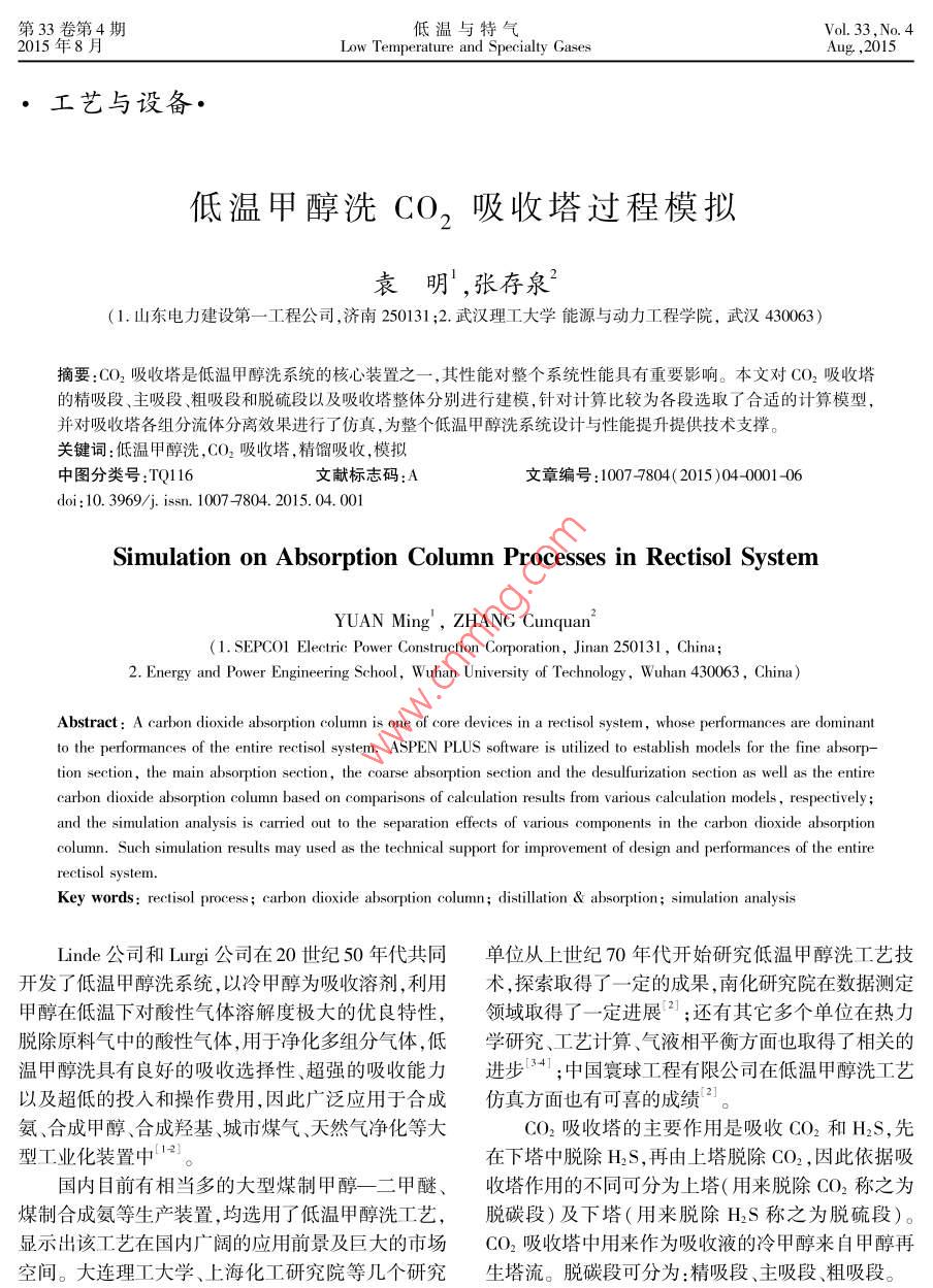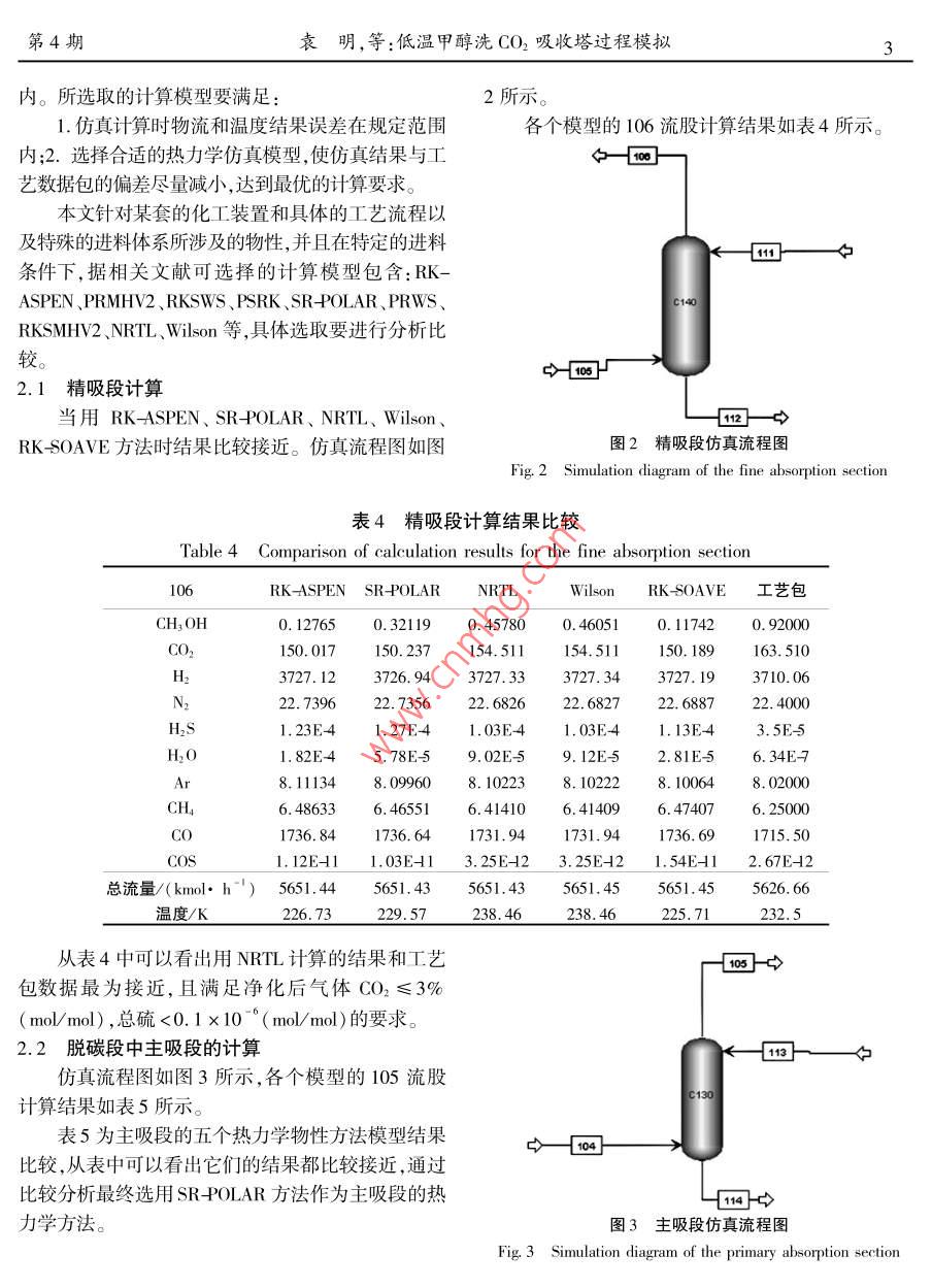 第33卷第4期低溫與特015年8月Low Temperature and Specialty GasesAug,2015工藝與設(shè)備低溫甲醇洗CO,吸收塔過程模擬袁明,張存泉2(1.山東電力建設(shè)第一工程公司,濟(jì)南250131;2.武漢理工大學(xué)能源與動力工程學(xué)院,武漢430063)摘要:CO3吸收塔是低溫甲醇洗系統(tǒng)的核心裝置之一,其性能對整個(gè)系統(tǒng)性能具有重要影響。本文對CO2吸收塔的精吸段、主吸段、粗吸段和脫硫段以及吸收塔整體分別進(jìn)行建模,針對計(jì)算比較為各段選取了合適的計(jì)算模型,并對吸收塔各組分流體分離效果進(jìn)行了仿真,為整個(gè)低溫甲醇洗系統(tǒng)設(shè)計(jì)與性能提升提供技術(shù)支撐。關(guān)鍵詞:低溫甲醇洗,CO2吸收塔,精餾吸收,模擬中圖分類號:TQ116文獻(xiàn)標(biāo)志碼:A文章編號:1007-804(2015)0400106doi:10.3969/j.isn.10077804.2015.04.001Simulation on Absorption Column Processes in Rectisol SystemYUAN Ming, ZHANG Cunquan(1. SEPCO1 Electric Power Construction Corporation, Jinan 250131, China2. Energy and Power Engineering School, Wuhan University of Technology, Wuhan 430063, China)Abstract: A carbon dioxide absorption column is one of core devices in a rectisol system, whose performances are dominantto the performances of the entire rectisol system. ASPEN PLUS software is utilized to establish models for the fine absorp-tion section, the main absorption section, the coarse absorption section and the desulfurization section as well as the entireon cumn based on comparisons of calculation results from various calculation models, respectively;the simulation analysis is carried out to the separation effects of various components in the carbon dioxide absorptioncolumn. Such simulation results may used as the technical support for improvement of design and performances of the entireKey words: rectisol process; carbon dioxide absorption column; distillation absorption; simulation analysisLinde公司和Iurg公司在20世紀(jì)50年代共同單位從上世紀(jì)0年代開始研究低溫甲醇洗工藝技開發(fā)了低溫甲醇洗系統(tǒng),以冷甲醇為吸收溶劑,利用術(shù),探索取得了一定的成果,南化硏究院在數(shù)據(jù)測定甲醇在低溫下對酸性氣體溶解度極大的優(yōu)良特性,領(lǐng)域取得了一定進(jìn)展;還有其它多個(gè)單位在熱力脫除原料氣中的酸性氣體,用于凈化多組分氣體,低學(xué)研究、工藝計(jì)算、氣液相平衡方面也取得了相關(guān)的溫甲醇洗具有良好的吸收選擇性、超強(qiáng)的吸收能力進(jìn)步3;中國寰球工程有限公司在低溫甲醇洗工藝以及超低的投入和操作費(fèi)用,因此廣泛應(yīng)用于合成仿真方面也有可喜的成績2氨、合成甲醇、合成羥基、城市煤氣、天然氣凈化等大CO2吸收塔的主要作用是吸收CO2和H2S,先型工業(yè)化裝置中12在下塔中脫除H2S,再由上塔脫除CO2,因此依據(jù)吸國內(nèi)目前有相當(dāng)多的大型煤制甲醇—二甲醚、收塔作用的不同可分為上塔(用來脫除CO2稱之為煤制合成氨等生產(chǎn)裝置,均選用了低溫甲醇洗工藝,脫碳段)及下塔(用來脫除HS稱之為脫硫段)。顯示出該工藝在國內(nèi)廣闊的應(yīng)用前景及巨大的市場CO2吸收塔中用來作為吸收液的冷甲醇來自甲醇再空間。大連理工大學(xué)、上?;ぱ芯吭旱葞讉€(gè)研究生塔流。脫碳段可分為:精吸段、主吸段、粗吸段低溫與特氣第33卷本文對CO2吸收塔的精吸段、主吸段、粗吸段102流股表示,物流102~106都是氣相流股,吸收和脫硫段以及吸收塔整體分別進(jìn)行建模,針對計(jì)算溶劑甲醇貧液由1?流股表示,物流112-119)是吸比較為各段選取了合適的計(jì)算模型,并對吸收塔各收了CO2、H2S的富甲醇溶液,由于熔解熱的產(chǎn)生需組分流體分離效果進(jìn)行了仿真,為整個(gè)低溫甲醇洗要將部分流股引岀經(jīng)換熱器進(jìn)行冷卻降溫。具體操系統(tǒng)設(shè)計(jì)與性能提升提供技術(shù)支撐。作條件如表2,表3給出了CO2吸收塔進(jìn)料組成CO2吸收塔模型表1CO2吸收塔參數(shù)Table 1 Parameters for CO2 absorption columnCO2吸收塔流程圖及其對應(yīng)的仿真工藝流程圖模塊C如圖1所示。吸收塔的脫硫段、粗吸段、主吸段和精塔板數(shù)吸段分別由C10、C120、C13和C140表示,在仿真軟件表2CO2吸收塔進(jìn)料條件中選擇相應(yīng)的塔模塊;換熱器由模塊B1、B12表示Table 2 Feed material conditions for選擇仿真軟件中的換熱器模塊,分流器由模塊F表CO absorption column示。經(jīng)過CO2吸收塔的吸收,凈化氣由塔頂流出溫度壓力流量流股氣相其凈化目標(biāo)為:CO2≤3%(mol/mol),總硫<0.1×Katm kmol/h分率/%245.2035.6010(mol/ mol表1為CO2吸收塔各段參數(shù)。變換氣進(jìn)料由(注:lam=101.33kPa)E-106E-115CQ2愛卷P-1180 feeE-111a.CO2吸收塔流程圖b.CO2吸收塔流程仿真圖a. flowf CO2 absorption columb. Flow simulation diagram of CO2 absorption column圖1CO2吸收塔流程圖及其對應(yīng)的仿真工藝流程圖Fig. 1 Flow diagram and the corresponding simulation diagram of CO2 absorption column表3CO2吸收塔進(jìn)料氣比例2模擬分析Table 3 Composition of feed gas to absorption column由于實(shí)際生產(chǎn)過程中某些工藝流程非常復(fù)雜,流股CH3OHCO2H,H,S使仿真過程也相當(dāng)繁瑣,然而在仿真過程只要達(dá)到1025:4E450.3230·4582.82E439954仿真目的,可以對其流程進(jìn)行適當(dāng)簡化,以獲得簡1110.9985.14E091.42E141E151E15捷、準(zhǔn)確仿真計(jì)算結(jié)果。日前對某個(gè)工藝流程仿真流股H2OARCOCOS時(shí),通常采用將一個(gè)復(fù)雜的塔段根據(jù