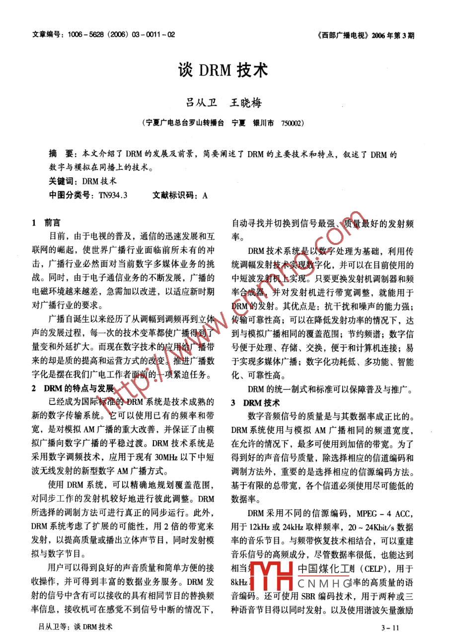 文章編號: 1006-5628 (2006) 03-0011-02《西部廣播電視》2006 年第3期談DRM技術.呂從衛(wèi)王曉梅(寧夏廣電總臺羅山轉播臺寧夏銀川市750002)2摘要:本文介紹了DRM的發(fā)展及前景,簡要闡述了DRM的主要技術和特點,敘述了DRM的數(shù)字與模擬在同播上的技術。關鍵詞: DRM技術中圖分類號: TN934.3文獻標識碼: A1前言自動尋找并切換到信號最強、質量最好的發(fā)射頻目前,由于電視的普及,通信的迅速發(fā)展和互率。聯(lián)網的崛起,使世界廣播行業(yè)面臨前所未有的沖DRM技術系統(tǒng)是以數(shù)字處理為基礎,利用傳擊,廣播行業(yè)必然面對當前數(shù)字多媒體業(yè)務的挑統(tǒng)調幅發(fā)射技術實現(xiàn)數(shù)字化,并可以在目前使用的戰(zhàn)。同時,由于電子通信業(yè)務的不斷發(fā)展,廣播的中短波發(fā)射機上實現(xiàn)。只要更換發(fā)射機調制器和頻電磁環(huán)境越來越差,急需加以改進,以適應新時期率合成器,并對發(fā)射機進行帶寬調整,就能用于對廣播行業(yè)的要求。DRM的發(fā)射。其優(yōu)點是:抗干擾和噪聲的能力強;廣播自誕生以來經歷了從調幅到調頻再到立體傳輸可靠性高;可以在降低發(fā)射功率的情況下,達聲的發(fā)展過程,每一次的技術變革都使廣播得到了到與模擬廣播相同的覆蓋范圍;節(jié)約頻譜;數(shù)字信量變和外延擴大。而現(xiàn)在數(shù)字技術的應用給廣播帶號便于處理、存儲、交換,便于和計算機連接;易來的卻是質的提高和運營方式的改變。推進廣^播數(shù)于實現(xiàn)多媒體廣播;數(shù)字化功耗低、多功能、智能字化是擺在我們廣電工作者面前的-項緊迫任務。化、 可靠性高。2 DRM 的特點與發(fā)展DRM的統(tǒng)- -制式和標準可以保障普及與推廣。已經成為國際標準的DRM系統(tǒng)是技術成熟的3 DRM技術新的數(shù)字傳輸系統(tǒng)。它可以使用已有的頻率和帶數(shù)字音頻信號的質量是與其數(shù)據(jù)率成正比的。寬,是對模擬AM廣播的重大改善,并保證了由模DRM系統(tǒng)使用與模擬AM廣播相同的頻道寬度,擬廣播向數(shù)字廣播的平穩(wěn)過渡。DRM 技術系統(tǒng)是在允許的情況下,最多可使用到加倍的帶寬。為了采用數(shù)字調頻技術,應用于現(xiàn)有30MHz以下中短得到好的聲音信號質量,除選擇相應的信道編碼和波無線發(fā)射的新型數(shù)字AM廣播方式。調制方法外,重要的是選擇相應的信源編碼方法。使用DRM系統(tǒng),可以精確地規(guī)劃覆蓋范圍,基于有限的總帶寬,各個信道必須使用盡可能低的對同步工作的發(fā)射機較好地進行彼此調整。DRM數(shù)據(jù)率。所選擇的調制方法可進行真正的同步運行。此外,DRM采用不同的信源編碼,MPEG-4 ACC,,DRM系統(tǒng)考慮了擴展的可能性,用2倍的帶寬來用于12kHz或24kHz 取樣頻率, 20 ~ 24Kbit/s數(shù)據(jù)發(fā)射,以提高質量或播出立體聲節(jié)目,同時發(fā)射模率的音樂節(jié)目。與頻帶恢復技術相結合,可以重建擬與數(shù)字節(jié)目。音樂信號的高頻成分,盡管數(shù)據(jù)率很低,也能達到用戶可以得到良好的聲音質量和簡單方便的接中國煤化工則(CELP), 用于收操作,并可得到豐富的數(shù)據(jù)業(yè)務服務。DRM發(fā)8kHz iHCNMHG率的高質量的語射的信號中含有可以接收的具有相同節(jié)目的替換頻音編碼。還可使用SBR編碼技術,用于兩種或三率信息,接收機可在感覺不到信號中斷的情況下,種語音 節(jié)目得以同時發(fā)射。以及使用諧波矢量激勵呂從衛(wèi)等:談DRM技術.3-11編碼(HVXC), 用于最小2Kbit/s的很低比特率語同播有幾種可能的方式,數(shù)字信號與模擬信號音編碼。分享現(xiàn)有的9kHz或10kHz 標準帶寬,在不能使用頻帶恢復技術使音頻和語音編碼器在低比特率鄰頻道的情況下,數(shù)字與模擬信號各占一半的帶時的能力得到改善,然而,頻帶恢復必須在編碼器寬。模擬節(jié)目按照兼容單邊帶方式運行,一般安排進行數(shù)據(jù)的預處理。普通的編解碼器作為對音頻信在下邊帶,而上邊帶數(shù)字節(jié)目對模擬的影響表現(xiàn)為號低音頻部分處理的基礎。高音頻部分不- -起進行高頻噪聲,極易濾除。兼容單邊帶方式是使用包絡編碼與傳送,而是在重放時通過頻帶恢復重建,并解調器的傳統(tǒng)雙邊帶接收機解調單邊帶所需要的,且是在通過基本解碼器產生音頻信號的波形之后進但與數(shù)字同播時模擬發(fā)射機兼容單邊帶運行解調出的信號有失真,信噪比變差。為了確保音頻數(shù)據(jù)的精確重建,需要在壓縮的模擬節(jié)目仍占用已有頻帶進行雙邊帶發(fā)射,而數(shù)據(jù)中同時傳送輔助信息,這種信息通過未壓縮的數(shù)字節(jié)目占用鄰頻道半個帶寬。為了實現(xiàn)100%調音頻信號的預處理產生。幅,在任何功率分配情況下,模擬邊帶合成電壓總調制使用COFDM多載波方法和差錯保護,每是等于載波電壓。在進行分配時,模擬節(jié)目的峰值個載波是窄帶的,應用很長的符號持續(xù)期。在傳輸電壓與數(shù)字節(jié)目的峰值電壓之和,等于發(fā)射機原有時不同反射的時延差,應明顯短于符號的持續(xù)期,的最大峰值電壓。由于功率與電壓的平方成正比,疊加只在-一個符號的很小-部分發(fā)生影響。只要時模擬節(jié)目最大峰值功率與數(shù)字節(jié)目最大峰值功率之延差不超出保護間隔的長度,多徑傳播就不會引起和,小