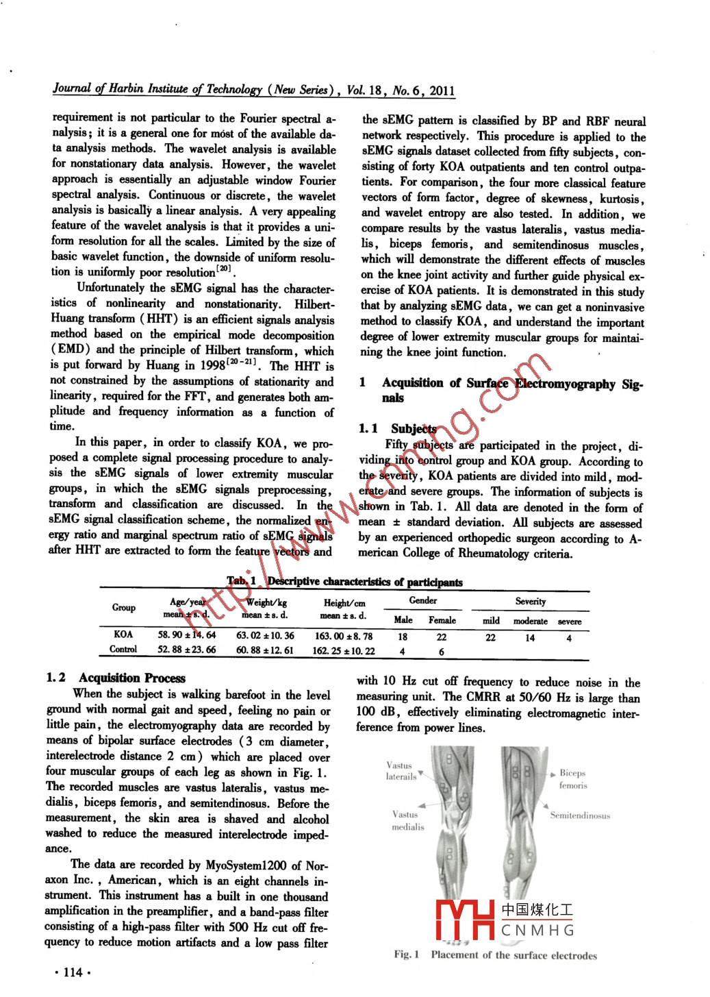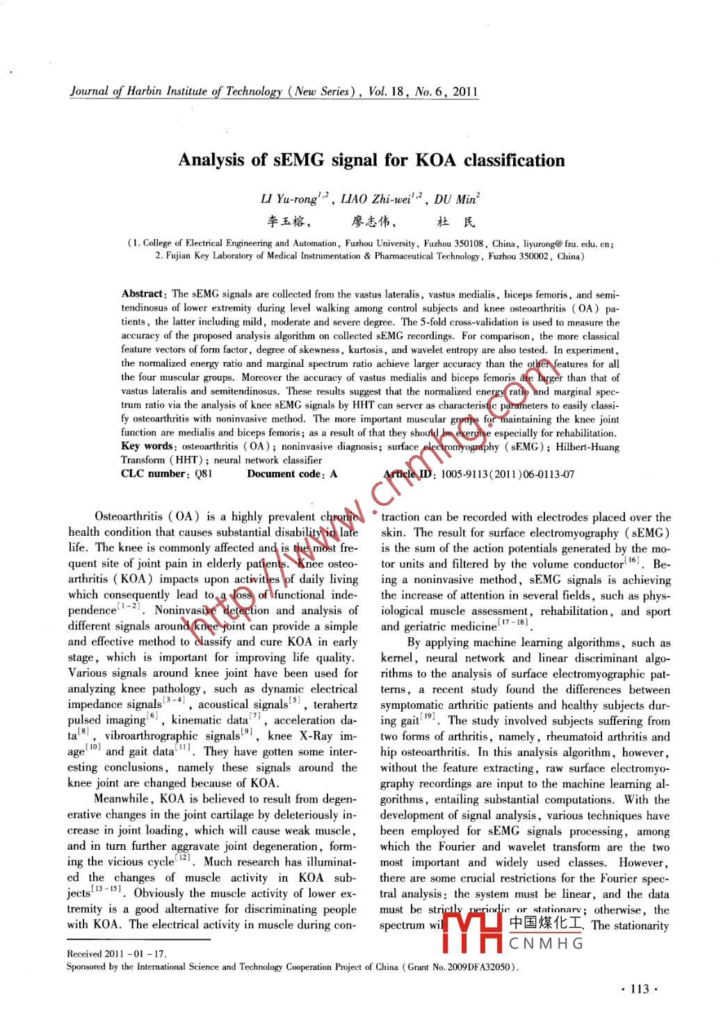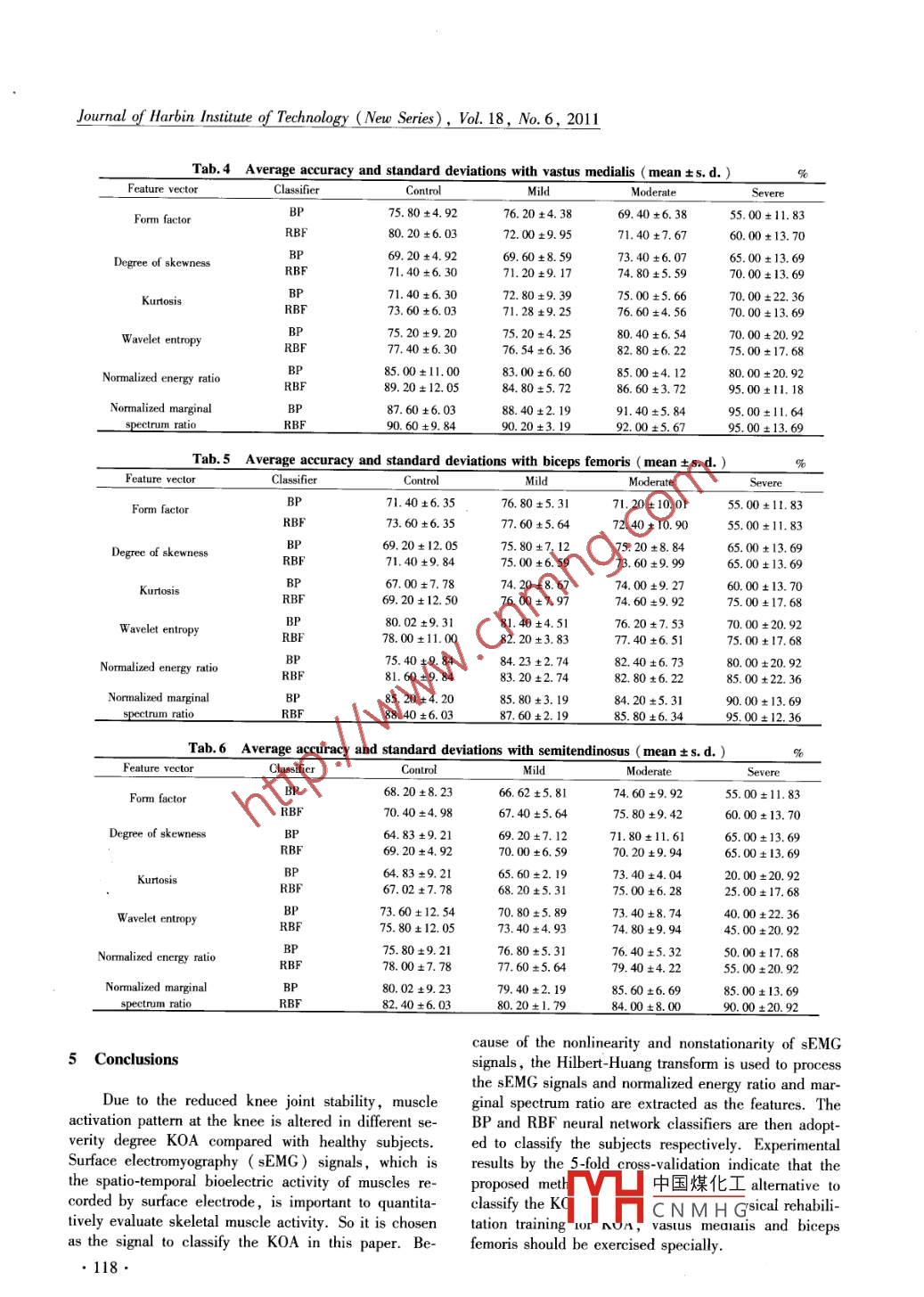 Journal of Harbin Institute of Technology ( New Series),Vol. 18, No. 6, 2011Analysis of sEMG signal for KOA classificationLI Yu-rong',2, LIAO Zhi-wei'2, DU Min2李玉榕,廖志偉,杜民(1. College of Electrical Engineering and Automation, Fuzhou University , Fuzhou 350108 , China, liyurong@ fzu. edu. en;2. Fujian Key Laboratory of Medical Instrumentation & Pharmaceutical Technology, Fuzhou 350002,China)Abstract: The sEMG signals are ollected from the vastus lateralis , vastus medialis , biceps femoris, and semi-tendinosus of lower extremnity during level walking among control subjects and knee osteoarhritis (OA) patients , the latter including mild , moderate and severe degree. The 5-fold cross-validation is used to measure theaccuracy of the proposed analysis algorithm on collected sEMG recordings. For comparison, the more classicalfeature vectors of form factor, degree of skewness, kurtosis, and wavelet entropy are also tested. In experiment ,the normalized energy ratio and marginal spectrum ratio achieve larger accuracy than the other features for allthe four muscular groups. Moreover the accuracy of vastus medialis and biceps femoris are larger than that ofvastus lateralis and semitendinosus. These results suggest that the normalized energy ratio and marginal spec-trum ratio via the analysis of knee sEMG signals by HHT can server as characteristic parameters to easily classi-fy ostcoarthritis with noninvasive method. The more important muscular groups for maintaining the knee jointfunction are medialis and biceps femoris; as a result of that they should be exercise especially for rehabilitation.Key words: osteoarthritis ( OA) ; noninvasive diagnosis; surface electromyography ( sEMG) ; Hilbert-HuangTransform ( HHT); neural network classifierCLC number: Q81Document code: AArticle ID: 1005-9113(201 1)06-0113-07Osteoarthritis (OA) is a highly prevalent chronictraction can be recorded with electrodes placed over thehealth condition that causes substantial disability in lateskin. The result for surface electromyography ( sEMG)life. The knee is commonly affected and is the most fre- is the sum of the action potentials generated by the mo-quent site of joint pain in elderly patients. Knee osteo-tor units and filtered by the volume conductor-10. Be-arthritis ( KOA) impacts upon activities of daily livinging a noninvasive method, sEMG signals is achievingwhich consequently lead to a loss of functional inde-the increase of attention in several fields, such as phys-pendence-2. Noninvasive detection and analysis ofiological muscle assessment, rehabilitation, and sportdifferent signals around knee joint can provide a simpleand geriatrie medicine[17-18].and effective method to classify and cure KOA in earlyBy applying machine learming algorithms, such asstage, which is important for improving life quality.kernel, neural network and linear discriminant algo-Various signals around knee joint have been used forrithms to the analysis of surface electromyographic paanalyzing knee pathology, such as dynamic electricalterns, a recent study found the differences betweenimpedance signals--acoustical signals'sl ,terahertzsymptomatic arthritic patients and healthy subjects dur-pulsed imagingacceleration da-ing gait, The study involved subjects suffering fromtal8l ,vibroarthrographic signals', knee X-Ray im-two forms of arthritis , namely,rheumatoid arthritis andage 10) and gait data"" . They have gotten some inter-hip osteoarthritis. In this analysis algorithm, however,esting conclusions, namely these signals around thewithout the feature extracting, raw surface electromyo-knee joint are changed because of KOA.graphy recordings are input to the machine learning al-Meanwhile, KOA is believed to result from degen-gorithms,entailing substantial computations. With theerative changes in the joint cartilage by deleteriously in- development of signal analysis,various techniques havecrease in joint loading, which will cause weak muscle ,been employed for sEMG signals processing, amongand in turn further aggravate joint degeneration, form-which the Fourier and wavelet transform are the twing the vicious cycle' 2,Much research has illuminat-most important and widely used classes. However ,:d the changes of muscle activityKOA subthere are some crucial restrictions for the Fourier spec-tral analysis: the system must be linear, and thee datatremity is a good alternative for discriminating peoplemust be strictly neriodie or_ stationarv; otherwise, thewith KOA. The electrical activity in muscle during con-spectrum W中國(guó)煤化工The stationarityYHCNMHGRecceived 2011 -01 -17.Sponsored by the International Science and Technology Cooperation Project of China ( Grant No. 2009DF A32050)..Journal of Harbin Insitute of Technology (New Series), Vol. 18, No. 6, 2011The sEMC signals is sampled with 1 kHz frequen-d0;(I)w,(t) =cy and converted into a digital stream of data. All theddata are exported and analyzed by MyoResearch andHaving obtained the IMF components, the HilbertMatlab software,respectively.transform is applied to each of these IMF components.After performing the Hilbert transform to each IMF2 Principle of Hilbert-Huang Transformcomponent, the original data can be expressed as thereal part in the following form :The sEMG signal is nonstationary as its statisticalproperties change over time. The complexity and non-x(1) = Re E a()lacoulinearity of neuromuscular system lead to the nonlinearHere we have left out the residue rn(t) on pur-property of sEMG signals.pose, for it is either a monotonic function or a con-The combination of empirical mode decompositionstant.( EMD) and Hilbert spectral analysis is designated byEq. (1) can represent the armplitude ( or the ener-NASA as the Hilbert-Huang Transform ( HHT) forgy),and instantaneous frequency as functions of timeshort. It is based on an adaptive basis , and the frequen-in a three dimensional plot. The HHT time-frequencycy is defined through the Hilbert transform. Con