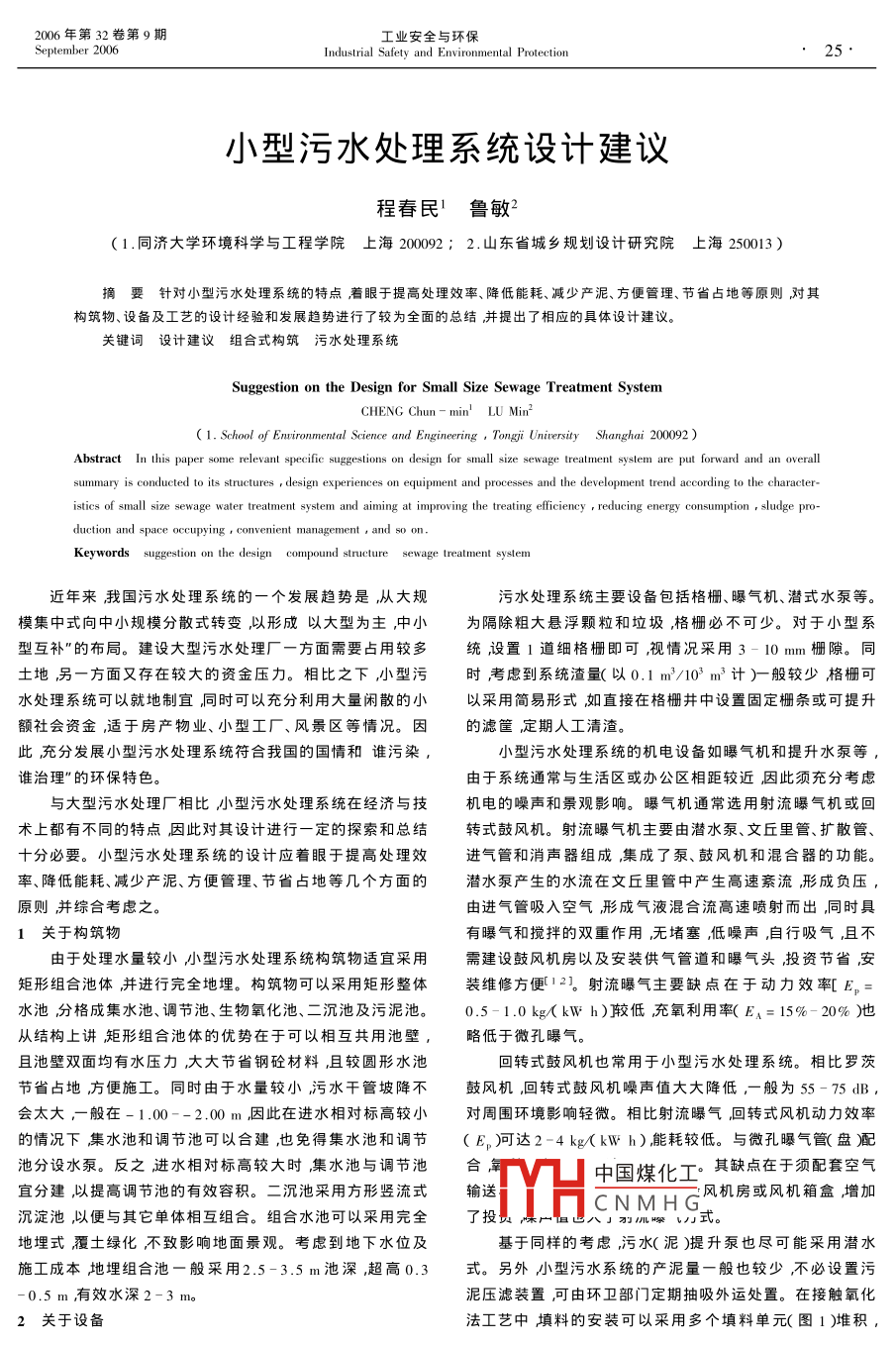 2006年第32卷第9期工業(yè)安全與環(huán)保September 2006Industrial Safety and Environmental Protection25.小型污水處理系統(tǒng)設計建議程春民'魯敏2( 1.同濟大學環(huán)境科學與工程學院 上海200092; 2.山東省城鄉(xiāng)規(guī)劃設計研究院 上海250013 )摘要針對小型污水處理系統(tǒng)的特點,著眼于提高處理效率、降低能耗、減少產(chǎn)泥、方便管理、節(jié)省占地等原則,對其構筑物、設備及工藝的設計經(jīng)驗和發(fā)展趨勢進行了較為全面的總結并提出了相應的具體設計建議。關鍵詞設計建議組合式構筑 污水處理系 統(tǒng)Suggestion on the Design for Small Size Sewage Treatment SystemCHENG Chun - min' LU Min'2( 1. School of Environmental Science and Engineering , Tongi Unirersity Shanghai 200092 )Abstract In this paper some relevant specifie sugestions on design for small size sewage treatment system are put forward and an overallistics of small size sewage water treatment system and aiming at improving the treating eficiency , reducing energy consumption , sludge pro-duction and space occupying , conwenient management , and 50 on.Keywords suggestion on the design compound structure sewage treatment system近年來,我國污水處理系統(tǒng)的一個發(fā)展趨勢是,從大規(guī)污水處理系統(tǒng)主要設備包括格柵、曝氣機、潛式水泵等。模集中式向中小規(guī)模分散式轉變,以形成以大型為主,中小為隔除粗大懸浮顆粒和垃圾,格柵必不可少。對于小型系型互補”的布局。建設大型污水處理廠-方面需要占用較多統(tǒng),設置1道細格柵即可,視情況采用3- 10 mm柵隙。同土地,另一方面又存在較大的資金壓力。相比之下,小型污時考慮到系統(tǒng)渣量(以0.1 m/103 m3計)-般較少格柵可水處理系統(tǒng)可以就地制宜同時可以充分利用大量閑散的小以采用簡易形式,如直接在格柵井中設置固定柵條或可提升額社會資金,適于房產(chǎn)物業(yè)、小型工廠、風景區(qū)等情況。因的濾筐,定期人工清渣。此充分發(fā)展小型污水處理系統(tǒng)符合我國的國情和誰污染,小型污水處理系統(tǒng)的機電設備如曝氣機和提升水泵等,誰治理”的環(huán)保特色。由于系統(tǒng)通常與生活區(qū)或辦公區(qū)相距較近,因此須充分考慮與大型污水處理廠相比小型污水處理系統(tǒng)在經(jīng)濟與技.機電的噪聲和景觀影響。曝氣機通常選用射流曝氣機或回術.上都有不同的特點,因此對其設計進行一定的探索和總結轉式鼓風機。射流曝氣機主要由潛水泵、文丘里管、擴散管、十分必要。小型污水處理系統(tǒng)的設計應著眼于提高處理效進氣管和消聲器組成,集成了泵、鼓風機和混合器的功能。率、降低能耗、減少產(chǎn)泥、方便管理、節(jié)省占地等幾個方面的潛水泵產(chǎn)生的水流在文丘里管中產(chǎn)生高速紊流,形成負壓,原則并綜合考慮之。由進氣管吸入空氣形成氣液混合流高速噴射而出,同時具1關于構筑物有曝氣和攪拌的雙重作用,無堵塞,低噪聲,自行吸氣,且不由于處理水量較小,小型污水處理系統(tǒng)構筑物適宜采用.需建設鼓風機房以及安裝供氣管道和曝氣頭投資節(jié)省安矩形組合池體,并進行完全地埋。構筑物可以采用矩形整體裝維修方便12]。射流曝氣主要缺點在于動力效率[ Ep=水池分格成集水池、調節(jié)池、生物氧化池、二沉池及污泥池。0.5-1.0kg/( kW h)較低充氧利用率( Eλ= 15%- 20% )也從結構上講矩形組合池體的優(yōu)勢在于可以相互共用池壁略低于微孔曝氣。且池壁雙面均有水壓力,大大節(jié)省鋼砼材料,且 較圓形水池回轉式鼓風機也常用于小型污水處理系統(tǒng)。相比羅茨節(jié)省占地方便施工。同時由于水量較小污水干管坡降不鼓風機,回轉式鼓風機噪聲值大大降低,- -般為55 -75 dB ,會太大一般在-1.00--2.00m,因此在進水相對標高較小對周圍環(huán)境影響輕微。相比射流曝氣回轉式風機動力效率的情況下集水池和調節(jié)池可以合建,他免得集水池和調節(jié)( Ep )河達2-4 kg/(kW h)能耗較低。與微孔曝氣管(盤)配池分設水泵。反之進水相對標高較大時集水池與調節(jié)池合,中國煤化工。其缺點在于須配套空氣宜分建,以提高調節(jié)池的有效容積。二沉池采用方形豎流式輸送風機房或風機箱盒增加沉淀池,以便與其它單體相互組合。組合水池可以采用完全THCN MH GK了投員懷廠舊巴八」羽M嚓以式。地埋式覆土綠化,不致影響地面景觀??紤]到地下水位及基于同樣的考慮,污水(泥)提升泵也盡可能采用潛水施工成本地埋組合池-般采用2.5-3.5 m池深,超 高0.3式。另外小型污水系統(tǒng)的產(chǎn)泥量-般也較少,不必設置污-0.5 m ,有效水深2-3 m。泥壓濾裝置,可 由環(huán)衛(wèi)部門定期抽吸外運處置。在接觸氧化2關于設備法工藝中填料的安裝可以采用多個填料單元(圖1 )堆積,26.用以代替常見的預埋鐵焊接或膨脹螺釘固定的安裝方式;填流程,即把污泥池和酸化池合二為一,以利用污泥的絮凝性料單元的安裝和更換可以經(jīng)由人孔中出入較為方便與構能取得了不錯的效果7。筑物不相影響。對于小型污水處理系統(tǒng)盡量采用簡便型式4-體化設備設備,可以方便施工與管理、節(jié)省投資與能耗和避免其它不-體化設備技術自20世紀80年代初引進我國以來,隨利因素。著污水處理要求的提高工藝及流程不斷得以改進,變得更加緊湊提高了處理效率。-體化設備-般也采用接觸氧化填料系扣點~