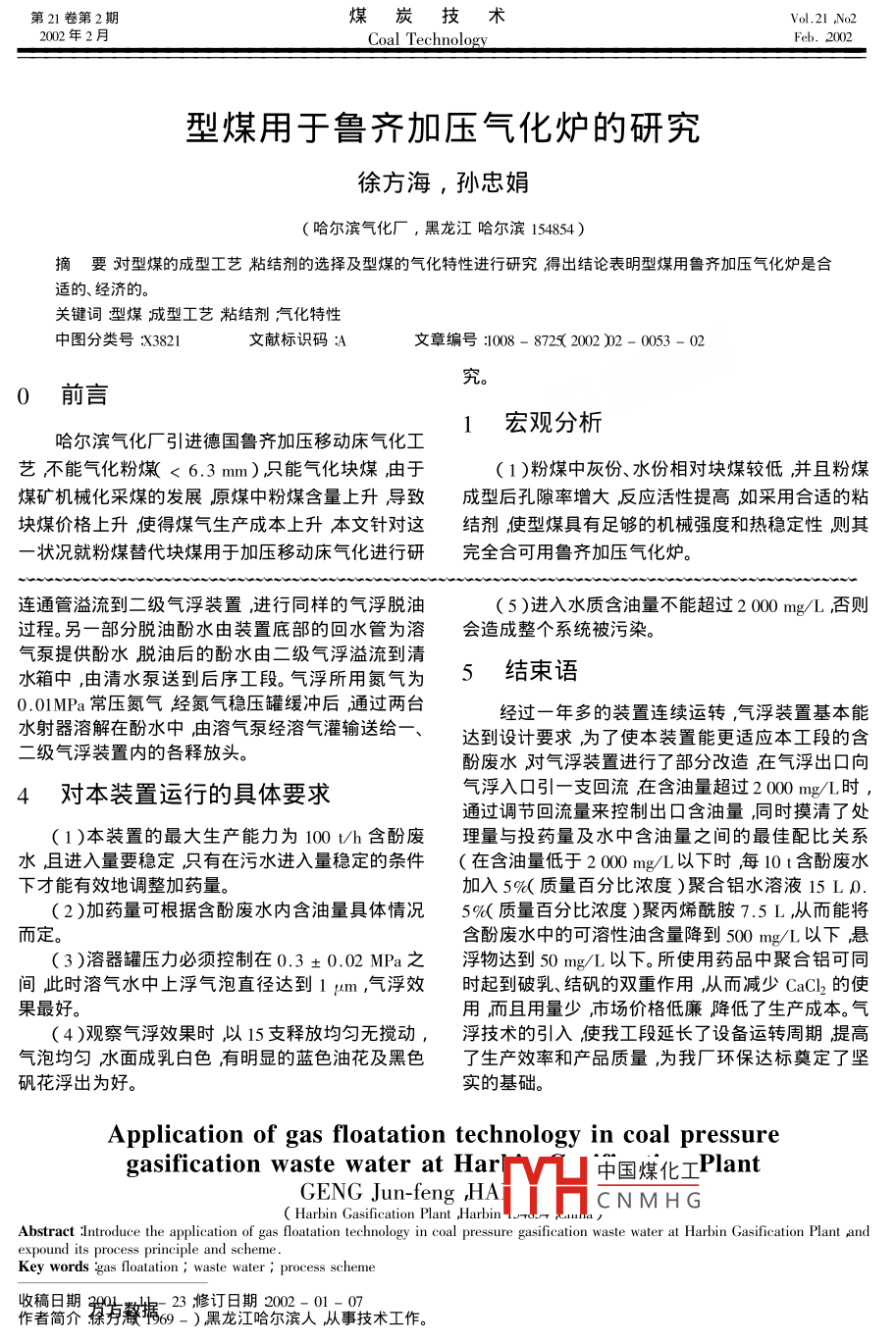 第21卷第2期.煤炭技術(shù)Vol.21 ,No2 .2002年2月Coal TechnologyFeb. 2002型煤用于魯齊加壓氣化爐的研究徐方海,孫忠娟(哈爾濱氣化廠,黑龍江哈爾濱154854)摘要對型煤的成型工藝 粘結(jié)劑的選擇及型煤的氣化特性進(jìn)行研究得出結(jié)論表明型煤用魯齊加壓氣化爐是合適的、經(jīng)濟(jì)的。關(guān)鍵詞型煤成型工藝粘結(jié)劑氣化特性中圖分類號:X3821文獻(xiàn)標(biāo)識碼:A文章編號:1008- 8725( 2002)02- 0053 - 02究。前言哈爾濱氣化廠引進(jìn)德國魯齊加壓移動床氣化工1宏觀分析藝不能氣化粉煤( < 6. 3 mm)只能氣化塊煤,由于( 1 )粉煤中灰份、水份相對塊煤較低并且粉煤煤礦機(jī)械化采煤的發(fā)展原煤中粉煤含量上升導(dǎo)致成型后孔隙率增大反應(yīng)活性提高如采用合適的粘塊煤價格.上升使得煤氣生產(chǎn)成本上升本文針對這結(jié)劑,使型煤具有足夠的機(jī)械強(qiáng)度和熱穩(wěn)定性則其一狀況就粉煤替代塊煤用于加壓移動床氣化進(jìn)行研完全合可用魯齊加壓氣化爐。連通管溢流到二級氣浮裝置,進(jìn)行同樣的氣浮脫油(5)進(jìn)入水質(zhì)含油量不能超過2000mg/L,否則過程。另-部分脫油酚z水由裝置底部的回水管為溶會造成整個系統(tǒng)被污染。氣泵提供酚水脫油后的酚水由二級氣浮溢流到清5結(jié)束語水箱中,由清水泵送到后序工段。氣浮所用氮氣為0.01MPa常壓氮氣經(jīng)氮氣穩(wěn)壓罐緩沖后通過兩臺經(jīng)過-年多的裝置連續(xù)運轉(zhuǎn),氣浮裝置基本能水射器溶解在酚水中,由溶氣泵經(jīng)溶氣灌輸送給一、達(dá)到設(shè)計要求為了使本裝置能更適應(yīng)本工段的含二級氣浮裝置內(nèi)的各釋放頭。酚廢水對氣浮裝置進(jìn)行了部分改造在氣浮出口向4對本裝置運行的具體要求氣浮入口引一支回流在含油量超過2000mg/L時通過調(diào)節(jié)回流量來控制出口含油量,同時摸清了處(1 )本裝置的最大生產(chǎn)能力為100 t/h含酚廢理量與投藥量及水中含油量之間的最佳配比關(guān)系水,且進(jìn)入量要穩(wěn)定,只有在污水進(jìn)入量穩(wěn)定的條件(在含油量低于2 000 mg/L以下時每10t含酚廢水下才能有效地調(diào)整加藥量。加入5%(質(zhì)量百分比濃度)聚合鋁水溶液15 L0.(2)加藥量可根據(jù)含酚廢水內(nèi)含油量具體情況5%(質(zhì)量百分比濃度)聚丙烯酰胺7.5L,從而能將而定。含酚廢水中的可溶性油含量降到500 mg/L以下懸( 3 )溶器罐壓力必須控制在0.3土0.02 MPa之浮物達(dá)到50mg/L以下。所使用藥品中聚合鋁可同間此時溶氣水中上浮氣泡直徑達(dá)到1 μm,氣浮效時起到破乳、結(jié)礬的雙重作用,從而減少CaCl2的使果最好。用,而且用量少,市場價格低廉降低了生產(chǎn)成本。氣(4 )觀察氣浮效果時,以 15支釋放均勻無攪動,浮技術(shù)的引入使我工段延長了設(shè)備運轉(zhuǎn)周期提高氣泡均勻水面成乳白色,有明顯的藍(lán)色油花及黑色了生產(chǎn)效率和產(chǎn)品質(zhì)量,為我廠環(huán)保達(dá)標(biāo)奠定了堅礬花浮出為好。實的基礎(chǔ)。Application of gas floatation technology in coal pressuregasification waste water at Harl中國煤化工PlantGENG Jun-feng HA( Harbin Gasification Plant ,Harbin。YHCNMHGAbstract :Introduce the application of gas floatation technology in coal pressure gasification waste water at Harbin Gasification Plant jandexpound its process principle and scheme.Key words gas floatation ; waste water ; process scheme收稿日期強(qiáng)發(fā)數(shù)據(jù)23修訂日期2002-01-07作者簡介9- )黑龍江哈爾濱人從事技術(shù)工作。54.煤炭技術(shù)第2期(2 )依蘭煤礦優(yōu)質(zhì)塊煤售價為260 ~ 280 元/t,4工藝流程而優(yōu)質(zhì)粉煤價格為120 ~ 140元/t如采用合適的成型工藝,降低型煤生產(chǎn)成本,則其在經(jīng)濟(jì)上是有利工藝流程如圖所示:的。粉煤一粘士一氏動2粘結(jié)劑及成型工藝的選擇紙菜廢液一回福位時粘土破碎后經(jīng)圓盤給料機(jī)與粉煤( < 6.3 mm)依蘭煤為煙煤中的長焰煤不具有粘結(jié)性粉煤按比例送入滾筒干燥機(jī)然后進(jìn)入籠式破碎機(jī)破碎成型過程中必須使用粘結(jié)劑根據(jù)粘結(jié)劑來源廣、廉并混合紙漿廢液定量給入雙軸混捏機(jī)與細(xì)粒料攪價。型煤熱穩(wěn)定好機(jī)械強(qiáng)度高及成型工藝力求簡單拌均勻再送入成型機(jī)壓制成型最后經(jīng)干燥成為產(chǎn)的原則采用酸性紙漿廢液-粘土復(fù)合粘結(jié)劑冷壓品2。成型工藝。所用酸性紙漿廢液來源于佳木斯紙業(yè)有限公司(原佳木斯紙廠)其是造紙過程中排出的廢5實驗液主要成份是不同磺化程度和聚合程度的木質(zhì)磺酸、單糖、多糖中間產(chǎn)物和少量糖醛乳酸等有機(jī)物,經(jīng)實驗測得型煤和依蘭塊煤的性質(zhì)比較如表1以及部分游離態(tài)和化合態(tài)存在二氧化硫等,當(dāng)其加所示,從結(jié)果可以看出型煤具有以下優(yōu)點:孔隙增熱濃縮至28°波美左右時為一種黑色膠態(tài)物質(zhì),是大反應(yīng)活性好熱穩(wěn)定性增強(qiáng)灰熔點高機(jī)械強(qiáng)度-種優(yōu)良的有機(jī)粘結(jié)劑所用粘土采于東山,它有以高及粒度均勻等3。表1下優(yōu)點:三氧化二鋁含量高熔點高常溫下塑性好,工業(yè)分析氣化特性型煤強(qiáng)度950C左右時團(tuán)固性好并且雜質(zhì)少1?;曳炙謸]發(fā)分反應(yīng)活性孔隙率熱穩(wěn)定性灰溶點落下強(qiáng)度/%_ /% /%/a%//