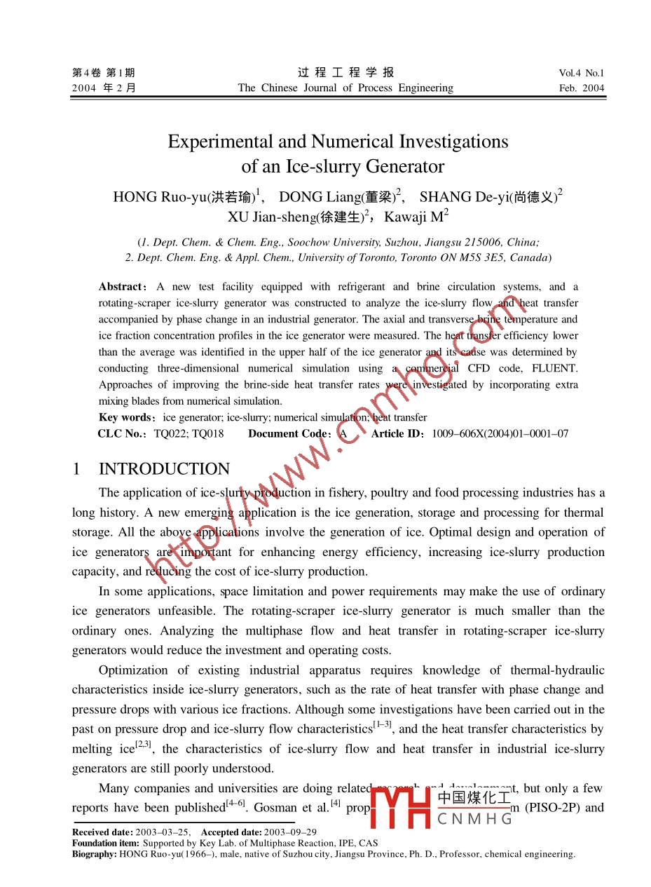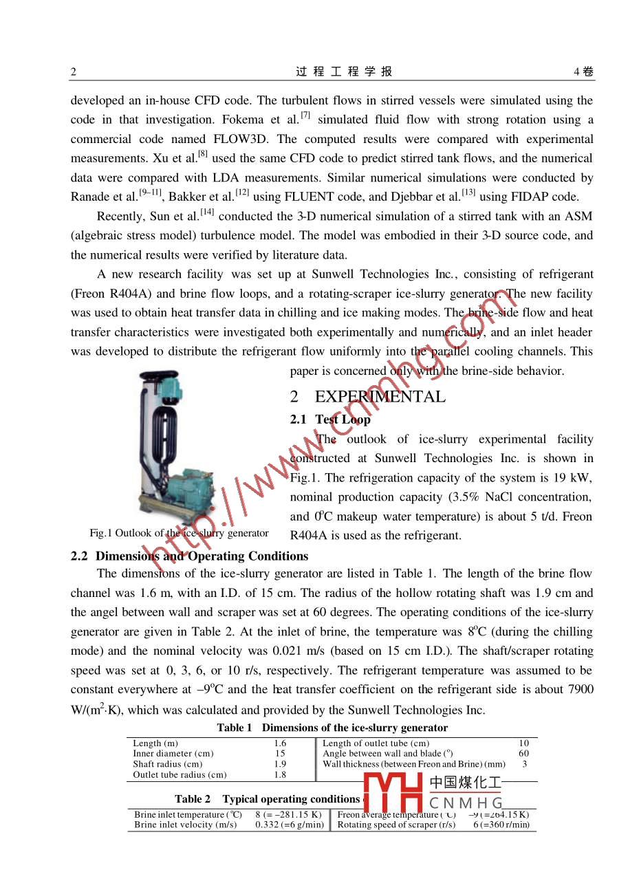 第4卷第1期過程工程學(xué)報(bào)VoL.4 No.12004年2月The Chinese Journal of Process EngineeringFeb.2004Experimental and Numerical Investigationsof an Ice- slurry GeneratorHONG Ruo-yu(洪若瑜)',DONG Liang(董梁),SHANG De-yi(尚德義)尸XU Jian-sheng(徐建生)子,Kawaji M2(1. Dept. Chem. & Chem. Eng., Soochow University, Suzhou, Jiangsu 215006, China;2. Dept. Chem. Eng. & Appl. Chem, University of Toronto, Toronto ON M5S 3E5, Canada)Abstract: A new test facility equipped with refrigerant and brine circulation systems, and arotating-scraper ice slurry generator was constructed to analyze the ice-slurry flow and heat transferaccompanied by phase change in an industrial generator. The axial and transverse brine temperature andice fraction concentration profiles in the ice generator were measured. The heat transfer efficiency lowerthan the average was identified in the upper half of the ice generator and its cause was determined byconducting three-dimensional numerical simulation using a commercial CFD code, FLUENT.Approaches of improving the brine-side heat transfer rates were investigated by incorporating extramixing blades from numerical simulation.Key words: ice generator; ice-slurry; numerical simulation; heat transferCLC No: TQ022; TQ018Document Code: AArticle ID: 1009- -606X(2004)01-0001- -07INTRODUCTIONThe application of ice-slurry production in fishery, poultry and food processing industries has along history. A new emerging application is the ice generation, storage and processing for thermalstorage. All the above applications involve the generation of ice. Optimal design and operation ofice generators are important for enhancing energy efficiency, increasing ice-slurry productioncapacity, and reducing the cost of ice-slurry production.In some applications, space limitation and power requirements may make the use of ordinaryice generators unfeasible. The rotating-scraper ice-slurry generator is much smaller than theordinary ones. Analyzing the multiphase flow and heat transfer in rotating- scraper ice-slurrygenerators would reduce the investment and operating costs.Optimization of existing industrial apparatus requires knowledge of thermal-hydrauliccharacteristics inside ice-slurry generators, such as the rate of heat transfer with phase change andpressure drops with various ice fractions. Although some investigations have been carried out in thepast on pressure drop and ice- slurry flow characteristicsh-s, and the heat transfer characteristics bymelting ice'-s, the characteristics of ice-slurry flow and heat transfer in industrial ice-slurrygenerators are still poorly understood.Many companies and universities are doing related . 2中國煤化工”, but only a fewreports have been published'Gosman et al.4I propn (PISO-2P) and:YHCNMHG”Received date: 2003 -03- -25,Accepted date: 2003 -09 -29Foundation item: Supported by Key Lab. of Multiphase Reaction, IPE, CASBiography: HONG Ruo-yu( 1966 -), male, native of Suzhou city, Jiangsu Province, Ph. D.. Professor, chemical engineering.過程工程學(xué)報(bào)4卷developed an in-house CFD code. The turbulent flows in stirred vessels were simulated using thecode in that investigation. Fokema et al.' ! simulated fluid flow with strong rotation using acommercial code named FLOW3D. The computed results were compared with experimentalmeasurements. Xu et al.8 used the same CFD code to predict stirred tank flows, and the numericaldata were compared with LDA measurements. Similar numerical simulations were conducted byRanade et al.111Bakker et al.f12] using FLUENT code, and Djebbar et al.03] using FIDAP code.Recently, Sun et al.l4] conducted the 3-D numerical simulation of a stirred tank with an ASM(algebraic stress model) turbulence model. The model was embodied in their 3-D source code, andthe numerical results were verified by literature data.A new research facility was set up at Sunwell Technologies Inc., consisting of refrigerant(Freon R404A) and brine flow loops, and a rotating-scraper ice-slurry generator. The new facilitywas used to obtain heat transfer data in chilling and ice making modes. The brine- side flow and heattransfer characteristics were investigated both experimentally and numerically, and an inlet headerwas developed to distribute the refrigerant flow uniformly into the parallel cooling channels. Thispaper is concerned only with the brine-side behavior.2 EXPERIMENTAL2.1 Test Loop .The outlook of ice-slurry experimental facilityconstructed at Sunwell Technologies Inc. is shown inFig.1. The refrigeration capacity of the system is 19 kW,nominal production capacity (3.5% NaCl concentration, .and 0C makeup water temperature) is about 5 td. FreonFig. 1 Outlook of the ice-slurry generatorR404A is used as the refrigerant.2.2 Dimensions and Operating ConditionsThe dimensions of the ice-slury generator are listed in Table 1. The length of the brine flowchannel was 1.6 m, with anI.D. of 15 cm. The radius of the hollow rotating shaft was 1.9 cm andthe angel between wall and scraper was set at 60 degrees. The operating conditions of the ice-slurrygenerator are given in Table 2. At the inlet of brine, the temperature was 8°C (during the chillingmode) and the nominal velocity was 0.021 m/s (based on 15 cm I.D.). The shaft/scraper rotatingspeed was set at 0, 3, 6, or 10 r/s, respectively. The refrigerant temperature was assumed to beconstant everywhere at - _9°C and the heat transfer coefficient on the refrigerant side is about 7900W/(m2. K), which was calculated and provided by the Sunwell Technologies Inc.Table 1 Dimensions of the ice-slurry generatorLength (m)Length of outlet tube (em)0Inner diameter (cm)1Angle between wall and blade (°)50Shaft radius (cm)1.Wall thickness (between Freon and Brine)(mm) 3Outlet tube radius (cm)中國煤化工-Table 2 Typical operating conditionsMHCNM H G_Brine inlet temperature("C) 8(=-281.15 K)T Freon average temperature(U- y(=o4.15K)Brine inlet velocity (m/s) 0.332 (=6 g/min)| Ro