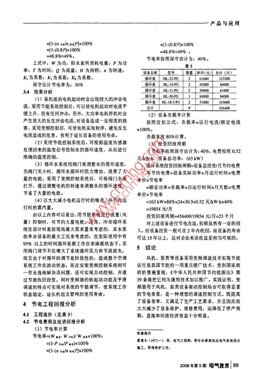 產(chǎn)品與應(yīng)用循環(huán)水泵系統(tǒng)的變頻改造霍建文(石家莊金剛集團(tuán),石家莊052165)摘要在工業(yè)生產(chǎn)和產(chǎn)品加工制造業(yè)中,風(fēng)機(jī)、泵類設(shè)備應(yīng)用范圍廣泛;其電能消耗是一筆不小的生產(chǎn)費(fèi)用開支。隨著經(jīng)濟(jì)改革的不斷深入,市場竟?fàn)幍牟粩嗉觿?節(jié)能降耗業(yè)已成為降低生產(chǎn)成本、提高產(chǎn)品質(zhì)量的重要手段之一,本文通過對我公司循環(huán)水泵系統(tǒng)改造實踐,闡述了變頻節(jié)能技朮的原理與應(yīng)用關(guān)鍵詞:變頻技術(shù);節(jié)能;應(yīng)用Circulating Pump System Frequency TransformationHuo jianwen((Shijiazhuang Jin gang Internal Combustion Engine Parts Group, Ltd, Shijiazhuang 052165Abstract The industrial production and the manufacturing of products, fans, pumps a wide rangeof equipment, its power consumption is a small production expenses. Alodeepening of economic reform, the growing competition in the market; saving energy has become acirculating pump system of practice on the application of energy-saving technologies Frequency panylower production costs, improve product quality one of the important means Based on the corKey words frequency conversion technology; energy saving; application1引言我單位循環(huán)水系統(tǒng)分布見表1。表1近年來,出于節(jié)能的迫切需要和對產(chǎn)品質(zhì)量不語號位置功率起動方式名稱斷提高的要求,加之采用變頻調(diào)速器(簡稱變頻器「中央空調(diào)室」2W「Y-△冷卻循環(huán)易操作、免維護(hù)、控制精度高,并可以實現(xiàn)高功能中央空調(diào)室1wy-△冷凍循環(huán)化等特點,因而采用變頻器驅(qū)動的方案開始逐步取中央空調(diào)室供暖循環(huán)代風(fēng)門、擋板、閥門的控制方案。車間冷卻水30w△冷卻循環(huán)15kw變頻調(diào)速技術(shù)的基本原理是根據(jù)電機(jī)轉(zhuǎn)速與工5車間冷卻水Y-△|冷卻循環(huán)作電源輸入頻率成正比的關(guān)系:m=60(1-),(式中185kWn、八、5、P分別表示轉(zhuǎn)速、輸入頻率、電機(jī)轉(zhuǎn)差率Y冷卻循環(huán)電機(jī)磁極對數(shù))通過改變電動機(jī)工作電源頻率達(dá)到22存在問題改變電機(jī)轉(zhuǎn)速的目的。變頻器就是基于上述原理采用交直交電源變換技術(shù)、電力電子、微電腦控制空調(diào)系統(tǒng)使用期間溫度波動范圍很大,在天氣等技術(shù)于一身的綜合性電氣產(chǎn)品。稍熱空調(diào)冷水機(jī)組制冷負(fù)荷降低時,所要求的冷卻水和冷凍水的流量要求均有所降低。如制冷量僅為我公司目前風(fēng)機(jī)、水泵等大的用電設(shè)備采用的其額定負(fù)荷的80%時,冷卻水流量僅需其額定流量是常規(guī)控制,存在很大電能浪費(fèi),我們根據(jù)公司領(lǐng)的80%,泠凍水流量僅需其額定流量的80%,就任導(dǎo)授權(quán),對公司循環(huán)水泵系統(tǒng)進(jìn)行了變頻改造,取何建筑物來說,選用空調(diào)系統(tǒng)都是按當(dāng)?shù)刈顭崽鞖獾昧溯^好的效果。時的最大制冷量來選取擇機(jī)型的,而根據(jù)一0年當(dāng)2設(shè)備應(yīng)用背景分析中空調(diào)機(jī)組運(yùn)行狀態(tài)進(jìn)行分析,其中90%的運(yùn)行時21用電設(shè)備情況間處于非滿負(fù)荷運(yùn)行狀態(tài)。而冷卻水泵、冷凍水泵在208年第5期電氣技術(shù)|87產(chǎn)品與應(yīng)用此90%的時間內(nèi)仍處于是100%的滿負(fù)荷運(yùn)行狀態(tài)。頻器調(diào)整電機(jī)的轉(zhuǎn)速。使用閥門調(diào)節(jié)循環(huán)系統(tǒng),電機(jī)作了大量的無用冷凍循環(huán)系統(tǒng)與冷卻部分類同,不再重復(fù)。功,造成了電能的浪費(fèi)根據(jù)我單位中央空調(diào)系統(tǒng)的實際情況以及對本3改造措施及原理效果分析系統(tǒng)改造的要求,在制冷主機(jī)制冷負(fù)荷不足100%時,本系統(tǒng)根據(jù)冷卻、冷凍出水和回水的溫度差,3.1系統(tǒng)組成動態(tài)地調(diào)整泵電機(jī)轉(zhuǎn)速,并以最小的電能向制冷主外部熱交換”系統(tǒng)由兩個循環(huán)水系統(tǒng)組成。機(jī)提供所需的水流量。(1)冷凍水循環(huán)系統(tǒng):由冷凍泵及冷凍管道組3.3節(jié)電原理分析成。從冷凍機(jī)組流出的冷凍水由冷凍泵加壓送入冷(1)節(jié)電原理凍水管道,在各個房間內(nèi)進(jìn)行熱交換,帶走房間內(nèi)由流體傳輸設(shè)備水泵的工作原理可知:水泵的的熱量,使房間內(nèi)的溫度下降。流量與其轉(zhuǎn)速成正比:水泵的壓力(揚(yáng)程)與其轉(zhuǎn)(2)冷卻水循環(huán)系統(tǒng):由冷卻泵、冷卻水管道速的平方成正比,而水泵的軸功率等于流量與壓力及冷卻塔組成。冷凍機(jī)組進(jìn)行熱交換使冷凍水溫度的乘積,故水泵的軸功率與其轉(zhuǎn)速的三次方成正比降低的同時,必將釋放大量的熱量。熱量釋放到冷(即與電源頻率的三次方成正比)如表2所示。卻水中,使冷卻水溫度升高。冷卻泵將升了溫的冷表2卻水壓入水塔,使之在冷卻塔中與大氣進(jìn)行熱交換頻率H轉(zhuǎn)速m%流量O%「壓力H%軸功率PA然后再將降了溫的冷卻水,送回到冷凍機(jī)組,如此不斷循環(huán),帶走冷凍機(jī)組內(nèi)釋放的熱量35709876根據(jù)上述原理可知:改變水泵的轉(zhuǎn)速就可改變水泵的輸出功率。例如將供電頻率由50Hz降為45Hz,則P4Ps0=453/503=0.729,即P45=0.729P50(P為電機(jī)軸功率);將供電頻率由50Hz降為40Hz則Po/Pso=403/503=0.