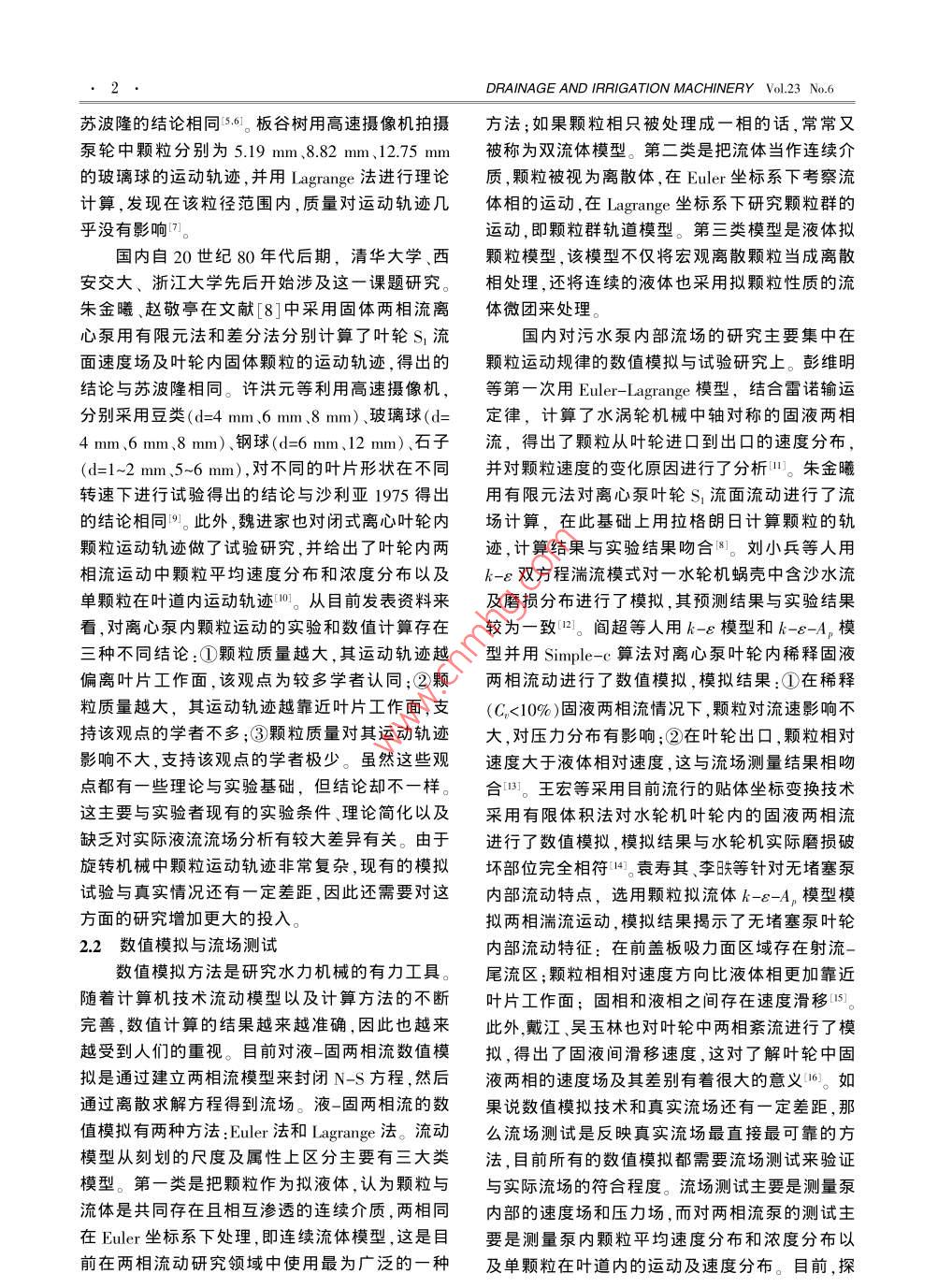 排灌機(jī)械第23卷 第6期叢小青等:污水泵的研究現(xiàn)狀與進(jìn)展1.污水泵的研究現(xiàn)狀與進(jìn)展叢小青,袁壽其,袁丹青2,陸偉剛1(1.江蘇大學(xué)流體機(jī)械工程技術(shù)中心,江蘇鎮(zhèn)江212013; 2.江蘇大學(xué)能源與動(dòng)力工程學(xué)院.江蘇鎮(zhèn)江212013),摘要:研究固液兩相流體在離心泵內(nèi)的運(yùn)動(dòng)規(guī)律、完善其設(shè)計(jì)理論和設(shè)計(jì)方法-直是設(shè)計(jì)人員十分重視的課題。針對(duì)污水泵的研究情況,分別從污水泵理論研究?jī)?nèi)特性研究、外特性研究、水力設(shè)計(jì)等幾個(gè)方面對(duì)污水泵的研究現(xiàn)狀進(jìn)行了較為詳細(xì)的闡述,指出加強(qiáng)泵內(nèi)外特性研究、探求流動(dòng)機(jī)理、開發(fā)適合水泵設(shè)計(jì)的專業(yè)化軟件用于泵產(chǎn)品的計(jì)算機(jī)集成制造(CIMS),將是泵行業(yè)發(fā)展的重要方向。關(guān)鍵詞:污水泵;兩相流;研究;現(xiàn)狀;進(jìn)展中圖分類號(hào): TH311文獻(xiàn)標(biāo)識(shí)碼: A文章編號(hào): 1005- -6254(2005)06 -001-0505理論及設(shè)計(jì)原理,即相對(duì)堵塞和相對(duì)抽吸理論:0引言當(dāng)固體速度小于水流速度時(shí)(例如在葉輪進(jìn)口),污水泵廣泛應(yīng)用于石化、礦山、冶金、電力以固相對(duì)水流產(chǎn)生相對(duì)堵塞效應(yīng);反之產(chǎn)生相對(duì)抽及城市排污等污水處理作業(yè)。隨著國(guó)民經(jīng)濟(jì)的發(fā)吸作用(例如在葉輪出口)。故而提出了兩相流水展,市場(chǎng)對(duì)污水泵的需求量日益增大。由于污水流畸變?cè)O(shè)計(jì)法并給出了畸變方程和輸運(yùn)方程[2]泵工作條件相當(dāng)惡劣,所抽送的介質(zhì)對(duì)污水泵工這個(gè)理論開創(chuàng)了固液兩相流宏觀研究的新局面。況有很大影響。因此,同清水泵相比,同樣比轉(zhuǎn)速80年代末,許洪元教授提出了固液兩相流速的污水泵效率相對(duì)較低,使用壽命較短,這將增度比理論[3],即:離心泵中兩相流動(dòng)屬于分離流加設(shè)備投資。因此,深入研究污水泵內(nèi)部流動(dòng)機(jī)動(dòng),在流道的不同部位,固體顆粒的受力不同,固理、提高污水泵效率和壽命一直是科研工作者努液兩相間的速度比發(fā)生變化,使兩相流體的濃度力的目標(biāo)。本文分別從污水泵理論研究、內(nèi)特性比隨之變化,由此導(dǎo)出了固液速度比方程,并給研究、外特性研究、水力設(shè)計(jì)等幾個(gè)方面介紹了出了葉輪幾何參數(shù)的計(jì)算公式。污水泵的研究現(xiàn)狀,并對(duì)今后的發(fā)展方向作了展2內(nèi)特性研究望。2.1泵輪內(nèi)固體顆粒運(yùn)動(dòng)規(guī)律的研究1流動(dòng)理論研究研究泵輪內(nèi)固體顆粒運(yùn)動(dòng)規(guī)律對(duì)污水泵設(shè)國(guó)內(nèi)外對(duì)固液兩相流動(dòng)理論作了很多研究,計(jì)有著重要的指導(dǎo)意義。30年前國(guó)外就有學(xué)者采但大多為管道內(nèi)的流動(dòng),對(duì)離心泵內(nèi)的流動(dòng)研究用高速攝影技術(shù)拍攝泵輪中固體顆粒運(yùn)動(dòng)軌跡,較少。在兩相流條件下,因?yàn)閼T性力不同,固液兩此后這方面的研究時(shí)有報(bào)道。蘇 波隆用高速攝影相各以不同的速度運(yùn)動(dòng)。只有根據(jù)兩相流的速度機(jī)拍攝了葉輪中顆粒分別為8~10mm的沙礫和場(chǎng)來(lái)設(shè)計(jì)泵的葉型和流道才能更有效地轉(zhuǎn)換能1~2mm的沙子的運(yùn)動(dòng)軌跡結(jié)果表明:顆粒質(zhì)量量并降低磨損。但泵內(nèi)的流態(tài)十分復(fù)雜,即使清越大,其運(yùn)動(dòng)軌跡越偏離葉片工作面4]。沙利亞分水也無(wú)法用純數(shù)學(xué)的方法求解,對(duì)于兩相流困難別于1975年和1983年利用高速攝影技術(shù)得到更大。到目前為止,還沒(méi)有建立一個(gè)公認(rèn)的數(shù)學(xué)了固體顆粒的運(yùn)動(dòng)軌跡,1975年作出的結(jié)論是顆方程式中。粒質(zhì)量越大,其運(yùn)動(dòng)軌跡越靠近葉片工作面,與70年代中期,蔡保元教授首先提出了兩相流蘇波隆結(jié)論截然相反;而1983年作出的結(jié)論和基金項(xiàng)目:江蘇省教育廳高新技術(shù)產(chǎn)業(yè)發(fā)展項(xiàng)目(JH03- 033);江蘇省教育廳六大人才資助項(xiàng)目作者簡(jiǎn)介:叢小青( 1966.6-),女,山東威海人,江蘇大學(xué)在讀博士生副研究員。DRAINAGE AND IRRIGATION MACHINERY Vol.23 No.6蘇波隆的結(jié)論相同15.1。板谷樹用高速攝像機(jī)拍攝;方法;如果顆粒相只被處理成一相的話,常常又泵輪中顆粒分別為5.19 mm .8.82 mm.12.75 mm被稱為雙流體模型。第二類是把流體當(dāng)作連續(xù)介的玻璃球的運(yùn)動(dòng)軌跡,并用Lagrange法進(jìn)行理論質(zhì),顆粒被視為離散體,在Euler 坐標(biāo)系下考察流計(jì)算,發(fā)現(xiàn)在該粒徑范圍內(nèi),質(zhì)量對(duì)運(yùn)動(dòng)軌跡幾體相的運(yùn)動(dòng),在Lagrange坐標(biāo)系下研究顆粒群的乎沒(méi)有影響[7運(yùn)動(dòng),即顆粒群軌道模型。第三類模型是液體擬國(guó)內(nèi)自20世紀(jì)80年代后期,清華大學(xué)、西顆粒模型,該模型不僅將宏觀離散顆粒當(dāng)成離散安交大、浙江大學(xué)先后開始涉及這一課題研究。相處理,還將連續(xù)的液體也采用擬顆粒性質(zhì)的流朱金曦、趙敬亭在文獻(xiàn)[8]中采用固體兩相流離體微團(tuán)來(lái)處理。