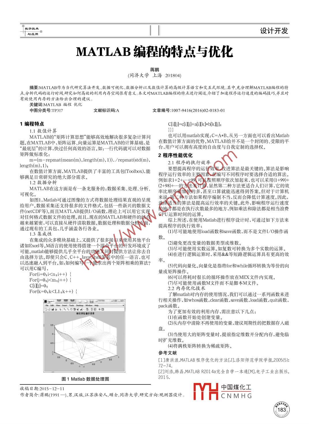 |數(shù)字技術(shù)設(shè)計(jì)開(kāi)發(fā)f與應(yīng)用MATLAB編程的特點(diǎn)與優(yōu)化蔣鵬(同濟(jì)大學(xué).上海 201804)摘要:MATLAB作為當(dāng)代研究算法開(kāi)發(fā)、數(shù)據(jù)可視化、數(shù)據(jù)分析以及數(shù)值計(jì)算的高級(jí)計(jì)算語(yǔ)言和交互式環(huán)境。其中,充分理解MATLAB編程的特點(diǎn)分析代碼的運(yùn)行時(shí)間,研究如何高效的利用內(nèi)存空間很有意義。本文對(duì)MATLAB編程的特點(diǎn)進(jìn)行闡述,介紹了加速程序運(yùn)行速度的編碼技巧,并且對(duì)有效使用內(nèi)存的方法給出合理的建議。關(guān)鍵詞:MATLAB編程優(yōu)化中圖分類號(hào):TP317文獻(xiàn)標(biāo)識(shí)碼:A文章編號(hào):1007-9416(2016)02-0183-011編程特點(diǎn).Cili]=c[ilij]+ alil[k]*b[k]li];1.1數(shù)值計(jì)算MATLAB的“矩陣計(jì)算思想”能夠高效地解決很多復(fù)雜計(jì)算問(wèn)也可以用matlab實(shí)現(xiàn):C=A*B,從另一方 面也可以看出Matlab題。在MATLAB中,矩陣運(yùn)算.向量運(yùn)算是MATLAB的計(jì)算基礎(chǔ),是在數(shù)值計(jì)算方面的優(yōu)勢(shì).MATLAB給并不是一-個(gè)封閉的 .受限的平“最底層”的計(jì)算,快過(guò)任何高效的語(yǔ)言。如:一-行代碼就可以對(duì)數(shù)據(jù)臺(tái),用戶可以擁有 高度的自由度與自我定制的選擇權(quán)。矩陣做標(biāo)準(zhǔn)化:2程序性能優(yōu)化m=(m-repmat(mean(m) , length(m), 1)). /repmat(std(m),2.1程序的執(zhí)行效率length(m),1);在數(shù)值計(jì)算方面, MATLAB提供了豐富的工具包(Toolbox),能要想提高程序的運(yùn)行效率,改進(jìn)算法是最關(guān)鍵的。算法是影響程序運(yùn)行效率的主要因素,在編寫(xiě)不同程序時(shí)要選擇合適的算法。夠滿足日常研究的絕大部分需求。例如求2+2+..+99,可以按照順序依次加起來(lái),也可以采用(1+99)+1.2數(shù)據(jù)分析MATLAB在這方面是有一.條龍服務(wù)的:數(shù)據(jù)采集、處理、分析.(2+98)+...的方法來(lái)計(jì)算,顯然第二種方法更適合人們計(jì)算,它的效率比順序相加快的多,甚至口算就能迅速得到答案。但對(duì)于計(jì)算機(jī)可視化。如圖1,Matlab可通過(guò)圖像的方式將數(shù)據(jù)處理結(jié)果直觀的呈現(xiàn)來(lái)說(shuō),第二種方法如果程序編制不當(dāng),反而會(huì)降低計(jì)算速度。因此,給用戶。數(shù)據(jù)采集還支持很多的文件格式,包括--些新興的數(shù)據(jù)文選擇適當(dāng)?shù)乃惴ㄊ翘岣哌\(yùn)行效率的關(guān)鍵。此外,影響程序運(yùn)行速度件(netCDF等)。而且MATLAB提供I/O函數(shù),理論上可以用它實(shí)現(xiàn)的地方都是在執(zhí)行次數(shù)最多的地方,例如乘法和除法都是相當(dāng)浪費(fèi)對(duì)任何格式數(shù)據(jù)文件的處理。而且,現(xiàn)在的MATLAB和硬件的結(jié)合CPU運(yùn)算時(shí)間的運(yùn)算。越來(lái)越緊密,可以直接從硬件讀取數(shù)據(jù)。數(shù)據(jù)處理和數(shù)據(jù)分析方面,綜上所述,在使用Matlab進(jìn)行程序設(shè)計(jì)時(shí),可通過(guò)如下方法來(lái)提高程序的執(zhí)行效率:通過(guò)現(xiàn)有的工具包,幾乎涵蓋各行各業(yè)。(1)盡可能地使用load函數(shù)和save函數(shù),而不是文件I/O操作函1.3集成性在集成的眾多模塊基礎(chǔ)上,又提供了很多接口來(lái)使用其他平臺(tái)數(shù)(2)避免更改變量的數(shù)據(jù)類型或維數(shù)。諸如Excel等。M語(yǔ)言的使用使得搭建一個(gè)混合 平臺(tái)的開(kāi)發(fā)環(huán)境成了(3)盡可能使用實(shí)數(shù)運(yùn)算。如復(fù)數(shù)可轉(zhuǎn)換為多個(gè)實(shí)數(shù)的運(yùn)算??赡?。matlab能夠提供幾乎全平臺(tái)的功能又同時(shí)提供方法讓你去自(4)在進(jìn)行邏輯運(yùn)算時(shí),采用&&等短路邏輯運(yùn)算具有更高的效由選擇方法。即使只會(huì)C、C++.Java. shell等其中的任一-語(yǔ)言,也可率以迅速融入到平臺(tái)。如:如何編寫(xiě)一個(gè)能求出兩 個(gè)矩陣相乘的算法?(5)代碼向量化。向量化是指將for和while循環(huán)轉(zhuǎn)換為等價(jià)的向可以用C編寫(xiě),量或矩陣操作。For(i=0;i