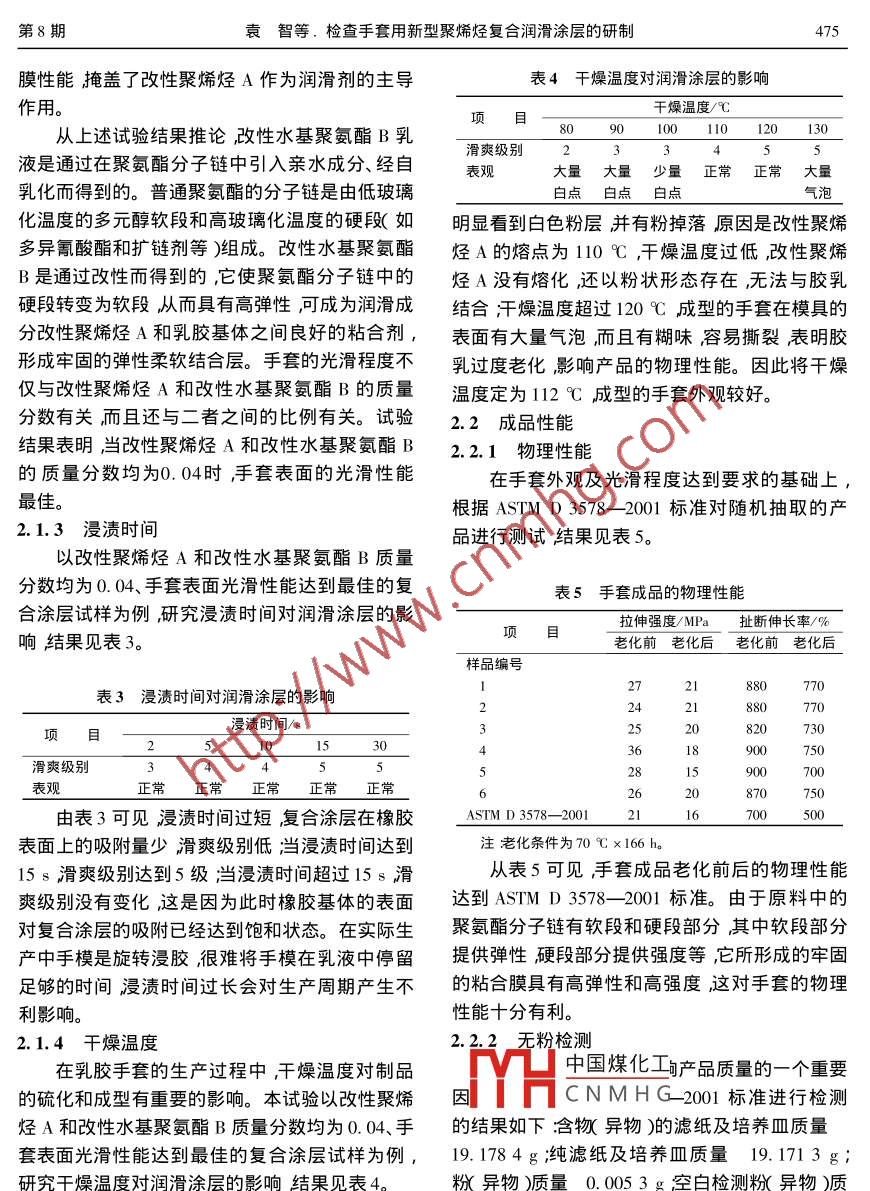 第8期袁智等.檢查手套用新型聚烯烴復(fù)合潤滑涂層的研制473檢查手套用新型聚烯烴復(fù)合潤滑涂層的研制袁智王曉鈞周洪慶〔南京工業(yè)大學(xué)材料科學(xué)與工程學(xué)院江蘇南京210009)摘要研究以改性聚烯烴和改性水基聚氨酯為主體材料旳新型復(fù)合潤滑涂層的制備及影響因素。改性聚烯烴和改性水基聚氨酯的質(zhì)量分數(shù)均為0.04浸漬時間為155千燥溫度為112℃手套的光滑性能最佳滑爽級別達到級。以此條件制備的手套物理性能達到 ASTM D3578-2001標準殘余粉質(zhì)量分數(shù)符合 ASTM D6124-2001標準要求關(guān)鍵詞檢査手套改性聚烯烴改性水基聚氨酯滑爽級別中圖分類號πQ33.6TQ30.387文獻標識碼B文章編號1000890X(2003)0840473-04檢査手套是一種薄型、隨用即棄的一次性手水基聚氨酯為主體材料的新型復(fù)合乳液涂層的制套。乳膠手套具有自粘性不易脫戴因此需要將備及影響因素。其設(shè)計成表面爽滑而易于脫戴的手套。國外在這方面進行了大量的研究開發(fā)工作經(jīng)歷了從有粉1實驗手套到無粉手套的發(fā)展階段。近年來無粉手套1.1主要原材料涂覆非粘性水基聚合物乳液受到重視12。適合改性聚烯烴A相對分子質(zhì)量為800~2000于制造非粘性橡膠制品表面潤滑涂層的水凝膠聚是一種經(jīng)過特殊改性的水基聚烯烴乳液固形物合物主要有聚乙烯基吡咯烷酮、聚乙烯酰胺或聚質(zhì)量分數(shù)≥0.30,顆粒粒徑<15μmpH值為甲基丙烯酸羥乙酯等。1974年美國 Podell「3第一7.1乳液粘度為125mPa·s熔點為110℃江蘇次提出了無粉乳膠手套的概念即在普通手套內(nèi)騰達助劑廠產(chǎn)品改性水基聚氨酯B實驗室自表面涂一層水凝膠樹脂并用硅氧烷樹脂來增強制凝固劑硝酸鈣張家港橡膠廠提供。涂覆層的潤滑性而且涂覆層與手套基體粘合成1.2涂覆液的設(shè)計和制備個整體。1982年英國的CRC制造有限公司與聚烯烴為不飽和物經(jīng)改性的水基聚烯烴乳Pωdl共同研究解決了水凝膠涂層在橡膠基體上液可與其它聚合物熔融混合,具有優(yōu)良的潤滑粘合的關(guān)鍵問題之后無粉乳膠手套的生產(chǎn)技術(shù)性及較小的摩擦因數(shù)(0.08-0.20)在涂料工才趨于成熟并于1984年實現(xiàn)了工業(yè)化生產(chǎn)4。業(yè)中有較廣泛的應(yīng)用。聚氨酯分子鏈中含氨基甲國內(nèi)在這方面也做了一些工作主要是利用改性酸酯官能團因而具有良好的粘合性能、彈性、耐聚氨酯乳液3、聚氨甲?;撬徕c表面處理液61曆性、耐油性及耐候性較高的強度及較小的摩擦或丙烯酸乳液通過與低表面能的單體——丙烯酸因數(shù)可以作為聚烯烴與橡膠基體之間良好的粘酯類及甲基丙烯酸酯等單體共聚而得到滑爽涂合劑。分散劑也選擇一種水基乳液它可使微小層7。這些新型高分子水凝膠的應(yīng)用使滑爽手粒子在淚合液中均勻分散套得到了很好的發(fā)展但手套的滑爽程度還有待中國煤化工水基聚氨酯B及分散進一步提高況且在國內(nèi)還沒有實現(xiàn)滑爽手套的劑CNMH進行稀釋攪拌并使批量生產(chǎn)。本工作研究了以改性聚烯烴和改性合液分散均勻即得到復(fù)合涂覆液。1.3無粉手套的制備工藝作者簡介袁{1978-)女江蘇泰興人南京工業(yè)大學(xué)在讀無粉手套的制備工藝流程為清洗模具→模碩士研究生互數(shù)藕靄分子復(fù)合材料的研究工作。具干燥→模具浸凝固劑→模具干燥→浸夭然膠乳474橡膠工業(yè)2003年第50卷半干燥→浸涂覆液→干燥→卷邊→干燥硫化體白粉的脫落說明改性聚烯烴A質(zhì)量分數(shù)過脫模。大沒能與改性水基聚氨酯B和基體牢固結(jié)合。脫模后手套只有內(nèi)表面涂覆滑爽涂層而外改性水基聚氨酯B質(zhì)量分數(shù)為0.03改性聚表面則沒有仍具有粘合性對成品的存放不利,烯烴A質(zhì)量分數(shù)小于0.04手套外表面正常沒因此用改性無毒潤滑劑進行處理有岀現(xiàn)白點改性聚烯烴A質(zhì)量分數(shù)大于0.04白點數(shù)增多,說明在改性聚烯烴A質(zhì)量分數(shù)相同2結(jié)果與討論的情況下改性水基聚氨酯B質(zhì)量分數(shù)過大會影2.1復(fù)合潤滑涂層的影響因素響涂層的光滑性這是由于起滑爽作用的改性聚滑爽性是乳膠手套性能的一項重要指標良烯烴A被改性水基聚氨酯B所形成的膜所覆蓋好的穿戴性是無粉手套的主要特征之一也是檢的緣故。驗其性能的普通方法。根據(jù)文獻介紹,一般分改性水基聚氨酯B質(zhì)量分數(shù)為0.04改性聚為5個滑爽級別級為表面有粘性2級為表面烯烴A質(zhì)量分數(shù)小于0.04手套外表面正常沒光滑性差3級為表面光滑性一般A級為表面光有出現(xiàn)白點;當改性聚烯烴A質(zhì)量分數(shù)為0.04滑性良好5級為表面光滑性優(yōu)良。無粉復(fù)合涂和0.05時手套的滑爽級別達到了5級洏在改層的性能除了與涂覆液組成原料本身的性能有關(guān)性聚烯烴A質(zhì)量分數(shù)為0.05時手套表面岀現(xiàn)外還與復(fù)合涂覆液的固形物質(zhì)量分數(shù)、漫漬時間了易脫落的白點。改性水基聚氨酯B質(zhì)量分數(shù)及干燥溫度有較大關(guān)系。定時改性聚烯烴A的質(zhì)量分數(shù)過大,會導(dǎo)致2.1.1改性聚烯烴A質(zhì)量分數(shù)復(fù)合涂層結(jié)合得不牢固。本試驗選擇改性水基聚氨酯B質(zhì)量分數(shù)分2.1.2改性水基聚氨酯B質(zhì)量分數(shù)別為0.020.03和0.04研究改性聚