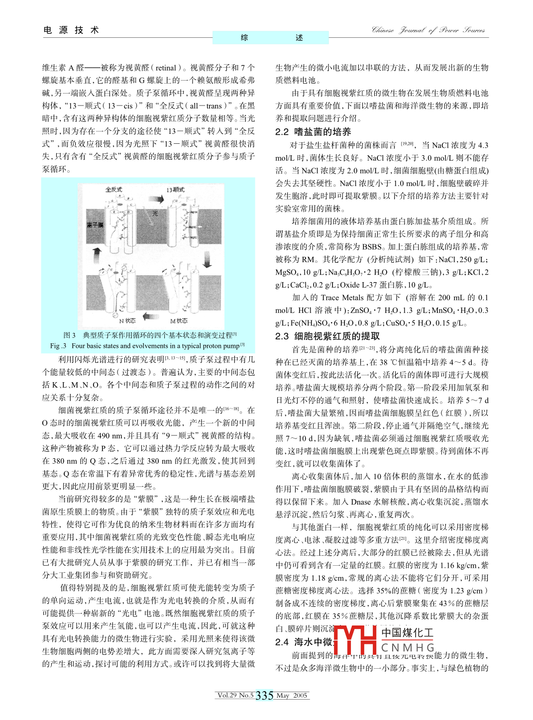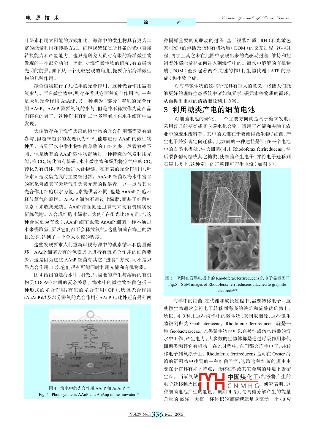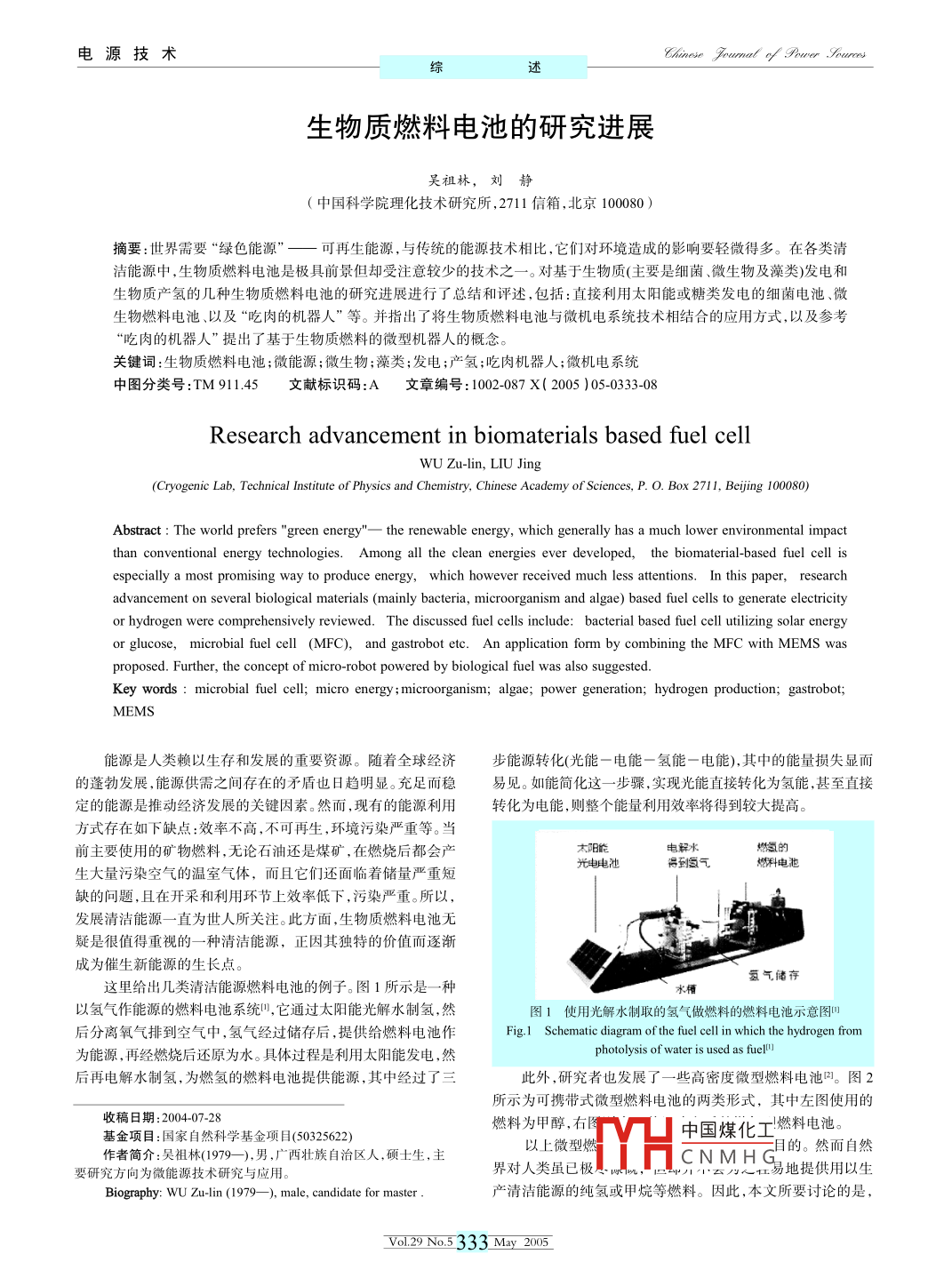 電源技術(shù)Chinee oumal y e purm生物質(zhì)燃料電池的研究進展吳祖林,劉靜(中國科學院理化技術(shù)研究所,2711信箱,北京100080)摘要:世界需要¨綠色能源”——可再生能源,與傳統(tǒng)的能源技術(shù)相比,它們對環(huán)境造成的影響要輕微得多。在各類清潔能源中,生物質(zhì)燃料電池是極具前景但卻受注意較少的技術(shù)之一。對基于生物質(zhì)(主要是細菌、微生物及藻類)發(fā)電和生物質(zhì)產(chǎn)氫的幾種生物質(zhì)燃料電池的研究進展進行了總結(jié)和評述,包括:直接利用太陽能或糖類發(fā)電的細菌電池、微生物燃料電池、以及“吃肉的機器人”等。并指出了將生物質(zhì)燃料電池與微機電系統(tǒng)技術(shù)相結(jié)合的應用方式,以及參考“吃肉的機器人”提出了基于生物質(zhì)燃料的微型機器人的概念。關鍵詞:生物質(zhì)燃料電池;微能源;微生物;藻類;發(fā)電;產(chǎn)氫;吃肉機器人;微機電系統(tǒng)中圖分類號:TM911.45文獻標識碼:A文章編號:1002087X(2005)05-033308Research advancement in biomaterials based fuel cellWU Zu-lin, LIU JingCryogenic Lab, Technical Institute of Physics and Chemistry, Chinese Academy of Sciences, P.O. Box 2711, Beijing 100080)Abstract: The world prefers"green energy"- the renewable energy, which generally has a much lower environmental impactthan conventional energy technologies. Among all the clean energies ever developed, the biomaterial-based fuel cell isespecially a most promising way to produce energy, which however received much less attentions. In this paperdvancement on several biological materials(mainly bacteria, microorganism and algae)based fuel cells to generate electricityor hydrogen were comprehensively reviewed. The discussed fuel cells include: bacterial based fuel cell utilizing solar energyor glucose, microbial fuel cell (MFC), and gastrobot etc. An application form by combining the MfC with MEMs wasproposed. Further, the concept of micro-robot powered by biological fuel was also suggestedKey words: microbial fuel cell; micro energy; microorganism; algae; power generation; hydrogen production; gastrobotMEMS能源是人類賴以生存和發(fā)展的重要資源。隨著全球經(jīng)濟步能源轉(zhuǎn)化(光能一電能一氫能一電能),其中的能量損失顯而的蓬勃發(fā)展,能源供需之間存在的矛盾也日趨明顯。充足而穩(wěn)易見。如能簡化這一步驟,實現(xiàn)光能直接轉(zhuǎn)化為氫能,甚至直接定的能源是推動經(jīng)濟發(fā)展的關鍵因素。然而,現(xiàn)有的能源利用轉(zhuǎn)化為電能,則整個能量利用效率將得到較大提高方式存在如下缺點:效率不高,不可再生,環(huán)境污染嚴重等。當前主要使用的礦物燃料,無論石油還是煤礦,在燃燒后都會產(chǎn)太能電解水順的生大量污染空氣的溫室氣體,而且它們還面臨著儲量嚴重短光電電池得到垣氣電抱缺的問題,且在開采和利用環(huán)節(jié)上效率低下,污染嚴重。所以展清潔能源一直為世人所關注。此方面,生物質(zhì)燃料電池無疑是很值得重視的一種清潔能源,正因其獨特的價值而逐漸成為催生新能源的生長點。氫氣佬存文里給出幾類清潔能源燃料電池的例子。圖1所示是一種以氫氣作能源的燃料電池系統(tǒng),它通過太陽能光解水制氫,然圖1使用光解水制取的氫氣做燃料的燃料電池示意圖后分離氧氣排到空氣中,氫氣經(jīng)過儲存后,提供給燃料電池作Fig 1 Schematic diagram of the fuel cell in which the hydrogen from為能源,再經(jīng)燃燒后還原為水。具體過程是利用太陽能發(fā)電,然photolysis of water is used as fuel后再電解水制氫,為燃氫的燃料電池提供能源,其中經(jīng)過了三此外,研究者也發(fā)展了一些高密度微型燃料電池。圖2所示為可攜帶式微型燃料電池的兩類形式,其中左圖使用的收稿日期:2004-07-28燃料為甲醇,右圖基金項目:國家自然科學基金項目(50325622)H中國煤化工燃料電池。作者簡介:吳祖林(1979),男,廣西壯族自治區(qū)人,碩士生,主以上微型燃CNMHG目的。然而自然要研究方向為微能源技術(shù)研究與應用。界對人類雖已極地提供用以生Biography: WU Zu-lin(1979-), male, candidate for master產(chǎn)清潔能源的純氫或甲烷等燃料。因此,本文所要討論的是May 20L電源技術(shù)Chinee oumal y e purm輕、密度小,用途廣泛,是取代傳統(tǒng)能源的一個極有發(fā)展前景的清潔能源。傳統(tǒng)的制氫方法,如電解水,或髙壓高溫制氫,都P和u訊一估運1rt生仁劑位己需消耗大量的電能、煤或天然氣等其它能源,費用太高,且違背了氫氣作為清潔能源的一個主要優(yōu)勢。所以,一般傾向于利用光電化學電池分解水制氫,利用太陽光照射到半導體氧化oH10→·0+鈦表面時,在氧化鈦上產(chǎn)生的電流會使水分解,產(chǎn)生氫氣,效率已達12%,是一種很有前途的制氫方法。圖2微型燃料電池的兩類研究方向凹另外一個受到關注的產(chǎn)氫方式即為生物質(zhì)制氫。1942年Fig 2 Two research interests on micro fuel cell 2)前后,科學家發(fā)現(xiàn)一些藻類的完整細胞,可以利用陽光產(chǎn)生氫如何效法自然,并利用自然界賦予的生物材料來獲取能源,也氣流。7年之后,又有科學家通過實驗證明某些具有光合作用生物質(zhì)燃料電池的概念的菌類也能產(chǎn)生氫氣。此后,許多科研工作者從不同角度展開1生物質(zhì)發(fā)電和產(chǎn)氫了利用微生物產(chǎn)生氫氣的研究。近年來,已查明有16種綠藻1.1生物質(zhì)發(fā)電和3種紅藻類有制氫的能力。藻類主