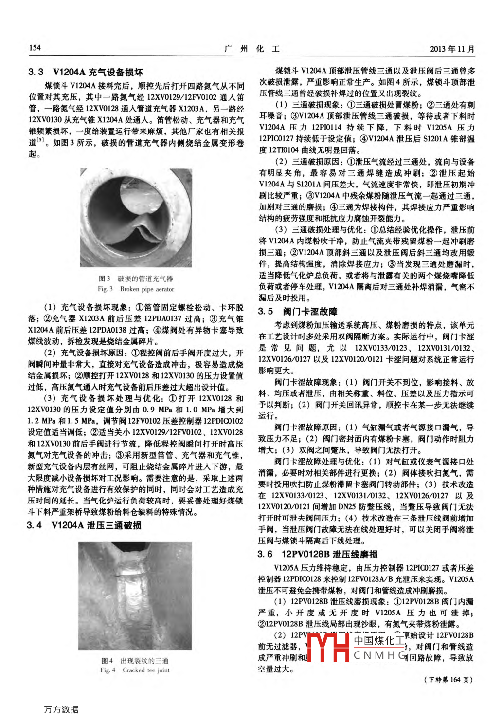 第41卷第22期廣州化工Vol. 41 No. 222013年11月Guangzhou Chemical IndustryNovember. 2013Shell煤氣化煤粉加壓輸送系統(tǒng)運(yùn)行問(wèn)題的處理優(yōu)化宋金榮,王治華,李海賓(中國(guó)神華煤制油化工有限公司鄂爾多斯煤制油分公司,內(nèi)蒙古鄂爾多斯 017209)摘要: 介紹了Shell煤氣化工藝煤粉加壓輸送系統(tǒng)的工藝原理和工藝流程,總結(jié)了神華煤直接液化項(xiàng)目煤粉加壓輸送系統(tǒng)運(yùn)行中出現(xiàn)的問(wèn)題,對(duì)煤粉倉(cāng)裝料袋濾器錐部堵粉和布袋損壞、煤鎖斗充氣設(shè)備損壞、煤鎖斗泄壓三通破損、重要閥門卡澀、煤粉給料倉(cāng)泄壓線磨損等問(wèn)題的現(xiàn)象、原因、處理措施作了詳細(xì)闡述和討論。關(guān)鍵詞: Shell 煤氣化;煤粉加壓輸送;運(yùn)行問(wèn)題;分析處理;煤直接液化中圖分類號(hào): TQ546.2文獻(xiàn)標(biāo)識(shí)碼: B文章編號(hào): 1001 -9677(2013)22 -0152 -04Treatment Optimization of Pulverized Coal Pressurisation andFeeding System of Shell Coal Gasification ProcessSONG Jin -rong, WANG Zhi - hua, LI Hai - bin( China Shenhua Coal to Liquid and Chemical Ordos CoalLiquefaction Corporation, Inner Mongolia Ordos 017209, China)Abstract: Technological principle and process of pulverized coal pressurisation and feeding system for Shell CoalGasification Process were introduced. Several emerging issues of Pulverized coal pressurisation and feeding system oShenhua Direct Coal Liquefaction project were summarized. Phenomena, causes and treatment measures of those issueswere elaborated and discussed speifcally,which included pulverized coal fill filter pyramis blockage, breakage of filterbag, coal sluice vessel infation equipment and decompression tee joint, key valve jam, as well as coal feed vesseldecompression pipe attrition.Key words: Shell coal gasification process ; pulverized coal pressurization and feeding; operating problem; analysisand process treatment ; direct coal liquefaction基于缺油、少氣、相對(duì)富煤的資源特點(diǎn),科學(xué)合理發(fā)展現(xiàn)進(jìn)行充壓,充壓過(guò)高可經(jīng)煤鎖斗高壓過(guò)濾器泄掉-部分。煤鎖代煤化工,清潔利用煤炭資源是減輕環(huán)境污染和對(duì)石油資源依斗和煤粉給料倉(cāng)間設(shè)計(jì)有平衡線,放料時(shí)可使兩者壓力保持一賴的戰(zhàn)略選擇"。煤氣化是實(shí)現(xiàn)煤炭綜合利用和潔凈煤技術(shù)的致下料順暢。煤粉給料倉(cāng)也設(shè)計(jì)有充壓、泄壓線,并由相應(yīng)控重要技術(shù)和主要手段,是發(fā)展現(xiàn)代煤化工、煤制油、燃料煤氣制器來(lái)維持壓 力穩(wěn)定。高壓氮?dú)馔ㄈ朊悍劢o料倉(cāng)充氣錐,使煤等工業(yè)化生產(chǎn)的龍頭[2]。Shell 煤氣化技術(shù)采用干粉煤進(jìn)料、高粉流化懸浮后以穩(wěn)定流量供至煤燒嘴,而這是一個(gè)連續(xù)操作過(guò)溫加壓氣流床氣化”),是目前世界上較為先進(jìn)的第二代煤氣化程。煤鎖斗的間歇操作周期與煤燒嘴連續(xù)耗煤負(fù)荷相匹配,才.工藝之一,國(guó)內(nèi)有多家單位先后累計(jì)引進(jìn)27套Shell煤氣化裝能保障整個(gè)裝置生產(chǎn)持續(xù)運(yùn)行。置。煤粉加壓輸送是磨煤干燥和煤粉氣化的銜接單元,一旦發(fā)生煤粉倉(cāng)裝料袋濾器錐部堵粉或布袋損壞、煤鎖斗充氣設(shè)備損2煤粉加壓輸送 系統(tǒng)工藝流程壞、煤鎖斗泄壓三通破損、重要閥門卡澀、煤粉給料倉(cāng)泄壓線以A系列為例,煤粉加壓輸送系統(tǒng)工藝流程如圖1所示。磨損等問(wèn)題,勢(shì)必影響整個(gè)Shell煤氣化裝置的正常運(yùn)行。當(dāng)V1205A低料位出現(xiàn)時(shí),煤鎖斗V1204A底部放料鎖斗閥1煤粉加壓輸送 系統(tǒng)工藝原理12XV0131/0132 開(kāi)啟,向V1205A補(bǔ)充煤粉。當(dāng)煤鎖斗V1204A排空后,關(guān)閉放料鎖斗閥和均壓閥12XV0126/0127,與煤粉給煤粉加壓輸送系統(tǒng)主要通過(guò)煤鎖斗變壓操作來(lái)實(shí)現(xiàn)接料和料倉(cāng)V1205A隔離,通過(guò)三級(jí)泄壓將V1204A壓力泄至煤粉倉(cāng)放料,煤鎖斗泄壓從低壓煤粉儲(chǔ)倉(cāng)接料,隔離充壓向高壓煤粉裝料袋濾器S1201A。從磨煤干燥系統(tǒng)來(lái)的煤粉經(jīng)螺旋給料機(jī)儲(chǔ)倉(cāng)放料,系間歇操作過(guò)程。煤粉倉(cāng)裝料袋濾器頂部與大氣相X1102A、X1105A/B連續(xù)輸送到低壓煤粉儲(chǔ)倉(cāng)V1201A中。當(dāng)通,煤粉儲(chǔ)倉(cāng)與煤粉倉(cāng)裝料袋濾器間有連通線可保持常壓,煤V1204A和低壓中國(guó)煤化工平衡后,V1204A 頂鎖斗及煤粉給料倉(cāng)均泄壓至此,PLC 控制低壓氮?dú)膺M(jìn)行反吹使部接料閥12XVV1204A進(jìn)行裝填。布袋再生。煤粉倉(cāng)裝料袋濾器底部旋轉(zhuǎn)給料器和螺旋輸送機(jī),當(dāng)V1204A裝滿MHCNMHG與V1201A隔離,可將泄壓帶來(lái)的煤粉返回煤粉儲(chǔ)倉(cāng)。四條高壓氮?dú)饩€對(duì)煤鎖斗通過(guò)高壓氮?dú)饩€對(duì) V1204A加壓。當(dāng)V1204A壓力接近V1205A作者簡(jiǎn)介:宋金榮(1983-), 男,助理工程師,主要從事煤炭氣化與清潔利用研究。.164廣州化工2013年11月根據(jù)加熱爐熱效率反平衡法計(jì)算公式: η = 100% -(排煙5.3.2減少電的消耗損失+表面散熱損失+不完全燃燒損失+輔助設(shè)備耗能)可以增加變頻器之后,能夠更好的調(diào)節(jié)煙氣氧含量,獲得熱媒看出,在熱媒爐正常運(yùn)行時(shí)排煙損失占加熱爐總熱損失量的比爐燃燒時(shí)需要的最佳風(fēng)量,使其在控制穩(wěn)定的