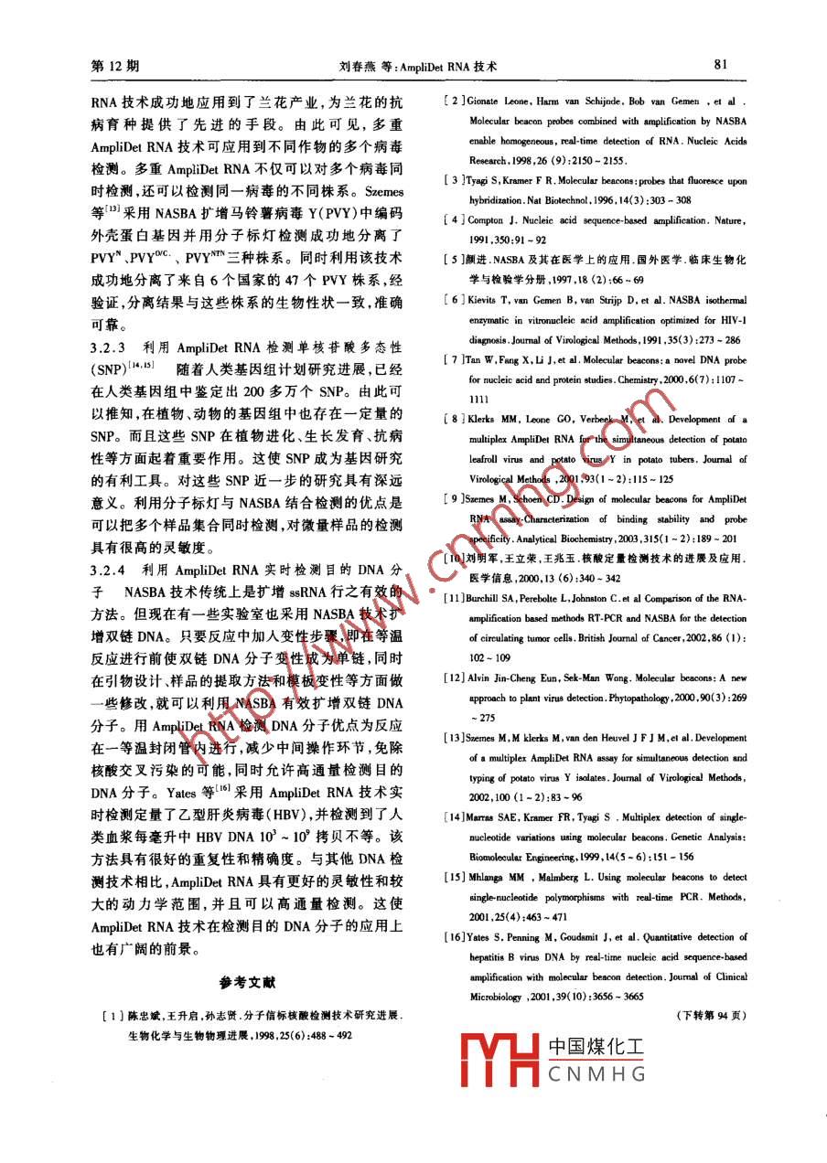 中國(guó)生物工程雜志第23卷第12期CHINA BIOTECHNOLOGY2003年12月AmpliDet RNA技術(shù)劉春燕*陳慶山梁秀瑞張立軍李文濱(東北農(nóng)業(yè)大學(xué)大豆研究所150030)Q7 A摘要隨著分子生物學(xué)發(fā)展,核酸實(shí)時(shí)定量檢測(cè)已成為人們研究的 熱點(diǎn)問(wèn)題。分子標(biāo)燈與NASBA結(jié)合實(shí)時(shí)檢測(cè)ssRNA發(fā)展成為一種新技術(shù),稱為AmpliDet RNA。就NASBA擴(kuò)增原理、分子標(biāo)燈的結(jié)構(gòu)和AmpliDet RNA的特點(diǎn)及應(yīng)用作一簡(jiǎn)單介紹。關(guān)鍵詞分子標(biāo)燈 NASBA AmpliDet RNA sRNA隨著分子生物學(xué)技術(shù)的迅猛發(fā)展,核酸體外擴(kuò)體外特異核苷酸序列等溫?cái)U(kuò)增酶促過(guò)程。反應(yīng)在.增巳在各實(shí)驗(yàn)室得到普及應(yīng)用,進(jìn)而在擴(kuò)增過(guò)程中42C進(jìn)行,擴(kuò)增速度與PCR -樣快,在3h內(nèi)可擴(kuò)增做到實(shí)時(shí)定量檢測(cè)已成為人們研究的熱點(diǎn)問(wèn)題。1000萬(wàn)倍(1。NASBA技術(shù)均-.地等溫?cái)U(kuò)增特性擴(kuò)目前核酸檢測(cè)常用的方法有DNA印跡、RNA印跡、大了它的應(yīng)用范圍,并且用NASBA擴(kuò)增雙鏈DNA酶聯(lián)免疫法(ELISA)等,這些技術(shù)操作繁瑣復(fù)雜,費(fèi)也已有報(bào)道。時(shí),技術(shù)難度大,而且難以對(duì)核酸進(jìn)行準(zhǔn)確定量檢NASBA反應(yīng)依賴于AMV反轉(zhuǎn)錄酶.RNA酶H、測(cè)"。而分子標(biāo)燈是與PCR、 RT-PCR、NASBAT,RNA聚合酶共同協(xié)作完成,標(biāo)準(zhǔn)的NASBA反應(yīng)( nucleic acid sequence- based amplification) 相結(jié)合進(jìn)體系除以上3種酶外,還應(yīng)有脫氧核糖核苷三磷酸行核酸定量檢測(cè)的一種新技術(shù)。其中分子標(biāo)燈與(dNTP)、核糖核苷三磷酸(NTP)、兩個(gè)特殊的引物NASBA結(jié)合是一種實(shí)時(shí)檢測(cè)特異單鏈RNA和適宜的緩沖液。其中引物I 3’端與靶序列互補(bǔ),(ssRNA)的有效方法,這種新技術(shù)稱為AmpliDet5'端具有被T,RNA聚合酶識(shí)別的啟動(dòng)子序列,引物RNA,現(xiàn)已在許多診斷研究方面得以應(yīng)用”。II的5'端序列與靶RNA序列相同5.6]。NASBA技術(shù)是體外等溫?cái)U(kuò)增ssRNA 的酶促過(guò)程。NASBA整個(gè)反應(yīng)分為兩相:非循環(huán)相和循環(huán).該反應(yīng)依賴于AMV反轉(zhuǎn)錄酶(AMV-RT)、RNA酶H相。如開(kāi)始用RNA靶序列,反應(yīng)將如此進(jìn)行:首(RNaseH)、T,RNA聚合酶(T, RNA polymerase)共 同先,5'端含有RNA聚合酶啟動(dòng)子序列的引物I與協(xié)作擴(kuò)增反義原靶序列RNA。分子標(biāo)燈是一種與靶序列復(fù)性,并由反轉(zhuǎn)錄酶催化產(chǎn)生一cDNA鏈,核酸雜交能產(chǎn)生熒光的一種新 型探針'”。分子標(biāo)以RNaseH降解新生成的雙鏈螺旋中的RNA,這樣燈與NASBA結(jié)合能高通量檢測(cè)核酸,同時(shí),擴(kuò)增與生成了帶有啟動(dòng)子序列的eDNA,稱為非循環(huán)相。檢測(cè)在同- - 封閉管內(nèi)進(jìn)行,臧少了核酸交叉污染的然后,引物I與裸露的cDNA復(fù)性,進(jìn)行第二鏈的危險(xiǎn),減少中間操作步驟,省時(shí)省力。現(xiàn)將分子標(biāo)合成,啟動(dòng)子序列變?yōu)殡p鏈。這時(shí), RNA聚合酶可燈技術(shù)與NASBA反應(yīng)原理及AmpliDetRNA定量檢以合成一反義原靶序列的多個(gè)拷貝啟動(dòng)子序列。.測(cè)核酸的應(yīng)用作一簡(jiǎn)述。反過(guò)來(lái),它們又可作為反應(yīng)循環(huán)相中cDNA合成模板,繼續(xù)合成反義原靶序列RNA。過(guò)程見(jiàn)圖1。1 NASBA擴(kuò)增反應(yīng)原理NASBA的特點(diǎn)是操作簡(jiǎn)便,不需特殊儀器,不NASBA(依賴核酸序列的擴(kuò)增)是AmpliDet需溫度循環(huán),整個(gè)反應(yīng)過(guò)程由三種酶控制,循環(huán)次RNA技術(shù)中擴(kuò)增目的RNA片段的步驟。1990 年由數(shù)少,忠實(shí)性高。由于反應(yīng)不需高溫變性步驟,所.Guatelli首次提出的由一對(duì)引物指導(dǎo)的連續(xù)均一的以NASBA不會(huì)受到雙鏈DNA的污染。同時(shí)由于外來(lái)雙鏈DNA無(wú)T,啟動(dòng)子序列,不可能被擴(kuò)增,這就大大提高了NASBA反應(yīng)的特異性,適于檢測(cè)收稿日期:2003-08-04修回 日期2003-09-24*電子信箱:eyliucn@ botmail. com中國(guó)煤化工TYHCNMHG第12期劉春燕等:AmpliDet RNA技術(shù)79RNA引物I.↓rT 5'非循環(huán)相RNA:DNA↓RNase HDNA(-)|3'- 5引物,Ty RNA polymerase循環(huán)相T, RNA polymerase/3'"一5' 引物1IRNA()3'-RTxTDNA(+)引物1RNase H圈1 NASBA 反應(yīng)過(guò)程{圈中引物I傾斜部分為T7啟動(dòng)子序列)核酸存在時(shí),分子標(biāo)燈保持莖環(huán)結(jié)構(gòu),熒光基團(tuán)與2分子 標(biāo)燈的結(jié)構(gòu)及作用原理淬滅基團(tuán)距離較近,產(chǎn)生的熒光能量根據(jù)熒光共振分子標(biāo)燈(molecular beacon)自1996 年問(wèn)世以能量轉(zhuǎn)移原理轉(zhuǎn)移到淬滅基團(tuán),并且以熱能的形式后,已廣泛應(yīng)用于PCR反應(yīng)的實(shí)時(shí)檢測(cè)、活體細(xì)胞散發(fā)出去,從而檢測(cè)不到或僅有微弱熒光本底。當(dāng)中DNA-RNA雜交的實(shí)時(shí)檢測(cè)、DNA突變分析等[']。靶核酸存在時(shí),莖部結(jié)構(gòu)由于環(huán)狀部分結(jié)合靶序列分子標(biāo)燈在AmpliDetRNA技術(shù)體系中與NASBA擴(kuò)而被打開(kāi),熒光基團(tuán)與淬滅基團(tuán)分開(kāi),熒光產(chǎn)生。增子雜交產(chǎn)生熒光,從而對(duì)NASBA