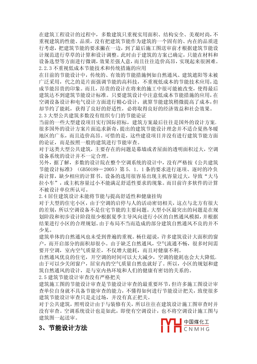 建筑的節(jié)能設計王建天津華廈建筑設計有限公司天津300384摘要:建筑節(jié)能是實施能源、環(huán)境、社會可持續(xù)發(fā)展戰(zhàn)略的重要組成部分,也是國際社會建筑走可持續(xù)發(fā)展之路的基本取向。我國已頒布的建筑節(jié)能標準及某些地區(qū)的施工圖節(jié)能審査要點,針對我國不同地域的氣候環(huán)境和建筑特點,重點介紹了建筑能耗的構成和節(jié)能的基本途徑,提供了相關的節(jié)能設計依據(jù)、技術和方法關鍵詞:建筑設計節(jié)能方法Abstract: the energy conservation of the building is implementing energy environment, andsocial sustainable development strategy important constituent, is also the internationacommunity building the way of sustainable development of the basic orientation. China haspromulgated building energy efficiency standards and some areas of construction energyconservation review points in view of the different regional climate environment andconstruction characteristics, this paper introduces the structure of the building energyconsumption and energy saving of the basic way, providing relevant energy saving design basis,techniques and methodsKeywords: architectural design energy saving method中圖分類號:TE8文獻標識碼:A文章編號引言建筑作為人工自然產(chǎn)品,是人類自身應變自然環(huán)境氣候的一種延伸手段。建筑發(fā)揮著氣候“過濾器”的角色,通過利用和防御自然界各種氣候因素,為人類創(chuàng)造出良好的室內(nèi)氣候條件。我國古代的傳統(tǒng)民居,如北京的四合院、西南的吊腳樓、陜北的窯洞、閩南的土樓等,雖然建筑形式和材料各不相同,但都是長期氣候選擇和建筑不斷應變的結果。隨著現(xiàn)代技術水平的提高,人類有時過分地依賴人工設備技術力量,以期實現(xiàn)更高的室內(nèi)熱舒適度要求,結果導致高能耗和自然生態(tài)的破壞。我國是能源短缺的國家,但建筑能耗卻是同等氣候條件下發(fā)達國家的2?3倍。高能耗不利于建筑可持續(xù)性發(fā)展,需要我們重新硏究節(jié)能設計策略,充分挖掘建筑節(jié)能的潛能、節(jié)能設計包含的幾個方面節(jié)能型住宅是指在保證住宅功能和舒適度的前提下,按既定目標減少能源消耗,并且盡可能對資源循環(huán)利用,實現(xiàn)資源節(jié)約的住宅,節(jié)能住宅包含以下幾個方面建筑與環(huán)境是一個相互依賴共存的關系,一個合理的選址和適宜的外部環(huán)境對建筑的節(jié)能具有事半功倍的效果,應根據(jù)地方氣候特點,地制官,建群的規(guī)劃布置和建筑物的平面布置有利于自然通風,增加中國煤化央建CNMHG筑的通風、防熱等問題。建筑物單體設計應控制體形系數(shù),研究資料表明,體形系數(shù)每增加0.01,耗熱量指標約增加2.5%,一般控制在0.30以下,控制體形系數(shù)的方法有:減少建筑面寬,加大建筑進深;增加建筑物的層數(shù);加大建筑物的長度或增加組合;建筑體型不易變化過多1.2綠化的利用。在屋頂種植植物,利用植物的光和作用,可以大大降低屋頂?shù)氖彝饩C合溫度,資料顯示,種植屋面的內(nèi)表面溫度比其他普通屋面低2.8℃7.7℃,但在屋面種植植物也應考慮技術問題,包括荷載、排水、防水等,現(xiàn)在都已有成熟的技術和經(jīng)驗,屋頂綠化分為覆土栽培和無土栽培兩種,覆土栽培覆土層0.5m厚為宜,相應增加3KN/m2-15KN/m2:無土栽培技術,日本某公司已開發(fā)岀表面生長植物的混凝土,特別適用于建筑墻壁和屋頂綠化。1.3太陽能的利用。太陽能既環(huán)保又方便安全,太陽能的利用有兩種方式:被動式太陽能建筑和主動式太陽能建筑,被動式太陽能建筑指在向陽面采用陽光的儲備熱質(zhì)來吸收儲備熱量來進行的一種方式,此系統(tǒng)中需要研究光電系統(tǒng),造價過高,不適于大批使用1.4合適的建筑材料能夠提高建筑維護結構的保溫隔熱性能。我國在“九五”計劃和2010年發(fā)展規(guī)劃中對建筑節(jié)能提出了新要求,要求實施建筑節(jié)能65%的目標,因此良好的建筑材料是十分必要的。維護結構的材料布置分外側(cè)和內(nèi)側(cè),在寒冷地區(qū)的同一氣候條件下,由于材料層次布置不同所取得的保溫效果也不盡相同,為防止墻體內(nèi)產(chǎn)生冷凝水,保溫層設在外側(cè)更好些,外墻外保溫的優(yōu)勢包括:提高主體結構的使用壽命,減少長期的維修費用;降低建筑造價,增加房屋使用面積;基本消除“熱橋”的影響,外保溫即可防止“熱橋”部位產(chǎn)生結露,又可消除“熱橋”造成的熱損失,改善墻體熱工性能;便于對建筑進行裝修改造。建筑外維護結構主要包括屋頂2、節(jié)能設計當中存在的問題2.1節(jié)能設計基準概念模糊作為節(jié)能設計標準的節(jié)能50%目標,不是對于具體的建筑的一個精確節(jié)能效果參數(shù),而是對當前建筑平均水平的一個總體節(jié)能效果。所以在具體的建筑上提節(jié)能50%或者節(jié)能65%的提法是不科學的,而且南方也不應在個別建筑上片面地追求節(jié)能的高指標。由于當前的節(jié)能設計標準是按照節(jié)能50%的目標設定的所以達到標準即是達到節(jié)能50%的社會平均水平,所以如果所有建筑都這么做,社會上的建筑總體上也就達到了50%的節(jié)能目標。2.2規(guī)劃和建筑方案的節(jié)能設計未受到足夠的重視近年來,國家推動建筑節(jié)能工作的力度較大,規(guī)劃設計人員對建筑節(jié)能知識的接受
