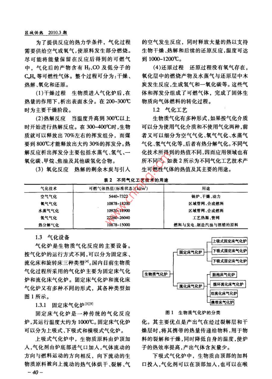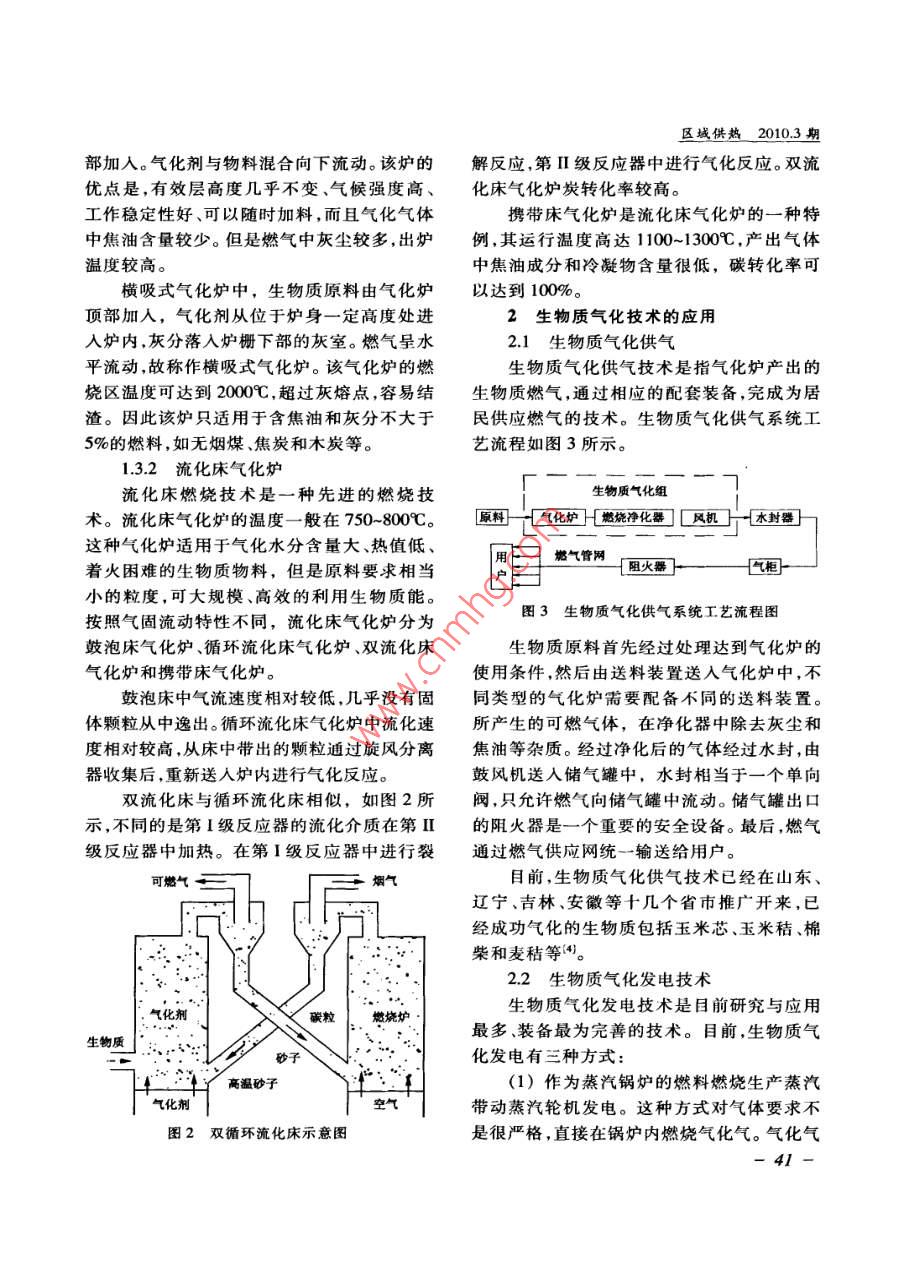 區(qū)域供熱2010.3期生物質(zhì)氣化技術(shù)原理及應(yīng)用分析福建省電力勘測設(shè)計院鄭昀濟南鍋爐集團有限公司邵巖李斌【摘要】生物質(zhì)能是一種理想的可再生能源。由于分布廣泛、有利于環(huán)保等特點,因而越來越受到世界各國的關(guān)注。生物質(zhì)氣化技術(shù)是利用生物質(zhì)能的一種方式。本文介紹了生物質(zhì)氣化技術(shù)的原理,生物質(zhì)氣化工藝及氣化設(shè)備目前應(yīng)用較多的氣化技術(shù)是生物質(zhì)氣化供氣和生物質(zhì)氣化發(fā)電技術(shù)文中提出了應(yīng)用過程中存在的問題,提高效率、降低焦油含量等是今后利用生物質(zhì)氣化技術(shù)的發(fā)展方向。【關(guān)鍵詞】生物質(zhì)氣化原理氣化技術(shù)應(yīng)用前言1生物質(zhì)氣化技術(shù)生物質(zhì)能是指由光合作用而產(chǎn)生的各種1.1生物質(zhì)氣化技術(shù)的原理有機體,光合作用利用空氣中的二氧化碳和生物質(zhì)氣化是利用空氣中的氧氣或含氧土壤中的水,將吸收的太陽能轉(zhuǎn)換為碳水化物作氣化劑在高溫條件下將生物質(zhì)燃料中的合物和氧氣。生物質(zhì)通常包括農(nóng)業(yè)廢棄物、可燃部分轉(zhuǎn)化為可燃?xì)?主要是氫氣、一氧化材及森林工業(yè)廢棄物、禽畜糞便、城鎮(zhèn)生活垃碳和甲烷)的熱化學(xué)反應(yīng)。20世紀(jì)70年代,圾以及能源作物等幾種類型。生物質(zhì)能具有 Ghaly首次提出了將氣化技術(shù)應(yīng)用于生物質(zhì)以下特點:(1)屬于可再生能源,可保證能源這種含能密度低的燃料。生物質(zhì)的揮發(fā)分含量的永續(xù)利用;(2)種類多而分布廣,便于就地一般在76%86%生物質(zhì)受熱后在相對較低利用,利用形式多樣;(3)相關(guān)技術(shù)已經(jīng)成熟的溫度下就能使大量的揮發(fā)分物質(zhì)析出。幾種可貯存性好;(4)節(jié)能、環(huán)保效果好。常見生物質(zhì)燃料的工業(yè)分析成分如表1所示:表1幾種生物質(zhì)的工業(yè)分析成分工業(yè)分析成分種類水分(%)揮發(fā)分(%)固定碳(%)灰分(%)低位熱值(MJ/kg)雜草54368.7716.49.4616.192豆秸5.106574.617.123.1316.146稻草4.9765.1116.0613.8613.970麥4.3967.3619.358.9015.363玉米秸4.8771.4517.755.9315.450玉米芯15.076.607.001.4014.395棉秸6.7868.5420.713.9715.99139區(qū)域供熱2010.3期為了提供反應(yīng)的熱力學(xué)條件,氣化過程的空氣發(fā)生反應(yīng),同時釋放大量的熱以支持需要供給空氣或氧氣,使原料發(fā)生部分燃燒。生物干燥、熱解和后續(xù)的還原反應(yīng),溫度可達(dá)盡可能將能量保留在反應(yīng)后得到的可燃?xì)獾?000~1200℃中,氣化后的產(chǎn)物含有H2、CO及低分子的(4)還原過程還原過程沒有氧氣存在,CHn等可燃性氣體。整個過程可分為:干燥、氧化層中的燃燒產(chǎn)物及水蒸氣與還原層中木熱解、氧化和還原。炭發(fā)生反應(yīng),生成氫氣和一氧化碳等。這些氣(1)干燥過程生物質(zhì)進入氣化爐后,在體和揮發(fā)分組成了可燃?xì)怏w,完成了固體生熱量的作用下,析出表面水分。在200~300℃物質(zhì)向氣體燃料的轉(zhuǎn)化過程。時為主要干燥階段。1.2氣化工藝(2)熱解反應(yīng)當(dāng)溫度升高到300℃以上生物質(zhì)氣化有多種形式,如果按氣化介質(zhì)時開始進行熱解反應(yīng)。在300~400℃時,生物可以分為使用氣化介質(zhì)和不使用氣化兩種,前質(zhì)就可以釋放出70%左右的揮發(fā)組分,而煤者又可以細(xì)分為空氣氣化、氧氣氣化、水蒸氣要到800℃才能釋放出大約30%的揮發(fā)分熱氣化、氫氣氣化等,后者有熱分解氣化。不同氣解反應(yīng)析出揮發(fā)分主要包括水蒸氣、氫氣、化技術(shù)所得到的熱值不同,因而應(yīng)用領(lǐng)域也有氧化碳、甲烷、焦油及其他碳?xì)浠衔?。所不?。如表2所示為不同氣化工藝技術(shù)產(chǎn)(3)氧化反應(yīng)熱解的剩余木炭與引入生可燃性氣體的熱值及其主要的用途。表2不同氣化工藝技術(shù)的用途氣化技術(shù)可燃?xì)怏w熱值(標(biāo)準(zhǔn)狀態(tài))(kJ/m3)用途空氣氣化5440~7322鍋爐、干燥、動力氧氣氣化10878~18200區(qū)域管網(wǎng)、合成燃料水蒸氣氣化10920~18900區(qū)域管網(wǎng)、合成燃料氫氣氣化22260-26040工藝熱源、管網(wǎng)熱分解氣化10878-15000燃料與發(fā)電、制造汽油與酒精的原料1.3氣化設(shè)備上吸式固定床氣化爐氣化爐是生物質(zhì)氣化反應(yīng)的主要設(shè)備。按氣化爐的運行方式不同,可以分為固定床、固定床氣化爐下吸式固定床氣化爐流化床和旋轉(zhuǎn)床三種類型4。國內(nèi)目前生物質(zhì)下吸式固定床氣化爐氣化過程所采用的氣化爐主要為固定床氣化生物質(zhì)氣化爐鼓泡床氣化爐爐和流化床氣化爐。固定床氣化爐和流化床氣化爐又有多種不同的形式,其各種類型如流化床氣化爐循環(huán)流化床氣化爐圖1所示。雙流化床氣化爐1.3.1固定床氣化爐35攜帶床氣化爐固定床氣化爐是一種傳統(tǒng)的氣化反應(yīng)圖1生物質(zhì)氣化爐的分類爐,其運行溫度大約為1000℃。固定床氣化爐化。其主要優(yōu)點是產(chǎn)出氣在經(jīng)過裂解層和干可以分為上吸式、下吸式和橫吸式氣化爐。燥層時,將其攜帶的熱量傳遞給物料,用于物上吸式氣化爐中,生物質(zhì)原料由爐頂加料的裂解和干燥,同時降低自身的溫度,使?fàn)t入,氣化劑由爐底部進氣口加入,氣體流動的子的熱效
