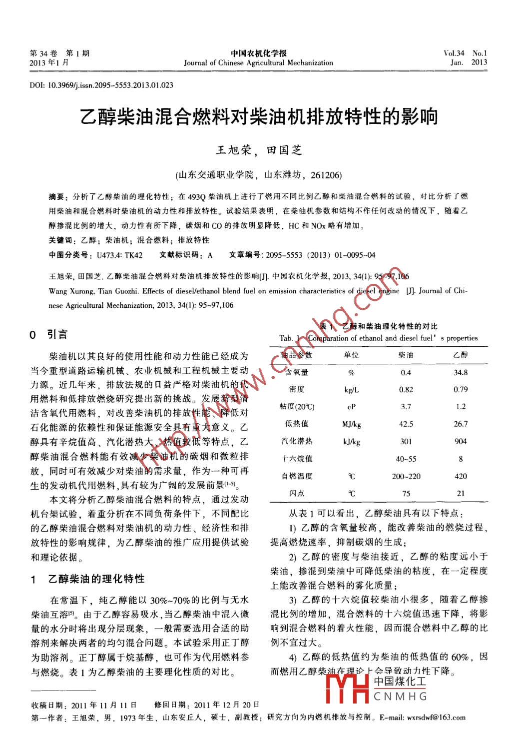 第34卷第1期中國農(nóng)機化學報Vol 34 No2013年1月Journal of Chinese Agricultural MechanizationJan.2013Dol:10.3969/sn.,2095-5553.2013.01.023乙醇柴油混合燃料對柴油機排放特性的影響王旭榮,田國芝(山東交通職業(yè)學院,山東濰坊,261206摘要:分析了乙醇柴油的理化特性;在493Q柴油機上進行了燃用不同比例乙醇和柴油混合燃料的試驗,對比分析了燃用柴油和混合燃料時柴油機的動力性和排放特性。試驗結果表明,在柴油機參數(shù)和結構不作任何改動的情況下,隨著乙醇摻混比例的增大,動力性有所下降,碳煙和CO的排放明顯降低,HC和NOx略有增加。關鍵詞:乙醇;柴油機;混合燃料;排放特性中圖分類號:U4734:TK42文獻標識碼:A文章編號:2095-5553(2013)01-0095-04王旭榮,田國芝.乙醇柴油混合燃料對柴油機排放特性的影響[中國農(nóng)機化學報,2013.34(1):95-97,106Wang Xurong. Tian Guozhi. Effects of diesel/ethanol blend fuel on emission characteristics of diesel engine [J]. Jourmal of Chinese Agricultural Mechanization, 2013, 34(1):95-97, 106表1乙醇和柴油理化特性的對比0引言Tab. 1 Comparation of ethanol and diesel fuel's properties柴油機以其良好的使用性能和動力性能已經(jīng)成為油品參數(shù)單位柴油當今重型道路運輸機械、農(nóng)業(yè)機械和工程機械主要動含氧量%力源。近幾年來,排放法規(guī)的日益嚴格對柴油機的代密度0.82用燃料和低排放燃燒研究提出新的挑戰(zhàn)。發(fā)屐新型清潔含氧代用燃料,對改善柴油機的排放性能、降低對粘度(20℃)石化能源的依賴性和保證能源安全具有重大意義。乙低熱值MJ/k醇具有辛烷值高、汽化潛熱大、熱值較低等特點,乙汽化潛熱30l醇柴油混合燃料能有效減少柴油機的碳煙和微粒排十六烷值40~55放,同時可有效減少對柴油的需求量,作為一種可再自燃溫度200~220生的發(fā)動機代用燃料,具有較為廣闊的發(fā)展前景1-。本文將分析乙醇柴油混合燃料的特點,通過發(fā)動閃點℃機臺架試驗,著重分析在不同負荷條件下,不同配比從表1可以看出,乙醇柴油具有以下特點的乙醇柴油混合燃料對柴油機的動力性、經(jīng)濟性和排l)乙醇的含氧量較高,能改善柴油的燃燒過程放特性的影響規(guī)律,為乙醇柴油的推廣應用提供試驗提高燃燒速率,抑制碳煙的生成;和理論依據(jù)。2)乙醇的密度與柴油接近,乙醇的粘度遠小于1乙醇柴油的理化特性柴油,摻混到柴油中可降低柴油的粘度,在一定程度上能改善混合燃料的霧化質量;在常溫下,純乙醇能以30%~70%的比例與無水3)乙醇的十六烷值較柴油小很多,隨著乙醇摻柴油互溶。由于乙醇容易吸水,當乙醇柴油中混入微混比例的增加,混合燃料的十六烷值迅速下降,將影量的水分時將出現(xiàn)分層現(xiàn)象,一般需要選用合適的助響到混合燃料的著火性能,因而混合燃料中乙醇的比溶劑來解決兩者的均勻混合問題。本試驗采用正丁醇例不宜過大。為助溶劑。正丁醇屬于烷基醇,也可作為代用燃料參4)乙醇的低熱值約為柴油的低熱值的60%,因與燃燒。表1為乙醇柴油的主要理化性質的對比。而燃用乙醇柴油在理診上會導致動力性下降。中國煤化工CNMHG收稿日期:2011年11月11日修回日期:2011年12月20日第一作者:王旭榮,男,1973年生,山東安丘人,碩士,副教授;研究方向為內燃機排放與控制。E-mail: wrsd@163com中國農(nóng)機化學報2013年2試驗設備和方案可以看出,與原機相比較,燃用乙醇柴油混合燃料時,柴油機的功率有所下降,在標定轉速時下降的試驗燃料為市售0#柴油(記為E0)與無水乙醇。幅度最大。隨著乙醇摻混比例的增大,燃用E15將乙醇按10%、15%和20%的體積比與柴油混合(分E20時,柴油機的功率較燃用E10時下降的趨勢有所別記為E10、E15和E20),加入總體積2%的助溶劑減小。這是因為:一方面乙醇的熱值僅為柴油的一半正丁,然后經(jīng)高速剪切攪拌等工藝,得到乙醇柴油混左右,導致隨著乙醇摻混比例的增大,功率的下降愈合燃料。加明顯;另一方面,乙醇的十六烷值很低,因而混合試驗發(fā)動機主要技術參數(shù)如表2所示。尾氣排放燃料的滯燃期隨乙醇添加比例的增大而延長,同時,測試裝置為 A VL Digas44000型五氣分析儀和 AVL Di乙醇的沸點低、含氧量大,有利于混合燃料的擴散和omke4000型不透光煙度計燃燒,因而隨著乙醇比例的增大,燃燒改善程度增按照內燃機臺架性能試驗方法,在標定轉速下進大,因而功率下降的趨勢有所下降。行不同配比乙醇柴油混合燃料的發(fā)動機負荷特性對比32對柴油機排放特性的影響試驗,測量排氣煙度、NOx、CO、HC濃度。1)標定轉速下燃用不同比例的乙醇柴油混合燃表2試驗用發(fā)動機的主要技術參數(shù)料時碳煙隨功率的變化曲線見圖2。Tab. 2 Main parameters of diesel engine項目單位參數(shù)EOE10型式直列、立式、強制水冷、四沖程E15燃燒室型式直噴ω型×…E201.2缸數(shù)缸徑0.6沖程mm壓縮比18.2:13040P(kW)排量2.771工作順序1-3-4-2圖2標定轉速下碳煙排放的負荷特性曲線Fig. 2 Soot emission of different fuels at rated engine speed標定功率轉速 kW/r/min57/3600由圖2可知,中低負荷時,碳煙排放均較低,這最大扭矩/轉速N.m/r/min172≤2200主要是由于中低負荷下柴油機缸內的過量空氣系數(shù)較大。但當負荷進一步增大后,空燃比下降,碳煙排放3試驗結果與分析急劇升高。燃用乙醇柴油混合燃料后,由于乙醇的含31對柴油機動力性的影響氧量較大,具有自供氧能力,且乙醇容易蒸發(fā)霧化圖1為