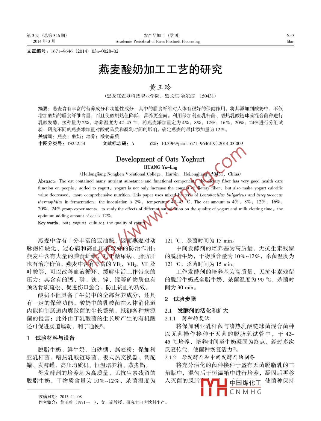 第3期(總第346期)農(nóng)產(chǎn)品加工(學(xué)刊)No. 3Academic periodical of Farm Products Processin文章編號(hào):1671-9646(2014)03a-0028-02燕麥酸奶加工工藝的研究黃玉玲(黑龍江農(nóng)墾科技職業(yè)學(xué)院,黑龍江哈爾濱150431)摘要:燕麥含有豐富的營(yíng)養(yǎng)成分和功能性成分,其中的膳食纖維對(duì)人體有很好的保健作用,將其添加到酸奶中,不僅增加酸奶的膳食纖維含量,而且使酸奶熱值降低,營(yíng)養(yǎng)更全面。利用保加利亞乳杄菌、嗜熱乳酸鏈球菌混合菌種進(jìn)行乳酸發(fā)酵,接種量為2%,培養(yǎng)溫度為42~45℃,將燕麥添加量定為4%,8%,12%,16%驗(yàn),研究不同的燕麥添加量對(duì)酸奶品質(zhì)和凝乳時(shí)間的影響,確定燕麥的最佳添加量為%、20%,24%進(jìn)行分組試關(guān)鍵詞:燕麥;酸奶;培養(yǎng);酸奶品質(zhì)中圖分類號(hào):TS25254文獻(xiàn)標(biāo)志碼:Adoi:10.3969/jisn.1671-9646(X)2014.03009Development of Oats YoghurtHUANG Yu-ling(Heilongjiang Nongken Vocational College, Harbin, Heilongjiang 150431, China)Abstract: The oat contained many nutrient substance and functional component, the dietary fiber has very good health carefunction on people, added to yogurt, yogurt is not only increase the content of dietary fiber, but also make yogurt calorificalue decreased, more comprehensive nutrition. This paper uses mixed bacteria of Lactobacillus bulgaricus and Streptocofermentation, the inoculation is 2%, temperature 42-45 C. The oat amount to 4%, 8%, 12%, 16%020%0, 24% group experiments, to study the effects of different oat addition on the quality of yogurt and milk clotting time, theKey words: oat; yogurt; culture; the quality of yogurt燕麥中含有十分豐富的亞油酸,因而燕麥對(duì)動(dòng)121℃,殺菌時(shí)間為15min。脈粥樣硬化、冠心病和高血壓有較好的防治作用中間發(fā)酵劑的培養(yǎng)基為高質(zhì)量、無抗生素殘留燕麥中含有大量的膳食纖維,對(duì)于糖尿病、脂肪肝的脫脂牛奶,干物質(zhì)含量為10%~12%,殺菌溫度為也有治療價(jià)值。燕麥中含有豐富的ⅤB1,VB2,VE及121℃,殺菌時(shí)間為15min葉酸等,可以改善血液循環(huán)、緩解生活工作帶來的工作發(fā)酵劑的培養(yǎng)基為高質(zhì)量、無抗生素殘留壓力;其含有的鈣、磷、鐵、鋅、錳等礦物質(zhì)也有的脫脂牛奶或全脂牛奶,殺菌溫度為90℃,殺菌時(shí)預(yù)防骨質(zhì)疏松、促進(jìn)傷口愈合、防止貧血的功效間為30min酸奶不但具備了牛奶中的全部營(yíng)養(yǎng)成分,還具有一定的保健功能。酸奶中的乳酸菌在人體消化道2試驗(yàn)步驟內(nèi)能抑制腸道內(nèi)腐敗菌的生長(zhǎng)繁殖,抵御各種病源2.1發(fā)酵劑的活化和擴(kuò)大菌的侵害;此外由于乳酸菌的生長(zhǎng)所產(chǎn)生的有機(jī)酸2.1.1菌種的復(fù)活還可促進(jìn)腸道蠕動(dòng),利于通便叫。將保加利亞乳桿菌與嗜熱乳酸鏈球菌混合菌種1試驗(yàn)材料與設(shè)備以無菌操作接種于滅菌的脫脂乳試管中,于42-45℃培養(yǎng),培養(yǎng)時(shí)間至牛奶凝固為終點(diǎn),經(jīng)過多次脫脂牛奶、鮮牛奶、白砂糖、燕麥粉;保加利反復(fù)傳代,使菌種恢復(fù)活力。亞乳桿菌、嗜熱乳酸鏈球菌、板式熱交換器、調(diào)配2.1.2母發(fā)酵劑和中間發(fā)酵劑的制備罐、發(fā)酵罐、髙壓均質(zhì)機(jī)、恒溫培養(yǎng)箱、蒸煮鍋將充分活化的菌種接種于盛有滅菌脫脂乳的母發(fā)酵劑的培養(yǎng)基為高質(zhì)量、無抗生素殘留的角瓶中,混勻后于恒溫箱中進(jìn)行培養(yǎng),凝固后再移脫脂牛奶,干物質(zhì)含量為H中國(guó)煤化工使菌種保持CNMHG收稿日期:2013-11-0作者簡(jiǎn)介:黃玉玲(1971—),女,副教授,研究方向?yàn)轱嬃仙a(chǎn)2014年第3期黃玉玲:燕麥酸奶加工工藝的研究定活力,然后再制備生產(chǎn)發(fā)酵劑閂。3結(jié)果與分析復(fù)原脫脂乳(總固形物10%-12%)一115℃,滅菌15min冷卻至42℃→接種(接種量2%)→培養(yǎng)至凝乳(42℃)→3.1燕麥添加量對(duì)酸奶品質(zhì)的影響冷卻至4℃→冰箱保存。燕麥添加量對(duì)酸奶品質(zhì)的影響見圖1。21.3工作發(fā)酵劑的制備將工作發(fā)酵劑培養(yǎng)基(脫脂乳、新鮮全脂乳或4.0復(fù)原乳)進(jìn)行標(biāo)準(zhǔn)化,總固形物含量10%~12%,經(jīng)90℃滅菌30-60min,冷卻至43℃或菌種所要求的溫度。將母發(fā)酵劑用滅菌的玻璃棒攪拌均勻后按1%~2%的接種量接種到工作發(fā)酵劑培養(yǎng)基中,混合均勻,于42℃恒溫箱培養(yǎng),凝固后取出,置冰箱中冷藏備用22燕麥粉的預(yù)處理221燕麥粉去雜燕麥添加量/%燕麥?zhǔn)紫冗^篩,去除麥殼等大的雜質(zhì)色澤;■一滋味;口-組織狀態(tài)2.2.2蒸煮圖1燕麥添加量對(duì)酸奶品質(zhì)的影響將燕麥粉與水分別倒入蒸煮鍋內(nèi),燕麥與水的通過對(duì)不同燕麥添加量的酸奶進(jìn)行品質(zhì)評(píng)定比例為1:10,攪拌均勻,加熱到100℃,維持隨著燕麥添加量的不斷增大,酸奶的色澤逐漸變黃10min,冷卻到室溫變深,色澤不均勻,但4%,8%,12%添加量的燕23燕麥片酸奶的工藝流程麥對(duì)酸奶的色澤影響不大;當(dāng)在牛奶中添加12%蒸煮后的燕麥16%的燕麥,酸奶的滋味最好,不僅有酸奶特有的牛奶一混合加熱滅菌→冷卻均質(zhì)→冷卻到42℃接乳香,而且麥香味濃郁;4%,8%,12%添加量的種→培養(yǎng)→冷藏→成品。工作發(fā)酵劑24燕麥添加量對(duì)酸奶品質(zhì)的影響燕麥對(duì)酸奶的組織狀態(tài)無顯著影響,但當(dāng)燕麥添加