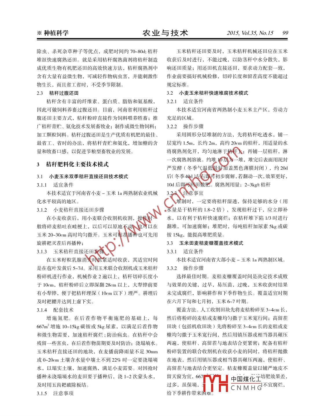 98 2015, Vol.35, No.15農(nóng)業(yè)與技術(shù)※種植科學(xué)河南省秸稈肥料化利用技術(shù)模式研究慕蘭,葛樹春(河南省土壤肥料站,河南鄭州450002)摘要:通過對全省調(diào)查研究,闡述了河南省秸稈資源、利用狀況,探索了秸稈肥料化利用的主要模式:河南省小麥玉米雙季秸稈直接還田、小麥玉米秸稈快速堆腐、玉米田麥秸麥糠覆蓋、玉米秸稈粉碎還田腐熟、水稻秸稈還田腐熟5種秸稈還田技術(shù)模式。關(guān)鍵詞:秸稈;肥料化利用;技術(shù)模式中圖分類號: S37文獻標(biāo)識碼: ADOI:10.11974/ nyyjs.20150832041秸稈是農(nóng)業(yè)生產(chǎn)過程中的副產(chǎn)品,也是--項重要的志》,風(fēng)干秸稈含水量通常按15%計四),約折合115生物質(zhì)資源"。秸稈中蘊藏著巨大的氮、磷、鉀、碳等萬t尿素,60萬t磷肥(過磷酸鈣,含P20s,12%),養(yǎng)分資源123),而秸稈還田是秸稈資源肥料化利用的主要120萬t鉀肥(氯化鉀,含K20, 60%) ,是十分寶貴的方式用,它不僅可培肥地力,提高作物產(chǎn)量,節(jié)本增效,資源。據(jù)統(tǒng)計,2012年秸稈直接還田占56.8%、用作飼同時還能減輕由于秸稈焚燒造成的土壤和環(huán)境污染,提料或過腹還田20.0%、用作燃料10.1%、原料用量占7.1%、高農(nóng)產(chǎn)品品質(zhì),保障糧食安全生產(chǎn)。對促進河南省糧食焚燒還田2.1%、棄置亂堆約占3.9%。河南省秸稈資源核心區(qū)建設(shè)和農(nóng)業(yè)環(huán)境友好型發(fā)展,加快推進中原經(jīng)濟量豐富,開發(fā)價值高,利用空間亦很大。區(qū)建設(shè)有重要意義。2秸稈肥料化主要方式1秸稈資 源現(xiàn)狀和利用情況秸稈肥料化利用主要以秸稈直接還田為主,包括機河南省耕地面積819.2萬hm2 (河南省第二次土地調(diào)械化直接還田、覆蓋還田、快速腐熟還田、堆漚還田、查公報) ,是我國的重要糧倉,糧食總產(chǎn)連續(xù)9a超千億商 品化有機肥等。秸稈直接還田是秸稈肥料化利用最主斤。據(jù)調(diào)查,2012 年主要農(nóng)作物秸稈總量7000多萬t,要的途徑,也是農(nóng)作物秸稈最經(jīng)濟可行、最易于推廣操約占全國秸稈產(chǎn)量的10%,居全國第1位。作的綜合利用方式,有利于農(nóng)業(yè)可持續(xù)發(fā)展。目前河南河南常年種植作物主要有小麥、玉米、水稻、紅薯、省秸稈還田主要方式包括:秸稈直接還田、秸稈堆漚還花生、棉花、豆類和油菜等,其中,2012年小麥播種面田、秸稈過腹還田等。積534萬khm2,總產(chǎn)3177.35萬9,秸稈資源3495萬t(根2.1 秸稈直 接還田據(jù)1992年《(中國)農(nóng)業(yè)統(tǒng)計年鑒》提供的谷草比結(jié)合河南省秸稈還田直接模式主要包括機械還田,留.河南實際測算) ;玉米310萬khm',總產(chǎn)1747.75 萬t,高茬,秸稈覆蓋3種方式”。目前,河南省重點推廣的秸稈資源2272萬t;水稻64.816萬khm2,總產(chǎn)492.55萬t,是秸稈機械還田。根據(jù)統(tǒng)計年鑒2012年數(shù)據(jù)圖,河南秸稈443萬t;紅薯311.92khm',總產(chǎn)122.61萬t,秸稈省小麥機收率達97.6%,機收面積521.2萬khm?,玉米61萬t;花生100.711萬khm',總產(chǎn)454.03萬t,秸稈平均機收率提升10%,達60%左右,機收面積186萬363萬t;棉花256.67khm',總產(chǎn)25.69萬t,秸稈230萬t;khm',全省機械化秸稈還田面積達651.6萬khm2 ( 2013豆類52.045萬khm2,總產(chǎn)84.56萬t,秸稈135萬t;油年5月9日,河南日報農(nóng)村版)菜38.042萬khm',總產(chǎn)87.61 萬t,秸稈131萬t。秸稈2.2秸稈堆漚還田在全省農(nóng)村生活用能構(gòu)成中占有重要地位。全省的秸稈傳統(tǒng)堆漚。主要以夏季高溫堆肥為主,就是在好氣資源按能源折算,相當(dāng)于約3900萬t標(biāo)準(zhǔn)煤",按肥料條件下,接種高溫纖維分解細菌(如人糞尿、騾馬糞、養(yǎng)分折算(秸稈養(yǎng)分含量參數(shù)參考《中國有機肥料養(yǎng)分雞糞等) ,設(shè)通氣中國煤化工、滅病、基金項目:“十二五”國家糧食豐產(chǎn)科技工程項目(項目編號: 201 2BAD04B07)fTHCNMHG .※種植科學(xué)農(nóng)業(yè)與技術(shù)2015, Vol.35, No.15 99除蟲、殺死雜草種子等優(yōu)點,成肥時間約70~-80d;秸稈玉米秸稈還田要及時,玉米秸稈機械還田應(yīng)在玉米堆漚快速腐熟還田。就是采用秸稈腐熟菌劑將秸稈制造收獲后及時進行,不能過晚,以防莖稈中水分散失,影成優(yōu)質(zhì)生物有機肥還田的高效快速方法,秸稈腐熟劑中響還田質(zhì)量;用還田機直接還田,要求動力配套-致,含有大量有益微生物,可減輕作物病蟲害,并能刺激作作業(yè)前要搞好機械檢修,切碎長度和留茬高度不能超過物生長,而且省工省時,不受季節(jié)限制。規(guī)定標(biāo)準(zhǔn)。2.3 秸稈過腹還田3.2 小麥玉米秸稈快速堆腐技術(shù)模式秸稈含有豐富的纖維素、蛋白質(zhì)、脂肪和氨基酸,3.2.1適宜 條件因此可做飼料養(yǎng)畜過腹還田。目前,河南省利用秸稈過本技術(shù)適宜河南省兩熟制小麥玉米主產(chǎn)區(qū),勞動力腹還田主要方式,秸稈粉碎直接作為飼料喂養(yǎng)牲畜;推充足的區(qū)域。廣秸稈青貯、氨化技術(shù)發(fā)展畜牧業(yè);制作成微生物飼料;3.2.2 操作步驟加工顆粒飼料。秸稈過腹還田是生產(chǎn)優(yōu)質(zhì)有機肥的最佳、采用圓形分層堆制的方法,先將秸稈吃透水,鋪-最省工、省時的辦法,將秸稈青貯和氨化,增加糖的含層寬約1.5m, 長約2m,高約20cm的秸稈,用適量的水量和牧畜口感,以促進節(jié)糧型畜牧業(yè)的發(fā)展。將腐熟劑化開,