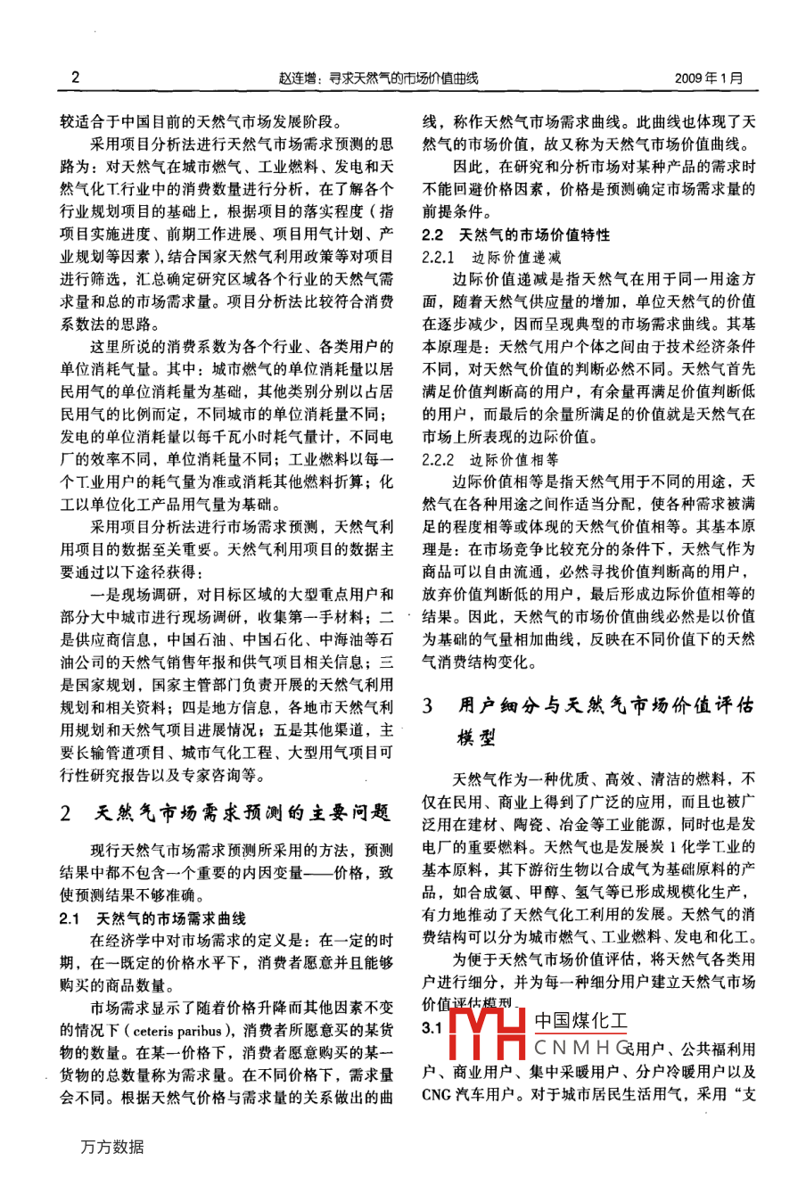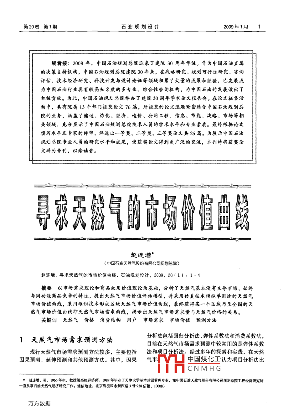 第20卷第1期石油規(guī)劃設(shè)計(jì)200年1月1編者按:2008年,中國(guó)石油規(guī)劃總院迎來(lái)了建院30周年華誕。作為中國(guó)石油直屬的決策攴持機(jī)構(gòu),中國(guó)石油規(guī)劃總院建院30年來(lái),在戰(zhàn)略研究、規(guī)劃可行性研究、咨詢(xún)?cè)u(píng)估、技術(shù)經(jīng)濟(jì)研究、科技開(kāi)發(fā)與設(shè)計(jì)論證等領(lǐng)域積累了大量的成果和經(jīng)驗(yàn),已發(fā)展成為中國(guó)石油行業(yè)具有較高知名度的多專(zhuān)業(yè)、綜合性咨詢(xún)機(jī)構(gòu),為中國(guó)石油的發(fā)展做出了積極貢獻(xiàn)。為此,中國(guó)石油規(guī)劃總院舉辦了建院30周年學(xué)術(shù)論文報(bào)告會(huì)。在論文征集活動(dòng)中,共有院屬13個(gè)部門(mén)提交論文76篇,所提交的論文選題緊密結(jié)合中國(guó)石油規(guī)劃總院的業(yè)務(wù),涵蓋了儲(chǔ)運(yùn)、煉化、經(jīng)濟(jì)、造價(jià)、公用工程、信息、節(jié)能、戰(zhàn)略、市場(chǎng)等相關(guān)領(lǐng)域,充分顯示了中國(guó)石油規(guī)劃總院技術(shù)人員的學(xué)術(shù)水平和專(zhuān)業(yè)素質(zhì)。最終根據(jù)論文撰寫(xiě)水平及專(zhuān)家的評(píng)審,評(píng)選出一等獎(jiǎng)、二等獎(jiǎng)、三等獎(jiǎng)?wù)撐墓?5篇。為展示中國(guó)石油規(guī)劃總院專(zhuān)業(yè)人員的研究水平和成果,使獲獎(jiǎng)?wù)撐牡玫礁鼜V泛的交流,本刊特將獲獎(jiǎng)?wù)撐谋贋閷?zhuān)刊,以饗讀者。號(hào)經(jīng)自竊領(lǐng)舒自曲最趙連增(中國(guó)石油天然氣股份有限公司規(guī)劃總院)趙連增.尋求天然氣的市場(chǎng)價(jià)值曲線.石油規(guī)劃設(shè)計(jì),209,20(1):1~4摘要以市場(chǎng)需求理論和商品效用價(jià)值理論為基礎(chǔ),分析了天然氣基本沒(méi)有主導(dǎo)市場(chǎng)、始終與同功能商品競(jìng)爭(zhēng)的特性,提出天然氣市場(chǎng)價(jià)值評(píng)估模型,并采用仿真技術(shù)模擬單用途的天然氣市場(chǎng)價(jià)值曲線,采用堆積技術(shù)形成區(qū)域夭然氣市場(chǎng)價(jià)值曲線,最終獲得某一個(gè)區(qū)域乃至全國(guó)的天然氣市場(chǎng)價(jià)值曲線即天然氣市場(chǎng)需求曲線,揭示出天然氣市場(chǎng)需求量與天然氣價(jià)格的關(guān)系。關(guān)鍵詞天然氣價(jià)格消費(fèi)結(jié)構(gòu)用戶(hù)市場(chǎng)需求市場(chǎng)價(jià)值預(yù)測(cè)方法1天然氣市煬需求預(yù)測(cè)方法分析法包括回歸分析法、彈性系數(shù)法和消費(fèi)系數(shù)法,目前在天然氣市場(chǎng)需求預(yù)測(cè)中較常用的是彈性系數(shù)現(xiàn)行天然氣市場(chǎng)需求預(yù)測(cè)方法較多,主要包括法和項(xiàng)目分析法。經(jīng)過(guò)多年的探索和實(shí)踐,在天然因果預(yù)測(cè)、延伸預(yù)測(cè)和其他預(yù)測(cè)方法。其中,因果氣市中國(guó)煤化工認(rèn)為項(xiàng)目分析法比CNMHG*趙連增,男,196年生,教授級(jí)高級(jí)經(jīng)濟(jì)師。1988年畢業(yè)于天津大學(xué)基本建設(shè)管理專(zhuān)業(yè),在中國(guó)石油天然氣股份有限公司規(guī)劃總院工程經(jīng)濟(jì)研究所直從事石油大然氣經(jīng)濟(jì)研究工作。通信地址:北京海淀區(qū)志新西路3號(hào)938信箱,100832趙連增:尋求天然氣的市場(chǎng)價(jià)值曲線2009年1月較適合于中國(guó)目前的天然氣市場(chǎng)發(fā)展階段。線,稱(chēng)作天然氣市場(chǎng)需求曲線。此曲線也體現(xiàn)了天采用項(xiàng)目分析法進(jìn)行天然氣市場(chǎng)需求預(yù)測(cè)的思然氣的市場(chǎng)價(jià)值,故又稱(chēng)為天然氣市場(chǎng)價(jià)值曲線。路為:對(duì)天然氣在城市燃?xì)?、工業(yè)燃料、發(fā)電和天因此,在研究和分析市場(chǎng)對(duì)某種產(chǎn)品的需求時(shí)然氣化T行業(yè)中的消費(fèi)數(shù)量進(jìn)行分析,在了解各個(gè)不能回避價(jià)格因素,價(jià)格是預(yù)測(cè)確定市場(chǎng)需求量的行業(yè)規(guī)劃項(xiàng)目的基礎(chǔ)上,根據(jù)項(xiàng)目的落實(shí)程度(指前提條件。項(xiàng)目實(shí)施進(jìn)度、前期工作進(jìn)展、項(xiàng)目用氣計(jì)劃、產(chǎn)22天然氣的市場(chǎng)價(jià)值特性業(yè)規(guī)劃等因素),結(jié)合國(guó)家天然氣利用政策等對(duì)項(xiàng)目2.2.1邊際價(jià)值遞減進(jìn)行篩選,匯總確定研究區(qū)域各個(gè)行業(yè)的天然氣需邊際價(jià)值遞減是指天然氣在用于同一用途方求量和總的市場(chǎng)需求量。項(xiàng)目分析法比較符合消費(fèi)面,隨著天然氣供應(yīng)量的增加,單位天然氣的價(jià)值系數(shù)法的思路在逐步減少,因而呈現(xiàn)典型的市場(chǎng)需求曲線。其基這里所說(shuō)的消費(fèi)系數(shù)為各個(gè)行業(yè)、各類(lèi)用戶(hù)的本原理是:天然氣用戶(hù)個(gè)體之間由于技術(shù)經(jīng)濟(jì)條件單位消耗氣量。其中:城市燃?xì)獾膯挝幌牧恳跃硬煌?對(duì)天然氣價(jià)值的判斷必然不同。天然氣首先民用氣的單位消耗量為基礎(chǔ),其他類(lèi)別分別以占居滿足價(jià)值判斷高的用戶(hù),有余量再滿足價(jià)值判斷低民用氣的比例而定,不同城市的單位消耗量不同;的用戶(hù),而最后的余量所滿足的價(jià)值就是天然氣在發(fā)電的單位消耗量以每千瓦小時(shí)耗氣量計(jì),不同電市場(chǎng)上