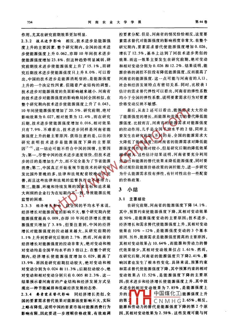 第4卷第6期河南農(nóng)業(yè)大學(xué)學(xué)報(bào)vol.44 No.62010年12 月Journal of Henan Agricultural UniversityDec.2010文章編號(hào):1000 -2340(2010)06 -0731 -05河南省能源強(qiáng)度分解及節(jié)能減排政策分析馬恒運(yùn),陳俊國(guó),管清生,郭善民,任曉靜,劉琪,趙慧芬,戴強(qiáng)(河南農(nóng)業(yè)大學(xué),河南鄭州450002)摘要:通過(guò)建立要素需求模型和能源強(qiáng)度分解模型,將能源強(qiáng)度變化同能源需求、要素替代、技術(shù)進(jìn)步和經(jīng)濟(jì)發(fā)展等因素聯(lián)系起來(lái).估計(jì)結(jié)果顯示,預(yù)算約束和技術(shù)進(jìn)步是能源強(qiáng)度變化的兩個(gè)基本因素,它們的影響效果相當(dāng)?shù)霉喾?能源替代和經(jīng)濟(jì)增長(zhǎng)是不容忽視的影響因素,但能源需求影響效果很小。要降低能源強(qiáng)度,首先要轉(zhuǎn)變技術(shù)進(jìn)步方式,其次要改革能源價(jià)格管理體制,用價(jià)格信號(hào)調(diào)節(jié)能源消費(fèi)行為.關(guān)鍵詞:能源強(qiáng)度分解;節(jié)能減排;要素替代;技術(shù)進(jìn)步中團(tuán)分類號(hào):F206文獻(xiàn)標(biāo)志碼:AAnalysis on decomposing energy intensity and policy implications ofenergy-saving and emission reduction for HenanMA Heng-yun, CHEN Jun-guo, GUAN Qing -sheng, GUO Shan-min,REN Xiao-jing, LIU Qi, ZHAO Hui-fen, DAI Qiang( Henan Agricultural University , Zhengzhou 450002 , China)Abstract: By constructing translog cost funetion , this paper systematically and econometrically decom-poses energy intensity into various efcts of budget constrain, technological change, factor substitu-tion, energy demand and economic growth. The estimated results show that the efects of budget con-strain and technological change are two major determinants of energy intensity changes. However, theireffects are equivalent but totally opposite. The former is positive and the later is negative. The efectsof energy-labour substitution and economic growth are other factors while the efect of energy demand isvery small. To reduce energy intensity, the patterms of economic growth should be changed first, andthen energy pricing system need to be reformed,using market signal to adjust energy consumption be-haviour.Key words:energy intensity decompostion; saving energy and reducing emission; factor substitution;technical change改革開(kāi)放以來(lái),中國(guó)的能源強(qiáng)度迅速下降,能計(jì)指數(shù)法局限性,不能把技術(shù)進(jìn)步、消費(fèi)行為要素源利用效率不斷提高、但能源強(qiáng)度仍然是世界平均替代和經(jīng)濟(jì)增長(zhǎng)同能源強(qiáng)度變化有機(jī)地聯(lián)系起來(lái).水平的3倍"。中國(guó)已經(jīng)成為世界上第2大能源消本研究在建立需求模型基礎(chǔ)上,把能源強(qiáng)度變化分費(fèi)國(guó),很快將成為第1大溫室氣體排放國(guó).中國(guó)的.解為技術(shù)進(jìn)步、消費(fèi)行為、要素替代和經(jīng)濟(jì)增長(zhǎng)等能源強(qiáng)度已經(jīng)引起了國(guó)內(nèi)外廣泛關(guān)注,許多學(xué)者進(jìn)因素,從經(jīng)濟(jì)計(jì)量學(xué)角度研究能源強(qiáng)度變化及影響行了廣泛研究",但目前的研究沒(méi)有擺脫常規(guī)統(tǒng)因素中國(guó)煤化工YHCNMHG收稿日期:2009-12-22金項(xiàng)目:河南省軟科學(xué)計(jì)劃項(xiàng)目(102400450278);河南省忻學(xué)杜會(huì)科學(xué)規(guī)劃項(xiàng)目(201081J013)作者簡(jiǎn)介:馬怛運(yùn),1960 年生.男,山東蓬菜人,教授,博+生鐘師,從事農(nóng)業(yè)經(jīng)濟(jì)和能譚經(jīng)濟(jì)研究.732河南農(nóng)業(yè)大學(xué)學(xué)報(bào)第44卷解為6部分,它們依次為e,e,e,e,e,和egs. 其中,1材料與方法e。是測(cè)量能源價(jià)格變化產(chǎn)生的預(yù)算效果對(duì)能源強(qiáng)1.1 數(shù)據(jù)來(lái)源度的影響,等于[Pg/P[] xβr;e,2r 和e,是能源需:勞動(dòng)和資本投人、國(guó)民生產(chǎn)總值和各種生產(chǎn)要求變化、能源-資本替代和能源-勞動(dòng)力替代對(duì)素價(jià)格指數(shù)序列來(lái)自《中國(guó)統(tǒng)計(jì)年鑒》,其中,固定能源消費(fèi)強(qiáng)度的影響,它們依次等于[P。/Pg] x資產(chǎn)存量序列根據(jù)K, =K._.(1-8) +1,估計(jì)得,公BβggInPg,[Pp/Pg] xpBeln Px和[Pp/P[] x BglIn式中K,為當(dāng)前資本存量;K..為前期資本存量;δPr;e是經(jīng)濟(jì)增長(zhǎng)對(duì)能源消費(fèi)強(qiáng)度的影響,等于為資本折舊率;1,是當(dāng)前資本投資.各種能源消費(fèi)[P,/P[] xB,In Y;e,是技術(shù)進(jìn)步對(duì)能源消費(fèi)強(qiáng)度量數(shù)據(jù)來(lái)自于《中國(guó)能源統(tǒng)計(jì)年鑒》21.各種能源的影響,等于[Po/P[] xβe,t. 各因素對(duì)能源消費(fèi)強(qiáng)價(jià)格數(shù)據(jù)來(lái)自于國(guó)家發(fā)展與改革委員會(huì)價(jià)格司.總度變化的相對(duì)影響定義為:成本由勞動(dòng)(L)、資本(K)和能源(E)3種要素投0e/e= E (O./e)(e,/e)(4)人構(gòu)成.勞動(dòng)力投人成本等于勞動(dòng)力的總工資支式中:Qe/e和se,/e分別代表相對(duì)于時(shí)間的變化;e出,資本投人成本等于實(shí)際固定資本存量,能源投和e表示基年的能源消費(fèi)強(qiáng)度水平.人成本等于各種能源消費(fèi)量乘以能源價(jià)格的合計(jì)數(shù).2結(jié)果與分析1.2 成本函數(shù)超自然成本對(duì)數(shù)函數(shù)是一個(gè)較方便的對(duì)偶理2.1要素替代彈性為觀察和比較河南省要素替代彈性的歷史變.論的定義,而且在實(shí)踐中得到廣泛