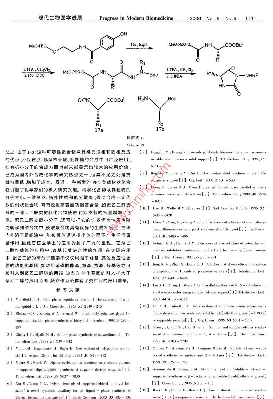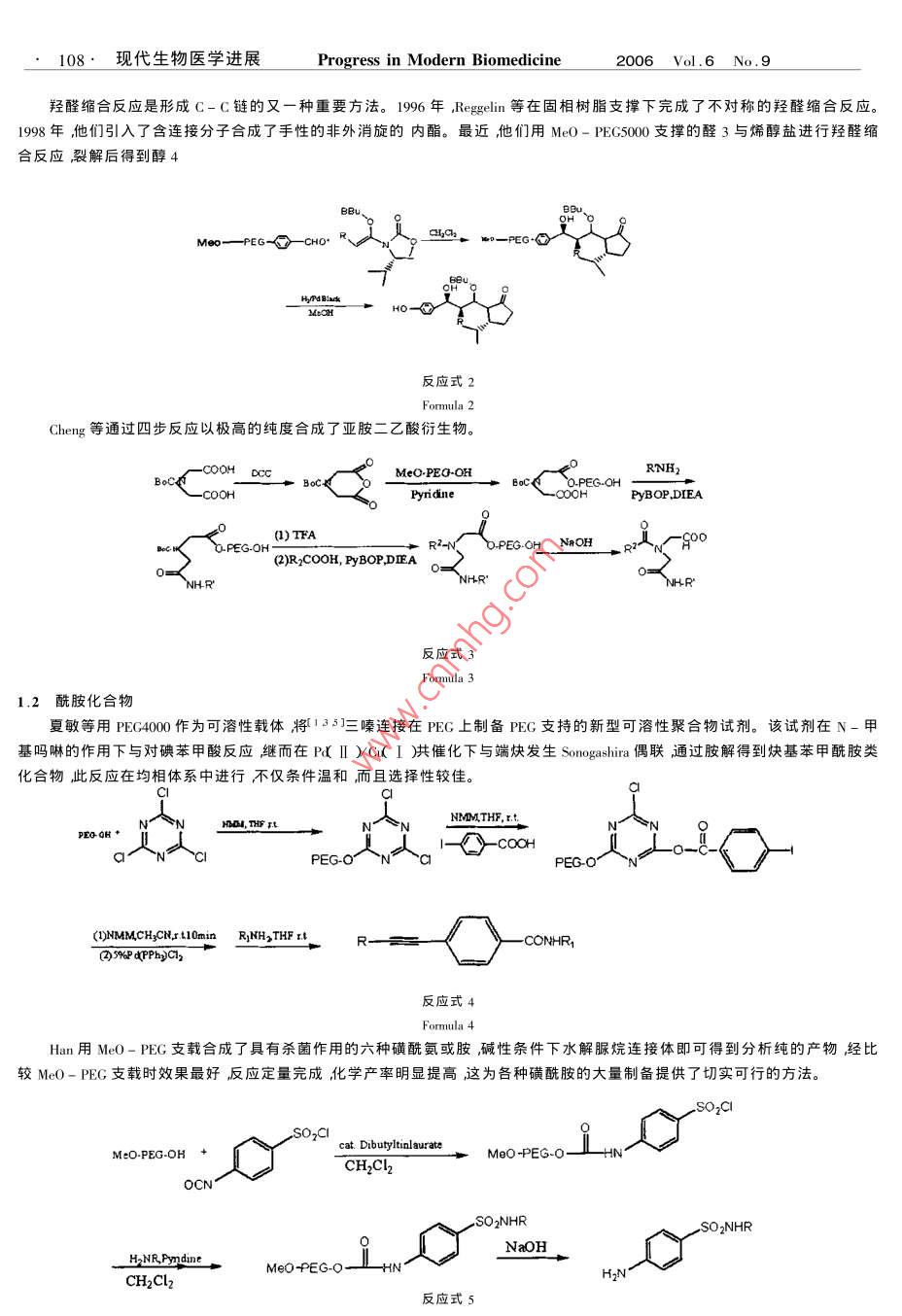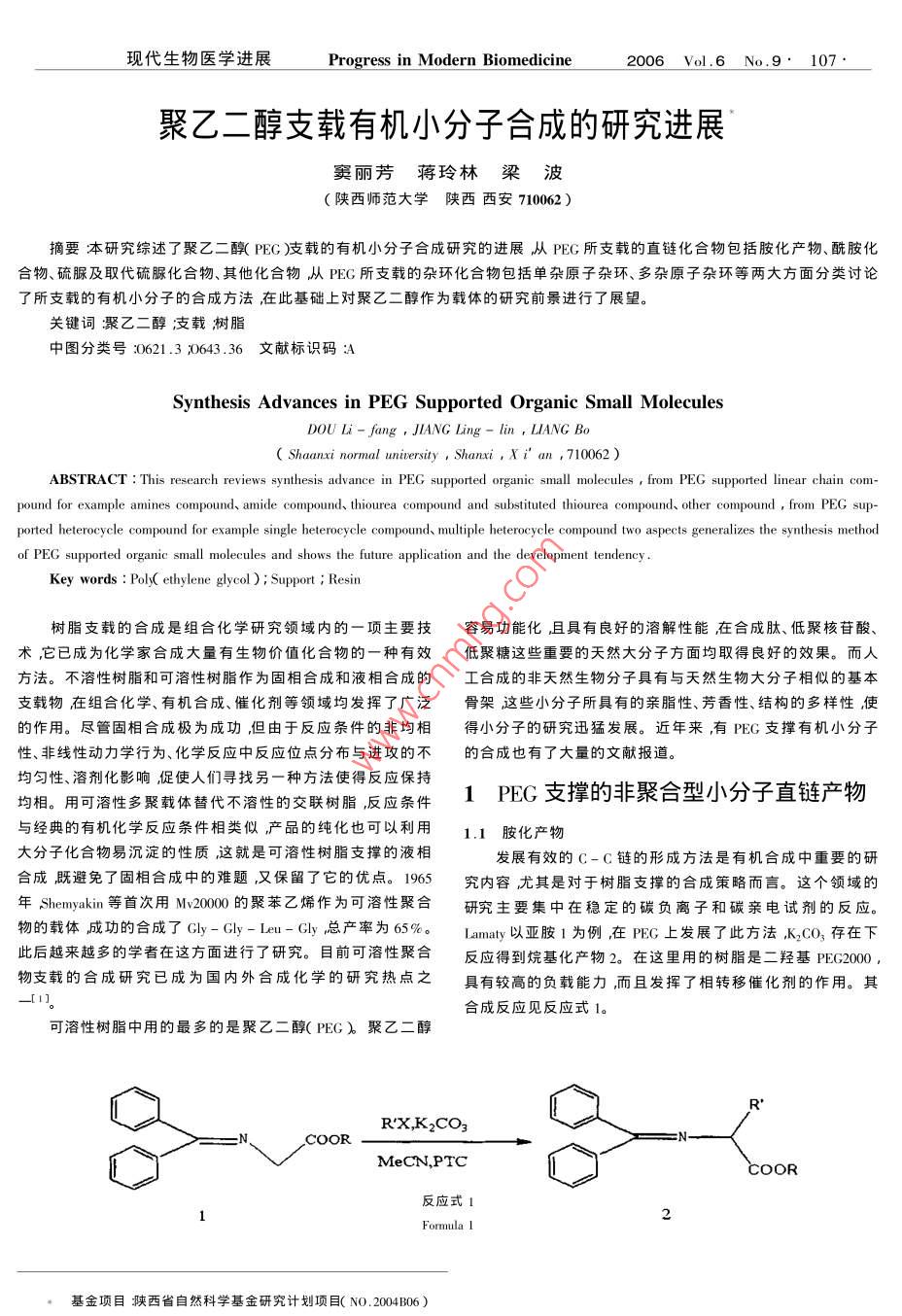 現(xiàn)代生物醫(yī)學(xué)進(jìn)展 Progress in Modern biomedicine2006Vol.6No.9·107聚乙二醇支載有機(jī)小分子合成的研究進(jìn)展竇麗芳蔣玲林梁波陜西師范大學(xué)陜西西安710062)摘要沐研究綜述了聚乙二歐(PEG)載的有機(jī)小分子合成硏究的進(jìn)展從PEG所支載的直鏈化合物包括胺化產(chǎn)物、酰胺化合物、硫脲及取代硫脲化合物、其他化合物從PEG所支載的雜環(huán)化合物包括單雜原子雜環(huán)、多雜原子雜環(huán)等兩大方面分類討論了所支載的有機(jī)小分子的合成方法在此基礎(chǔ)上對(duì)聚乙二醇作為載體的研究前景進(jìn)行了展望。關(guān)鍵詞聚乙二醇皮載樹脂圖分類號(hào)0621.3X643.36文獻(xiàn)標(biāo)識(shí)碼:ASynthesis advances in PEg Supported Organic Small MoleculesDOU Li-fang, JIANG Ling-lin LIANG BoShaanxi normal university Shanxi, X i' an, 710062)ABSTRACT: This research reviews synthesis advance in PEG supported organic small molecules, from PEG supported linear chain compound for example amines compound, amide compound, thiourea compound and substituted thiourea compound, other compound from PEG suprecycle compound for example single heterocycle compound, multiple heterocycle compound two aspects generalizes the synthesis methodof PEG supported organic small molecules and shows the future application and the development tendencyKey words: Pol( ethylene glycol ) Support Resin樹脂支載的合成是組合化學(xué)研究領(lǐng)域內(nèi)的一項(xiàng)主要技容易功能化且具有良好的溶解性能在合成肽、低聚核苷酸術(shù),它已成為化學(xué)家合成大量有生物價(jià)值化合物的一種有效低聚糖這些重要的天然大分子方面均取得良好的效果。而人方法。不溶性樹脂和可溶性樹脂作為固相合成和液相合成的工合成的非天然生物分子具有與天然生物大分子相似的基本支載物在組合化學(xué)、有機(jī)合成、催化劑等領(lǐng)域均發(fā)揮了廣泛骨架這些小分子所具有的親脂性、芳香性、結(jié)構(gòu)的多樣性使的作用。盡管固相合成極為成功但由于反應(yīng)條件的非均相得小分子的研究迅猛發(fā)展。近年來(lái),有PEG支撐有機(jī)小分子性、非線性動(dòng)力學(xué)行為、化學(xué)反應(yīng)中反應(yīng)位點(diǎn)分布與進(jìn)攻的不的合成也有了大量的文獻(xiàn)報(bào)道。均相。用可)性多聚載體替代不溶性的交聯(lián)樹脂反應(yīng)條件1PEG支撐的非聚合型小分子直鏈產(chǎn)物與經(jīng)典的有機(jī)化學(xué)反應(yīng)條件相類似產(chǎn)品的純化也可以利用11胺化產(chǎn)物大分子化合物易沉淀的性質(zhì)這就是可溶性樹脂支撐的液相發(fā)展有效的C-C鏈的形成方法是有機(jī)合成中重要的研合成既避免了固相合成中的難題,又保留了它的優(yōu)點(diǎn)。1965究?jī)?nèi)容尤其是對(duì)于樹脂支撐的合成策略而言。這個(gè)領(lǐng)域的年 Shemyakin等首次用M00的聚苯乙烯作為可溶性聚合研究主要集中在穩(wěn)定的碳負(fù)離子和碳親電試劑的反應(yīng)物的載體成功的合成了Cy-Gly-Leu-Gly,總產(chǎn)率為65%Lamaty以亞胺1為例,在PG上發(fā)展了此方法K2CO3存在下此后越來(lái)越多的學(xué)者在這方面進(jìn)行了研究。目前可溶性聚合反應(yīng)得到烷基化產(chǎn)物2。在這里用的樹脂是二羥基PEC200物支載的合成研究已成為國(guó)內(nèi)外合成化學(xué)的研究熱點(diǎn)之具有較高的負(fù)載能力而且發(fā)揮了相轉(zhuǎn)移催化劑的作用。其合成反應(yīng)見反應(yīng)式1??扇苄詷渲杏玫淖疃嗟氖蔷垡叶?PEG)聚乙二醇R'X, K2COCOORMeCNPrcCOOR反應(yīng)式1Formula I基金項(xiàng)目陜西省自然科學(xué)基金研究計(jì)劃項(xiàng)目(NO.2004B06)108·現(xiàn)代生物醫(yī)學(xué)進(jìn)展 Progress in Modern Biomedicine2006Vol.6No.9羥醛縮合反應(yīng)是形成C-C鏈的又一種重要方法。1996年 Hegglin等在固相樹脂支撐下完成了不對(duì)稱的羥醛縮合反應(yīng)1998年他們引入了含連接分子合成了手性的非外消旋的內(nèi)酯。最近他們用MeO-PEG5000支撐的醛3與烯醇鹽進(jìn)行羥醛縮合反應(yīng)裂解后得到醇40一PEG反應(yīng)式2Cheng等通過四步反應(yīng)以極高的純度合成了亞胺二乙酸衍生物MeO..OHRNEO-PEG. OHPEGO2)R2CoOH, PyBOPD正EA反應(yīng)式31.2酰胺化合物夏敏等用PEG4000作為可溶性載體將135三嗪連接在PEG上制備PEG支持的新型可溶性聚合物試劑。該試劑在N-甲基嗎啉的作用下與對(duì)碘苯甲酸反應(yīng)繼而在PⅡ)CαⅠ)拱催仳下與端炔發(fā)生 Sonogashira偶聯(lián)通過胺解得到炔基苯甲酰胺類化合物此反應(yīng)在均相體系中進(jìn)行不僅條件溫和而且選擇性較佳。NMMTHF rPEG-OHT孔PEGOPEG-0MMCH3 CN r. L10min=(CONHR,反應(yīng)式4Han用MeO-PEG支載合成了具有殺菌作用的六種磺酰氨或胺,堿性條件下水解脲烷逹接體即可得到分析純的產(chǎn)物經(jīng)比較MeO-PEG支載時(shí)效果最好反應(yīng)定量完成化學(xué)產(chǎn)率明顯提高這為各種磺酰胺的大量制備提供了切實(shí)可行的方法。MeO-PEG-OH+cat DibutyltinlaurateMeO-PEG.OH2Cl2OCNSOnHRMeO-PEG-oHaN反應(yīng)式5現(xiàn)代生物醫(yī)學(xué)進(jìn)展 Progress in Modern Biomedicine2006Vol,6No.9·10烷基得到了叔胺。該方法用弱堿性樹脂作堿吸附 Hofmann消除反應(yīng)中產(chǎn)生的IX便于分離純化且對(duì)環(huán)境友好是一種綠色化學(xué)”合成方法。PEGPEG一〔 Exces)PEGCH2 CI2CHCl3PEG-ODMErtPEGOPEG--N- (Excess)+ R-N反應(yīng)式6Scheme 61.3硫脲