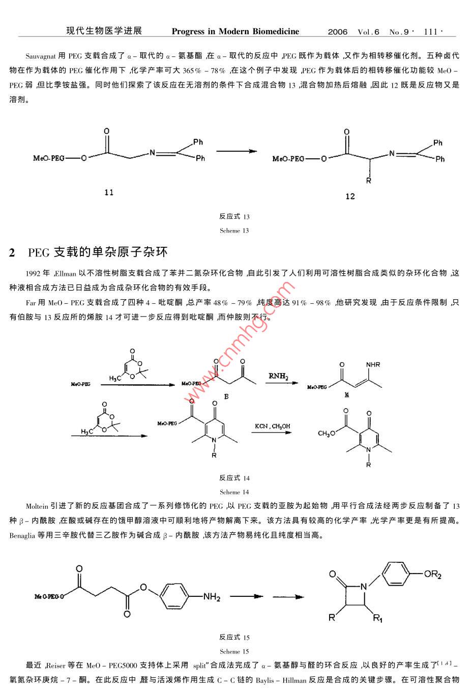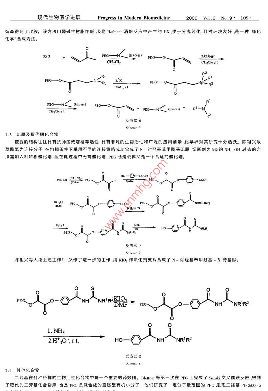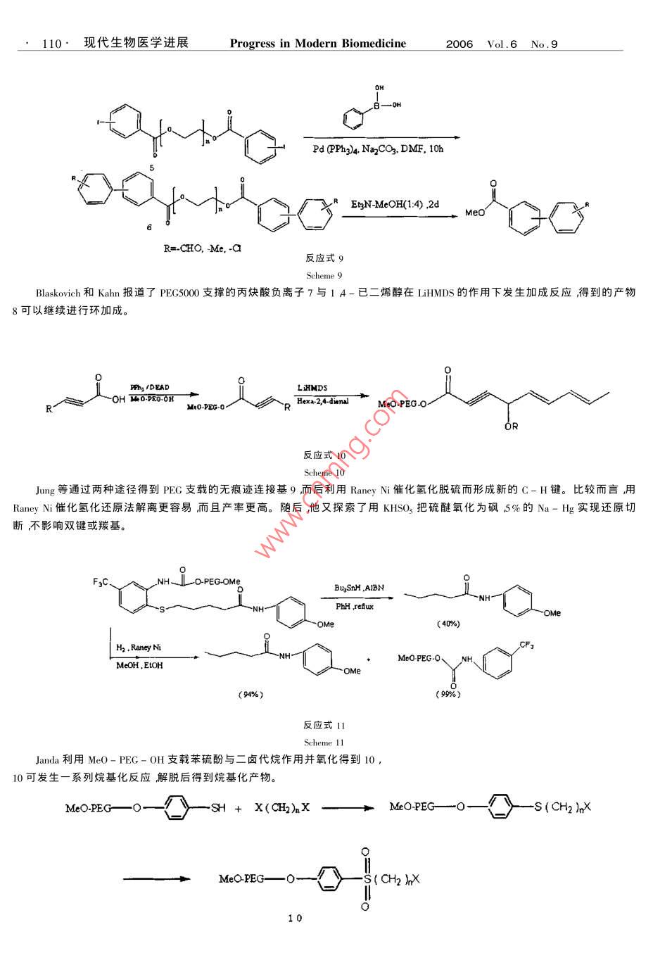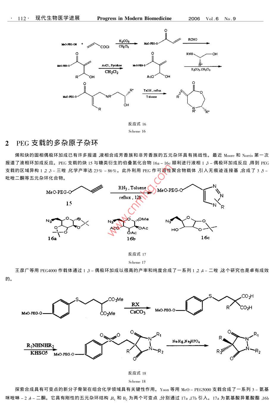 現(xiàn)代生物醫(yī)學(xué)進(jìn)展 Progress in Modern biomedicine2006Vol.6No.9·107聚乙二醇支載有機(jī)小分子合成的研究進(jìn)展竇麗芳蔣玲林梁波陜西師范大學(xué)陜西西安710062)摘要沐研究綜述了聚乙二歐(PEG)載的有機(jī)小分子合成硏究的進(jìn)展從PEG所支載的直鏈化合物包括胺化產(chǎn)物、酰胺化合物、硫脲及取代硫脲化合物、其他化合物從PEG所支載的雜環(huán)化合物包括單雜原子雜環(huán)、多雜原子雜環(huán)等兩大方面分類討論了所支載的有機(jī)小分子的合成方法在此基礎(chǔ)上對(duì)聚乙二醇作為載體的研究前景進(jìn)行了展望。關(guān)鍵詞聚乙二醇皮載樹脂圖分類號(hào)0621.3X643.36文獻(xiàn)標(biāo)識(shí)碼:ASynthesis advances in PEg Supported Organic Small MoleculesDOU Li-fang, JIANG Ling-lin LIANG BoShaanxi normal university Shanxi, X i' an, 710062)ABSTRACT: This research reviews synthesis advance in PEG supported organic small molecules, from PEG supported linear chain compound for example amines compound, amide compound, thiourea compound and substituted thiourea compound, other compound from PEG suprecycle compound for example single heterocycle compound, multiple heterocycle compound two aspects generalizes the synthesis methodof PEG supported organic small molecules and shows the future application and the development tendencyKey words: Pol( ethylene glycol ) Support Resin樹脂支載的合成是組合化學(xué)研究領(lǐng)域內(nèi)的一項(xiàng)主要技容易功能化且具有良好的溶解性能在合成肽、低聚核苷酸術(shù),它已成為化學(xué)家合成大量有生物價(jià)值化合物的一種有效低聚糖這些重要的天然大分子方面均取得良好的效果。而人方法。不溶性樹脂和可溶性樹脂作為固相合成和液相合成的工合成的非天然生物分子具有與天然生物大分子相似的基本支載物在組合化學(xué)、有機(jī)合成、催化劑等領(lǐng)域均發(fā)揮了廣泛骨架這些小分子所具有的親脂性、芳香性、結(jié)構(gòu)的多樣性使的作用。盡管固相合成極為成功但由于反應(yīng)條件的非均相得小分子的研究迅猛發(fā)展。近年來(lái),有PEG支撐有機(jī)小分子性、非線性動(dòng)力學(xué)行為、化學(xué)反應(yīng)中反應(yīng)位點(diǎn)分布與進(jìn)攻的不的合成也有了大量的文獻(xiàn)報(bào)道。均相。用可)性多聚載體替代不溶性的交聯(lián)樹脂反應(yīng)條件1PEG支撐的非聚合型小分子直鏈產(chǎn)物與經(jīng)典的有機(jī)化學(xué)反應(yīng)條件相類似產(chǎn)品的純化也可以利用11胺化產(chǎn)物大分子化合物易沉淀的性質(zhì)這就是可溶性樹脂支撐的液相發(fā)展有效的C-C鏈的形成方法是有機(jī)合成中重要的研合成既避免了固相合成中的難題,又保留了它的優(yōu)點(diǎn)。1965究?jī)?nèi)容尤其是對(duì)于樹脂支撐的合成策略而言。這個(gè)領(lǐng)域的年 Shemyakin等首次用M00的聚苯乙烯作為可溶性聚合研究主要集中在穩(wěn)定的碳負(fù)離子和碳親電試劑的反應(yīng)物的載體成功的合成了Cy-Gly-Leu-Gly,總產(chǎn)率為65%Lamaty以亞胺1為例,在PG上發(fā)展了此方法K2CO3存在下此后越來(lái)越多的學(xué)者在這方面進(jìn)行了研究。目前可溶性聚合反應(yīng)得到烷基化產(chǎn)物2。在這里用的樹脂是二羥基PEC200物支載的合成研究已成為國(guó)內(nèi)外合成化學(xué)的研究熱點(diǎn)之具有較高的負(fù)載能力而且發(fā)揮了相轉(zhuǎn)移催化劑的作用。其合成反應(yīng)見反應(yīng)式1??扇苄詷渲杏玫淖疃嗟氖蔷垡叶?PEG)聚乙二醇R'X, K2COCOORMeCNPrcCOOR反應(yīng)式1Formula I基金項(xiàng)目陜西省自然科學(xué)基金研究計(jì)劃項(xiàng)目(NO.2004B06)108·現(xiàn)代生物醫(yī)學(xué)進(jìn)展 Progress in Modern Biomedicine2006Vol.6No.9羥醛縮合反應(yīng)是形成C-C鏈的又一種重要方法。1996年 Hegglin等在固相樹脂支撐下完成了不對(duì)稱的羥醛縮合反應(yīng)1998年他們引入了含連接分子合成了手性的非外消旋的內(nèi)酯。最近他們用MeO-PEG5000支撐的醛3與烯醇鹽進(jìn)行羥醛縮合反應(yīng)裂解后得到醇40一PEG反應(yīng)式2Cheng等通過四步反應(yīng)以極高的純度合成了亞胺二乙酸衍生物MeO..OHRNEO-PEG. OHPEGO2)R2CoOH, PyBOPD正EA反應(yīng)式31.2酰胺化合物夏敏等用PEG4000作為可溶性載體將135三嗪連接在PEG上制備PEG支持的新型可溶性聚合物試劑。該試劑在N-甲基嗎啉的作用下與對(duì)碘苯甲酸反應(yīng)繼而在PⅡ)CαⅠ)拱催仳下與端炔發(fā)生 Sonogashira偶聯(lián)通過胺解得到炔基苯甲酰胺類化合物此反應(yīng)在均相體系中進(jìn)行不僅條件溫和而且選擇性較佳。NMMTHF rPEG-OHT孔PEGOPEG-0MMCH3 CN r. L10min=(CONHR,反應(yīng)式4Han用MeO-PEG支載合成了具有殺菌作用的六種磺酰氨或胺,堿性條件下水解脲烷逹接體即可得到分析純的產(chǎn)物經(jīng)比較MeO-PEG支載時(shí)效果最好反應(yīng)定量完成化學(xué)產(chǎn)率明顯提高這為各種磺酰胺的大量制備提供了切實(shí)可行的方法。MeO-PEG-OH+cat DibutyltinlaurateMeO-PEG.OH2Cl2OCNSOnHRMeO-PEG-oHaN反應(yīng)式5現(xiàn)代生物醫(yī)學(xué)進(jìn)展 Progress in Modern Biomedicine2006Vol,6No.9·10烷基得到了叔胺。該方法用弱堿性樹脂作堿吸附 Hofmann消除反應(yīng)中產(chǎn)生的IX便于分離純化且對(duì)環(huán)境友好是一種綠色化學(xué)”合成方法。PEGPEG一〔 Exces)PEGCH2 CI2CHCl3PEG-ODMErtPEGOPEG--N- (Excess)+ R-N反應(yīng)式6Scheme 61.3硫脲