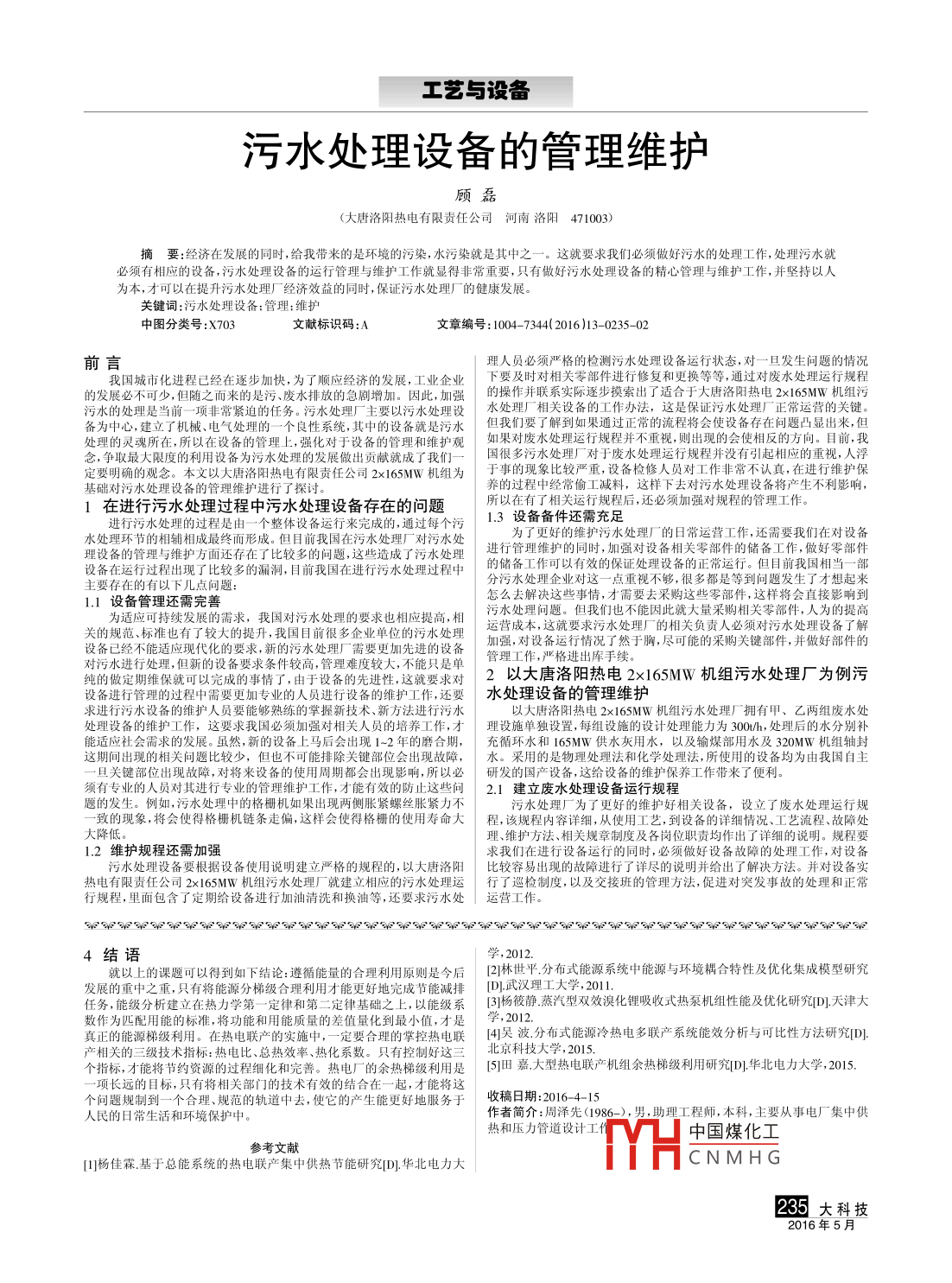 工藝與設(shè)備污水處理設(shè)備的管理維護(hù)顧磊(大唐洛陽熱電有限責(zé)任公司河南 洛陽471003)商要:經(jīng)濟(jì)在發(fā)展的同時(shí),給我?guī)淼氖黔h(huán)境的污染,水污染就是其中之一-。這就要求我們必須做好污水的處理工作,處理污水就必須有相應(yīng)的設(shè)備,污水處理設(shè)備的運(yùn)行管理與維護(hù)工作就顯得非常重要,只有做好污水處理設(shè)備的精心管理與維護(hù)工作,并堅(jiān)持以人為本,才可以在提升污水處理廠經(jīng)濟(jì)效益的同時(shí),保證污水處理廠的健康發(fā)展。關(guān)鍵詞:污水處理設(shè)備:管理;維護(hù)中圖分類號:X703文獻(xiàn)標(biāo)識碼:A文章編號: 1004-7344 2016)13-0235-02前言理人員必須嚴(yán)格的檢測污水處理設(shè)備運(yùn)行狀態(tài),對一旦發(fā)生問題的情況我國城市化進(jìn)程已經(jīng)在逐步加快,為了順應(yīng)經(jīng)濟(jì)的發(fā)展,工業(yè)企業(yè)|下要及時(shí)對相關(guān)零部件進(jìn)行修復(fù)和更換等等,通過對廢水處理運(yùn)行規(guī)程的發(fā)展必不可少,但隨之而來的是污、廢水排放的急劇增加。因此,加強(qiáng) 的操作并聯(lián)系實(shí)際逐步摸索出了適合于大唐洛陽熱電2x165MW機(jī)組污污水的處理是當(dāng)前一項(xiàng)非常緊迫的任務(wù)。污水處理廠主要以污水處理設(shè)|水處理廠 相關(guān)設(shè)備的工作辦法,這是保證污水處理廠正常運(yùn)營的關(guān)鍵。備為中心,建立了機(jī)械、電氣處理的一一個(gè)良性系統(tǒng),其中的設(shè)備就是污水但我們要了解到如果通過正常的流程將會使設(shè)備存在問題凸顯出來,但處理的靈魂所在,所以在設(shè)備的管理,上,強(qiáng)化對于設(shè)備的管理和維護(hù)觀如果對廢水處理運(yùn)行規(guī)程并不重視,則出現(xiàn)的會使相反的方向。目前,我念,爭取最大限度的利用設(shè)備為污水處理的發(fā)展做出貢獻(xiàn)就成了我們一國很多污水處理廠 對于廢水處理運(yùn)行規(guī)程并沒有引起相應(yīng)的重視,人浮定要明確的觀念:本文以大唐洛陽熱電有限責(zé)任公司2x165MW機(jī)組為定要明確的觀念。本文以大唐洛陽熱電有限責(zé)任公司2x165MW機(jī)組為于事的現(xiàn)象 比較嚴(yán)重,設(shè)備檢修人員對工作非常不認(rèn)真,在進(jìn)行維護(hù)保養(yǎng)的過程中經(jīng)常偷工減料,這樣下去對污水處理設(shè)備將產(chǎn)生不利影響,觸對污水處理設(shè)維護(hù)主1在進(jìn)行污水處理過程中污水處理設(shè)備存在的問題所以在有了相關(guān)運(yùn)行規(guī)程后,還必須加強(qiáng)對規(guī)程的管理工作。進(jìn)行污水處理的過程是由一一個(gè)整體設(shè)備運(yùn)行來完成的,通過每個(gè)污1.3設(shè)備備件還需充足水處理環(huán)節(jié)的相輔相成最終而形成。但目前我國在污水處理廠對污水處為了更好的維護(hù)污水處理廠的日常運(yùn)營工作,還需要我們在對設(shè)備理設(shè)備的管理與維護(hù)方面還存在了比較多的問題,這些造成了污水處理.進(jìn)行管理維護(hù)的同時(shí),加強(qiáng)對設(shè)備相關(guān)零部件的儲備工作,做好零部件設(shè)備在運(yùn)行過程出現(xiàn)了比較多的漏洞,目前我國在進(jìn)行污水處理過程中的儲備工作可以有效的保證處理設(shè)備的正常運(yùn)行。但目前我國相當(dāng)一部.分污水處理企業(yè)對這--點(diǎn)重視不夠,很多都是等到問題發(fā)生了才想起來主要存在的有以下幾點(diǎn)問題:怎么去解決這些事情,才需要去采購這些零部件,這樣將會直接影響到1.1 設(shè)備管理還需完善為適應(yīng)可持續(xù)發(fā)展的需求,我國對污水處理的要求也相應(yīng)提高,相污水處理問題。但我們也不能因此就大量采購相關(guān)零部件,人為的提高關(guān)的規(guī)范、標(biāo)準(zhǔn)也有了較大的提升,我國目前很多企業(yè)單位的污水處理運(yùn)營成本,這就要求污水處理廠的相關(guān)負(fù)責(zé)人必須對污水處理設(shè)備了解.加強(qiáng),對設(shè)備運(yùn)行情況了然于胸,盡可能的采購關(guān)鍵部件,并做好部件的設(shè)備已經(jīng)不能適應(yīng)現(xiàn)代化的要求,新的污水處理廠需要更加先進(jìn)的設(shè)備|管陽工 亞出出廢主理對污水進(jìn)行處理,但新的設(shè)備要求條件較高,管理難度較大,不能只是單2以大唐洛陽熱電2x165MW機(jī)組污水處理廠為例污純的做定期維保就可以完成的事情了,由于設(shè)備的先進(jìn)性,這就要求對設(shè)備進(jìn)行管理的過程中需要更加專業(yè)的人員進(jìn)行設(shè)備的維護(hù)工作,還要水 處理設(shè)備的管理維護(hù)求進(jìn)行污水設(shè)備的維護(hù)人員要能夠熟練的掌握新技術(shù)、新方法進(jìn)行污水以大唐洛陽熱電2x165MW機(jī)組污水處理廠擁有甲、乙兩組廢水處處理設(shè)備的維護(hù)工作,這要求我國必須加強(qiáng)對相關(guān)人員的培養(yǎng)工作,才|理設(shè)施單獨(dú)設(shè)置,每組設(shè)施的設(shè)計(jì)處理能力為300t/h,處理后的水分別補(bǔ)能適應(yīng)社會需求的發(fā)展。雖然,新的設(shè)備上馬后會出現(xiàn)1~2年的磨合期,充 循環(huán)水和165MW供水灰用水,以及輸煤部用水及320MW機(jī)組軸封這期間出現(xiàn)的相關(guān)問題比較少,但也不可能排除關(guān)鍵部位會出現(xiàn)故障,