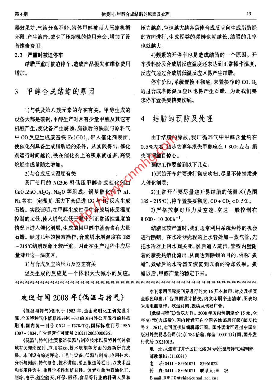 甲醇合成結(jié)臘的原因及處理