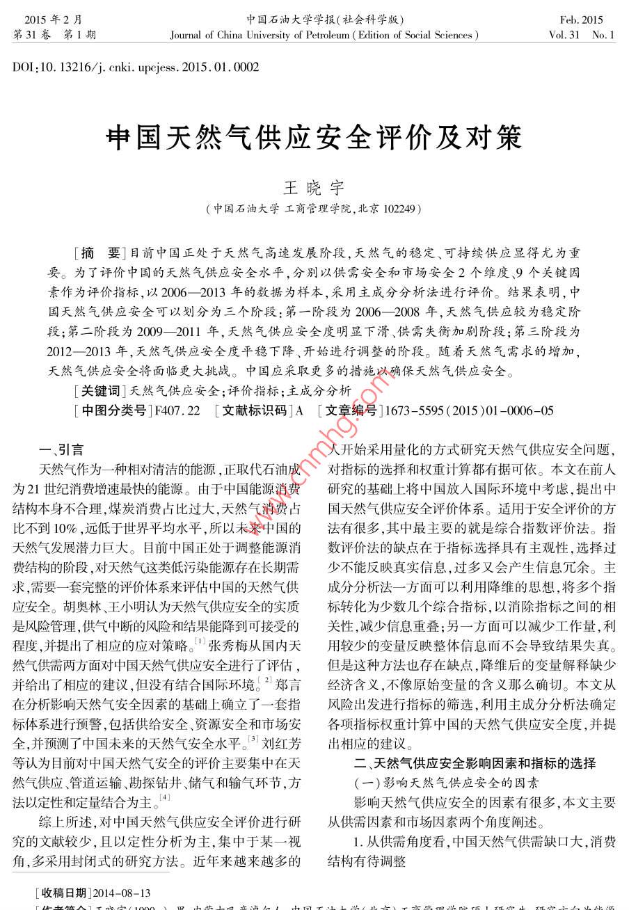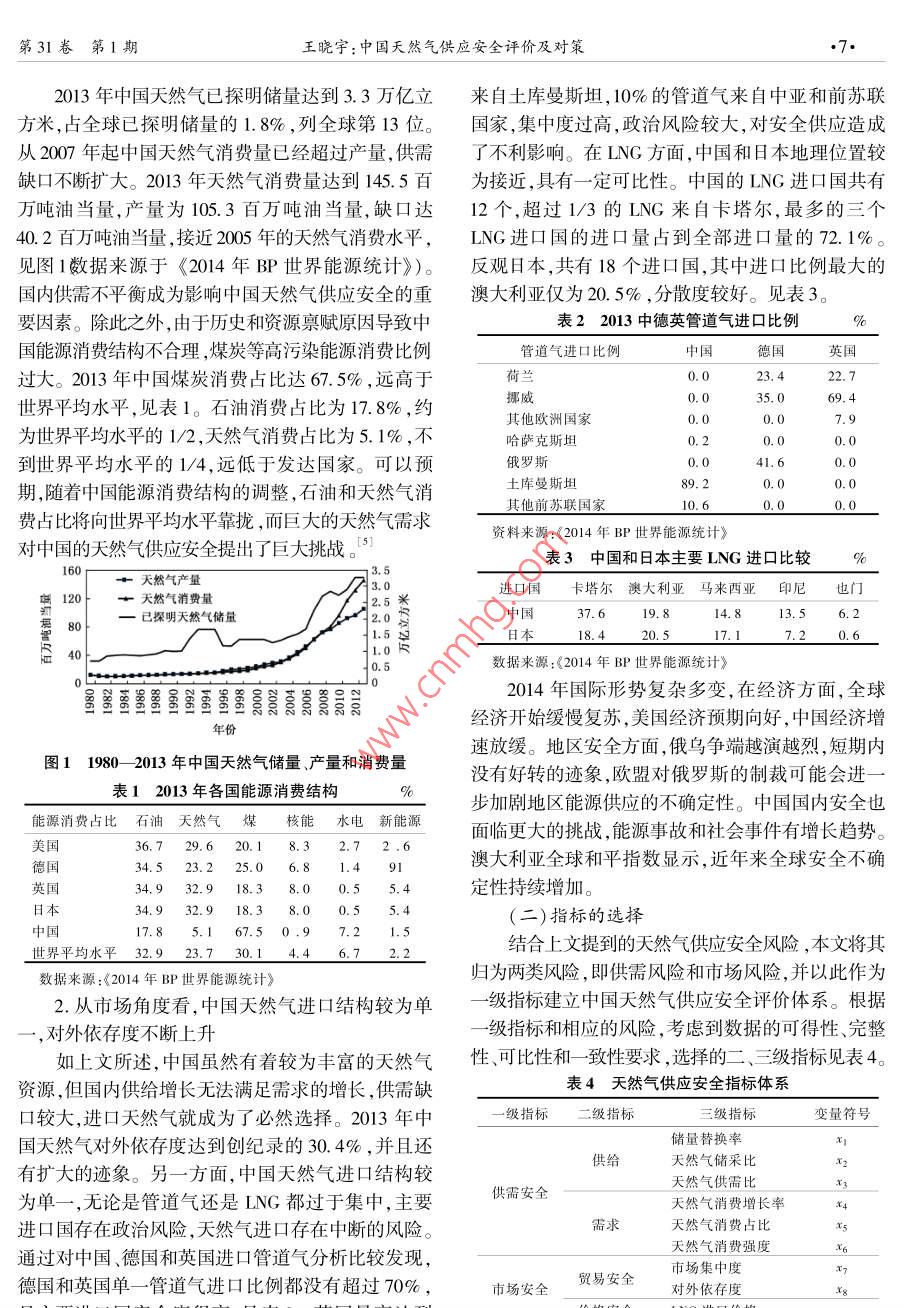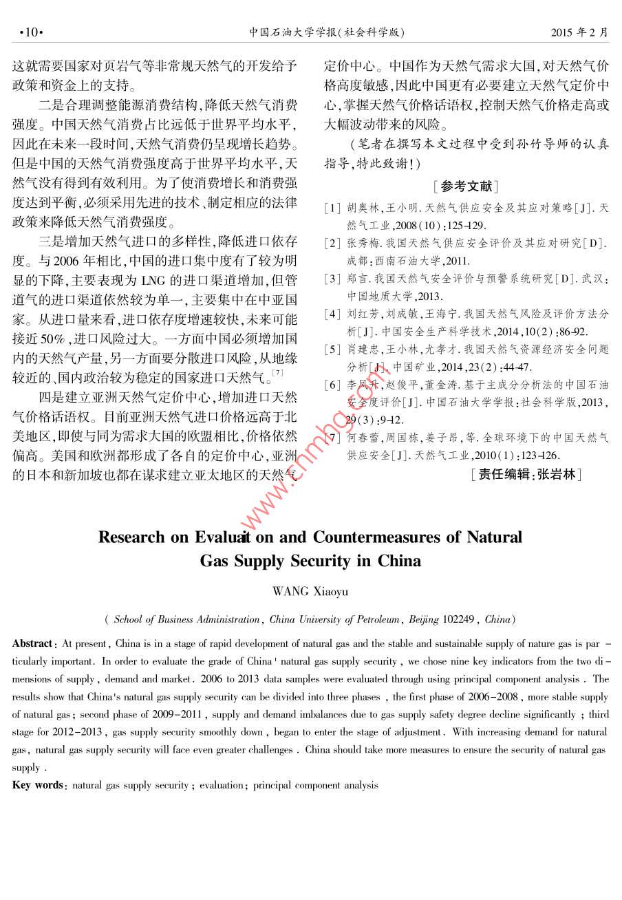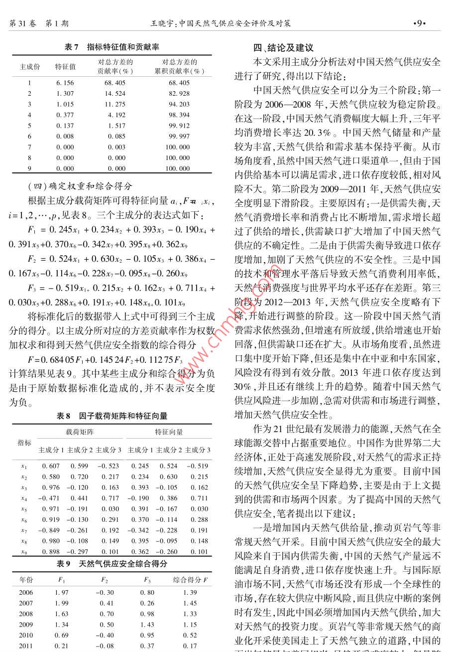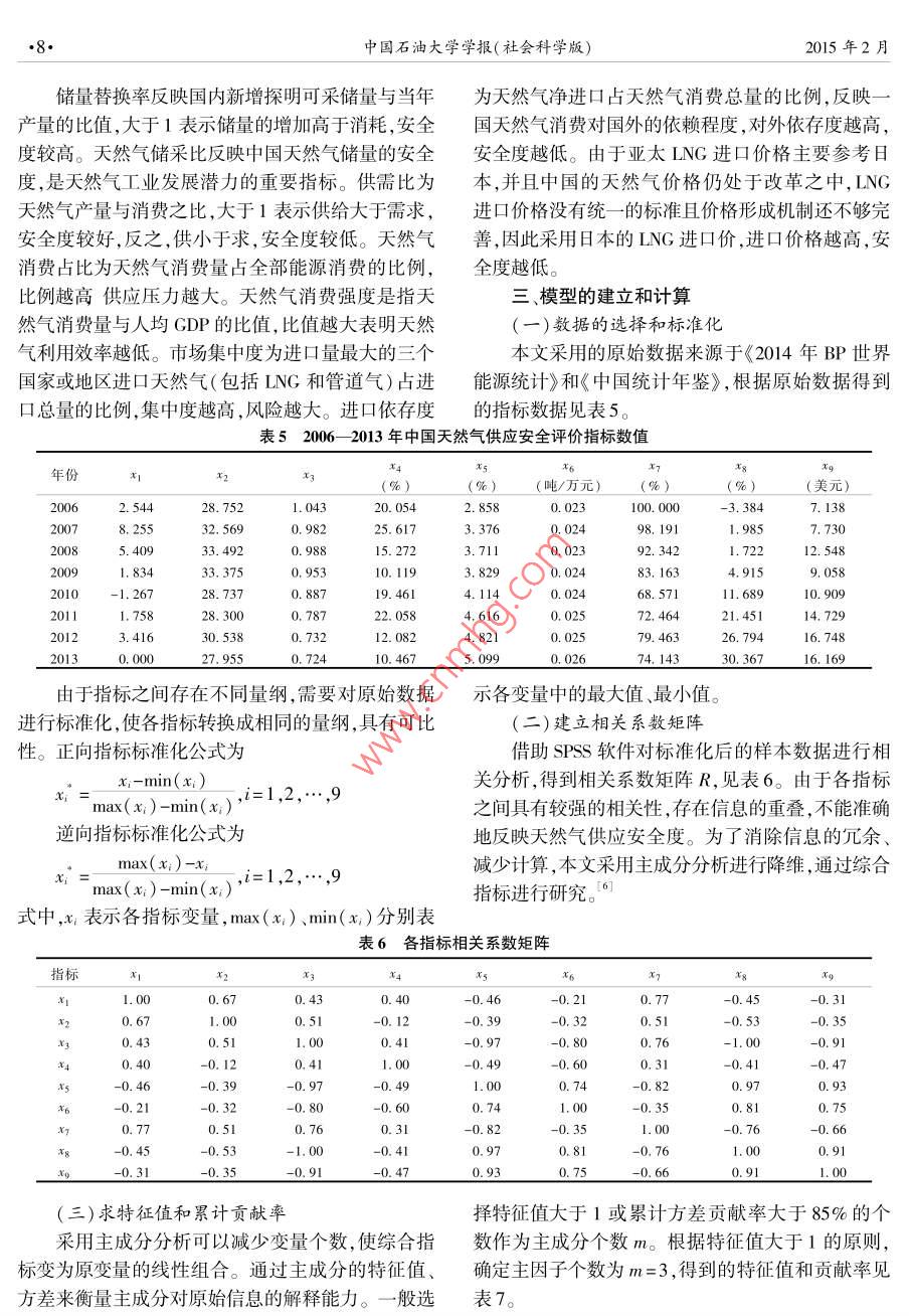 2015年2月中國石油大學(xué)學(xué)報(社會科學(xué)版)Feb.2015第31卷第1期Journal of China University of Petroleum( Edition of Social SciencesVol 31 No. 1DOl:10.13216/j.cnki. upness.2015.01.0002中國天然氣供應(yīng)安全評價及對策王曉宇(中國石油大學(xué)工商管理學(xué)院,北京102249)摘要]目前中囯正處于天然氣高速發(fā)展階段,天然氣的穩(wěn)定、可持續(xù)供應(yīng)顯得尤為重要。為了評價中國的天然氣供應(yīng)安全水平,分別以供需安全和市場安全2個維度、9個關(guān)鍵因素作為評價指標,以2006—2013年的數(shù)據(jù)為樣本,采用主成分分析法進行評價。結(jié)果表明,中國天然氣供應(yīng)安全可以劃分為三個階段:第一階段為2006-2008年,天然氣供應(yīng)較為穩(wěn)定階段;第二階段為α009-2011年,夭然氣供應(yīng)安全度明顯下滑、供需失衡加劇階段;第三階段為2012-2013年,天然氣供應(yīng)安全度平穩(wěn)下降、開始進行調(diào)整的階段。隨著夭然氣需求的增加,天然氣供應(yīng)安全將面臨更大挑戰(zhàn)。中國應(yīng)采取更多的措施以確保天然氣供應(yīng)安全。[關(guān)鍵詞]天然氣供應(yīng)安全;評價指標;主成分分析[中圖分類號]F407.2[文獻標識碼]A[文章編號]1673-5595(2015)01-0006-05一、引言人開始采用量化的方式研究天然氣供應(yīng)安全問題天然氣作為一種相對清潔的能源,正取代石油成對指標的選擇和權(quán)重計算都有據(jù)可依。本文在前人為21世紀消費增速最快的能源。由于中國能源消費研究的基礎(chǔ)上將中國放亼國際環(huán)境中考慮,提岀中結(jié)構(gòu)本身不合理,煤炭消費占比過大,天然氣消費占國天然氣供應(yīng)安全評價體系。適用于安全評價的方比不到10%,遠低于世界平均水平,所以未來中國的法有很多,其中最主要的就是綜合指數(shù)評價法。指天然氣發(fā)展?jié)摿薮?。目前中國正處于調(diào)整能源消數(shù)評價法的缺點在于指標選擇具有主觀性,選擇過費結(jié)構(gòu)的階段,對天然氣這類低污染能源存在長期需少不能反映真實信息,過多又會產(chǎn)生信息冗余。主求,需要一套完整的評價體系來評估中國的天然氣供成分分析法一方面可以利用降維的思想,將多個指應(yīng)安全。胡奧林、王小明認為天然氣供應(yīng)安全的實質(zhì)標轉(zhuǎn)化為少數(shù)幾個綜合指標,以消除指標之間的相是風(fēng)險管理,供氣中斷的風(fēng)險和結(jié)果能降到可接受的關(guān)性,減少信息重疊;另一方面可以減少工作量,利程度,并提出了相應(yīng)的應(yīng)對策略。張秀梅從國內(nèi)天用較少的變量反映整體信息而不會導(dǎo)致結(jié)果失真。然氣供需兩方面對中國天然氣供應(yīng)安全進行了評估,但是這種方法也存在缺點,降維后的變量解釋缺少并給出了相應(yīng)的建議,但沒有結(jié)合國際環(huán)境。2鄭言經(jīng)濟含義,不像原始變量的含義那么確切。本文從在分析影響天然氣安全因素的基礎(chǔ)上確立了一套指風(fēng)險出發(fā)進行指標的篩選,利用主成分分析法確定標體系進行預(yù)警,包括供給安全、資源安全和市場安各項指標權(quán)重計算中國的天然氣供應(yīng)安全度,并提全,并預(yù)測了中國未來的天然氣安全水平。劉紅芳出相應(yīng)的建議。等認為目前對中國天然氣安全的評價主要集中在天二、天然氣供應(yīng)安全影響因素和指標的選擇然氣供應(yīng)、管道運輸、勘探鉆井、儲氣和輸氣環(huán)節(jié),方(一)影響天然氣供應(yīng)安全的因素法以定性和定量結(jié)合為主。4影響天然氣供應(yīng)安全的因素有很多,本文主要綜上所述,對中國天然氣供應(yīng)安全評價進行研從供需因素和市場因素兩個角度闡述。究的文獻較少,且以定性分析為主,集中于某一視1.從供需角度看,中國天然氣供需缺口大,消費角,多采用封閉式的研究方法。近年來越來越多的結(jié)構(gòu)有待調(diào)整稿日期]2014-08-13第31卷第1期王曉宇:中國天然氣供應(yīng)安全評價及對策2013年中國天然氣已探明儲量達到3.3萬億立來自土庫曼斯坦,10%的管道氣來自中亞和前蘇聯(lián)方米,占全球已探明儲量的1.8%,列全球第13位。國家,集中度過高,政治風(fēng)險較大,對安全供應(yīng)造成從2007年起中國天然氣消費量已經(jīng)超過產(chǎn)量,供需了不利影響。在LNG方面,中國和日本地理位置較缺口不斷擴大。2013年天然氣消費量達到145.5百為接近,具有一定可比性。中國的LNG進口國共有萬噸油當(dāng)量,產(chǎn)量為105.3百萬噸油當(dāng)量,缺口達12個,超過1/3的LNG來自卡塔爾,最多的三個40.2百萬噸油當(dāng)量,接近2005年的天然氣消費水平,LNG進口國的進口量占到全部進口量的72.1%。見圖1數(shù)據(jù)來源于《2014年BP世界能源統(tǒng)計》)。反觀日本,共有18個進口國,其中進口比例最大的國內(nèi)供需不平衡成為影響中國天然氣供應(yīng)安全的重澳大利亞僅為20.5%,分散度較好。見表3。要因素。除此之外,由于歷史和資源稟賦原因?qū)е轮斜?2013中德英管道氣進口比例國能源消費結(jié)構(gòu)不合理,煤炭等高污染能源消費比例管道氣進口比例中國德國英國過大。2013年中國煤炭消費占比達67.5%,遠高于荷蘭0.023.422.7世界平均水平,見表1。石油消費占比為17.8%,約挪威35.069.4他歐洲國為世界平均水平的1/2,天然氣消費占比為5.1%,不哈薩克斯坦0.0到世界平均水平的1/4,遠低于發(f