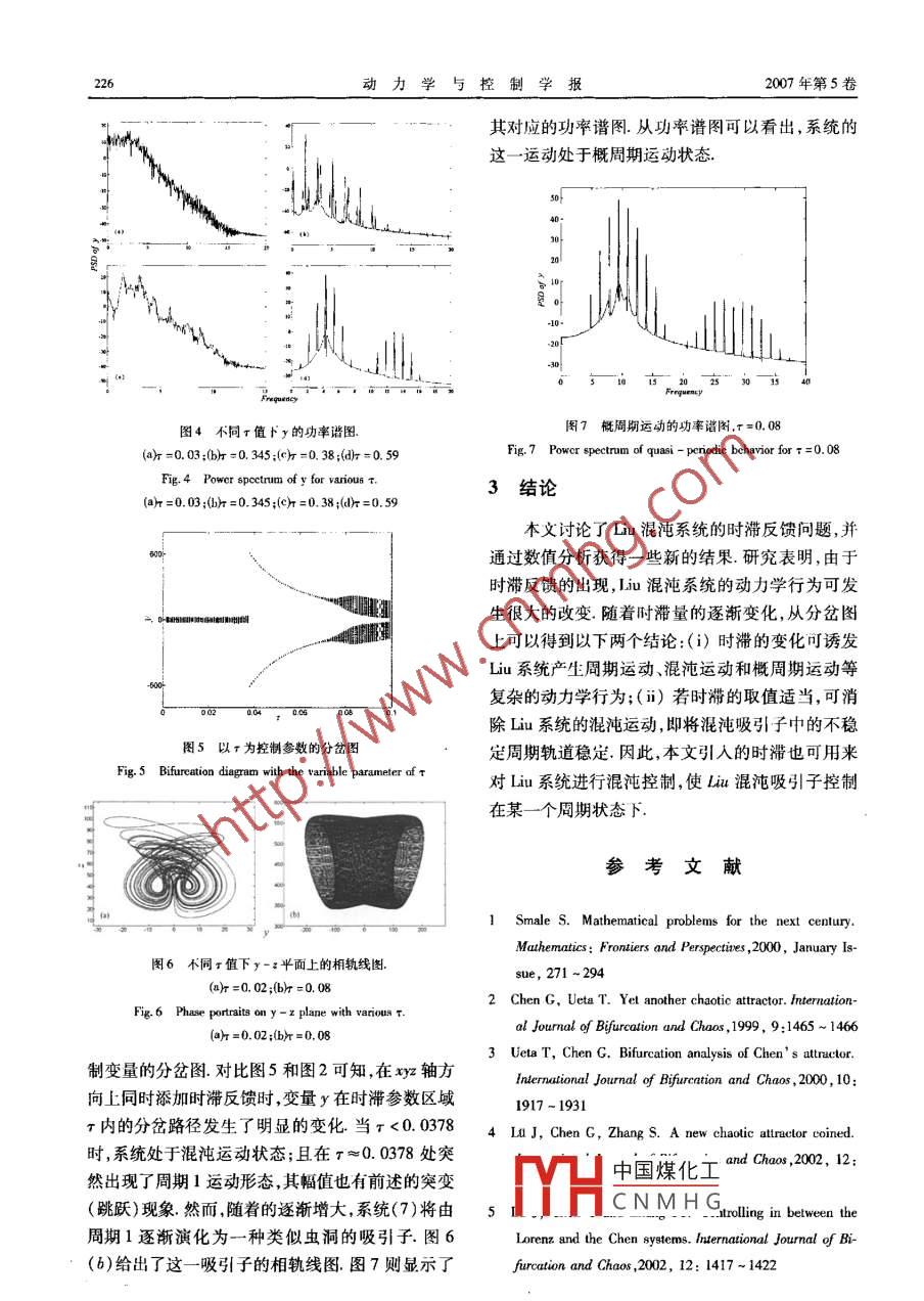 第5卷第3期2007年9動(dòng)力學(xué)與控制學(xué)報(bào)Vol. 5 No. 316726553/200705(3)2244JOURNAL OF DYNAMICS AND CONTROspe.2007時(shí)滯反饋Li系統(tǒng)的動(dòng)力學(xué)行為王琳倪樵黃玉盈(華中科技大學(xué)力學(xué)系,武漢430074)摘要研究了具有時(shí)滯反饋?lái)?xiàng)作用的1系統(tǒng).文中針對(duì)兩種典型的時(shí)滯反饋情形,著重分析了時(shí)滯參數(shù)對(duì)系統(tǒng)動(dòng)力學(xué)行為的影響研究結(jié)果表明,當(dāng)Liu系統(tǒng)存有時(shí)滯反饋時(shí),其動(dòng)力學(xué)行為將變得異常豐富;時(shí)滯參數(shù)的改變可引起系統(tǒng)復(fù)雜的動(dòng)力學(xué)演化此外,數(shù)值計(jì)算還發(fā)現(xiàn)了時(shí)滯Liu系統(tǒng)的蟲(chóng)洞吸引子關(guān)鍵詞時(shí)滯反饋,Liu系統(tǒng),混沌,吸引子統(tǒng)將處于混沌狀態(tài),其混沌吸引子如圖1所示.引言自上個(gè)世紀(jì)60年代以來(lái),人們對(duì)非線性系統(tǒng)的分岔與混沌動(dòng)力學(xué)作了大量的研究,并陸續(xù)發(fā)現(xiàn)些重要的現(xiàn)象和機(jī)理.多種類型的三維混沌系統(tǒng)受到國(guó)內(nèi)外學(xué)者的廣泛關(guān)注Sma在他的一篇論文中曾指出,二十一世紀(jì)將有18類極具挑戰(zhàn)性的數(shù)學(xué)。0°問(wèn)題,其中的14類問(wèn)題與 Lorenz吸引子相關(guān),故對(duì)圖1iu混池系統(tǒng)Lorenz系統(tǒng)和類 Lorenz系統(tǒng)的研究工作具有良好的應(yīng)用前景和深遠(yuǎn)的學(xué)術(shù)意義.近二卜年來(lái),國(guó)內(nèi)外學(xué)者發(fā)現(xiàn)∫一系列類 Lorenz系統(tǒng)針對(duì)這些非線性系本文采用線性DFC來(lái)研究時(shí)滯反饋對(duì)Ii系統(tǒng),主要研究了其分岔與混沌現(xiàn)象、混沌吸引子的拓統(tǒng)的影響此方法源于 Pyragas的理論為此,引入樸結(jié)構(gòu)、混沌同步和混沌控制等2最近,L等個(gè)線性的負(fù)反饋F()表示如下人提出一種新的類 Lorenz系統(tǒng)Iju系統(tǒng),該F(t)=-K[u(t-r)-u(t)]系統(tǒng)具有三維二次型的自治常微分方程組形式其中,7>0為時(shí)滯;K=[K1,K2,K3]>0是可調(diào)節(jié)本文針對(duì)Li系統(tǒng),試圖分析時(shí)滯反饋對(duì)該系的反饋增益向量:;a(4)為包含[x,y,2]的控制向統(tǒng)動(dòng)力學(xué)行為的影響由于時(shí)滯的引入,L系統(tǒng)的量若將時(shí)滯反饋F(2)添加到iu系統(tǒng)的方程右微分方程將改寫成含有時(shí)滯項(xiàng)的形式本文將通過(guò)端,就得到一個(gè)新的時(shí)滯反饋系統(tǒng)其方程如下數(shù)值方法研究這一時(shí)滯反饋系統(tǒng),并展示時(shí)滯Iiua(y-x)系統(tǒng)的復(fù)雜動(dòng)力學(xué)行為=lbx-kxz5-KTu(t-T)-u(t)], 24o(3)-cz +hx2含時(shí)滯反饋的Ii系統(tǒng)其中為初始時(shí)間.上式的時(shí)滯系統(tǒng)叮由一個(gè)初Li混沌系統(tǒng)由以下二維常微分力程組描述)始參量中(口)定解,4(1)滿足的關(guān)系為u(t=p(O, tE [to-T, to(1)若取x(L其中,a,b,c,h,h均為系統(tǒng)參數(shù).已有的研究表明,中國(guó)煤化工(5)當(dāng)參數(shù)a=10,b=40,c=2.5,k=1,h=4時(shí),I系CNMHG2006-11-30收到第1稿,20070420收到修改稿第3期王琳等:時(shí)滯反饋Lu系統(tǒng)的動(dòng)力學(xué)行為225則有系統(tǒng)處于典型的周期1運(yùn)動(dòng)若繼續(xù)增大τ的取值,系統(tǒng)將由混沌運(yùn)動(dòng)重新回到周期1狀態(tài)當(dāng)r=0.53時(shí),n(t-7)={y(t-r(6)系統(tǒng)出現(xiàn)了復(fù)雜的多周期形態(tài)(圖3(e)).值得指出的是若進(jìn)一步增大r的取值,系統(tǒng)出現(xiàn)了一種新的奇故式(3)也可寫成如下的形式怪吸引子這一奇怪吸引子還可以通過(guò)相軌線圖來(lái)展x=a(y-x)-k,(x(t-T)-x(t))示,其典型結(jié)果如圖3(所示從相軌線可以看到這y=bx-kxz-K,(y(t-T)-y(t))(7)奇懌吸引子與“蟲(chóng)洞”的形狀非常相似若分櫪它的z=-cz+hx'-K(z(L-T)-(t))功率譜圖(圖4(d),可以觀察到它的概周期特征2數(shù)值分析為了展示時(shí)滯反饋?lái)?xiàng)對(duì)Lu系統(tǒng)動(dòng)力學(xué)行為的影響,本文采用四階龍格-庫(kù)塔法對(duì)方程(7)進(jìn)行數(shù)值計(jì)算,并固定積分步長(zhǎng)為0.0025.數(shù)值仿真時(shí),系統(tǒng)(7)的所有參數(shù)都是固定的:a=10,b40,c=2.5,k=1和h=4,但時(shí)滯τ和反饋增益K12d04”一可根據(jù)需要發(fā)生改變.此外,系統(tǒng)初始值取為T