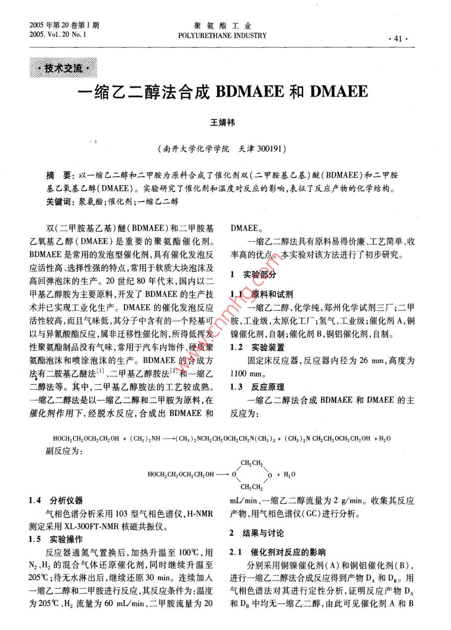 2005年第20卷第1期聚氨酯工業(yè)2005.Vo1.20no.1 POLYURETHANE INDUSTRY·41·技術(shù)交流一縮乙二醇法合成 BDMAEE和 DMAEE王婧(南開大學(xué)化學(xué)學(xué)院天津300191)摘要:以一縮乙二醇和二甲胺為原料合成了催化劑雙(二甲胺基乙基)醚( BDMAEE)和二甲胺基乙氧基乙醇(DMAEE)。實驗研究了催化劑和溫度對反應(yīng)的影響,表征了反應(yīng)產(chǎn)物的化學(xué)結(jié)構(gòu)。關(guān)鍵詞:聚氨酯;催化劑;一縮乙二醇雙(二甲胺基乙基)醚( BDMAEE)和二甲胺基 DMAEE。乙氧基乙醇( DMAEE)是重要的聚氨酯催化劑。一縮乙二醇法具有原料易得價廉、工藝簡單、收 BDMAEE是常用的發(fā)泡型催化劑,具有催化發(fā)泡反率高的優(yōu)點。本實驗對該方法進行了初步研究。應(yīng)活性高、選擇性強的特點,常用于軟質(zhì)大塊泡沫及1實驗部分高回彈泡沫的生產(chǎn)。20世紀(jì)80年代末,國內(nèi)以二甲基乙醇胺為主要原料,開發(fā) BDMAEE的生產(chǎn)技1.1原料和試劑術(shù)并已實現(xiàn)工業(yè)化生產(chǎn)。 DMAEE的催化發(fā)泡反應(yīng)一縮乙二醇,化學(xué)純,鄭州化學(xué)試劑三廠;二甲活性較高,而且氣味低,其分子中含有的一個羥基可胺,工業(yè)級,太原化工廠;氫氣,工業(yè)級;催化劑A,銅以與異氰酸酯反應(yīng),屬非遷移性催化劑,所得低揮發(fā)鎳催化劑,自制;催化劑B,銅鋁催化劑,自制。性聚氨酯制品沒有氣味,常用于汽車內(nèi)飾件硬質(zhì)聚1.2實驗裝置氨酯泡沫和噴涂泡沫的生產(chǎn)。 BDMAEE的合成方固定床反應(yīng)器,反應(yīng)器內(nèi)徑為26mm,高度為法有二胺基乙醚法、二甲基乙醇胺法2和一縮乙1100mm。二醇法等。其中,二甲基乙醇胺法的工藝較成熟1.3反應(yīng)原理一縮乙二醇法是以一縮乙二醇和二甲胺為原料,在一縮乙二醇法合成 BDMAEE和 DMAEE的主催化劑作用下,經(jīng)脫水反應(yīng),合成出 BDMAEE和反應(yīng)為: HOCH,CH,, CH,OH (CH, ); (CH, ) NCH, CH,0CH, CH N( CH)2+(CH) CH, CH,,+副反應(yīng)為: HOCH, CH,OCH, CH+1.4分析儀器mL/min、一縮乙二醇流量為2g/min。收集其反應(yīng)氣相色譜分析采用103型氣相色譜儀,H-NMR產(chǎn)物用氣相色譜儀(GC)進行分析。測定采用X-300T-NMR核磁共振儀。1.5實驗操作2結(jié)果與討論反應(yīng)器通氮氣置換后,加熱升溫至100℃,用2.1催化劑對反應(yīng)的影響N2、H2的混合氣體還原催化劑,同時繼續(xù)升溫至分別采用銅鎳催化劑(A)和銅鋁催化劑(B),205℃;待無水淋出后,繼續(xù)還原30min。連續(xù)加入進行一縮乙二醇法合成反應(yīng)得到產(chǎn)物DA和DB。用一縮乙二醇和二甲胺進行反應(yīng),其反應(yīng)條件為溫度氣相色譜法對其進行定性分析,證明反應(yīng)產(chǎn)物D為205℃、H2流量為60mL/min、二甲胺流量為20和DB中均無一縮乙二醇,由此可見催化劑A和B42聚氨酯工業(yè)第20卷對該合成反應(yīng)具有良好的催化效果。產(chǎn)物DA的氣應(yīng)生成的 DMAEE繼續(xù)與二甲胺反應(yīng)生成BD相色譜圖中 DMAEE和 BDMAEE的面積較小,而副MAEE,從而使 BDMAEE的收率提高。產(chǎn)物的面積較大;而產(chǎn)物DB的氣相色譜圖中2.3反應(yīng)產(chǎn)物的結(jié)構(gòu)表征 DMAEE和 BDMAEE的面積較大,副產(chǎn)物的面積較反應(yīng)產(chǎn)物D經(jīng)蒸餾分離后,對該餾分進行核小,面積的大小可直接反映其收率的高低。由氣相磁共振分析,其核磁共振譜圖見圖1色譜圖可知,以B作催化劑的產(chǎn)物DB中 BDMAEE的收率相對較高。實驗結(jié)果表明,銅鋁催化劑對生 NCH,成 BDMAEE的選擇性較高。 OCH2.2反應(yīng)溫度對反應(yīng)產(chǎn)物的影響 OH NCH2采用銅鋁催化劑,分別在205℃和145℃的反應(yīng)化學(xué)位移溫度下進行合成反應(yīng),得到反應(yīng)產(chǎn)物DB和D。以圖1反應(yīng)產(chǎn)物的核磁共振譜圖氣相色譜法進行定性分析,證明反應(yīng)產(chǎn)物DB和D將圖1與 DMAEE的核磁共振標(biāo)準(zhǔn)譜圖比較可的組成為 BDMAEE、 DMAEE、水、二甲胺和副產(chǎn)物,知:在化學(xué)位移8=3.79的峰1處對應(yīng)為NCH3,8=反應(yīng)產(chǎn)物中均無一縮乙二醇,說明一縮乙二醇的轉(zhuǎn)4.15的峰2處對應(yīng)為NCH2,8=6.00的峰3處對應(yīng)化率為100%以氣相色譜法對反應(yīng)產(chǎn)物DB和D為OCH2,8=7.80的峰4處對應(yīng)為OH。除了OH進行定量分析的結(jié)果見表1。外, BDMAEE也只含有NCH3、NCH2和OCH2基團,表1不同反應(yīng)溫度對反應(yīng)產(chǎn)物的影響其化學(xué)位移和 DMAEE的相同。這樣可以證明,反產(chǎn)物質(zhì)量分?jǐn)?shù)/%應(yīng)生成的主要產(chǎn)物為 DMAEE和 BDMAEE。產(chǎn)物組成145℃205℃3結(jié)論 DMAEE69.639.0 BDMAEE1027.5H20采用固定床反應(yīng)器,選擇銅鋁催化劑,以一縮乙17.19.0二醇和二甲胺為原料,可以合成 BDMAEE和 DMAEE。其所選用的催化劑和采用的反應(yīng)溫度對從表1可知,當(dāng)反應(yīng)溫度為145℃時,反應(yīng)產(chǎn)物產(chǎn)物的選擇性和收率有較大的影響。D中 BDMAEE的質(zhì)量分?jǐn)?shù)很低(1.2%), DMAEE的質(zhì)量分?jǐn)?shù)較高(69.6%),2種產(chǎn)物的總質(zhì)量分?jǐn)?shù)參考文獻為70.8%。當(dāng)反應(yīng)溫度提高至205℃時,反應(yīng)產(chǎn)物 Weber Process on the Preparation ofsDB中 DMAEE的質(zhì)量分?jǐn)?shù)降低了(39.0%)bd-ethanamine).up4940818(1990MAEE的質(zhì)量分?jǐn)?shù)提高了(27.5%),2種產(chǎn)物的總2 Poppel. Process for Producing Bis N-dialkylamino alkyl Ethers質(zhì)量分?jǐn)?shù)為65.5%。上述實驗結(ji