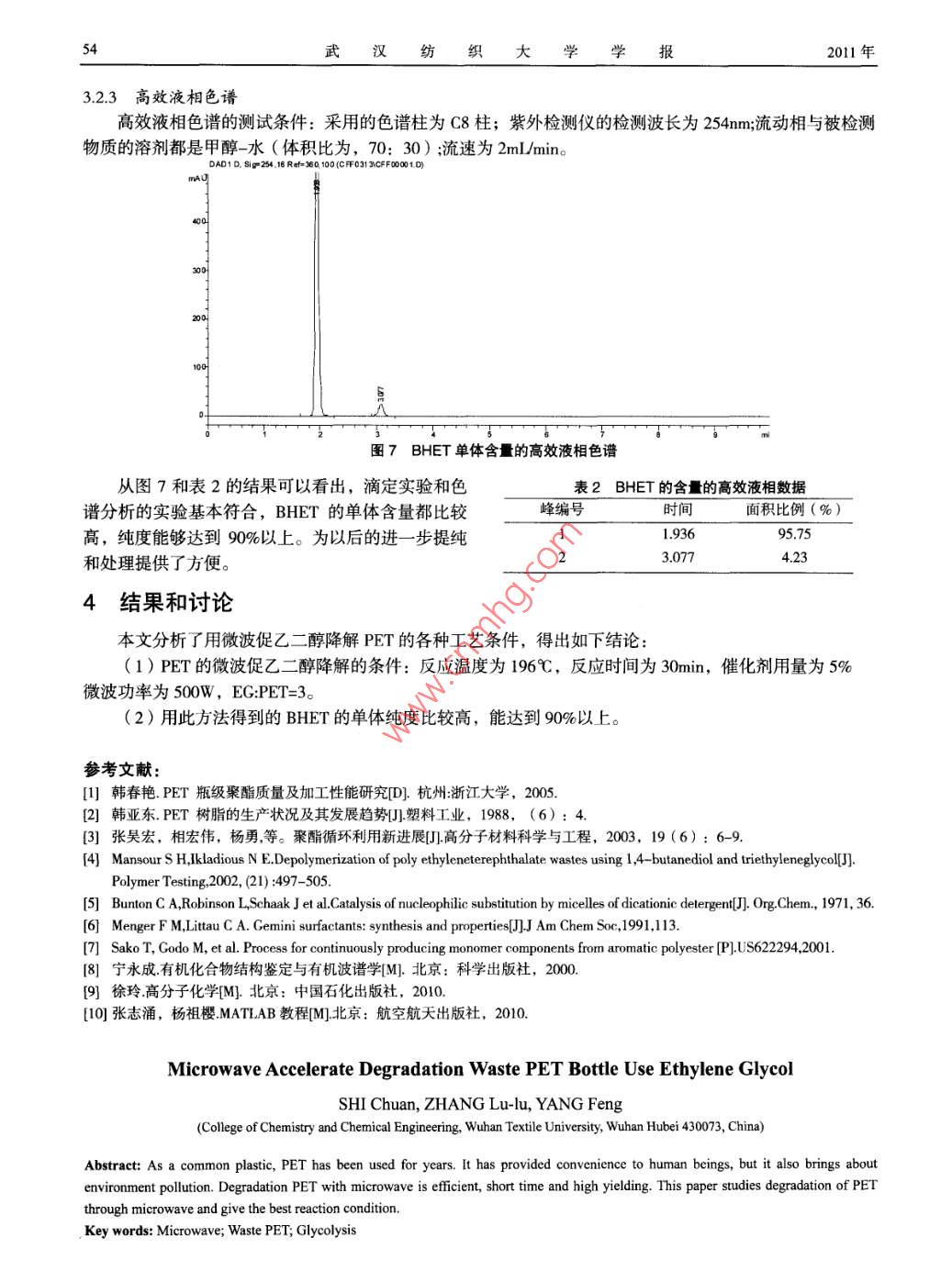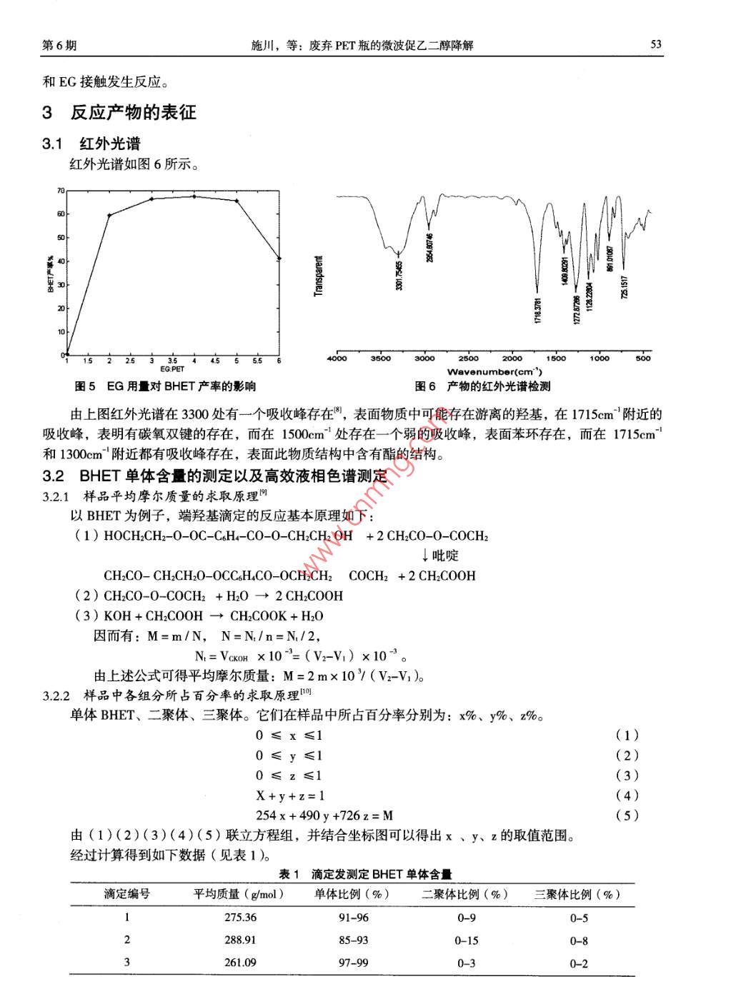第24卷第6期武漢紡織大學(xué)學(xué)報VoL 24 No 62011年12月JOURNAL OF WUHAN TEXTILE UNIVERSITYDec.2011廢棄PET瓶的微波促乙二醇降解施川,張露露,楊鋒(武漢紡織大學(xué)化學(xué)與化工學(xué)院,湖北武漢430073)摘要:PET做為一種常用的塑料制品,已經(jīng)使用了很多年,在為人類生產(chǎn)生活提供便利的同時也產(chǎn)生了環(huán)境污染。通過徼波降解PET具有效率髙、時間短、產(chǎn)率髙的特點(diǎn),本文通過微波研究乙二醇的降解,并得出最佳反應(yīng)條關(guān)鍵詞:微波;廢棄PET;醇解中圖分類號:TQ3179文獻(xiàn)標(biāo)識碼:A文章編號:1009-51602011)06-0051-04聚對苯二甲酸乙二醇酯(PET)是由對苯二甲酸和乙二醇酯聚合的產(chǎn)物。由于其具有優(yōu)良的性能,廣泛的用于紡織、餐飲、電器等產(chǎn)業(yè)中。由于人們生活水平不斷提高,對PT的需求也越來越大,PET的使用呈逐漸上升的趨勢。截止2005年,全世界的PET中產(chǎn)量達(dá)到了4091kt。我國PET生產(chǎn)能力和產(chǎn)量也大幅度增長,截止2005年已達(dá)到12530kt。PET的應(yīng)用范圍也在逐漸擴(kuò)展,越來越多的取代傳統(tǒng)的玻璃、陶瓷、鋼鐵等材料。廢棄的PET雖說對人體無毒無害,但是其在自然界中降解周期太長,再加上大量的使用,對環(huán)境造成了巨大的破壞和資源浪費(fèi)。廢棄PET的回收和再利用受到重視,一般的都是采取較為簡單的方法:融化后再吹瓶、填埋或者直接燃燒。對廢棄PET的處理化學(xué)方法有明顯的優(yōu)勢。而且比物理方法有經(jīng)濟(jì)上的優(yōu)勢。常用的方法有:水解法、醇解法。但是水解法要求溫度和和壓力比較高,而且一般催化劑都是強(qiáng)酸或者強(qiáng)堿,對環(huán)境會進(jìn)一步污染。醇解法的反應(yīng)條件較水解法溫和,但是現(xiàn)在用乙二醇(EG)降解的產(chǎn)物對本二甲酸乙二醇酯(BHET)難以得到利用,一般都是先經(jīng)過水解生產(chǎn)對苯二甲酸(TPA)再加以利用。1實(shí)驗(yàn)部分11原料及儀器廢棄PET瓶(武漢可口可樂飲料有限公司生產(chǎn)的 Ice dew冰露飲用純凈水瓶),清洗,破碎成1cm*1cm的片狀物,干燥后使用。乙二醇,分析醇,國藥集團(tuán)化學(xué)試劑有限公司醋酸鋅,分析純,國藥集團(tuán)化學(xué)試劑有限公司上海新儀MAS-I微波反應(yīng)器。美國尼高力公司 mpact420傅立葉紅外光譜儀。AGILENT1100高效液相色譜儀。12實(shí)驗(yàn)方法將剪好的PET碎片放入圓底燒瓶中,加入乙二醇及乙酸鋅,開始反應(yīng)。反應(yīng)完后將燒瓶取出,加人沸水,抽濾。將濾液靜置24小時后再過濾,得到BHET的產(chǎn)物。反應(yīng)方程式如下HOCH2CH,OH一HoH2CH2C-oCo一cHCH2H武漢紡織大學(xué)學(xué)報2011年2結(jié)果與討論21反應(yīng)溫度對降解產(chǎn)率的影響PET和EG的比例為13,催化劑用量為3%(對PET重),微波功率為500W,反應(yīng)時間為40min。結(jié)果如圖1所示反應(yīng)祖度(℃)反應(yīng)時間(mn)圖1反應(yīng)溫度對BHET產(chǎn)率的影響圖2反應(yīng)時間對BHET產(chǎn)率的影響從圖1可以看出,溫度對PET的醇解影響很大,基本在乙二醇的沸點(diǎn)處才有較好的BHET產(chǎn)率22反應(yīng)時間對BHET產(chǎn)率的影響PET和EG的比例為13,催化劑用量為3%(對PET重),微波功率為500W,反應(yīng)溫度為196℃。結(jié)果如下圖2所示。從圖2可以看出,反應(yīng)時間對PET降解影響也相當(dāng)大,反應(yīng)在30min以下時,PET基本不降解,但反應(yīng)到了30min以上時繼續(xù)延長反應(yīng)時間時,產(chǎn)率也沒有很大的變化。23催化劑用量對BHET產(chǎn)率的影響PET和EG的比例為1:3,微波功率為500W,反應(yīng)溫度為196℃,反應(yīng)時間為30mn。結(jié)果如圖3所示。催化劑用量%(對P)圖3催化劑用量對BHET差率的影響圖4微波功率對BHET產(chǎn)率的影響從圖3可以看出,催化劑用量在5%時BHET的產(chǎn)率達(dá)到最高值,加入更多的催化劑并不能使產(chǎn)率進(jìn)一步提高。24反應(yīng)功率對BHET產(chǎn)率的影響PET和EG的比例為1:3,反應(yīng)溫度為196℃,反應(yīng)時間為30mn,催化劑用量為5%。反應(yīng)結(jié)果如圖4所示。從圖4可知,反應(yīng)功率在500w時產(chǎn)率達(dá)到峰值,繼續(xù)加大反應(yīng)的功率,反而使產(chǎn)率變的更低。2.5EG用量對BHET產(chǎn)率的影響反應(yīng)溫度為196℃,反應(yīng)時間為30min,催化劑用量為5%,微波功率為500W。反應(yīng)結(jié)果如圖5所示。從圖5可以看出,EG:PET=3時,BHET產(chǎn)率達(dá)到最高,繼續(xù)增加反應(yīng)的比例,并沒有能使BHET的產(chǎn)率更高,而當(dāng)EG:PET=1時,之所以是基本沒有反應(yīng),是因?yàn)镋G太少,只能淹沒少部分BHET,PET不能第6期施川,等:廢棄PET瓶的微波促乙二醇降解和EG接觸發(fā)生反應(yīng)。3反應(yīng)產(chǎn)物的表征3.1紅外光譜紅外光譜如圖6所示。3500EG PETWavenumber(cm圖5EG用量對BHET產(chǎn)率的影響圖6產(chǎn)物的紅外光譜檢測由上圖紅外光譜在330處有一個吸收峰存在M,表面物質(zhì)中可能存在游離的羥基,在1715cm附近的吸收峰,表明有碳氧雙鍵的存在,而在1500cm處存在一個弱的吸收峰,表面苯環(huán)存在,而在1715cm和1300cm附近都有吸收峰存在,表面此物質(zhì)結(jié)構(gòu)中含有酯的結(jié)構(gòu)。32BHET單體含量的測定以及高效液相色譜測定3.21樣品平均摩爾質(zhì)量的求取原理以BHET為例子,端羥基滴定的反應(yīng)基本原理如下(1)HOCH CH2-0-OC-C6H4-C0-0-CH2 CH2 OH +2 CH2 C0-0-C