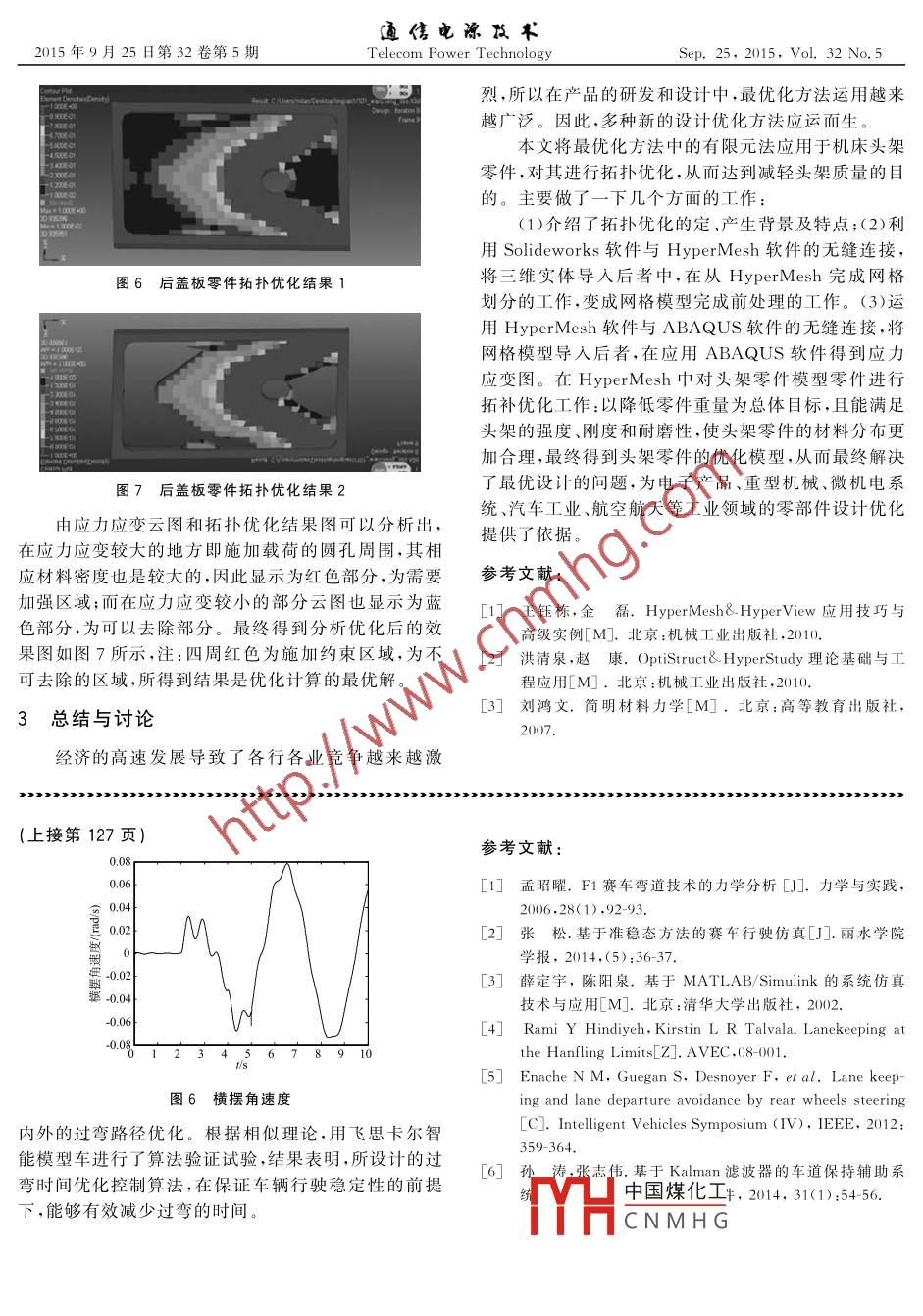 通信電源技術2015年9月25日第32卷第5期Telecom Power TechnologySep. 25, 2015,Vol. 32 No. 5.文章編號:1009 3664(2015)05-0128-03設計應用利用拓撲優(yōu)化法解決設計優(yōu)化問題.黃自豪,陳勁杰,田紹興(_上海理工大學機械工程學院,上海200093)摘要:文中結合有限元方法中的拓撲優(yōu)化,在零件結構特性分析的基礎上,考慮裝配約束,對零部件進行優(yōu)化設計。首先利用SolidWorks對零件進行三維建模,然后利用HyperMesh、ABAQUS .Optistruet等軟件完成拓撲優(yōu)化后得到最終結果,即為最優(yōu)解。經過優(yōu)化各部分結構更加趨于合理。分析結果表明,約束和載荷條件相同的情況下,改進其結構尺寸,可以有效地調高零件強度、剛度,與此同時,大大減輕了零件的重量,提高其使用能力,最終得到符合實際裝配需要的設計。關鍵詞:最優(yōu)解;拓撲優(yōu)化;結構分析中圖分類號: TH113文獻標識碼: AUsing Topology Optimization Method to Solve Design Optimization ProblemsHUANG Zi-hao, CHEN Jingjie, TIAN Shao- xing(School of Mechanical Engineering, University of Shanghai for Science and Technology,Shanghai 200093 ,China)Abstract: In this paper, to optimize the design of parts according to the topology optimization of the finite elementmethod, based on analysis of characteristics of the structural components, considering the assembly constraints. The firstuse SolidWorks for three dimensional modeling of parts, and then complete the topology optimization to get the final resultby HyperMesh, ABAQUS, Optistruct and other software, which is the optimal solution. The various parts of the struc-ture will be more reasonable, analysis results show that, under the same conditions of load and constraint, improve itsstructure and size, can effectively increase the strength, stiffness, at the same time, greatly reducing the weight of parts,improve its service ability finally can meet the design needs of the actual assembly.Key words: the optimal solution; topology; optimization analysis減那些不必要的結構元素,直至最終得到-一個最優(yōu)化1拓撲優(yōu)化的拓撲結構形式。進化原理的基本思想是適者生存的拓撲優(yōu)化技術是結構優(yōu)化技術中非常有創(chuàng)新性,生物進化原理的基本思想,即把適者生存的生物進化有前景的一項技術。具體是指:在給定空間內找到最論思想引人結構拓撲優(yōu)化,它通過模擬適者生存、物競佳的材料分布或者傳力的路徑,在滿足各種性能的前天擇、優(yōu)勝劣汰等自然機理來獲得最優(yōu)的拓撲結構。提下可以得到重量最輕的設計,從而得到最優(yōu)化方法相比結構優(yōu)化,拓撲優(yōu)化具有不需要人工定義優(yōu)中需求的最優(yōu)解。化參數,而是自動將材料分布當著優(yōu)化參數,在應用中產品設計分為三個層次:結構尺寸優(yōu)化。形狀優(yōu)我們只需要給出結構的參數(材料特性、模型、載荷等)化和拓撲優(yōu)化,尺寸優(yōu)化與形狀優(yōu)化已經得到充分的和要省去的材料百分比的特點。在進行拓撲優(yōu)化分析發(fā)展,但它們卻存在著不能變更結構拓撲的缺陷,在這時,同其他分析一樣定義幾何結構、有限元模型、載荷樣的背景下,人們開始研究拓撲優(yōu)化。拓撲優(yōu)化的基與邊界條件等,然后定義優(yōu)化的目標函數,從定義約束本思想是將尋求結構的最優(yōu)拓撲問題轉化為在給定的參數。拓撲優(yōu)化的目標即目標函數是在滿足給定的實設計區(qū)域內尋求最有材料分布的問題,拓撲優(yōu)化的基際約束條件下(如體積減小)需要極大或極小化的參.本原理是在滿足結構體積縮減量的前提下使結構柔度數,通常采用的目標函數是結構柔度能量極小化和基最小,極小化的柔度換言之就是結構的最大剛度。尋頻最大等。目前常使用的拓撲優(yōu)化設計方法可以分為求一個最佳的拓撲結構形式有兩種基本意愿:一種是兩大類:退化法和進化法。退化法即傳統的拓撲優(yōu)化退化原理,另-種是進化原理。退化原理的基本思想方法,一般通過求目標函數導數的零點或- -系列迭代是在優(yōu)化前將結構所有桿單元或所有材料都加上,然計算過中國煤化I!前常用于拓撲優(yōu)化的后構造適當的優(yōu)化模型,通過一定的優(yōu)化方法逐步刪退化法法、變密度法等,需要強調的心平以兒心兒義山漢法以機床頭架為例來分THC NMH G,析優(yōu)化。收稿日期:2015-05-11作者簡介:黃自豪(1991-),男,安徽馬鞍山市含山縣人,在讀碩變密度法的基本算法及相關解釋:士研究生,主要研究方向為機器人控制學、機械設計與優(yōu)化。通信電源技術黃自豪,等:利用拓撲優(yōu)化法Telecom Power Technology2015年9月25日第32卷第5期解決設計優(yōu)化問題Sep. 25, 2015,Vol, 32 No.5(mncC(x)= Z[E[ Emn+p(i-xjs4E ]u~}"TKJ{U;}i=1 lV= 2Vix;≤fV。●式中,V為優(yōu)化后的結構體積;V。為結構的初始體積;f為體積約束參數;K、C(x)、C'(x)分別為RAMP模型的剛度矩陣、柔度函數和靈敏度函數。在目標函數以及約束條件中,x是設計變量,N為圖2后蓋板單 元網格劃分圖劃分的單元數目,C為結構的柔度,C'為結構的靈敏度,[K]為結構的總剛度矩陣,[K;]為第i個單元的單元剛度矩陣,{U}為結構的位移向量,{U;}為第i個單元的位移向量,{F}為載荷向量。在RAMP模型中,x和p是每個結構單元的彈性模量的控制參數。當x取不同值的時侯,中間密度單元不同會導致單元彈性模量參數有逼近0或E的趨勢。2拓撲優(yōu)化實例解決優(yōu)化設計問題圖3后蓋板零件網格質量檢測圖下面將以機床頭