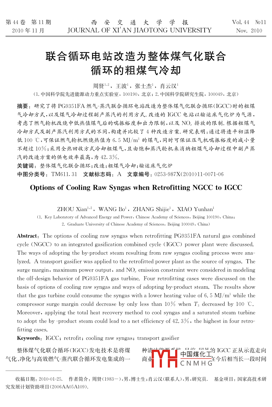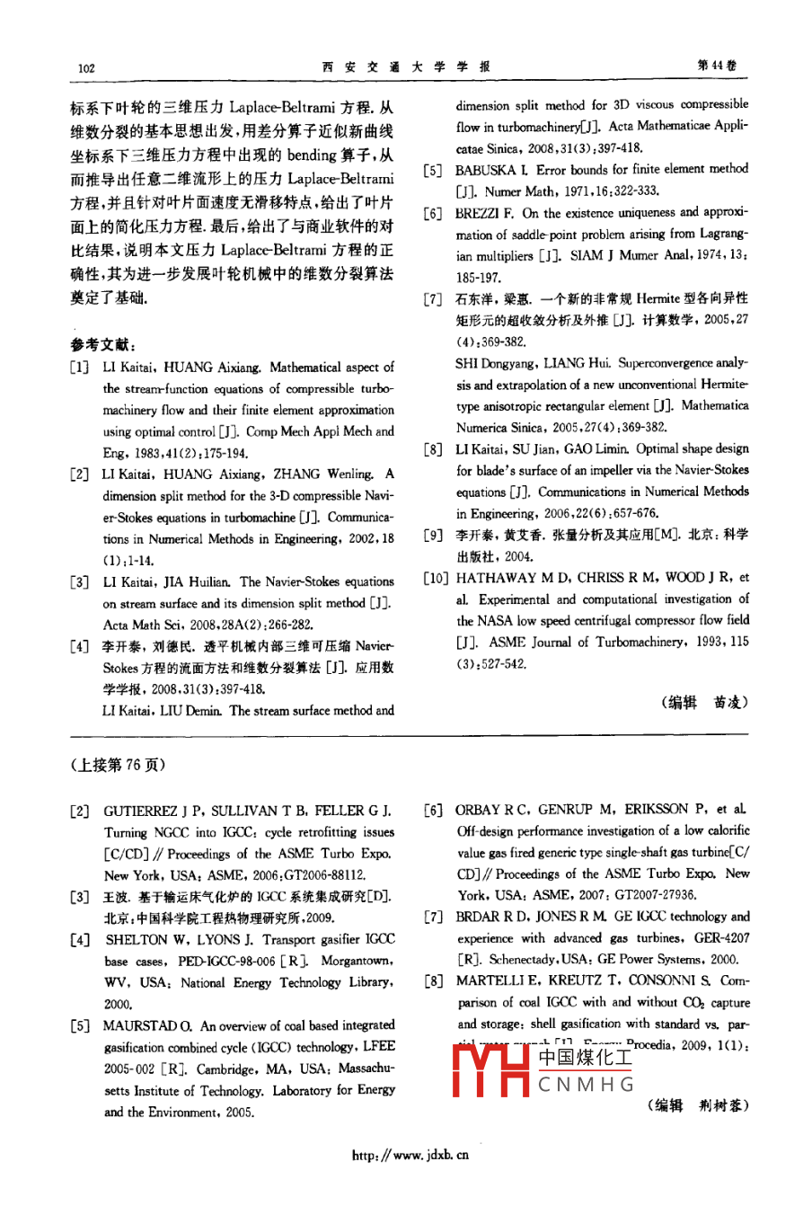 第44卷第11期西.安交通大學(xué)學(xué)報(bào)Vol.44 No1l2010年11月JOURNAL OF XI' AN JIAOTONG UNIVERSITYNov. 2010聯(lián)合循環(huán)電站改造為整體煤氣化聯(lián)合循環(huán)的粗煤氣冷卻周賢2,王波',張士杰,肖云漢'(1.中國(guó)科學(xué)院先進(jìn)能源動(dòng)力重點(diǎn)實(shí)驗(yàn)室,100190, 北京; 2. 中國(guó)科學(xué)院研究生院,100049, 北京)摘要:研究了將PG9351FA燃?xì)庹羝?lián)合循環(huán)電站改造為整體煤氣化聯(lián)合循環(huán)(IGCC)時(shí)的粗煤氣冷卻方式,以及煤氣冷卻過程副產(chǎn)蒸汽的利用方式.改造的IGCC 電站以輸運(yùn)床氣化爐為氣源,考慮了燃?xì)廨啓C(jī)改燒中低熱值煤氣后的喘振裕度和出力限制,以及NO,排放的限制.根據(jù)粗煤氣冷卻方式及副產(chǎn)蒸汽利用方式的不同,構(gòu)建并比較了4種改造方案.研究表明:通過將透平初溫降低100 C,可保證燃?xì)廨啓C(jī)燃燒熱值為6.5 MJ/m3的煤氣,同時(shí)可保證壓氣機(jī)喘振裕度的減小量不超過10%;采用全熱回收方式冷卻粗煤氣,且由飽和蒸汽輪機(jī)來消納粗煤氣冷卻過程中副產(chǎn)蒸汽的改造方案的供電效率最高,為42. 3%.關(guān)鍵詞:整體煤氣化聯(lián)合循環(huán);改造;粗煤氣冷卻;輸運(yùn)床氣化爐中圖分類號(hào): TM611.31文獻(xiàn)標(biāo)志碼: A文 章編號(hào): 0253-987X(2010)11-0071-06Options of Cooling Raw Syngas when Retrofitting NGCC to IGCCZHOU Xianl2,WANG Bo',ZHANG Shijie' ,XIAO Y unhan'(1. Key Laboratory of Advanced Energy and Power, Chinese Academy of Sciences, Beiing 100190, China; .2. Graduate University of Chinese Academy of Sciences, Beiing 100049, China)Abstract: The options of cooling raw syngas when retrofitting PG9351FA natural gas combinedcycle (NGCC) to an integrated gasification combined cycle ( IGCC) power plant were discussed.The ways of adopting the by product steam resulting from raw syngas cooling process were ana-lyzed. A transport gasifier was applied to the retrofitted power plant as the source of syngas. Thesurge margin, maximum power output, and NO, emission constraint were considered in modelingthe off-design behavior of PG9351FA gas turbine. Four retrofitting cases were discussed on thebasis of options of cooling raw syngas and ways of adopting by product steam. The results showthat the gas turbine could consume the syngas with a lower heating value of 6. 5 M]/m3 while thecompressor surge margin could decrease by only less than 10% when T3 decreased by 100 C.Moreover, applying the total heat recovery method to cool syngas and a saturated steam turbineto adopt the by -product steam could lead to a net efficiency of 42. 3%, the highest in four retro-fitting cases.Keywords: IGCC; retrofit; cooling raw syngas; transport gasifier整體煤氣化聯(lián)合循環(huán)(IGCC)發(fā)電技術(shù)是將煤種滑?4的IGCC正從示范走向氣化、凈化與高效燃?xì)庹羝?lián)合循環(huán)發(fā)電集成的一商」中國(guó)煤化工生今后相當(dāng)長(zhǎng)--段時(shí)間TYHCNMHG'收稿日期: 2010-01-25. 作者簡(jiǎn)介: 周賢(1983- ),男,博士生;肖云漢(聯(lián)系人),男,研究員、基 金項(xiàng)目:國(guó)家高技術(shù)研究發(fā)展計(jì)劃資助項(xiàng)目(2006AA05A109).7西安交通大學(xué)學(xué)報(bào)第44卷內(nèi),大規(guī)模發(fā)展IGCC電站也是我國(guó)的必然選擇.為蒸汽的利用方式.振興重型燃?xì)廨啓C(jī)制造業(yè),我國(guó)在“十五”期間實(shí)施1流程簡(jiǎn)述及方案構(gòu)建以市場(chǎng)換技術(shù)的重大舉措,通過打捆招標(biāo)引進(jìn)了總?cè)萘吭?000萬kW左右的燃?xì)庹羝?lián)合循環(huán)發(fā)GE公司生產(chǎn)的PG9351FA燃?xì)廨啓C(jī)的設(shè)計(jì)發(fā)電機(jī)組,但由于天然氣供應(yīng)不足,大部分發(fā)電機(jī)組處電功率為255.6MW,壓比為15.3,排煙溫度為608于停產(chǎn)或半停產(chǎn)狀態(tài).鑒于我國(guó)以煤為基礎(chǔ)的能源C,簡(jiǎn)單循環(huán)發(fā)電效率為36.9%,聯(lián)合循環(huán)余熱鍋結(jié)構(gòu),將這些天然氣聯(lián)合循環(huán)發(fā)電機(jī)組改造為燃用爐采用三壓再熱汽水循環(huán)系統(tǒng),聯(lián)合循環(huán)供電效率煤制燃料氣的IGCC發(fā)電系統(tǒng),既符合我國(guó)國(guó)情又為56. 19%[3].避免了資源的閑置,同時(shí)為解決IGCC發(fā)電技術(shù)商采用輸運(yùn)床氣化爐的新建IGCC系統(tǒng)的氣化島業(yè)化早期投資較大的問題提供了一條途徑,具有重流程如圖1所示4.氣化爐的操作壓力為3 MPa,操要的現(xiàn)實(shí)意義.作溫度為1 050 C,給煤與氧氣和水蒸氣在氣化爐輸運(yùn)床氣化爐是新- -代的氣化技術(shù),其基本原中反應(yīng)產(chǎn)生高溫粗煤氣,氣化爐內(nèi)的碳轉(zhuǎn)化率為理是基于循環(huán)流化床的形式,采用爐內(nèi)高循環(huán)倍率、95%.氣化爐中加人石灰石,進(jìn)行爐內(nèi)脫硫,達(dá)到脫高氣速和高濃度的密相輸運(yùn)條件,實(shí)現(xiàn)氣化爐內(nèi)高除部分硫分的目的.高溫粗煤氣經(jīng)煤氣余熱鍋爐降效的氣固混合、傳熱傳質(zhì)、化學(xué)反應(yīng)過程印,從而最.溫后除塵.除塵后的煤氣依次經(jīng)過預(yù)熱潔凈煤氣、加終實(shí)現(xiàn)較高的碳轉(zhuǎn)化率和氣化效率.輸運(yùn)床氣化技熱濕化器中所需熱水和加熱聯(lián)合循環(huán)凝結(jié)水的過程術(shù)具有適應(yīng)高硫、高灰、高灰熔點(diǎn)煤種的特點(diǎn),同時(shí)后,冷卻至38C,再經(jīng)過NHD脫硫工藝除去含硫具有優(yōu)良的負(fù)荷調(diào)節(jié)能力.目前,國(guó)內(nèi)外都開