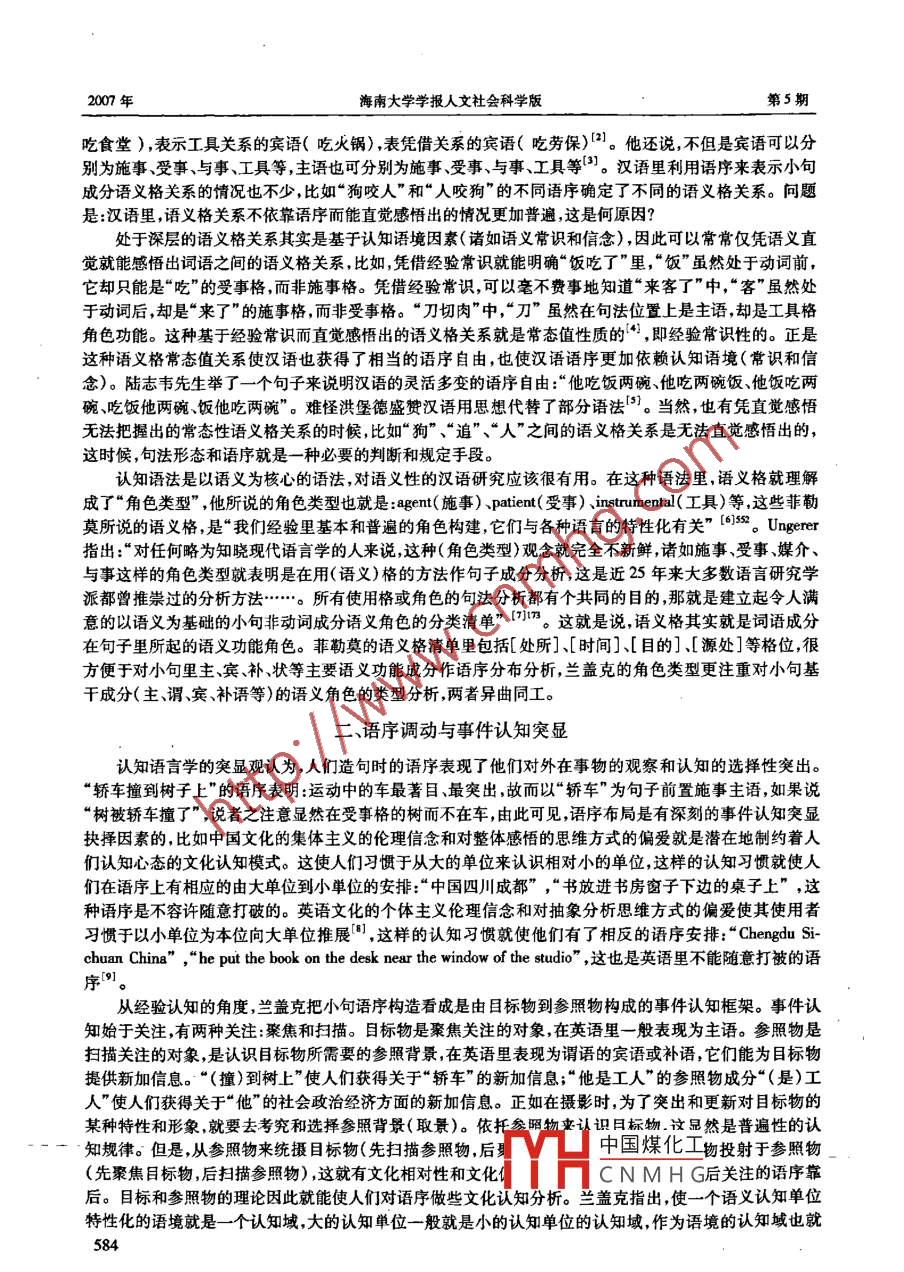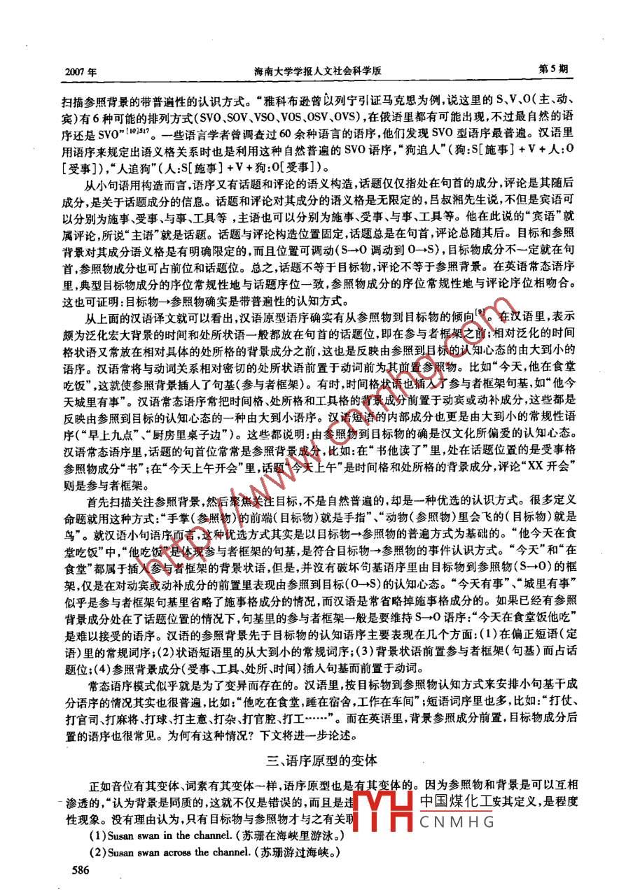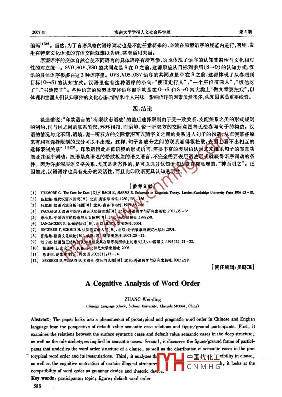 2007年10月海南大學(xué)學(xué)報(bào)人文社會科學(xué)版Oct. 2007第25卷第5期Humanities & Social Sciences Jourmal of Hainan UniversityVol. 25 No.5語序的認(rèn)知分析張維鼎(四川大學(xué)外語學(xué)院,四川成都610064)[摘要]從常態(tài)值語義格關(guān)系和目標(biāo)物與參照物的認(rèn)知角度,討論漢語英語小句語序的原型和變體現(xiàn)象,指出了表層句法格與深層語義格常態(tài)值的關(guān)系和語義格的角色類型的關(guān)系,說明潛存于小句語序構(gòu)造的目標(biāo)物與參照物的參與者框架的異同,以及變異所引起的語序調(diào)動現(xiàn)象,分析和描述原型語序及其變體、語義格與小句里的語序靈活性和固定性的關(guān)系,以及漢語的一-些所謂的無理構(gòu)造的認(rèn)知理 據(jù),從認(rèn)知語境的角度分析語序在語法手段和修辭手段方面的兼容性。[關(guān)鍵詞]參與者;話題;目標(biāo)物;常態(tài)語序[中圖分類號]H 311[文獻(xiàn)標(biāo)識碼]A[文章編號]1004 - 1710(2007)05 -0583 -06語序的研究一直是句法研究的重要課題,只要遣詞造句就存在詞語誰先誰后的問題。20世紀(jì)60~70年代,美國語言學(xué)家菲勒莫提出了語義格的觀點(diǎn),并且以這種觀點(diǎn)為核心形成了他的格語法。格語法所說的施事受事、工具、處所、目的等語義格的實(shí)質(zhì)是詞與詞結(jié)合的語義句法關(guān)系,‘我相信,如果人們研究了所有的語言就會發(fā)現(xiàn),某些概念(之間)的語義關(guān)系是反復(fù)出現(xiàn)又為各種語言所共有的,兒童生來就有的一-些范疇。(語義)格的提出就是基于這樣的信念....它們是潛藏于深層結(jié)構(gòu)中的語義句法關(guān)系””。格語法主要是討論小句里非動詞成分以動詞為中心的橫組合的語義句法關(guān)系,這是句子成分相結(jié)合的最重要的關(guān)系,這種關(guān)系存在于從詞匯到小句的語言構(gòu)造里?!皞?和“心”之間若無語義格的關(guān)系就僅僅是兩個孤立的單字,如果這兩個單字之間有了這樣的語義格關(guān)系:傷: +(心:[受事]) ,這兩個單字詞就能構(gòu)成“傷心”這樣語序的詞。語義格關(guān)系也存在于短語成分之間,“坐飛機(jī)”里“飛機(jī)”是“坐”的處所格。語義格關(guān)系也可以存在于小句成分(短語)之間,“他兒子今天有急事”里存在這樣的語義格關(guān)系:有+(他幾子[施事]) +(急事[受事]) +(今天[處所])。語序還有為了特定命題意義和話語目的而規(guī)定語義格關(guān)系的功能。比如:“狗咬人”和“人咬狗"兩種語序規(guī)定了兩類很不同的語義格關(guān)系,從而傳達(dá)了很不同的命題意義。由此可見,語義格關(guān)系與語序及其表意功能是有著密切關(guān)系的。小句主要非動詞成分都是有語義格身份的,成分的語序調(diào)動意味著語義格成分在分布位置上的調(diào)動。一、深層語義格和小句成分的語序印歐語傳統(tǒng)語法里的詞匯形態(tài)“主格"、“賓格”、“所有格”、“處所格”“與事格”、“工具格”等,僅僅是處于語言表層句法構(gòu)造的句法格。表層句法格是處于深層的語義格的一-種語法表現(xiàn)形式。深層語義格是語言普遍存在的,表層句法格則是語言相對性的。不同的語言各有不同的表層句法形式來體現(xiàn)這些普遍存在的語義格。在印歐語里,施事格就有與之對應(yīng)的表層句法的主格形式,受事格和與事格也有與之對應(yīng)的表層句法上的賓格形式,工具格和處所格在- -些形態(tài) 豐富的印歐語言里也常有與之對應(yīng)的表層句法格形式。這些語言通過詞匯形態(tài)來體現(xiàn)語義格,使這些語言有了相當(dāng)?shù)恼Z序自由。有些語言則是借助其他語法形式,比如用虛詞和語序來體現(xiàn)語義格關(guān)系。漢語里沒有詞形變化,因此就缺乏用語法形態(tài)的表層格來表現(xiàn)深層語義格。這并不意味漢語的深層構(gòu)造里面就沒有語義格。呂叔湘先生指出,“吃”后面除了表受事關(guān)系的賓語外,還可帶表非受事關(guān)系的賓語.如:砉外所關(guān)系的賓語(中國煤化工[收稿日期] 2006-12 -06YHCNMHG[作者簡介]張維鼎(1949 -),男,四川萬州人,四川大學(xué)外語學(xué)院教授,主要從事認(rèn)知語言學(xué)和文化語言學(xué)的.研究。5832007年海南大學(xué)學(xué)報(bào)人文社會科學(xué)版第5期吃食堂),表示工具關(guān)系的賓語(吃火鍋) ,表憑借關(guān)系的賓語(吃勞保)2]。他還說,不但是賓語可以分別為施事、受事、與事、I具等,主語也可分別為施事受事、與事、工具等[3)。漢語里利用語序來表示小句成分語,義格關(guān)系的情況也不少,比如“狗咬人”和“人咬狗"的不同語序確定了不同的語義格關(guān)系。問題是:漢語里,語義格關(guān)系不依靠語序而能直覺感悟出的情況更加普遍,這是何原因?處于深層的語義格關(guān)系其實(shí)是基于認(rèn)知語境因素(諸如語義常識和信念) ,因此可以常常僅憑語義直覺就能感悟出詞語之間的語義格關(guān)系,比如,憑借經(jīng)驗(yàn)常識就能明確“飯吃了”里,“飯”雖然處于動詞前,它卻只能是“吃”的受事格,而非施事格。憑借經(jīng)驗(yàn)常識,可以毫不費(fèi)事地知道“來客了”中,“客”雖然處于動詞后,卻是“來了”的施事格,而非受事格?!暗肚腥狻敝?,“刀”雖然在句法位置上是主語,卻是工具格角色功能。這