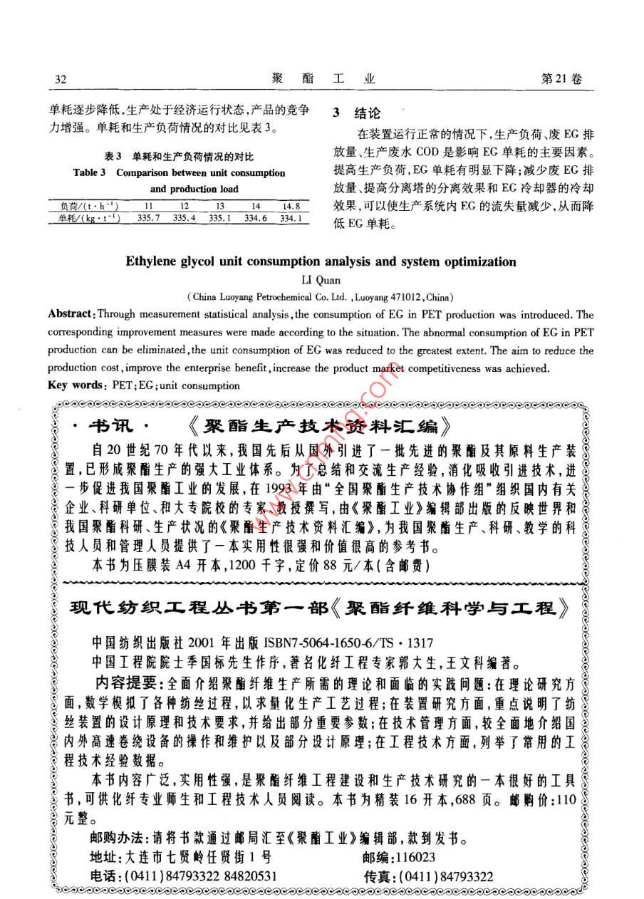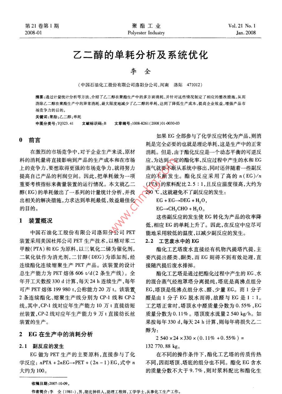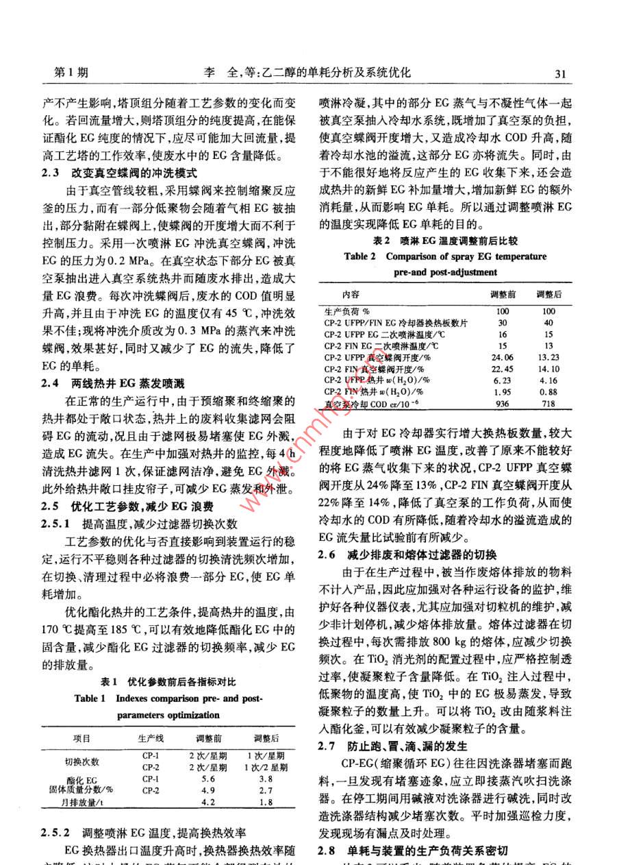 第21卷第I期聚酯工業(yè)Vol 21 No, I200801Polyester IndustryJan.2008乙二醇的單耗分析及系統(tǒng)優(yōu)化李全(中國石油化工股份有限公司洛陽分公司,河南洛陽471012)摘要:通過計量統(tǒng)計分析等方法介紹了乙二醇在聚酯生產(chǎn)中的多方面消耗,并針對這些情況制定了相應(yīng)的整改措施,從而消除乙二醇在聚酯生產(chǎn)中的異常消耗,最大限度地減少了乙二醇的單耗,達到了降低生產(chǎn)成本,提高企業(yè)效益,增強產(chǎn)品市場競爭力的目的關(guān)鍵詞:聚酯;乙二醇;單耗中圖分類號:TQ323.41文獻標識碼:B文章編號:10088261(2008)010030030前言如果EG全部參與了化學反應(yīng)轉(zhuǎn)化為產(chǎn)品,則消耗是完全必要的也就是理論單耗,這是生產(chǎn)中的正常在激烈的市場競爭中,對于企業(yè)生產(chǎn)來說,原材消耗。但是,由于酯化反應(yīng)是一個動態(tài)平衡的可逆反料的消耗量將直接影響到產(chǎn)品的生產(chǎn)成本和在市場應(yīng),為達到一定的酯化率,反應(yīng)過程中產(chǎn)生的水和EG上的競爭力,要想取得更強的市場競爭力,就得努力蒸氣就要不斷從系統(tǒng)中移出,同時還伴隨著一些副反提高自己產(chǎn)品的利潤空間。因此,把單耗做為一項應(yīng)的不斷發(fā)生。酯化反應(yīng)采用了高的n(EG)/r重要考核指標來衡量裝置的運行情況。本文就乙二(PTA)的漿料配比25:1,且反應(yīng)溫度很高,大約為醇(EG)的單耗做出了一系列的計量統(tǒng)計分析,并找290℃,這就避免不了副反應(yīng)的發(fā)生:出相關(guān)的解決措施,力求達到單耗最低,效益最佳化EC+EG→DEG+H2O,的目的。EG→CH3CHO+H2O。1裝置概況這些副反應(yīng)的發(fā)生使EG轉(zhuǎn)化為產(chǎn)品的收率降低,相應(yīng)EG的單耗上升了。因此,在反應(yīng)中應(yīng)盡可中國石油化工股份有限公司洛陽分公司PET能地采用較低的溫度,以減少副反應(yīng)的發(fā)生裝置采用美國杜邦公司PET生產(chǎn)技術(shù),以精對苯二2.2工藝廢水中的EG甲酸(PTA)和EG為原料,以三氧化二銻為催化劑酯化工藝塔廢水直接經(jīng)有機物汽提塔汽提,主二氧化鈦作為消光劑,二甘醇(DEG)為添加劑,經(jīng)要汽提出醛類、酮類,而EG則得不到有效處理,直連續(xù)酯化連續(xù)縮聚生產(chǎn)PET產(chǎn)品。該裝置的設(shè)計接隨汽提后廢水排掉??偵a(chǎn)能力為PET熔體606td(2條生產(chǎn)線)。全酯化工藝塔是通過把酯化過程中產(chǎn)生的EG、水年開工天數(shù)按330d計算,每天24h連續(xù)生產(chǎn),每年的混合蒸氣經(jīng)泡罩塔分離提純,塔底是高沸點組分可產(chǎn)PET熔體1999890t,公稱能力20萬t。該裝置EG,塔頂是低沸點組分水、醛、少量EG。而1分子2條連續(xù)酯化、縮聚生產(chǎn)線分別為CP1線和CP2醛是由1分子EG脫水而得,故醛與EG是1:1。線,其中,CP-1線對應(yīng)年生產(chǎn)能力10萬t直接紡短工藝塔正常時,塔頂水中醛質(zhì)量分數(shù)為0.55%,EG絲裝置,CP2線對應(yīng)年生產(chǎn)能力9萬t直接紡長絲質(zhì)量分數(shù)為0.11%。塔頂廢水流量2540kg/h。如裝置的生產(chǎn)。果按每年330d,每天24h計算,則每年將損失乙二2EG在生產(chǎn)中的消耗分析醇為:2540×24×330×(0.11%+0.5%)2.1副反應(yīng)的發(fā)生132770.88kg。EG做為PET生產(chǎn)的主要原料,直接參與了化在不同的操作條件下,酯化工藝塔的傳質(zhì)傳熱學反應(yīng):nPTA+2nEG→PET+(2n-1)EG,式中n不同,因而塔頂、塔底的組分也不同。酯化EG含水大約為100。的質(zhì)量分數(shù)不大于9.7%,則對漿料配比和酯化生收稿日期:2007-1009鐘祥人,助理工程師,工學學士,從事第1期李全,等:乙二醇的單耗分析及系統(tǒng)優(yōu)化產(chǎn)不產(chǎn)生影響,塔頂組分隨著工藝參數(shù)的變化而變噴淋冷凝,其中的部分EG蒸氣與不凝性氣體一起化。若回流量增大,則塔頂組分的純度提高,在能保被真空泵抽入冷卻水系統(tǒng),既增加了真空泵的負擔,證酯化EG純度的情況下,應(yīng)盡可能加大回流量,提使真空蝶閥開度增大,又造成冷卻水COD升高,隨高工藝塔的工作效率,使廢水中的EG含量降低。著冷卻水池的溢流,這部分EG亦將流失。同時,由2.3改變真空蝶閥的沖洗模式于不能很好地將反應(yīng)產(chǎn)生的EG收集下來,還會造由于真空管線較粗,采用蝶閥來控制縮聚反應(yīng)成熱井的新鮮EG補加量增大,增加新鮮EC的額外釜的壓力,而有一部分低聚物會隨著氣相EG被抽消耗量,從而影響EG單耗。所以通過調(diào)整噴淋EG出,部分黏附在蝶閥上,使蝶閥的開度增大而不利于的溫度實現(xiàn)降低EG單耗的目的??刂茐毫?。采用一次噴淋EG沖洗真空蝶閥,沖洗表2噴淋EG溫度調(diào)整前后比較EG的壓力為0.2MPa。在真空狀態(tài)下部分EG被真Table 2 Comparison of spray EG temperature空泵抽出進入真空系統(tǒng)熱井而隨廢水排出,造成大pre-and post-adjustment量EG浪費。每次沖洗蝶閥后,廢水的COD值明顯內(nèi)容調(diào)整前調(diào)整后升高,并且由于沖洗EG的溫度僅有45℃,沖洗效生產(chǎn)負荷%100果不佳;現(xiàn)將沖洗介質(zhì)改為0.3MPa的蒸汽來沖洗cP2UPEG二次噴淋溫度/℃蝶閥,效果甚好,同時又減少了EG的流失,降低了CP2FNEG二次噴淋溫度℃CP2UFPP真空蝶閥開度/%24.0613.23EG的單耗。CP2FIN真空蝶閥開度/%2.4兩線熱井EG蒸發(fā)噴濺CP2UFP熱井w(H2O)/%CP2FN熱井(H20)/%0.88在正常的生產(chǎn)運行中,由于預(yù)縮聚和終縮聚的真空泵冷卻COD0o718熱井都處于敞口狀態(tài),熱井上的