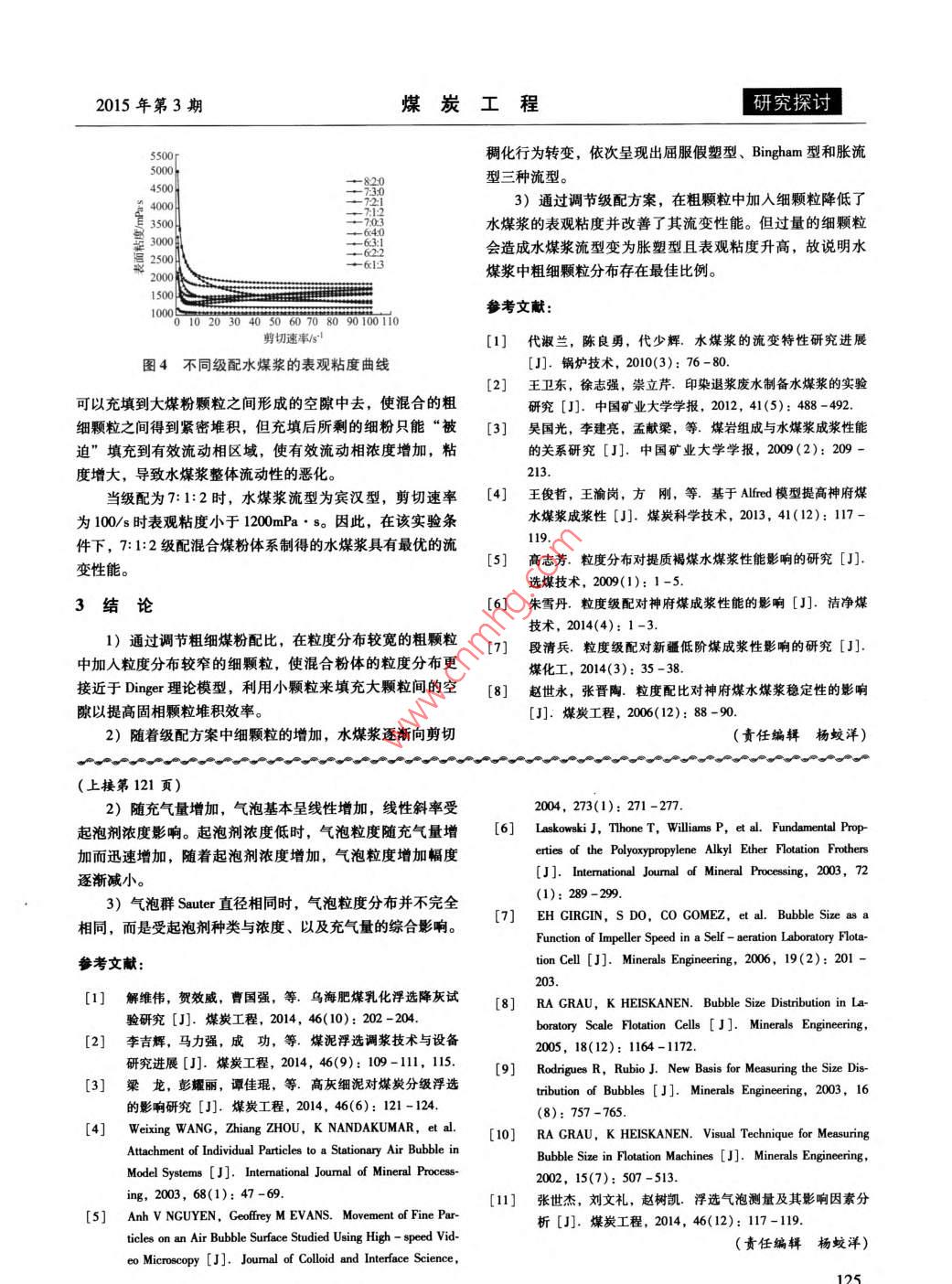 煤炭工程第47卷第3期COAL ENGINEERINGVol. 47. No. 3doi:10.11799/ce201503040顆粒分布對高濃度水煤漿流變性能的影響孫南翔2,徐志強',曲思建2,涂亞楠(1.中國礦業(yè)大學(北京)化學與環(huán)境工程學院,北京100083;2.煤炭科學研究總院北京煤化工研究分院,北京100013;3.煤炭資源高效開采與潔凈利用國家重點實驗室,北京100013)摘要:采用體積平均粒徑分別為81.30μm,14.62μm的6.07m的三種陜西長焰煤粉以不同級配混合后制備高濃度水煤漿,利用 Dinger模型評估了級配前后煤顆粒的粒度分布,研究了不同顆粒分布對高濃度水煤漿流變性能的影響。試驗結(jié)果表明:級配優(yōu)化可使煤顆粒的實際分布更接近理論模型分布。當漿體濃度較高時,隨著漿體體系中細顆粒的增多,水煤漿流型由剪切稀化逐漸向剪切稠化轉(zhuǎn)變,依次呈現(xiàn)出屈服假塑型、 Bingham型和脹流型三種流型,擬合出了相應(yīng)的的流變學模型,利用流變杋理解釋了漿體流型轉(zhuǎn)變的原因,得到了使水煤漿具有最優(yōu)流變性能的配比方案。關(guān)鍵詞:長焰煤;顆粒分布;高濃度水煤漿;流變學模型中圖分類號:TQ536文獻標識碼:A文章編號:1671-0959(2015)03012204Effect of Particle Size distribution on rheology Behaviorof High-concentration Coal Water SlurrySUN Nan-xiang, XU Zhi-qiang, QU Si-jian", TU Ya-nan(1. School of Chemical and Environmental Engineering, China University of Mining and Technology, Beijing 100083, China2. Beijing Research Institute of Coal Chemistry, China Coal Research Institute, Beijing 100013, China;3. State Key Laboratory of Coal Mining and Clean Utilization, Beijing 100013, China)Abstract: Three coal powders with different mean volume diameters(81 30um, 14. 62um and 6. 07um) were mixed indifferent proportions to prepare high concentration coal water slurry with various particle size distributions. Dinger modelwas used to evaluate the particle size distributions before and after the gradation. The effect of particle size distributionthe rheological properties of high-concentration coal water slurry was investigated. The results show that, the coal particlesize distribution is optimized and closer to theoretical model. In the higher concentration, the slurry shows a transition fromshear-thinning to shear -thickening rheology characteristic as the fraction of fine particle in the slurry increasingpresenting pseudoplastic, Bingham and dilatant flow type in sequence. The fitting equations were obtained, and thereason of the transition of theology behavior was analyzed using Meng Lingiie's rheological mechanism. The ratio ofoptimum rheological properties of high-concentration slurry was obtained.Keywords: jet coal; particle size distribution; high concentration coal water slurry; rheological model formulas作為一種煤基流體燃料,水煤漿的流變性能直接影響到其煤顆粒大小及粒度分布,添加劑的種類和用量,漿液pH值配制、儲存、管道輸送以及霧化燃燒等重要工藝過程,因此研及溫度等-3。其中顆粒粒度分布是決定水煤漿制備濃度究水煤漿的流變性能對水煤漿的工業(yè)應(yīng)用具有重要意義。及流變特性的主要因素,也是目前制備高濃度水煤漿急需水煤漿流變性能包括其流變屬性、流變參數(shù)和觸變性。解決的關(guān)鍵問題之一。以往的研究發(fā)現(xiàn),采用粒度分布模理想的水煤漿流型呈屈服假塑性,且具有適宜的觸變性。型對制備煤粉的粒度分布進行評估,通過級配改善煤粉影響水煤漿流變性能的主要因素有煤種和煤質(zhì),固相含量,粒度分布與模型的差距,可增加煤粉的填充效率以提高其收稿日期:2014-10-22基金項目:國家自然科學基金面上項目(51274208)作者簡介:孫南翔(1987-),女,安徽淮北人,博士研究生,研究方向為潔凈煤技術(shù),E-ml:qiankaqic@163.com。引用格式:孫南翔,徐志強,等.顆粒分布對高濃度水煤漿流變性能的影響[J].煤炭工程,2015,47(3)122015年第3期煤炭工程研究探討成漿性。粒度級配的變化不僅影響其成漿性,同時影響其流動性和穩(wěn)定性681。(1)為進一步探討顆粒分布對高濃度水煤漿流變性能的影其中,ω為小于該尺寸顆粒的累積質(zhì)量分數(shù),%;dn響,本文通過改變級配研究不同的粒度分布對高濃度水煤為粒群中最小的顆粒尺寸,mm;d為最大的顆粒尺寸,漿所產(chǎn)生的不同流變模型的影響,分析流變模型變化的原mm;d為粒群范圍內(nèi)任一顆粒尺寸,mm;n為模型參數(shù),因,尋求制備低粘度高濃度水煤漿的最優(yōu)級配方案。Dinger模型給出的能夠達到最大堆積密度的n值為0.37。三種原料煤粉CS、FS和UFS的實測粒度分布與Dng1級配優(yōu)化實驗?zāi)P陀嬎阒档牟町惾鐖D1所示。FS和UFS粒度分布與模型1.1樣品的選擇理論值相差較小,但由于該兩種煤粉粒度分布太窄,不適實驗選用煤樣為陜西長焰煤,其工業(yè)分析和元素分析合單獨制漿。CS粒度分布較寬,但實測粒度分布與模型理數(shù)據(jù)見表1。長焰煤的煤質(zhì)特點是高水分、高氧含量,可磨論值相差較大性指數(shù)小,屬難成漿煤種,但其揮發(fā)分高,反應(yīng)活性強若能將低階煤制成水煤漿用于煤代油鍋爐燃燒或氣化,則80D607D8理想分布可擴大制漿煤種的范圍。將原煤破碎至3mm左右,利用球→D1462理想分布+D607理想分布磨機進行不同時長的磨礦,得到3種不同粒度分布的煤粉因工業(yè)生產(chǎn)一般將選擇性粗磨與超細磨機進行有機組合,通過選擇性分級研磨,優(yōu)化煤漿的粒度級配,提高水煤漿的濃度和研磨效率,達到提濃降耗的目的。本文為了研究粗、細顆粒對水煤漿流變性