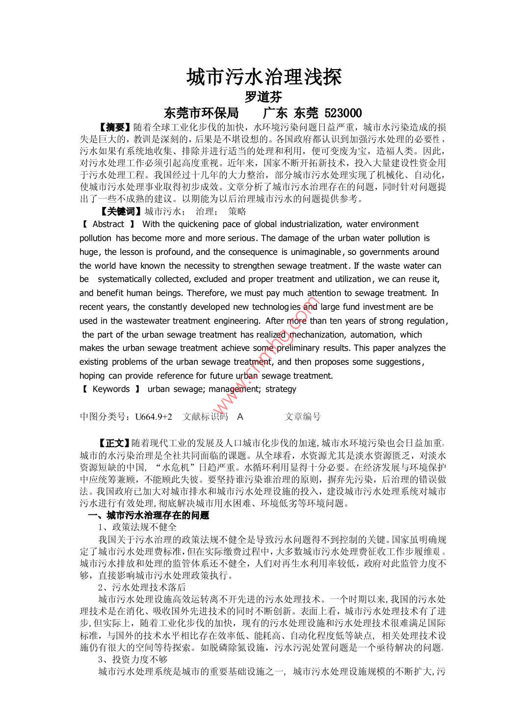 城市污水治理淺探羅道芬東莞市環(huán)保局廣東東莞523000【摘要】隨著全球工業(yè)化步伐的加快,水環(huán)境污染問題日益嚴(yán)重,城市水污染造成的損失是巨大的,教訓(xùn)是深刻的,后果是不堪設(shè)想的。各國政府都認(rèn)識到加強(qiáng)污水處理的必要性污水如果有系統(tǒng)地收集、排除并進(jìn)行適當(dāng)?shù)奶幚砗屠?便可變廢為寶,造福人類。因此,對污水處理工作必須引起高度重視。近年來,國家不斷開拓新技術(shù),投入大量建設(shè)性資金用于污水處理工程。我國經(jīng)過十幾年的大力整治,部分城市污水處理實(shí)現(xiàn)了機(jī)械化、自動(dòng)化,使城市污水處理事業(yè)取得初步成效。文章分析了城市污水治理存在的問題,同時(shí)針對問題提出了一些不成熟的建議。以期能為以后治理城市污水的問題提供參考?!娟P(guān)鍵詞】城市污水;治理;策略Abstract With the quickening pace of global industrialization, water environmentpollution has become more and more serious. the damage of the urban water pollution ishuge, the lesson is profound and the consequence is unimaginable, so governments aroundthe world have known the necessity to strengthen sewage treatment. If the waste water canbe systematically collected, excluded and proper treatment and utilization, we can reuse it,and benef it human beings. Therefore we must pay much attention to sewage treatment. Inecent years, the constantly developed new technolog ies and large fund investment are beused in the wastewater treatment engineering. After more than ten years of strong regulationthe part of the urban sewage treatment has realized mechanization, automation, whichmakes the urban sewage treatment achieve some preliminary results. this paper analyzes theexisting problems of the urban sewage treatment, and then proposes some suggestionshoping can provide reference for future urban sewage treatmentKeywords urban sewage; management; strategy中圖分類號:U6649+2文獻(xiàn)標(biāo)識碼A文章編號【正文】隨著現(xiàn)代工業(yè)的發(fā)展及人口城市化步伐的加速,城市水環(huán)境污染也會(huì)日益加重城市的水污染治理是全社共同面臨的課題。從全球看,水資源尤其是淡水資源匱乏,對淡水資源短缺的中國,“水危機(jī)”日趨嚴(yán)重。水循環(huán)利用顯得十分必要。在經(jīng)濟(jì)發(fā)展與環(huán)境保掃中應(yīng)統(tǒng)籌兼顧,不能顧此失彼。要堅(jiān)持誰污染誰治理的原則,摒棄先污染,后治理的錯(cuò)誤做法。我國政府已加大對城市排水和城市污水處理設(shè)施的投入,建設(shè)城市污水處理系統(tǒng)對城市污水進(jìn)行有效處理,徹底解決城市用水困難、環(huán)境低劣等環(huán)境問題。、城市污水治理存在的問題1、政策法規(guī)不健全我國關(guān)于污水治理的政策法規(guī)不健全是導(dǎo)致污水問題得不到控制的關(guān)鍵。國家雖明確規(guī)定了城市污水處理費(fèi)標(biāo)準(zhǔn),但在實(shí)際繳費(fèi)過程中,大多數(shù)城市污水處理費(fèi)征收工作步履維艱。城市污水排放和處理的監(jiān)管體系還不健全,人們對再生水利用率較低,政府對此監(jiān)管力度不夠,直接影響城市污水處理政策執(zhí)行2、污水處理技術(shù)落后城市污水處理設(shè)施高效運(yùn)轉(zhuǎn)離不開先進(jìn)的污水處理技術(shù)。一個(gè)時(shí)期以來,我國的污水處理技術(shù)是在消化、吸收國外先進(jìn)技術(shù)的同時(shí)不斷創(chuàng)新。表面上看,城市污水處理技術(shù)有了進(jìn)步,但實(shí)際上,隨著工業(yè)化步伐的加快,現(xiàn)有的污水處理設(shè)施和污水處理技術(shù)很難滿足國際標(biāo)準(zhǔn),與國外的技術(shù)水平相比存在效率低、能耗高、自動(dòng)化程度低等缺點(diǎn),相關(guān)處理技術(shù)設(shè)施仍有很大的空間等待探索。如脫磷除氮設(shè)施,污水污泥處置問題是一個(gè)亟待解決的問題。3、投資力度不夠城市污水處理系統(tǒng)是城市的重要基礎(chǔ)設(shè)施之一,城市污水處理設(shè)施規(guī)模的不斷擴(kuò)大,污水處理能力年年攀高。污水處理設(shè)施建設(shè)任務(wù)繁重。資金是個(gè)根本問題。沒有足夠的資金,“提高污水處理能力”便只是一個(gè)口號??梢?資金短缺仍是制約污水處理工程建設(shè)的突出問題。即使修建了城市污水處理廠,其高昂的運(yùn)行維護(hù)管理費(fèi)用也使一些城市污水處理廠處于閑置和半閑置狀態(tài)。水污染沒有得到控制,形成惡性循環(huán)。據(jù)統(tǒng)計(jì):發(fā)達(dá)的美國、德國等國家用于污水處理方面的投資約占國民經(jīng)濟(jì)總產(chǎn)值的0.63%~0.98%。而我國僅占0.02%~0.03%4、管理水平低城市污水處理系統(tǒng)技術(shù)較復(fù)雜,需要在有一定專業(yè)素質(zhì)的操作人員的操作下發(fā)揮效用。目前,我國操作人員的技術(shù)素質(zhì)及管理水平有待提高。這是造成污水廠不能發(fā)揮正常功效的決定因素。另外,目前我國污水處理的全部費(fèi)用由政府全部“一肩挑”,常常出現(xiàn)運(yùn)行經(jīng)費(fèi)不足的現(xiàn)象,政府缺少鼓勵(lì)污水處理的經(jīng)濟(jì)政策,沒有做到有價(jià)排放、有償處理、有償使用、城市污水治理的若干建議隨著城市工業(yè)、人口的集中,城市污水排放量與日俱增,如果不能得到科學(xué)處理,必將威脅人居環(huán)境質(zhì)量,影響城市可持續(xù)發(fā)展。為徹底解