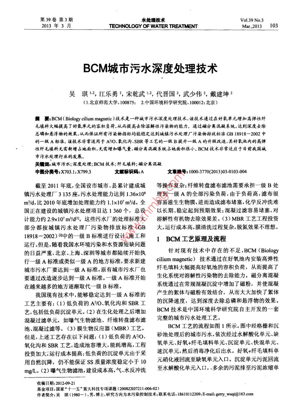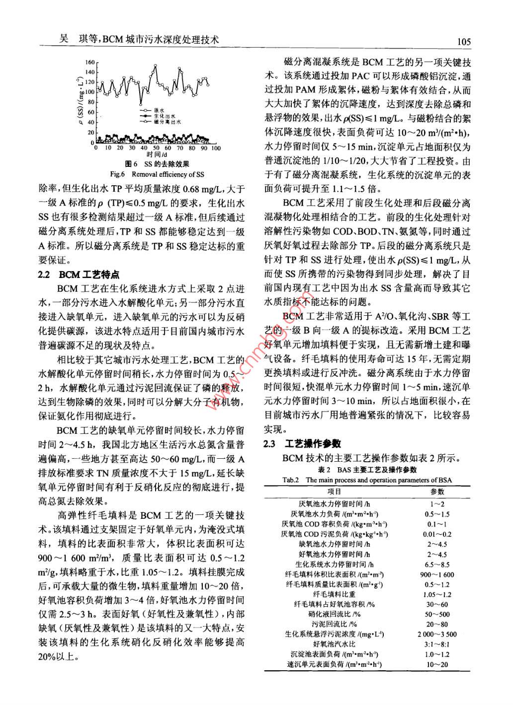 第39卷第3期水處理技術VoL39 No.32013年3月TECHNOLOGY OF WATER TREATMENTMar.2013103BCM城市污水深度處理技術吳琪…2,江樂勇’,宋乾武12,代晉國2,武少偉2,戴建坤2(1北京師范大學,100875;2中國環(huán)境科學研究院,100012:北京)嬃:BCM( Biology cilium magnetic)技術是一種城市污水深度處理技術,該技術通過在好氧單元增加高彈性纖毛填料大幅提高了妤氧單元的容積負荷,從而提高去除溶解性污染物的能力。通過磁分禹混凝系統(tǒng),達到深度去除總磷和懸浮物的效果,從而保證所有污染物指標均能穩(wěn)定達到城鎮(zhèn)污水處理廠污染物排放標準GBI8918-2002中的一級A標準。該技術非常適用于A3O、氧化溝、SBR等工藝的一級B提升一級A的升級改造,其好氧池內(nèi)的高彈性纖毛填料無需新增占地面積,無需增加曝氣量,磁分離混凝系統(tǒng)占地面積很小.BCM技術非常適應于目前我國城市污水處理行業(yè)的發(fā)展關詞:城市污水;深度處理;BCM技術;纖毛填料;磁分離混凝中圖分類號:X703.1;X7993文獻標識碼:A文章蜻號:10007702013)03-0103004截至2011年底,全國設市城市、縣累計建成城等操作復雜;纖維轉盤濾布濾池需要承擔一級B處鎮(zhèn)污水處理廠3135座,污水處理能力達到136×10理到一級A的全部污染負荷,由于負荷高,濾布很m/d,比2010年底增加處理能力約1.1×107m列d。全容易滋生生物膜,進而造成濾布堵塞,化學反沖洗難國正在建設的城鎮(zhèn)污水處理項目達1360個,總設以長期、穩(wěn)定起到預期效果;混凝過濾容易堵塞,對計能力約29×10m}。這些污水廠的處理標準大溶解性有機物去除效果差。(3)MBR工藝工程投資部分都按城鎮(zhèn)污水處理廠污染物排放標準(GB大,運行成本高,膜清洗過程復雜,脫氮效果不理想18918-2002)四中的一級B標準進行設計、施工和1BCM工藝原理及流程運行。但是,隨著我國水環(huán)境污染和水資源短缺問題的日益嚴重,北京、上海、深圳等城市都陸續(xù)開始執(zhí)針對現(xiàn)有技術中存在的不足,BCM( Biology行一級A標準或類似一級A的地方標準,要求新建 ilium magnetic)技術通過在好氧池內(nèi)安裝高彈性城市污水廠要達到一級A標準,原有城市污水廠也纖毛填料大幅提高好氧池的容積負荷,從而提高了要通過改造逐步達到一級A標準。一級A標準開始生化系統(tǒng)對溶解性污染物的去除能力。磁分離混凝在越來越多的地方逐漸取代一級B標準。系統(tǒng)通過在常規(guī)混凝沉淀中增加了磁粉,并使混凝我國現(xiàn)有技術中,能夠穩(wěn)定達到一級A標準的產(chǎn)生的絮體與磁粉有效結合,從而大大加快了絮體工藝主要有:(1)低負荷的A30氧化溝和SBR工的沉降速度,達到深度去除總磷和懸浮物的效果。藝包括低負荷沉淀單元。(2)在生化處理之后增加BCM技術是中國環(huán)境科學研究院自主開發(fā)的一套混凝過濾單元,如曝氣生物濾池、纖維轉盤濾布濾完整的城市污水處理工藝池混凝過濾等。(3)膜生物反應器(MBR)工藝BCM工藝的流程如圖1所示圖中經(jīng)格柵和沉但是,上述工藝存在以下問題:(1)低負荷的A3O、砂池處理后的城市污水,依次經(jīng)過水解酸化單元、缺氧化溝和SBR工藝,造成池容增大,能耗增高,工程氧單元、好氧+纖毛填料單元沉淀單元快混單元、投資加大;運行成本提高;低負荷的沉淀單元由于采速沉單元,然后消毒凈化后出水。好氧+纖毛填料單用自然沉降,仍不能保證SS質(zhì)量濃度穩(wěn)定小于10元硝化液回流至缺氧單元入口。沉淀單元污泥回流mgL。(2)曝氣生物濾池建設成本高氣、水反沖洗至水解酸化單元入口,多余的污泥排至污泥濃縮單收稿日期:20120921基金項目:國家“十一五”重大科技專項課題(20082X07211-006-02)作者簡介:吳琪(1980-),男博士,研究方向為水污染控制技術;聯(lián)系電話:186101122 E-mail: gerry wuqi@163om水處理技術第39卷第3期元,然后經(jīng)污泥脫水后外運處理??旎靻卧都涌闯?進水NH-N質(zhì)量濃度為242~21.77mg/L,波PAC、PAM、少量磁粉。速沉單元沉淀的污泥經(jīng)污泥動較大,平均值為15.1mgL,生化出水NH-N平均剪切機進行污泥破碎,然后通過磁分離機將磁粉分質(zhì)量濃度069mg/L,磁分離出水NH-N平均質(zhì)量濃離出來再投入快混單元循環(huán)使用,分離后的剩余污度047mg,可見NHxN主要是在生化段被去除泥排入污泥濃縮池。的,磁分離去除NHx-N的作用很小,BCM最終出水鼓風機PAM磁粉城市水解酸獻氧好氧毛沉??旎焖俪罫后出水消毒凈化NH-N質(zhì)量濃度遠遠小于一級A標準p(NHN)≤mgL的要求「硝化液回流離機剪切機污泥水泥AMMAA圖1BCM工藝流程ig. 1 Flow diagram of BCM processC原水2工程應用so a.drroeoneod△Ame607080.90I0021運行效果在廣東某城市污水處理廠采用BCM技術處理圖3NH-N的去除效果Fig3 Removal efficiency of NH-N城市污水,處理規(guī)模為120m/d,BCM技術各單元水質(zhì)指標如表1所示。TN的去除效果如圖4所示。結合表1可以看表lBCM技術各單元水質(zhì)指標出,進水TN質(zhì)量濃度波動較大,為25~475mgLTab. 1 Each unit water quality index of BCM process平均值為21.79mg/L,生化出水TN平均質(zhì)量濃度COD/ BODp/(mgL")項目(mgL)(mgL) NHrN TN TP755mg/L,磁分離出水TN平均質(zhì)量濃度676mgL總的平均去除率為690%,TN與NH1N一樣主要是原水175279151121.7926814靠生化段的缺氧好氧去除的BCM出水TN能夠穩(wěn)生化出水28.6410697550.68972磁分離出水18.3260.476760.3401定達到級A標準中p(TN≤15mgL的要求級A標準501010去除率%89696.796969888965COD的去除效果如圖