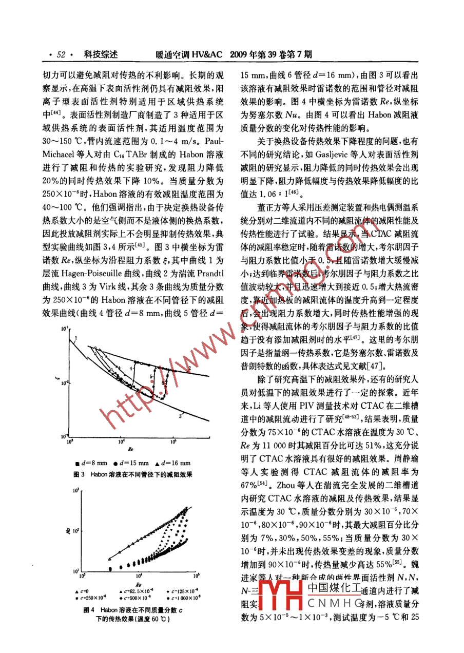 ●48●科技綜述暖通空調(diào)HV&AC 2009 年第39卷第7期添加劑減阻及其在供熱系統(tǒng)中的應(yīng)用哈爾濱工業(yè)大學(xué)朱蒙生* 鄒平華 蔡偉華^摘要簡要介紹了添加劑減阻的國內(nèi)外研究概況,詳細(xì)介紹了減阻劑的特性、減阻機(jī)理、流場湍動(dòng)測量,減阻效果對傳熱的影響及添加劑減阻在集中供熱系統(tǒng)中的應(yīng)用。關(guān)鍵詞減阻特性機(jī)理傳熱供熱系統(tǒng)Application of additive drag reduction to heating systemsBy Zhu Mengsheng*,Zou Pinghuo ond Col WerhuoAbstract Gives a brief presentation of the rescarch status at home and abroad of drag reduction byadditives and a detailed description of the characteristics, drag reduction mechanism, measurement of flowfield turbulent motion, influence of drag reduction cffcct on heat transfer and the application of dragreduction by additives to central heating systems.Keywords drag reduction, characteristic, mechanism, heat transfer, heating system★Harbin Institute of Technology, Harbin, China0引言應(yīng)用作簡要介紹。添加劑減阻是指在液體中加入少量的高分子1國內(nèi)外研究概況聚合物或表面活性劑以大幅度減小其湍流摩阻的在添加劑減阻研究領(lǐng)域,具有代表性的成果是方法。該方法具有減阻劑投放量少、減阻效率高等1948年第- -屆國際流變學(xué)會(huì)議上Toms發(fā)表的第優(yōu)點(diǎn),對于節(jié)能或提高水中物體的運(yùn)動(dòng)速度具有重一篇減阻論文,該文指出以少量的聚甲基丙烯酸甲大意義。在20世紀(jì)50年代及60年代初期,減阻酯(PMMA)溶于氯苯,沿程阻力可降低50%61。研究多局限于流變學(xué)及石油化工領(lǐng)域,60年代中此后,這種高分子減阻現(xiàn)象被稱為Toms效應(yīng)。期以后,添加劑減阻開始引起流體力學(xué)研究者的注Fabula等人發(fā)現(xiàn)質(zhì)量分?jǐn)?shù)約為5X10-6~10X意,研究工作更加廣泛地開展起來[”。目前減阻劑10-的PEO(聚氧化乙烯)水溶液與純水相比最大已應(yīng)用于水下武器發(fā)射、原油管道輸送、泄洪、消防減阻率可達(dá)80%[7。Oliver 等人利用超大分子量等領(lǐng)域,在原油管道輸送領(lǐng)域,近20多年來先后研聚丙烯酰胺E-10和MG-200 作減阻劑,在1X制出了聚氯乙烯、乙烯丙烯共聚物.聚甲基丙烯酸10- °質(zhì)量分?jǐn)?shù)下達(dá)到了80%的最大減阻率[8,充等一系列油溶性減阻劑[2]。1979 年美國某公司生分證明了減阻劑的減阻高效性。減阻率又可稱為產(chǎn)的CDR減阻劑開始應(yīng)用于橫貫阿拉斯加的原油減阻百分比,計(jì)算式為輸送管道中,取得了良好的節(jié)能效果[3]。80年代末至90年代中期在國外出現(xiàn)了將減阻劑應(yīng)用在區(qū)★朱蒙生,男,1963年9月生,博士研究生,博士,副教授域供熱系統(tǒng)中的實(shí)驗(yàn),取得了良好的節(jié)能和環(huán)保綜150090哈爾濱T業(yè)大學(xué)市政環(huán)境工程學(xué)院合效益"。近幾十年,我國城市集中供熱與空調(diào)系(0451) 82307642E- mail:zmszkg@sina. com統(tǒng)發(fā)展迅速,其輸配管網(wǎng)中水泵的能耗占總能耗的S 150001 哈爾濱工業(yè)大學(xué)能源科學(xué)與工程學(xué)院比例較大,若能在集中供熱與空調(diào)水系統(tǒng)中應(yīng)用減中國煤化工阻劑,節(jié)能環(huán)保效果將會(huì)十分顯著[]。本文擬對添收YHCNMHG加劑減阻的國內(nèi)外研究概況以及在供熱工程中的二次修回:2009-06-05暖通空調(diào)HV&AC 2009 年第39卷第7期科技綜述●49●e=f二f x 100%(1)械剪切作用下,其棒狀結(jié)構(gòu)即使會(huì)暫時(shí)斷裂,但是經(jīng)過泵之后(機(jī)械剪切消失),又可恢復(fù)為原來的棒式中E 為減阻百分比;f為加人減阻劑前流體的狀結(jié)構(gòu),仍具有較好的減阻效果[5-1]。范寧摩阻系數(shù);f'為加入減阻劑后同- -雷諾數(shù)下流減阻劑的減阻效果還受以下幾個(gè)因素的影響:體的范寧摩阻系數(shù)。1)減陰流體溶液的濃度。Virk認(rèn)為減阻劑1974年召開了第一次國際減阻會(huì)議,早期的的濃度影響管道內(nèi)流動(dòng)的彈性底層的厚度,濃度越主要研究成果由White 和Virk等人進(jìn)行了總大,彈性底層越厚,減阻效果越好0。最近對PAM結(jié)).9。國內(nèi)的研究起步于上個(gè)世紀(jì)70年代,大多和CTAC水溶液進(jìn)行的減阻實(shí)驗(yàn)研究表明,在相以實(shí)驗(yàn)研究為主,最早發(fā)表在公開刊物上的研究成同溫度和雷諾數(shù)下,減阻效果隨著溶液濃度的增加果見文獻(xiàn)[10]。國內(nèi)外有關(guān)添加劑減阻的研究主而變好;但是當(dāng)濃度增加到一定程度后,減阻效果要體現(xiàn)在減阻劑的特性、減阻機(jī)理、實(shí)驗(yàn)研究及工開始變差,這說明減阻流體存在一個(gè)最佳濃.程應(yīng)用等方面。度[13.18]。1.1 減阻劑特性2)減阻流體溶液的溫度。減阻劑都有其自身目前,已發(fā)現(xiàn)的減阻劑種類很多,但能用于集的適用溫度范圍,也就是說都存在著臨界溫度,并中供熱系統(tǒng)的減阻劑只有兩類:第1類為高分子聚且在適用溫度范圍內(nèi)隨著溫度升高減阻效果變差,合物,例如PEO, PAM(聚丙烯酰胺)等人工合成聚一旦溫度超過臨界溫度,即會(huì)出現(xiàn)減阻完全失效的合物;第2類為表面活性劑,分為非離子、陽離子、現(xiàn)象。最近對PAM水溶液的減阻實(shí)驗(yàn)研究表明,陰離子和兩性表面活性劑,例如CTAC(十六烷基在相同濃度和雷諾數(shù)下,減阻效果隨肴溶液溫度的三甲基氯化銨)陽