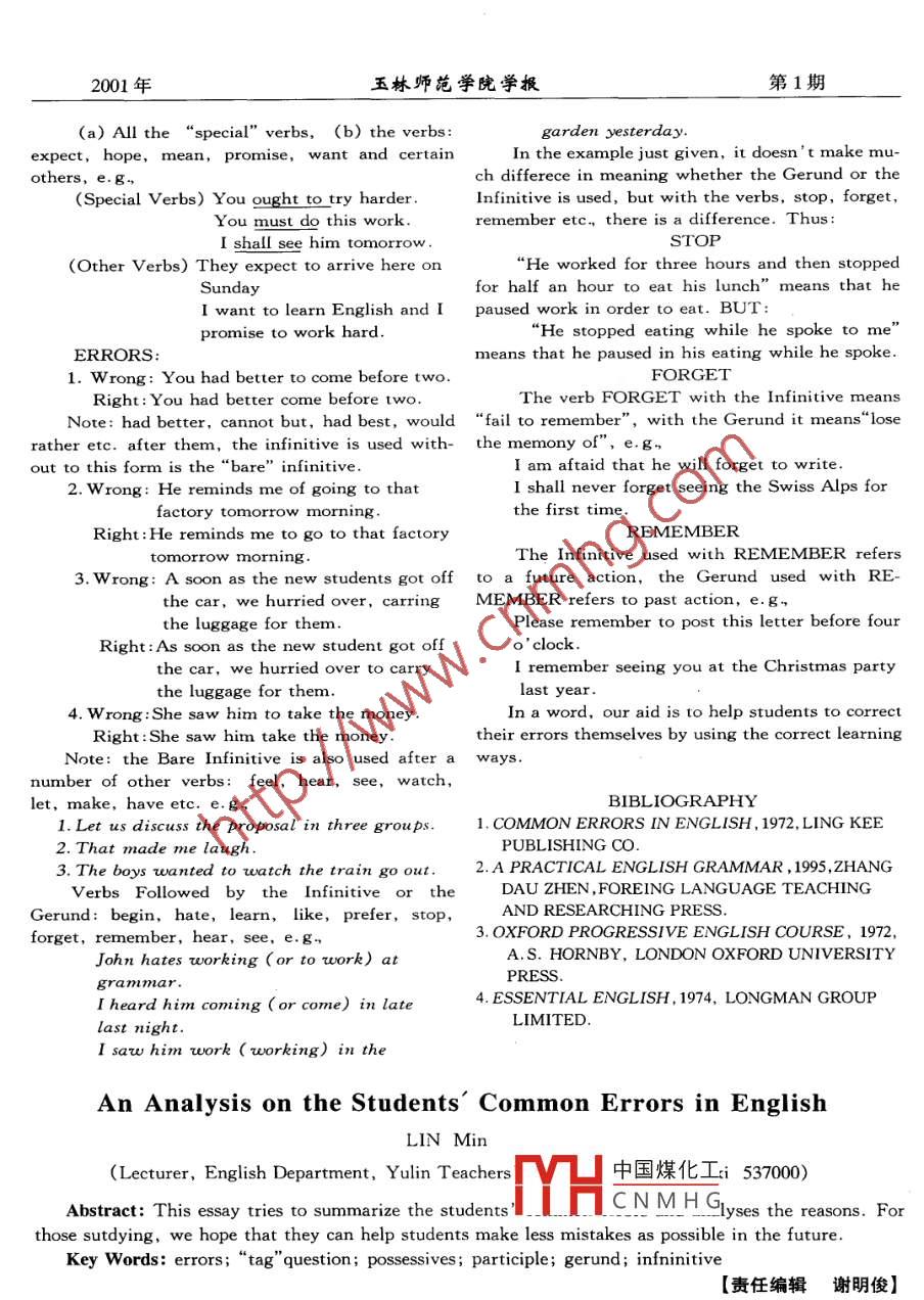 .第22卷第1期玉林師范學(xué)院學(xué)報(bào)(哲學(xué)社會(huì)科學(xué))Vol.22 No. 12001年JOURNAL OF YULIN TEACHERSCOLLEGE (Philosophy & Social Science)An Analysis on the Students' Common Errors in English林敏(玉林師范學(xué)院英語(yǔ)系講師,廣西玉林537000)[摘要]本文概括了學(xué)生的常見(jiàn)錯(cuò)誤, 分析其原因所在。通過(guò)學(xué)習(xí),以盡量減少學(xué)生在學(xué)習(xí)上的錯(cuò)誤。[關(guān)鍵詞]錯(cuò)誤;附加疑問(wèn)句;屬有格;分詞;動(dòng)名詞及不定式[中圖分類(lèi)號(hào)] H319.3 [文獻(xiàn)標(biāo)識(shí)碼] A [文章編號(hào)] 1004 - 4671(2001)01 - 0119- 04In the process of English teaching, we often1. Wrong:1 suppose you like to play too, isn'tfind students' errors occur in their learning. Theirit?errors have been selected and analysed now becauseRight: 1 suppose you like to play too, don'tthey are very common, and 1 hope the analysis canyou?help students avoid errors and support for remedial2. Wrong: They can't do this without the vetmeasures.eran workers' help, is it?The common errors in learning English are putRight: They can't do this with the veteranas follows:workers' help, can they?I .“TAG" QUESTIONS. Students often make3. Wrong: You won't tell anybody, won'tmistakes because they answer the questions in Chi-neses forms. Sometime they are in a mix way theRight: You won't tell anybody, will you?using are quite different between Chinese and Eng-I .ERRORS IN POSSESSIVES. Some of nounslish. What is TAP QUESTION? How to avoid the can be added apostrophes' in its ending, we nameerrors? Study the following :them Possessive Case.1.He is English, isn't he?A. Generally speaking, only nouns for animate2. She has five children, hasn' t she?things have possessive form. With singular nouns3.He's not French,is he?we add an apostrophe (') ad s. With plural nouns4. You haven't any books, have you?ending in s', we add only the apostrophe, e. g.you must pay attention to that: a statement can bethe boy' s footballthe girls' dressesturned into a question by repeating the auxiliary, inthe man's suitthe kings' sonsa negative form where the statement is affirmative, NOTE:There is no difference in pronunciationin an affirmative form where the statement is neg-between“The king's sons" and“Theative.kings' sons".When the statement has no auxiliary verb, theB.It is safer not to use the apostrophe“S” withBuxiliary‘do’is used in the question clause:e. g.inanimate things: instead use“ "of". e. g,You like coffee, don't you?1.I sat near the leg of the table.You often run technical training classes for2. The cover of the book was torn.young people, don't you?ERRORS:Some words such as: hardly, never, scarcely,w rong: The bathroom's width was about sixseldom etc, appear in the declarative statementsbould be in a negative form. e.g,Right:The width of the bathroom was aboutWe will never let them down, will we?中國(guó)煤化工She seldom speaks English, does she?YHCNMHGwas broken.The following errors are often made by stu-ture was broken.lents: .C. Sometime when a number singular in form is收稿日期:2000- 12-131192001年玉林師范學(xué)院學(xué)報(bào)第1期used as an adjective,do not use“of”after it. e.g. :Right: In such cold weather, no winter1. Wrong: a haundred of people were present.clothes will be taken off.Right:A hundred people were present.NOTE PARTICULARLY:2. Wrong: There were twenty of eggs in the1.1 must cut my hair. (Meaning: I, myself,basket.must cut my hair. )Right: There were twenty eggs in the basket.Right: I must have my hair cut. (Meaning :3. Wrong: Five thounsand of rioters attackedThe hairdresser must cut my hair. )the police headquarters.2. I must make a new suit. (I, myself, mustRight: Five thounsand rioters attacked themake the suit. )police headquarters .Right: I must have a new suit made.I .ThE CONFUSION OF THE ACTIVE tailor must make it. )VOICE WITH THE paSSIVE VOICE.When Subject is the doer of the action, the more interested in the action than in the person orpredicate form is named the Active Voice, e.g. He people who are doing the action. So it is often un-ate the cake. When Subject is the supporter of the necessary to put in the doer (“by me"," 'by Tom”action, that means the object is done something to etc.), in fact it often makes the sentence unnatu-by the subject, that is the Passive Voice, and we ral. Look at the following sentences. The words inoften put“by” in front of the doer of the action. brackets can be (and ought to be) left out:e.g. ,The cake was eaten by him.1. English is spoken all over the would (byWe can make Passive Verbs in any tense bypeople) .using different tenses of“be”:2. All the questions on the examination paperSimple Present Tense: am, is, are.must be answered (by you). .Present Continuous Tense: am being, is be-3. The house was built in 1500 (by somebody ).4. Lesson 22 was specially written (by me) toSimple Past Tense: was, were.illustrate the Passive.Past Continuous Tense: was being, wereIV. CONFUSION BETWEEN PRESENT, PER-being.FECT AND PAST PARTICIPLE.Present Perfect Tense: have been, has been.Remember that the Present Participle is usedPast Perfect Tense : had been.for describing actions which take place at the sameERRORS:time as the action of the main verb, otherwise, inA. When the Passive is used in place of the using a participle phrase, a phrase with a participleActive.in it, take care that the particilpe is correctly r1. Wrong: My mother is fainted at the news.lated, it out to be related to the subject of the verbRight: My mother fainted at the news.in the sentece, e.g,2. Wrong: The clown was made fun of the1. He walked over the meadow, wihistling a .audience.hit song.Right: The clown made fun of the audi-2. She drinks her coffee, savouring each drop.ence.3. She will go to the cocktail party, wearing3. Wrong: I have been longed to visit yourher new costume 