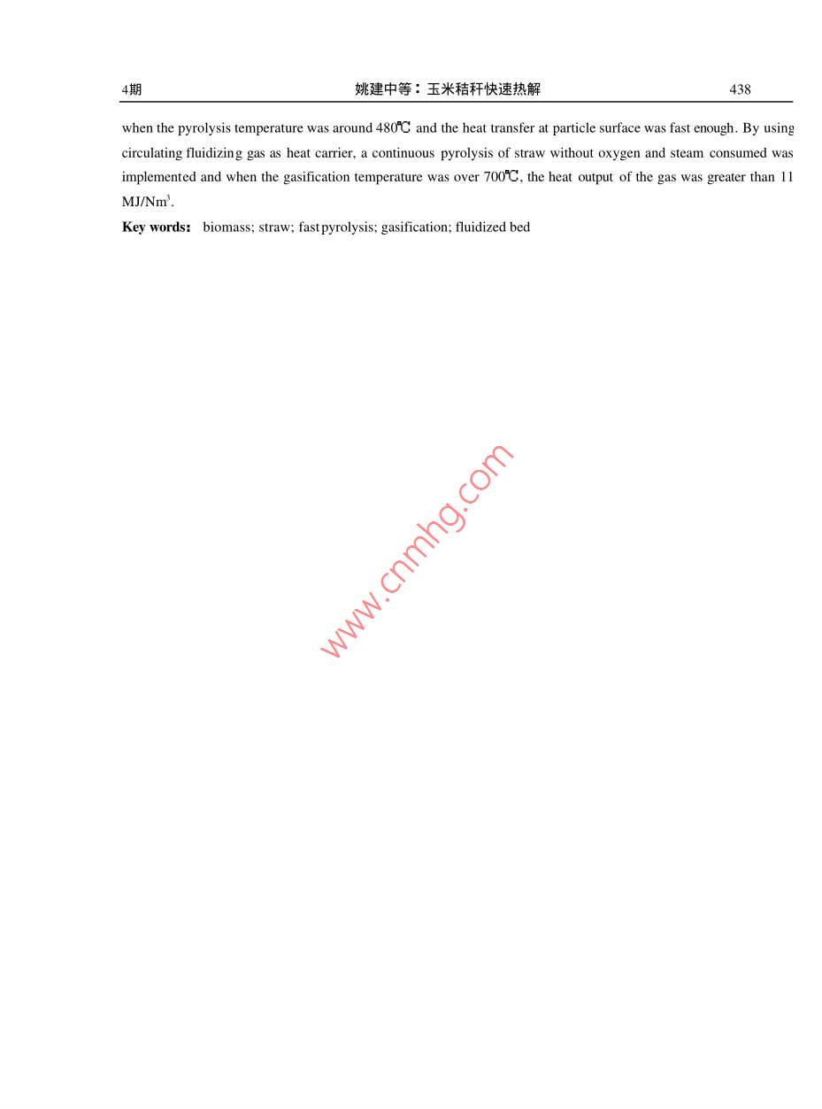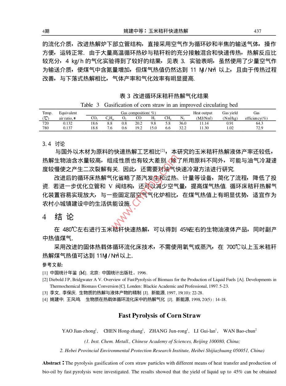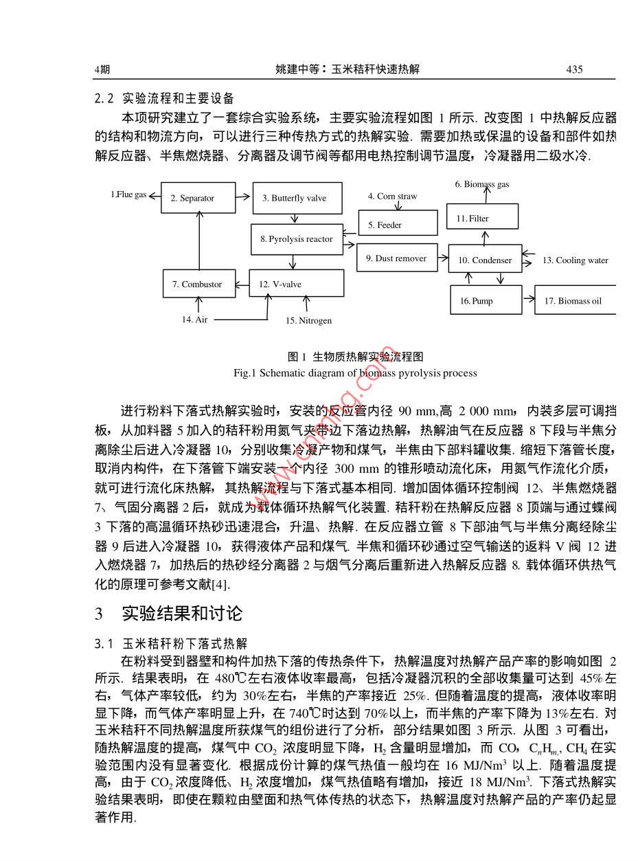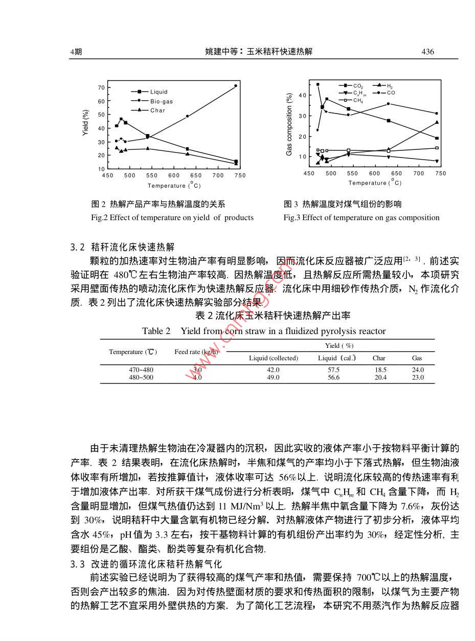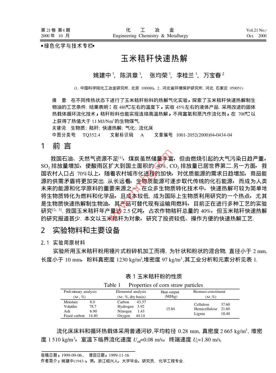 第21卷第4期化工治金Vo.21No.∠2000年10月Engineering Chemistry MetallurgyOct.2000·綠色化學與技術專欄玉米秸稈快速熱解姚建中,陳洪章,張均榮,李桂蘭',萬寶春2(1.中國科學院化工冶金研究所,北京100802.河北省環(huán)境保護研究所,河北石家莊050051)摘要在不同傳熱狀態(tài)下進行了玉米秸稈粉料的熱解氣化實驗υ探索了玉米秸稈快速熱解制生物油的工藝條件.結果表明:在480℃左右的溫度下,實收45%左右的液體產(chǎn)品.采用改進的固體熱載體循環(huán)流化技術;秸稈粉料也能實現(xiàn)連續(xù)高溫熱解υ不用富氧和蒸汽作流化劑;在τO0℃以上獲得了熱值大于1lMJ/Nm的生物煤氣關鍵詞:生物質;秸稈;快速熱解;氣化;流化床中圖分類號TQ3524文獻標識碼A文章編號1001-2052(200004-0434041前言我國石油、天然氣資源不足,煤炭雖然儲量豐富,但由燃燒引起的大氣污染日趨嚴重SO2排放量增加,使酸雨區(qū)擴大到國士面積的40%,CO2排放量已居世界第二另一方面,我國農(nóng)村人口占70%以上,隨著農(nóng)村城市化進程的加快,對優(yōu)質能源的需求日趨增加,商品能源的供需矛盾將更加突出.從長遠看,生物質能源可逐步取代傳統(tǒng)的化石能源,而成為人類未來的能源和化學原料的重要來源之一.在眾多生物質轉化技術中,快速熱解可較為簡單地將生物質轉化為燃料和化學品,且成本較低,成為國際上生物質利用研究的一個熱點,尤其是生物質快速熱解制生物油,其產(chǎn)品可替代現(xiàn)有運輸用燃料,目前正在進行多種工藝的實驗研究23.我國玉米秸稈年產(chǎn)量達2.5億噸,占農(nóng)作物秸稈總量的40%,但玉米秸稈快速熱解的研究報道甚少.本文以玉米秸稈為對象,研究了投資較低、操作方便的快速熱解工藝.2實驗物料和主要設備2.1實驗用原材料實驗所用玉米秸稈粉用錘片式粉碎機加工而得,為針狀和粉狀的混合物直徑小于2mm,長度小于10mm,粉料真密度1230kg/m,堆密度97kgm3,其工業(yè)分析和元素分析見表1表1玉米秸稈粉的性質Table 1 Properties of corn straw particlesPreli minary analysiElemental analysisBiomass constituentMoistureiFixed carbon 14.40xygen 44.1流化床床料和循環(huán)熱載體采用普通河砂,平均粒徑0.,28m,真密度265kg/m3,堆密度1510kgm3,室溫下臨界流化速度Um=008m/s,終端速度U=1.80m/s.收稿日期:1999-09修回日期:199911-16作者簡介:姚建中(1943-)男,浙江紹興人,大學畢業(yè),研究員,化學工程專業(yè)姚建中等:玉米秸稈快速熱解432.2實驗流程和主要設備本項研究建立了一套綜合實驗系統(tǒng),主要實驗流程如圖1所示.改變圖1中熱解反應器的結構和物流方向,可以進行三種傳熱方式的熱解實驗.需要加熱或保溫的設備和部件如熱解反應器、半焦燃燒器、分離器及調(diào)節(jié)閥等都用電熱控制調(diào)節(jié)溫度,冷凝器用二級水冷2. Separator3. Butterfly valve4. Corn straw5. FeederI 1. Filter9. Dust remover10. Condenser3. Cooling water7. Combust12. V-valve16, Pump17. Biomass oil圖1生物質熱解實驗流程圖Fig 1 Schematic diagram of biomass pyrolysis process進行粉料下落式熱解實驗時,安裝的反應管內(nèi)徑9πm,高2000mm,內(nèi)裝多層可調(diào)擋板,從加料器5加入的秸稈粉用氮氣夾帶邊下落邊熱解,熱解油氣在反應器8下段與半焦分離除塵后進入冷凝器10,分別收集冷凝產(chǎn)物和煤氣,半焦由下部料罐收集.縮短下落管長度取消內(nèi)構件,在下落管下端安裝一個內(nèi)徑300mm的錐形噴動流化床,用氮氣作流化介質,就可進行流化床熱解,其熱解流程與下落式基本相同.增加固體循環(huán)控制閥12、半焦燃燒器7、氣固分離器2后,就成為載體循環(huán)熱解氣化裝置.秸稈粉在熱解反應器8頂端與通過蝶閥3下落的高溫循環(huán)熱砂迅速混合,升溫、熱解.在反應器立管8下部油氣與半焦分離經(jīng)除塵器9后進入冷凝器10,獲得液體產(chǎn)品和煤氣半焦和循環(huán)砂通過空氣輸送的返料V閥12進入燃燒器η,加熱后的熱砂經(jīng)分離器2與煙氣分離后重新進入熱解反應器8.載體循環(huán)供熱氣化的原理可參考文獻[4]3實驗結果和討論3.1玉米秸稈粉下落式熱解在粉料受到器壁和構件加熱下落旳傳熱條件下,熱解溫度對熱解產(chǎn)品產(chǎn)率的影響如圖2所示.結果表明,在480℃左右液體收率最高,包括冷凝器沉積的全部收集量可達到45%左右,氣體產(chǎn)率較低,約為30%左右,半焦的產(chǎn)率接近25%但隨著溫度的提高,液體收率明顯下降,而氣體產(chǎn)率明顯上升,在740℃時達到70%以上,而半焦的產(chǎn)率下降為13%左右.對玉米秸稈不同熱解溫度所獲煤氣的組份進行了分析,部分結果如圖3所示.從圖3可看出,隨熱解溫度的提高,煤氣中CO2濃度明顯下降,H含量明顯增加,而CO,CHn,CH在實驗范圍內(nèi)沒有顯著變化根據(jù)成份計算的煤氣熱值一般均在16MJNm3以上.隨著溫度提高,由于CO3濃度降低、H濃度增加,煤氣熱值略有增加,接近I8MJNm3.下落式熱解實驗結果表明,即使在顆粒由壁面和熱氣體傳熱的狀態(tài)下,熱解溫度對熱解產(chǎn)品的產(chǎn)率仍起顯著作用姚建中等:玉米秸稈快速熱解一 Bio-gasoH888E802050500550600650700750450500550600650700750Temperature(°c)圖2熱解產(chǎn)品產(chǎn)率與熱解溫度的關系圖3熱解溫度對煤氣組份的影響Fig. 2 Effect of temperature on yield of productsFig 3 Effect of temperature on gas composition3.2秸稈流化床快速熱解顆粒的加熱速率對生物油產(chǎn)率有明顯影響,因而流化床反應器被廣泛應用2·.前述實驗