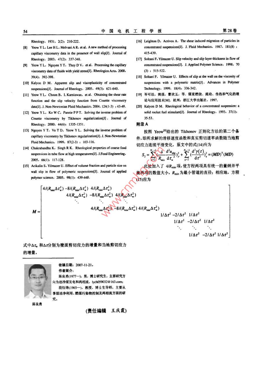 第28卷第20期中國(guó)電機(jī)工程學(xué)報(bào)Vol.28No.20Jul.15,200848200年7月15日 Proceedings of the CsEE""2 08 Chin. Soc. for Elec E"文章編號(hào):02588013(2008)20004807中圖分類號(hào):0373文獻(xiàn)標(biāo)識(shí)碼:A學(xué)科分類號(hào):47010濃度對(duì)水煤漿壁面滑移和流變特性的影響陳良勇,段鈺鋒,趙國(guó)華,劉猛(東南大學(xué)熱能工程研究所,江蘇省南京市210096)Effects of Concentration on Wall Slip Behavior and RheologicalCharacteristics of Coal Water SlurryCHEN Liang-yong, DUAN Yu-feng, ZHAO Guo-hua, LIU Meng( Institute of Thermal Engineering, Southeast University, Nanjing 210096, Jiangsu Province, China)ABSTRACT: Experimental researches were carried out on a切應(yīng)力時(shí)才產(chǎn)生壁面滑移現(xiàn)象;臨界剪切應(yīng)力和屈服應(yīng)力隨pilot-scale slumy transportation apparatus to investigate effects濃度增加有相同的變化趨勢(shì),2者相對(duì)大小不同,導(dǎo)致滑移of volume concentration on slip flow of coal water slurry貢獻(xiàn)率隨壁面剪切應(yīng)力的變化呈現(xiàn)2種相反的趨勢(shì)濃度越(CWS) in pipes with different diameters of25,32,40and高,真實(shí)剪切粘度越大,非牛頓流體特性越顯著50 mm. a procedure combining traditional Mooney method for關(guān)鍵詞:水煤漿;流變特性;壁面滑移;正則化wall slip correction with numerical technique based onTikhonov regularization was applied to determine true rheology 0 3IEof CwS and wall slip behavior. The results suggested that slip水煤漿在煤的燃燒、氣化和液化等潔凈煤技術(shù)velocity increases with increasing concentration in the low領(lǐng)域有著廣泛的應(yīng)用2,水煤漿管道輸送技術(shù)則是range of concentration. While in the range of high這類總體技術(shù)的重要組成部分。水煤漿為高濃度液concentration, slip velocity decreases with increasing固兩相流體,流動(dòng)特性和流變特性復(fù)雜多變,尤其concentration. Critical wall shear stresses were observed是流動(dòng)過程中的壁面滑移現(xiàn)象對(duì)流變特性的測(cè)量beyond which slip phenomenon occurs. With the increasing o和管道阻力的準(zhǔn)確預(yù)測(cè)造成很大困難。因此,確定concentration there are similar trends in variations of criticalwall shear stress and yield stress. Depending on difference壁面滑移特性和真實(shí)流變特性是準(zhǔn)確預(yù)測(cè)水煤漿between the value of yield stress and that of critical wall shear流動(dòng)阻力特性的先決條件。水煤漿的壁面滑移現(xiàn)象sres. slippage contributions exhibit opposite trends with通常是由于壁面剪切作用導(dǎo)致壁面上顆粒向管中increasing wall shear stress. The true shear viscosity and心遷移或靜態(tài)壁面損耗作用,在壁面上形成一層低non-Newtonian behavior increase when concentration is粘度的“液體層”,在“液體層”的潤(rùn)滑作用下,漿體與壁面間產(chǎn)生相對(duì)運(yùn)動(dòng)4國(guó)內(nèi)有學(xué)者對(duì)水煤KEY WORDS: coal water slurry; rheological propert;wal漿的壁面滑移進(jìn)行了研究,但主要集中在現(xiàn)象的slip; regularization研究上。本研究在中試規(guī)模的水煤漿輸送裝置上進(jìn)摘要:在中試規(guī)模水煤漿輸送試驗(yàn)裝置上,采用直徑25、行流量壓力降試驗(yàn),通過改變管徑和水煤漿濃度32、4和50mm的直管系統(tǒng)地考察了濃度對(duì)水煤漿壁面滑研究濃度對(duì)水煤漿壁面滑移特性和流變特性的影移流動(dòng)特性的影響聯(lián)合采用經(jīng)典Mmry滑移修正方法和響。液固兩相流體壁面滑移特性通常采用經(jīng)典Tikhonov正則化數(shù)值計(jì)算方法,確定了水煤漿的真實(shí)流變 Mooney滑移修正方法米確定,所得結(jié)果準(zhǔn)確性在特性和壁面滑移特性。結(jié)果表明,在低濃度區(qū),滑移速度隨很大程度上依賴于測(cè)量管徑的數(shù)目和試驗(yàn)條件;另濃度增加而增加;在高濃度區(qū)滑移速度隨濃度增加而降低。外,采用經(jīng)典 Mooney滑移修正方法的過程中會(huì)引管內(nèi)流動(dòng)存在臨界剪切應(yīng)力只有壁面剪切應(yīng)力高于臨界剪入新的誤差,某些情況下得到壁面滑移速度大于管基金項(xiàng)目:國(guó)家重點(diǎn)基礎(chǔ)研究發(fā)展計(jì)劃基金項(xiàng)目(2004CB217701),內(nèi)平均流速的不合理現(xiàn)象。為解決以上問題,本文oject Subsidized by the Special Funds for Major State B從假設(shè)的滑移流動(dòng)方程出發(fā),利用經(jīng)典Mooney滑esearch Projects of China(2004CB2177o1)移修正方法的模型檢驗(yàn)功能和 Tikhonov正則化計(jì)20期陳良勇等:濃度對(duì)水煤漿壁面滑移和流變特性的影響算方法8的可靠性,確定水煤漿的真實(shí)流變特性和壁面滑移特性,并詳細(xì)研究濃度對(duì)水煤漿的壁面滑移特性和真實(shí)流變特性的影響1試驗(yàn)系統(tǒng)及方法1.1試驗(yàn)系統(tǒng)及裝置水煤漿輸送及測(cè)量裝置如圖1所示,主要包括攪拌裝置、漿料罐、螺桿泵、循環(huán)回路和數(shù)據(jù)測(cè)量采集系統(tǒng)。試驗(yàn)過程中,料罐中水煤漿始終保持?jǐn)噲D2煤粉粒度分拌,由螺桿泵送入循環(huán)回路,經(jīng)試驗(yàn)管段和電磁流Fig. 2 Size distribution of the coal particles量計(jì)后送冋煤漿罐循環(huán)使用。流量改變通過調(diào)節(jié)螺度下均保持添加劑質(zhì)量/煤粉質(zhì)量在6‰。桿泵的轉(zhuǎn)速實(shí)現(xiàn),試驗(yàn)中最大流量為16m3/。試驗(yàn)2滑移特性和真實(shí)流變特性確定方法測(cè)量段為普