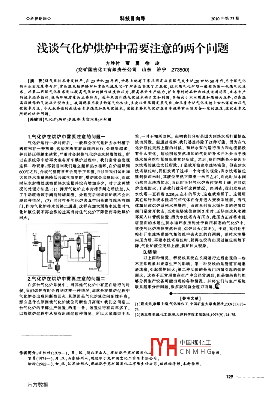 <科技論壇<科技月向?qū)?010年第23期淺談氣化爐烘爐中需要注意的兩個(gè)問題方勝付賈勇徐玲(兗礦國宏化工有限責(zé)任公司山東濟(jì)寧273500)[摘要]煤氣化技術(shù)開發(fā)較早,在20世紀(jì)20年代,世界上就有了常壓固定床層煤氣發(fā)生爐;20世紀(jì)50年代,用于煤氣化的加壓固定床魯奇爐、常壓溫克勒沸騰爐和常壓氣流床K-τ爐先后實(shí)現(xiàn)了工業(yè)化,這批煤氣化爐型一般稱為第一代煤氣化技術(shù)。而第二代煤氣化技術(shù)則以提高氣化爐的操作溫度和壓力,提高單爐生產(chǎn)能力,擴(kuò)大原料的品種和粒度適用范圍,改善生產(chǎn)的技術(shù)經(jīng)濟(jì)指標(biāo),提高環(huán)境質(zhì)量為主要特點(diǎn)。近年來國外煤氣化技術(shù)的開發(fā)和利用,多傾向于以水煤漿和煤粉為原料,以高溫高壓操作的氣流床爐型為主。我國現(xiàn)采用較多的煤氣化方法,主要以常壓固定層氣化、加壓魯奇爐氣化及德士古水堞漿加壓氣化技術(shù)為主。今天我要談的是德士古水煤漿加壓氣化技術(shù)。該技術(shù)要求氣化爐在開車投料前必須具備一定的溫度,這就是本文所說的烘爐問題。[關(guān)鍵詞]氣化爐;烘爐;水洗塔;真空閃蒸;水封槽1.氣化爐在烘爐中需要注意的問題一策,一時(shí)不知所以原。起初我們分析是因?yàn)轭A(yù)熱水泵打量情況氣化爐運(yùn)行一段時(shí)間后, -般都會在氣化爐去水封槽手波動(dòng)所致。 但通過觀察,我們迅速排除了這種可能。因?yàn)樵跉忾y前積存一些灰渣 .這些灰渣隨著系統(tǒng)的運(yùn)行.會越集越多,化爐 液位突然上漲的時(shí)候,預(yù)熱水泵的運(yùn)行壓力和電流都沒并且擠壓得越來越緊,嚴(yán)重時(shí)會封住氣化爐去水封槽管線。所有什么變化, 這說明這突然增加的氣化爐補(bǔ)水并不是由于預(yù)以在系統(tǒng)停車后再次準(zhǔn)備開車烘爐過程中,我們常常會發(fā)現(xiàn)熱水 泵突然打量情況非常好所致。之后,我們判斷是不是因?yàn)檫@樣一種現(xiàn)象:那就是當(dāng)我們建立起預(yù)熱水循環(huán),在爐溫烘到水洗塔 的液位太低所致,于是就開始建水洗塔液位。但在建水600C之后.合成氣溫度常常會高于正常值.并且當(dāng)我們試圖加洗塔液位時(shí) ,我們發(fā)現(xiàn)了這樣一個(gè)奇怪的現(xiàn)象:當(dāng)水洗塔液位大預(yù)熱水流量來降低合成氣溫度時(shí).烘爐就會出現(xiàn)回火,而此建釗快兩米時(shí) 其液位突然下降至- - 米五左右,而此時(shí)加水閥時(shí)從水封槽處觀察頒熱水流量并沒有增加多少。對于這種情仍然向 水洗塔加水,而此時(shí)正好氣化爐液位突然上漲并且烘況的處理方法是:(1)拆開氣化爐去水封槽手閥之后法蘭,人爐出現(xiàn)回火,于是我們就分析這種情況。經(jīng)調(diào)查,我們發(fā)現(xiàn)該工手動(dòng)疏通該手閥前所堵集渣,處理完后繼續(xù)烘爐就不會出水洗塔- 直有著 0.2Mpa左右的壓力,這也就難怪了。這說明現(xiàn)這種情況。(2) 同時(shí)打開氣化爐去真空閃蒸罐管線所有閥其它運(yùn)行系統(tǒng)水洗塔 氣相氣體在合并進(jìn)入變換系統(tǒng)前,有氣門,作為氣化爐排水的第二通道,這樣在加大預(yù)熱水流量時(shí)氣體漏到該烘爐 系列水洗塔內(nèi),而該系列灰水循環(huán)泵的進(jìn)出口化爐液位就不再會漲的過高而封住氣化爐下降管而導(dǎo)致烘爐閥門是常 開狀態(tài),當(dāng)水洗塔液位建到2米時(shí).正好到達(dá)灰水循回火。環(huán)泵入口管線位置.因?yàn)樗此?nèi)有壓力,此壓力正好將水洗塔里面的水通過灰水循環(huán)泵壓到處于負(fù)壓狀態(tài)的氣化爐中,致使氣化爐液位突然升高.烘爐回火(如圖)。于是.我們讓中i控打開水洗塔頂部氣相管線中去火炬的自調(diào)閥,泄掉水洗塔內(nèi)壓力后,再建水洗塔液位時(shí).就再也沒有出現(xiàn)過液位突然下降,氣化爐液位突然上漲.烘爐回火現(xiàn)象。3.結(jié)語以上兩種情況,都反映系統(tǒng)在長期運(yùn)行之后出現(xiàn)的一些不正?,F(xiàn)象對正常生產(chǎn)的影響。第一種反映的是管道盲端集渣堵塞,引起烘爐回火;第二種反映的是閥門內(nèi)漏引起的烘爐回火。這些不正?,F(xiàn)象在生產(chǎn)中會經(jīng)常遇到,但是如果我們能2.氣化爐在烘爐中需要注意的問題二夠分析生產(chǎn)設(shè)備可能出現(xiàn)的各種情況,并將它們與生產(chǎn)系統(tǒng)在多臺氣化爐系統(tǒng)中,當(dāng)其他氣化爐中有正在運(yùn)行的時(shí)聯(lián)系起來分析問題,很多疑問就會迎刃而解o候,我們烘爐有時(shí)會遇到這樣一種情況,那就是在烘爐過程中氣化爐會出現(xiàn)間斷性回火,其原因是氣化爐液位間斷性升高。[參考文獻(xiàn)]那么是什么原因使氣化爐液位間斷性升高呢?我們公司是三[1]聶成元,李罐主編.氣化操作工中國礦業(yè)大學(xué)出版杜,2009(1):73-臺氣化爐的甲醇生產(chǎn)裝置,兩用一備。裝置運(yùn)行有兩年多了,以前烘爐過程中從沒有出現(xiàn)過這種情況,所以大家都束手無[2]姚玉英主編化工原理天津科學(xué)技 術(shù)出觸19979);74-75.中國煤化工作者簡介:方勝付(1979- -),男,漢,湖北英山人,現(xiàn)就職于兗礦國宏化工MHCNMHG學(xué)歷。費(fèi)勇(1974- -),男,漢,山東滕州人,現(xiàn)就職于兗礦國宏化工有限責(zé)任公司徐玲(1982- -),女,漢,江蘇徐州人,現(xiàn)就職于兗礦國宏化工有限