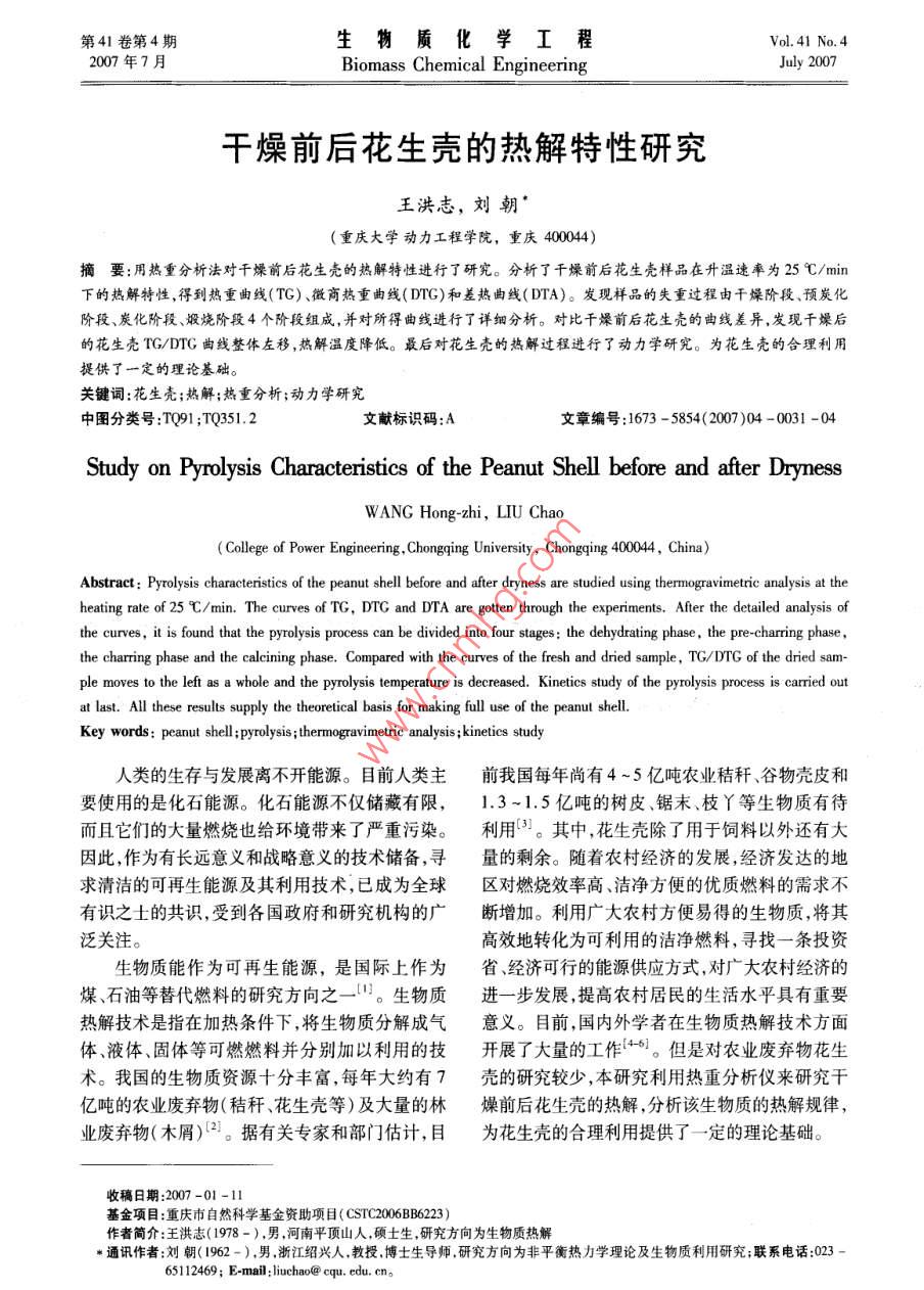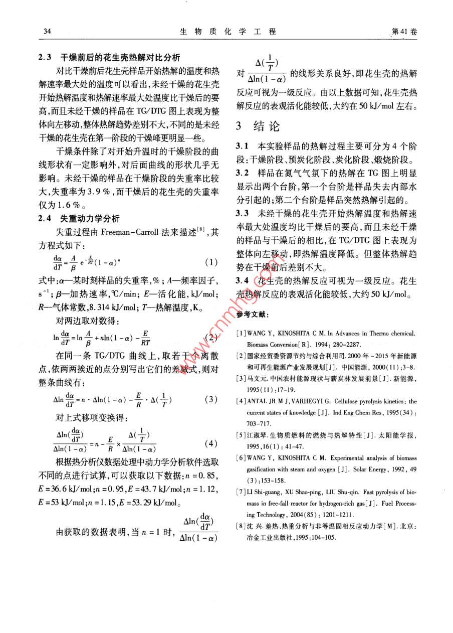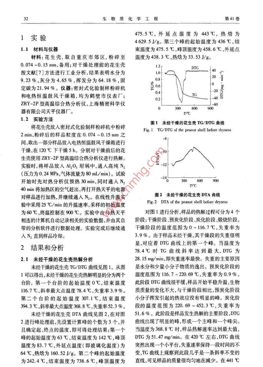 第41卷第4期生物質(zhì)化學(xué)工程Vol 41 No 4年7月Biomass Chemical EngineeringJuly 2007干燥前后花生殼的熱解特性研究王洪志,劉朝(重慶大學(xué)動力工程學(xué)院,重慶400044)摘要:用熱重分析法對干燥前后花生殼的熱解特性進行了研究。分析了干燥前后花生殼樣品在升溫速率為25℃/mi下的熱解特性,得到熱重曲線(TG)、微商熱重曲線(DTG)和差熱曲線(DTA)。發(fā)現(xiàn)樣品的失重過程由千燥階段、預(yù)炭化階段、炭化階段、煅燒階段4個階段組成,并對所得曲線進行了詳細(xì)分析。對比干燥前后花生殼的曲線差異,發(fā)現(xiàn)干燥后的花生殼TG/DrG曲線整體左移,熱解溫度降低。最后對花生殼的熱解過程進行了動力學(xué)研究。為花生殼的合理利用提供了一定的理論基礎(chǔ)。關(guān)鍵詞:花生殼;熱解;熱重分析;動力學(xué)研究中圖分類號:TQ91;TQ351.2文獻標(biāo)識碼:A文章編號:1673-5854(2007)04-0031-04Study on Pyrolysis Characteristics of the Peanut Shell before and after DrynessWANG Hong-zhi, LIU ChaoCollege of Power Engineering Chongging University, Chongqing 400044, China)Abstract: Pyrolysis characteristics of the peanut shell before and after dryness are studied using thermogravimetric analysis at theheating rate of 25C/min. The curves of TG, DtG and DTA are gotten through the experiments. After the detailed analysis ofthe curves, it is found that the pyrolysis process can be divided into four stages: the dehydrating phase, the pre-charring phaseing phase and the calcining phase. Compared with the curves of the fresh and dried sample, TG/DTG of the dried sample moves to the left as a whole and the pyrolysis temperature is decreased. Kinetics study of the pyrolysis process is carried outat last. All these results supply the theoretical basis for making full use of the peanut shell.Key words: peanut shell; pyrolysis; thermogravimetric analysis kinetics study人類的生存與發(fā)展離不開能源。目前人類主前我國每年尚有4~5億噸農(nóng)業(yè)秸稈、谷物殼皮和要使用的是化石能源?;茉床粌H儲藏有限,1.3~1.5億噸的樹皮、鋸末、枝丫等生物質(zhì)有待而且它們的大量燃燒也給環(huán)境帶來了嚴(yán)重污染。利用3。其中,花生殼除了用于飼料以外還有大因此,作為有長遠(yuǎn)意義和戰(zhàn)略意義的技術(shù)儲備,尋量的剩余。隨著農(nóng)村經(jīng)濟的發(fā)展,經(jīng)濟發(fā)達(dá)的地求清潔的可再生能源及其利用技術(shù),已成為全球區(qū)對燃燒效率高、潔凈方便的優(yōu)質(zhì)燃料的需求不有識之士的共識,受到各國政府和研究機構(gòu)的廣斷增加。利用廣大農(nóng)村方便易得的生物質(zhì),將其泛關(guān)注。高效地轉(zhuǎn)化為可利用的潔凈燃料,尋找一條投資生物質(zhì)能作為可再生能源,是國際上作為省、經(jīng)濟可行的能源供應(yīng)方式,對廣大農(nóng)村經(jīng)濟的煤、石油等替代燃料的研究方向之一"。生物質(zhì)進一步發(fā)展,提高農(nóng)村居民的生活水平具有重要熱解技術(shù)是指在加熱條件下,將生物質(zhì)分解成氣意義。目前,國內(nèi)外學(xué)者在生物質(zhì)熱解技術(shù)方面體、液體、固體等可燃燃料并分別加以利用的技開展了大量的工作4。但是對農(nóng)業(yè)廢棄物花生術(shù)。我國的生物質(zhì)資源十分豐富,每年大約有7殼的研究較少,本研究利用熱重分析儀來研究干億噸的農(nóng)業(yè)廢棄物(秸稈、花生殼等)及大量的林燥前后花生殼的熱解,分析該生物質(zhì)的熱解規(guī)律,業(yè)廢棄物(木屑)21。據(jù)有關(guān)專家和部門估計,目為花生殼的合理利用提供了一定的理論基礎(chǔ)。收稿日期:2007-01-11基金項目:重慶市自然科學(xué)基金資助項目(CSTC2006BB6223)作者簡介:王洪志(1978-),男,河南平頂山人,碩土生,研究方向為生物質(zhì)熱解*通訊作者劉朝(1962-),男浙江紹興人,教授博士生導(dǎo)師研究方向為非平衡熱力學(xué)理論及生物質(zhì)利用研究;聯(lián)系電話:02365112469;E-mail:liuchao@cqu.edu.cn生物質(zhì)化學(xué)工程第41卷1實驗475.5℃,外延點溫度為443℃,熱焓為4629.5Jg。第三個峰的起始溫度為436℃,結(jié)1.1材料與儀器束溫度為475.5℃,峰頂溫度為458.6℃,外延點材料:花生殼,取自重慶市郊區(qū),粉碎至溫度為438.3℃,熱焓為33.53J/g0.074~0.15mm,備用;對干燥處理前的花生殼DTG按文獻[7]方法進行工業(yè)分析,結(jié)果表明水分為923%,灰分為4.65%,揮發(fā)分為64.18%,固定碳為21.94%。儀器:密封式化驗制樣粉碎機和電熱恒溫鼓風(fēng)干燥箱,均為鶴壁市儀表廠;zRY-2P型高溫綜合熱分析儀,上海精密科學(xué)儀器有限公司天平儀器廠。1.2實驗方法圖1未經(jīng)干燥的花生殼TG/DTG曲線將花生殼放入密封式化驗制樣粉碎機中粉碎Fig 1 TG/DTG of the peanut shell before dryness2min,粉碎后的樣品粒度在0.074~0.15mm之間,取出一部分樣品放入電熱恒溫鼓風(fēng)干燥箱進行干燥,在120℃下干燥5h。分別對干燥前后的花生殼使用ZRY-2P型高溫綜合熱分析儀進行熱解。實驗時,將樣品放入Al2O3坩堝中,通入高純N2(壓力為024MPa,氣體流量為80mL/min)。試驗開始時先對熱分析儀預(yù)熱30min,同時通入N30040min將加熱區(qū)的空氣趕出,再打開熱天平的電源對樣品進行加熱,并繼續(xù)通入N2。在線性升溫實圖2未經(jīng)干燥的花生殼DTA曲線驗中采用25℃/min的升溫速率,采樣的初始溫度Fig 2 DTA of the peanut shell before dryness為60℃,終溫控制在900℃。實驗中由與熱天平對圖1進行分析,樣品的熱解過程可分為
