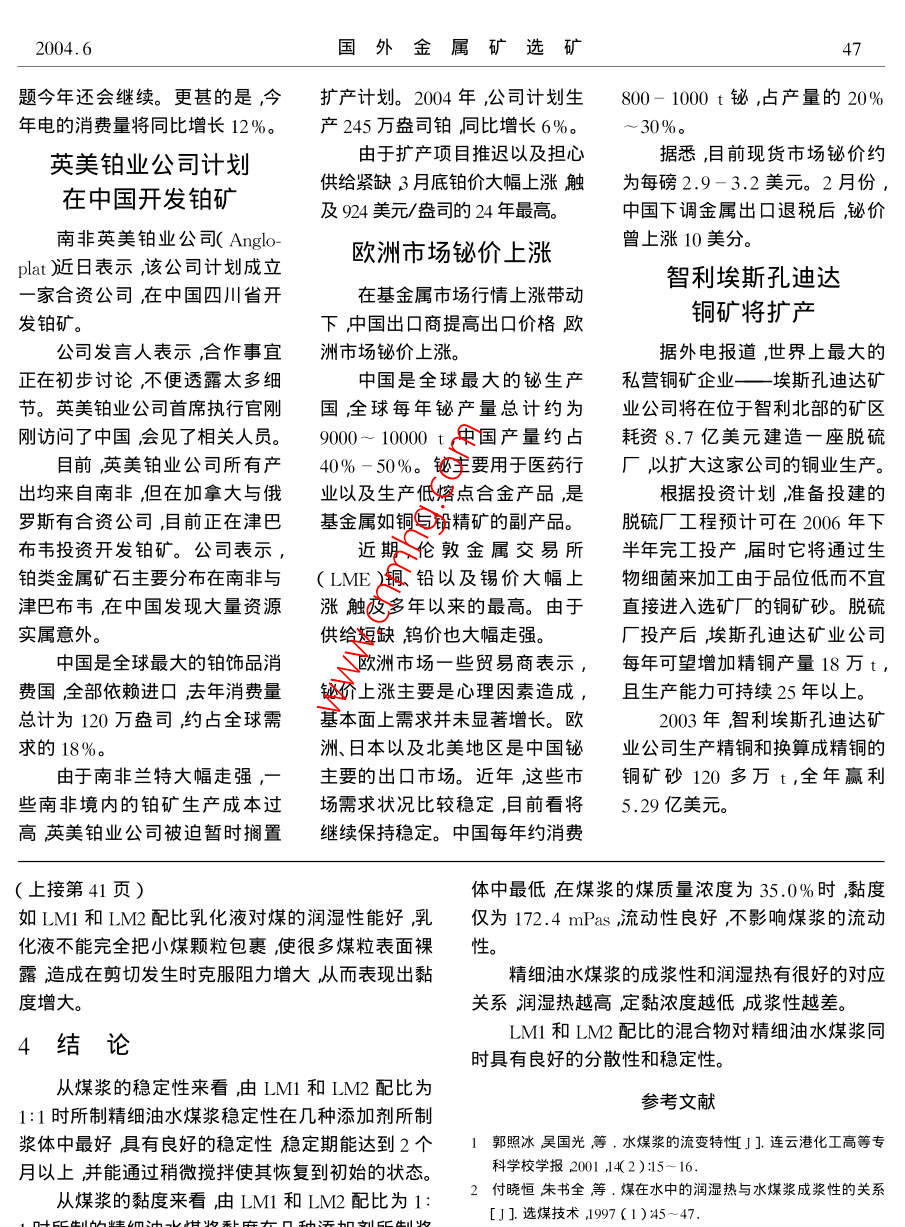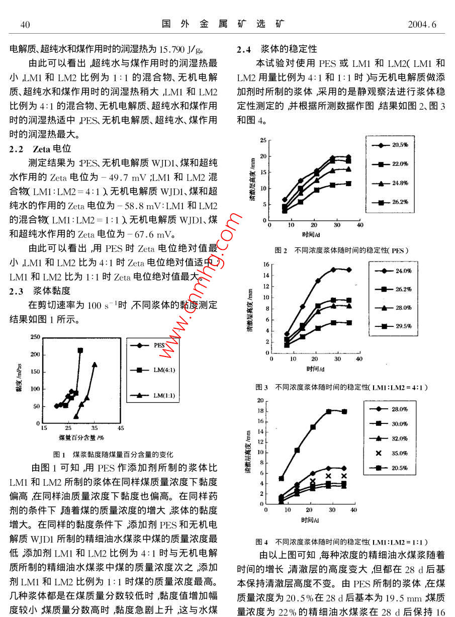 2004.6國外金屬礦選礦精細油水煤漿漿體特性研究劉萬峰劉樹華↓付曉恒3摘要利用幾種表面活性劑及其電解質制備了精細油水煤漿并主要針對漿體的流變特性及其穩(wěn)定性進行了研究。關鍵詞油水煤漿流變性穩(wěn)定性添加劑序言本次研究中采用以下四種添加劑添加劑PES非離子表面活性劑LMI和LM2及無機電解質眾所周知煤漿技術是潔凈煤技術的一項重要wDl。按不同比例將煤、輕質柴油、添加劑和水混內容。精細油水煤漿三元混合燃料克服了油煤漿的合制漿制成的漿體成分如表1~表3所示。黏度高、成本高以及水煤漿熱值低的缺點。因而目表1用PFS+wJD1添加劑制成的漿體成分前國內外對油水煤三元混合燃料的研究日益高漲煤質量/%油質量/%水質量/%添加劑質量/%該三元混合燃料有著廣闊的發(fā)展前景。本文主要制20.520.31.3備了一種輕油、水和精細煤粉三元混合燃料對于液1,319.21.3態(tài)混合燃料其流變性、穩(wěn)定性是至關重要的,它們18.71,3決定著燃料的霧化和燃燒特性。因此文中重點研表2用LM與LMx4:添加劑制成的漿體的成分究了三元混合體系的流變性和穩(wěn)定性。煤質量濃度油質量濃度水質量濃度添加劑質量濃度1試驗物料和方法/%24,01.1試驗物料.253.828,0l8.3試驗中采用大同煤樣。精細油水煤漿所用藥品有表面活性劑PES表面活性劑LM1、表面活性劑LM2、無機電解質WJD1和無機電解質WJD2。研表3用IMI1與IMx1:1加劑制成的漿體成分究中還應用了輕質柴油、自來水和超純水煤質量/%油質量/%水質量/%添加劑質量/%1.2試驗方法28.018.31.3先將一定比例的添加劑、水和柴油的混合物在17.7高速攪拌器中攪拌一定時間使其充分乳化攪拌一17.247.316.4段時間后再將一定質量的精細煤粉加入攪拌數分鐘后即形成油水煤漿。制漿完畢用Hake旋轉黏度計測其流體黏度繪出精細煤漿黏度分析圖。將制2試驗結果備好的煤漿放入一容器內靜置采用靜置觀察法進2.1潤濕熱行穩(wěn)定性的測定。用微熱量儀 SETARAMC8OD測測定結果為超純水與煤作用時的潤濕熱為出其選用藥劑與原有藥劑與煤作用熱量所發(fā)生的變11.424J/gPES無機電解質、超純水、煤作用時的化。用Zeta電位儀分析選用的藥劑與煤作用時電潤濕熱為17.97J/g;LMl和LM2比例為4:1的混位的變化情況。合物、無機電解質、超純水和煤作用時的潤濕熱為1.3油水煤漿成份16.346J/gM1和IM比例為1:1的混合物無機國外金屬礦選礦2004.6電解質超純水和煤作用時的潤濕熱為15.790J/g2,4漿體的穩(wěn)定性由此可以看出超純水與煤作用時的潤濕熱最本試驗對使用PES或LM1和LM2(LM1l和小LM1和LM2比例為1:1的混合物、無機電解LM2用量比例為4:1和1:1時)無機電解質做添質、超純水和煤作用時的潤濕熱稍大LM1和LM2加劑時所制的漿體采用的是靜觀察法進行漿體穩(wěn)比例為4:1的混合物、無機電解質、超純水和煤作用定性測定的并根據所測數據作圖結果如圖2圖3時的潤濕熱適中PES無機電解質、超純水煤作用和圖4時的潤濕熱最大2.2Teta電位20.5%測定結果為PES無機電解質WJDl煤和超純一—20%水作用的Zeta電位為-49.7mVLM和LM2混一248%合物LM1:LM2=4:1)無機電解質wI1煤和超純水的作用的Zeta電位為-58.8mV:LM1和LM2一262%的混合LM1:LM2=1:1)無機電解質wJDl煤和超純水作用的Zeta電位為-67.6mV。時間由此可以看出用PES時Zeta電位絕對值最圖2不同濃度漿體隨時間的穩(wěn)定性(PES)小M1和LM2比為4:1時zeta電位絕對值適中;LM1和LM2比為1:1時Zeta電位絕對值最大2.3漿體黏度6420240926.2%在剪切速率為100s-1時不同漿體的黏度測定結果如圖1所示。295%一LM(4:1)圖3不同濃度漿體隨時間的穩(wěn)定性LMI:LM2=4:1)LM(:1)煤量百分含量隔%一320%圖1煤漿黏度隨煤量百分含量的變化由圖1可知用PS作添加劑所制的漿體比4205%LMI和LM所制的漿體在同樣煤質量濃度下黏度偏高在同樣油質量濃度下黏度也偏高。在同樣藥劑的條件下隨著煤的質量濃度的增大漿體的黏度增大。在同樣的黏度條件下添加劑PES和無機電時間l解質wJD所制的精細油水煤漿中煤的質量濃度最圖4不同濃度漿體隨穩(wěn)定性LM:LM2=1:1低添加劑LM1和LM2比例為4:1時與無機電解由以上圖可知每種濃度的精細油水煤漿隨著質所制的精細油水煤漿中煤的質量濃度次之添加時間的增長清澈層的高度變大但都在28d后基劑LM1和LM比例為1:1時煤的質量濃度最高。本保持清澈層高度不變。由PES所制的漿體在煤幾種漿體都是在煤質量分數較低時,黏度值增加幅質量濃度為20.5%在28d后基本為19.5mm煤質度較小煤質量分數高時黏度急劇上升這與水煤量濃度為2%的精細油水煤漿在28d后保持162004.6國外金屬礦選礦4128d后保持15.5mm不變煤質量濃度為26.2%的與煤作用時的Zeta電位最小,LM和LM2比為4精細油水煤漿在28d后保持11mm不變。由LM11的混合乳化液與煤作用時的Zeta電位小于LMI和LM2比例為4:1時所制的漿體在煤質量濃度為和LM2比為1:1的混合乳化液與煤作用時的Zeta24.0%在28d后基本為15mm到兩個月之后達到電位,所以由PES所制漿體的穩(wěn)定性能最差,由l8mm煤質量濃度為26.2%旳精細油水煤漿在28LM和LM所做的漿體中后者的穩(wěn)定性比前者的d后保持9.5mm不變在2個月后達到10mm煤穩(wěn)定性能強。各種乳化液與煤作用的zeta電位之質量濃度為28.0%的精細油水煤漿在28d后保持所以出現這種差異主要是由于PES對OH的吸5.5mm不變兩個月之后達到6mm;煤質量濃度附不如LM和LM2組成的混合添加劑對OH的為29.5%的精細油水