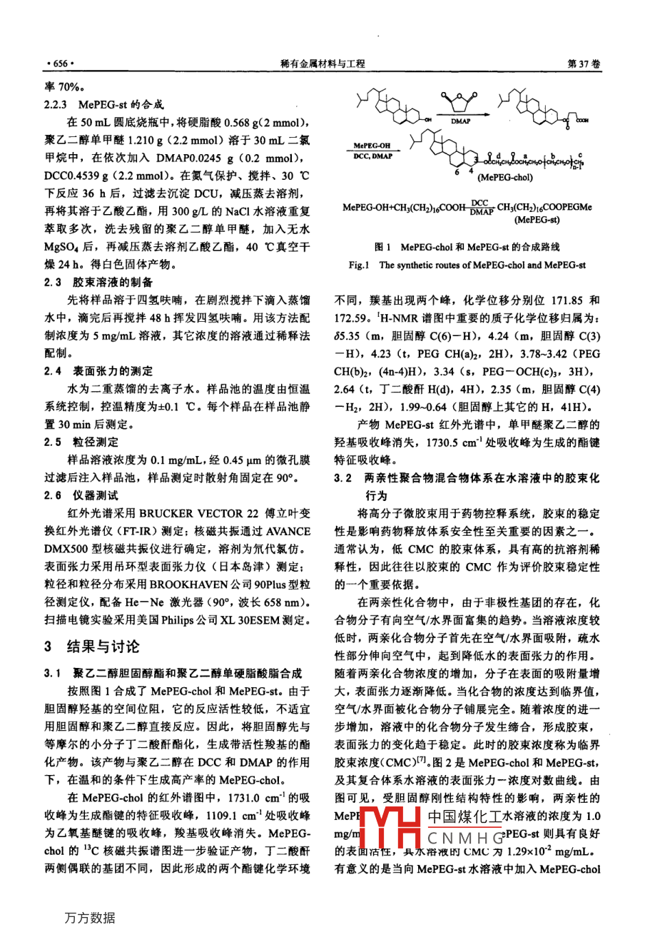 第37卷增刊2稀有金屬材料與工程VoL37, Suppl.22008年5月RARE METAL MATERIALS AND ENGINEERINGMay 2008新型聚乙二醇單酯復合膠束的制備及性能研究錢曉倩',賴俊英1,2, 詹樹林',張潔”, 王利群2,涂克華2(1.浙江大學建筑工程學院,浙江杭州310027)(2.浙江大學高分子科學研究所,浙江杭州310027)摘要: 以二環(huán)已基碳酰亞胺N,N-二甲基氨基吡啶為偶聯(lián)劑,酯化縮合了聚乙二醇單膽固醇酯(MePEG-chol) 和聚乙二醇單硬脂酸酯(MePEG-st), 并利用紅外和核磁對產(chǎn)物結構進行了表征。采用表面張力法研究了MePEG-chol和MePEG-st溶液的膠束化行為。結果表明在MePEG-st的水溶液中加入MePEG -chol可以顯著地降低MePEG-st溶液的臨界膠柬濃度(CMC).當MePEG-cho!和MePEG-st以0.2摩爾比混合時,形成的復合膠束體系的CMC最小,表明膠束體系最穩(wěn)定。動態(tài)光散射及透射電子顯微鏡測試表明復合體系形成粒徑在10 nm左右,分布狹窄,形貌呈球形的微膠東粒子。與細胞膜中膽固醇通過嵌入磷脂疏水層達到穩(wěn)定細胞膜的現(xiàn)象類似,本文中制備的MePEG-Chol 中的膽固醇嵌入到MePEG-St的疏水脂肪層,構成了膠束中疏水的復合內(nèi)核,從而提高了復合膠束的穩(wěn)定性。關鍵詞:聚合物膠束,膽固醇,硬脂酸,藥物控釋中圈法分類號: TQ420文獻標識碼: A文章編號: 1002-185X(2008)S2-655-04化工股份有限公司,經(jīng)乙酸乙酯重結晶.其余試劑均1引言為分析純,按常規(guī)方法純化后使用。脂質體是一種已用于臨床的藥物載體,通過改變2.2聚乙二醇膽固醇 酯和聚乙二醇單硬脂酸脂合成藥物的藥代動力學和生物分布率而大大提高了藥物的2.2.1 膽固醇丁二酸酐衍生物的合成療效。但是脂質體載藥系統(tǒng)具有穩(wěn)定性差和易被網(wǎng)狀在50 mL單口圓底燒瓶中,將膽固醇1.95 g (5內(nèi)皮系統(tǒng)捕捉的缺陷(1.2]。盡管已有很多關于PEG改mmol)、丁二酸酐0.625g (5 mmol)溶于25 mL二嚅性磷脂以及寡聚糖改性膽固醇的仿脂質體膠束體系的烷中,0.62 g (5 mmol) DMAP配成5 mL的二囈烷溶研究[-0,但是,從細胞脂膜結構中膽固醇和磷脂的相液,滴加入反應液,再滴加700 μL三乙胺,室溫千燥互作用,以及從膽固醇對細胞膜磷脂層所起的穩(wěn)定作氮氣保護下,攪拌反應24 h.反應后減壓蒸發(fā)除去溶用的角度,研究PEG-脂肪酸和PEG-膽固醇的復合膠劑,加入30 mL蒸餾水形成乳狀液,用1 mol/L的HCI束體系方面的工作鮮有報道。本文合成了聚乙二醇單溶液滴定到pH為5~6,得到白色絮狀沉淀,過濾。50膽固醇酯(MePEG-chol) 與聚乙二醇單硬脂酸酯C真空干燥至恒重。得產(chǎn)物膽固醇丁二酸酐衍生物,(MePEG-st),利用表面張力和動態(tài)光散射等方法考為乳白色固體,產(chǎn)率90%。察了兩親性膽固醇酯對兩親性硬脂酸酯膠東體系的膠2.2.2 MePEG-chol 的合成束化行為的影響,得到了對該類仿脂質體藥物載體有在100 mL單口圓底燒瓶中,將聚乙二醇單甲醚意義的研究結果。3g (Mw= 550, 5.454 mmol)、 膽固醇丁二酸酐衍生物3.98g (8.18 mmol)溶于50 mL二氯甲烷中,再加.2實驗入DMAP 0.0803 g (0.6545 mmol). DCC 1.688 g(8.182.1 原料mmol)。室溫干燥的氮氣保護下,攪拌反應24 h.反二環(huán)己基碳酰二亞胺( Dicyclohexyl carbodimide,應后過濾除去二環(huán)己基脲(DCU),減壓蒸餾除去溶DCC)、聚乙二醇單甲醚(Mw=550)和膽固醇,分劑后溶于四氫呋喃,用冷乙醚沉淀,靜置棄去清液(重析純,均購自Acros 公司。4-二甲氨基吡啶復4次),除去過量的膽固醇丁二酸酐衍生物,得到產(chǎn)(N,N'-Dimetbyl aminopyridine, DMAP), 湖南海利物在60 C真空干燥恒重.產(chǎn)物為半透明膏狀體,產(chǎn)中國煤化工收稿日期: 2007-11-22基金項目:國家自然科學基金資助(20474055)YHCNMH G通訊作者:賴俊英,女,博士,浙江大學建筑工程學院,浙江杭州310027,電話: 0571-87951397, E-mail: junyinglai@zju.edu.cn●656●稀有金屬材料與工程第37卷率70%。2.2.3 MePEG-st 的合成在50mL圓底燒瓶中,將硬脂酸0.568g(2mmol),DMAP聚乙二醇單甲醚1.210g (2.2 mmol)溶于30 mL二氯甲烷中,在依次加入DMAP0.0245 g (0.2 mmol),DCC,DMAPDCC0.4539 g (2.2 mmol)。在氮氣保護、攪拌、30 C(MePEG- chol)下反應36 h后,過濾去沉淀DCU,減壓蒸去溶劑,再將其溶于乙酸乙酯,用300 g/L的NaCl水溶液重復MePEG-0H+CH;(CH2)16CO0H DMAP CH:(CH2)6COOPEGMe(MePEG-st)萃取多次,洗去殘留的聚乙二醇單甲醚,加入無水MgSO4后,再減壓蒸去溶劑乙酸乙酯,40 C真空干圖1 MePEG-chol 和MePEG-st的合成路線燥24h.得白色固體產(chǎn)物。Fig.1 The synthetic routes of MePEG-chol and MePEG-st2.3 膠束溶液的制備先將樣品溶于四氫呋喃,在劇烈攪拌下滴入蒸餾不同,羰基出現(xiàn)兩個峰,化學位移分別位171.85 和水中,滴完后再攪拌48 h揮發(fā)四氫呋喃。用該方法配172.59。H-NMR譜圖中重要的質子化學位移歸屬為:制濃度為5 mg/mL溶液,其它濃度的溶液通過稀釋法85.35 (m,膽固醇C(6)-H), 4.24 (m,膽固醇C(3)配制。-H), 4.23 (t, PEG CH(a)2, 2H), 3.78~3.42 (PEG2.4 表面張力的測定CH(b)2, (4n-4)H), 3.34 (s, PEG- 0CH(C)3, 3H),水為二重蒸餾的去離子水。樣品池的溫度由恒溫2.64 (t,丁二酸酐H(d), 4H), 2.35 (m,膽固醇C(4)系統(tǒng)控制,控溫精度為+0.1 C.每個樣品在樣品池靜- H2, 2H), 1.99~0.64 (膽固醇上其它的H, 41H).置30 min后測定。產(chǎn)物MePEG-st紅外光譜中,單甲醚聚乙二醇的2.5 粒徑測定.羥基吸收峰消失,1730.5 cm^' 處吸收峰為生成的酯鍵樣品溶液濃度為0.1 mg/mL,經(jīng)0.45 μm的微孔膜特征吸收峰。過濾后注入樣品池,樣品測定時散射角固定在90%.3.2兩親性聚合物混合