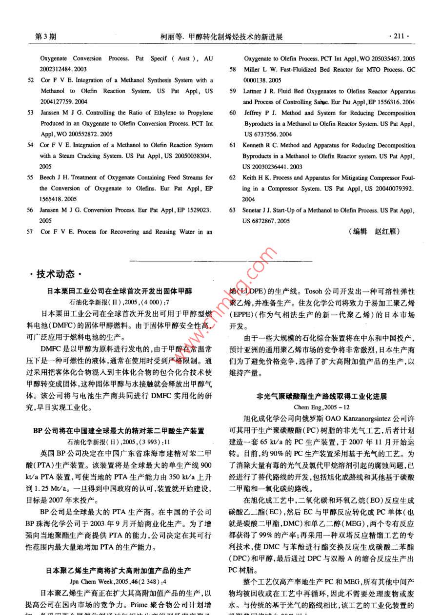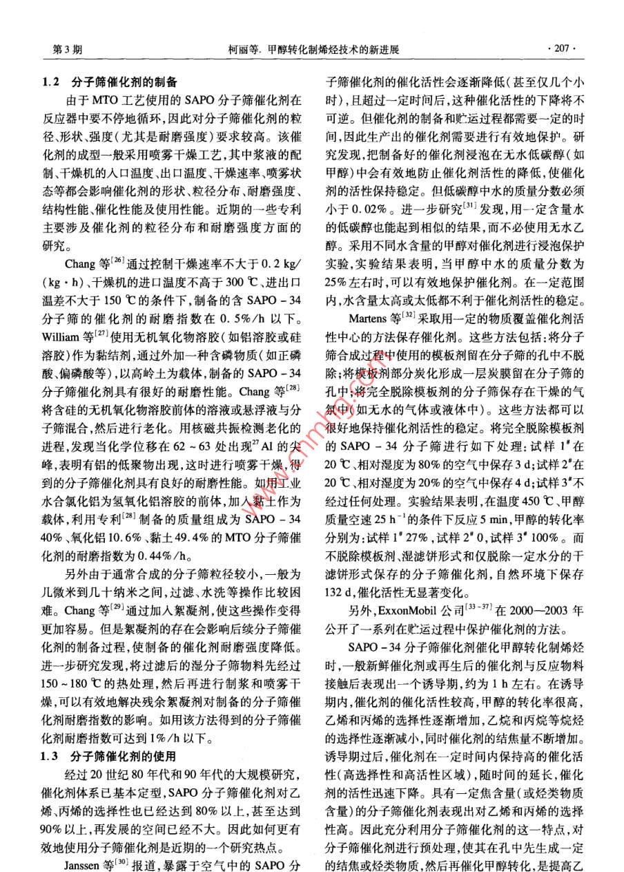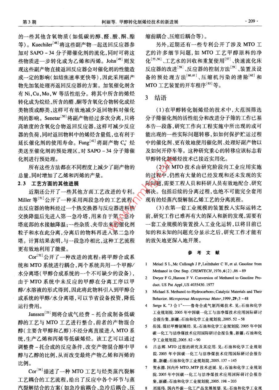 石油化工2006年第35卷第3期PETROCHEMICAL TECHNOLOGY.205.特約述評甲醇轉化制烯烴技術的新進展柯麗,馮靜,張明森(中國石油化工股份有限公司北京化工研究院,北京100013)[摘要]從分子篩催化劑和工藝(包括UOP公司的甲醇制烯烴( MTO)技術、Lurgi公司的甲醇制丙燦( MTP)技術ExxonMobil公司提出的含氧化合物制烯烴(OTO)技術)兩方面綜述了近年來國外- - 些大公司在甲醇轉化制烯烴方面的研究進展,分析了未來可能的發(fā)展動向。[關鍵詞]甲醇;分子篩催化劑;乙烯;丙烯;低碳烯烴[文章編號] 1000 -8144(2006)03 -0205 -07[中圖分類號] TQ 221.2[文獻標識碼] AAdvances in Catalytic Conversion Process of Methanol to Light OlefinsKe Li,Feng Jing ,Zhang Mingsen( Bejjig Research Institute of Chemical Industry, SINOPEC, Beijing 1003 ,China)[ Abstract ] Some recent researches and their results for catalytic conversion of methanol to lightolefins , namely ethylene , propylene etc. on molecular sieve catalysts were reviewed. Synthesis of themolecular sieves , preparation of the catalysts , and development of the process were introduced. Somesuggestions for development of the technology were proposed.[ Keywords ] methanol ; molecular sieve catalyst;ethylene ; propylene ; light olefins甲醇或二甲醚催化轉化制乙烯、丙烯等低碳烯展進行綜述,以期分析他們在該領域中近期的研究烴技術的研究始于1976年[1,21 ,UOP和ExxonMobil動向及可能存在的技術問題。除特別指明外,本文等一些大的石化公司一直在研究甲醇轉化制烯烴。所述甲醇轉化制烯烴技術泛指甲醇或其他低碳含氧由于石油價格--直較低,以煤和天然氣為原料經甲化合物經分子篩催化劑催化轉化制乙烯、丙烯、丁烯醇制乙烯、丙烯等低碳烯烴,在經濟上始終無法與傳等低碳烯烴的技術,包括UOP公司的甲醇制烯烴統(tǒng)的石油路線競爭。因此該技術的研究開發(fā)- -直未(MTO)技術、Lurgi公司的甲醇制烯烴(MTP)技引起世人的關注。甚至在石油化工界,長期以來也術、ExxonMobil公司的含氧化合物制烯烴(0TO)未對該技術給予足夠的重視。直到近年來開始的新技術。-輪石油漲價,甲醇轉化制烯烴技術才真正引起世1分 子篩催化劑的研究進展人的關注。尤其是我國缺油、少氣、富煤的現狀,使大家對該技術更加寄厚望。又因我國的經濟正處甲醇轉化制烯烴所用的催化劑以分子篩為主要于高速發(fā)展的頂峰時期,社會對基礎化工原料以及活性組分,以氧化鋁、氧化硅、硅藻土、高嶺土等為載能源的需求全面增加,而生產能力又相對不足,造成體,在黏結劑等加工助劑的協同作用下,經加工成聚乙烯、聚丙烯等基礎化工原料全面短缺,價格暴型、烘干、焙燒等工藝制成分子篩催化劑,分子篩的漲,利潤空間加大。因此,甲醇轉化制烯烴技術成為性質、合成工藝、載體的性質、加工助劑的性質和配研究熱點。關于甲醇轉化制烯烴技術的發(fā)展歷史、技術可[收藊日期] 2005-11 -01;[修改稿日期] 2005-11-22。行性分析、經濟可行性評估等方面的報道[3-10)已有[作者簡介]柯麗(1963- -) ,女,河北省青縣人,碩士,高級工程師。很多。本文旨在從催化劑和工藝兩方面對國外- -些聯系人:張明森,電話010 - 64216131 - 2712.電郵zhangmingsen@大公司在甲醇轉化制烯烴技術領域近年來的研究進brici. ac. cn。石由七L●206●PETROCHEMICAL TECHNOLOGY2006年第35卷方、成型工藝等各因素對分子篩催化劑的性能都會SAPO-18 ~ SAPO-34分子篩的混合物。如將.產生影響。2.0 g硅源加到8.0g AIPO(磷鋁非沸石分子篩)多1.1分 子篩催化劑的研究孔物質中,然后加入14 g質量分數為35%的四乙基早期甲醇轉化制烯烴的研究主要以ZSM -5氫氧化銨和5g水,充分混合后加入0.35g HCI溶等中孔分子篩作為催化劑。由于這些分子篩的孔液,在210 C時放置72 h結晶,得到純凈的SAPO -徑相對較大,得到的主要產物為丙烯及C;烴類,34分子篩。同時芳烴的含量較高。以此為基礎發(fā)展了以LurgiGuth等[2]用嗎啉和HF作模板劑成功合成了公司為主的甲醇制丙烯的MTP工藝-13]。1984SAPO -34分子篩。Cao等[2)]避開高毒性的HF,用年,UC公司發(fā)明了孔徑更小的硅磷鋁非沸石分子可以在系統(tǒng)中釋放出F~的化合物(如NH,PF。和篩(簡稱SAPO分子篩)[4]。這類分子篩的孔徑比NaPF等)作為輔助模板劑也成功地合成了硅含量ZSM-5分子篩更小(0.4 nm左右),用于甲醇轉低的SAPO系列分子篩?;葡N,產物中乙烯、丙烯等低碳烯烴的含量顯分子篩的粒徑是合成分子篩催化劑的一個重要著增加,Cξ組分的含量顯著減少,且?guī)缀鯖]有芳烴因素,一般小粒徑的分子篩由于孔道短,內擴散的行生成。由此發(fā)展成了以UOP公司和Norsk Hydro程短,有利于提高分子篩催化劑的表觀活性和乙烯、公司為主的甲醇制烯烴(MTO)技術[19,16)。丙烯的選擇性。Machteld 等(1] 報道了一種專門制ExxonMobil公司曾是甲醇制烯烴研究的發(fā)明者,但備小粒徑SAPO分子篩的方法。采用傳統(tǒng)水熱法合后來一度停止研究。近年來又開始進人該領域并做成分子篩:先將硅源溶于有機堿形成溶液,然后再與了大量工作,,并將以前主要以甲醇或二甲醚為原料其他物料混合。如將硅溶膠(質量分數為40%的水的工藝擴展到其他低碳醇、醚、酮、酯等化合物,使用溶液)先與四憶基氫氧化銨(質量分數為35%的水SAPO -34分子篩為催化劑,提出了含氧化合物制溶液)混合,加熱到100 C保持12 h形成溶液,然后烯烴的OTO工藝[17-20]。分子篩的研究主要集中在20世紀80年代和再加入鋁源磷酸、二丙胺(DPA)等,在175 