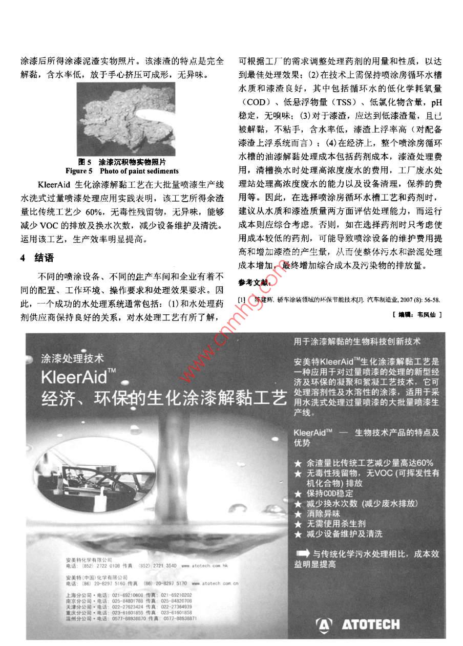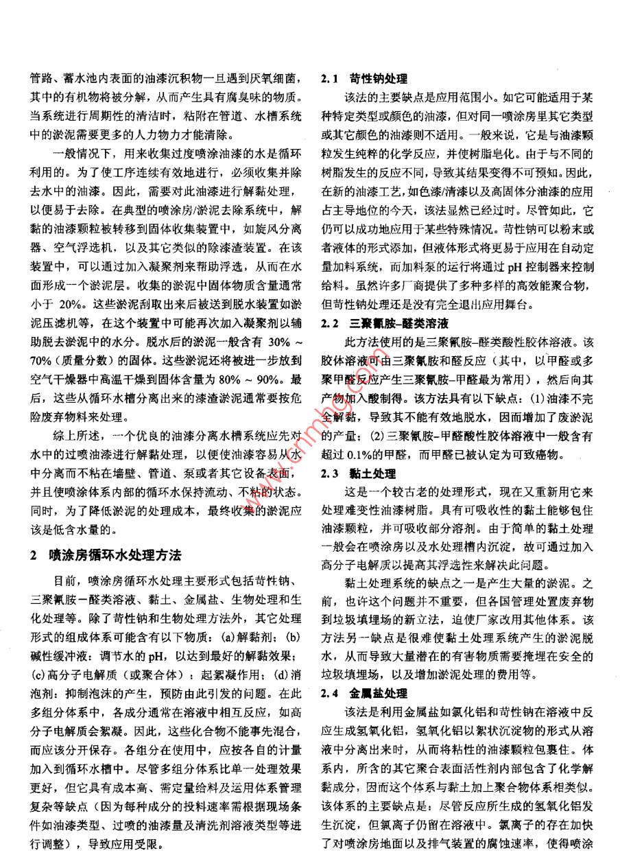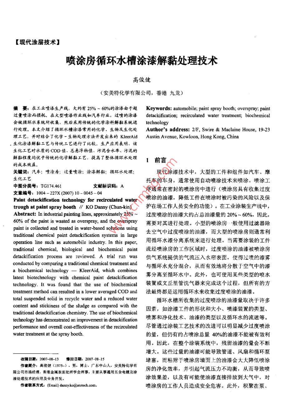 [現(xiàn)代涂層技術(shù)]噴涂房循環(huán)水槽涂漆解黏處理技術(shù)高俊健(安美特化學(xué)有限公司,香港九龍)摘要:在工業(yè)噴漆生產(chǎn)線,大約有25% ~ 60%的涂漆由于超Keywords: autormobile; paint spray booth; overspray; paint過(guò)量噴涂而損耗。在大型噴漆作業(yè)線如汽車行業(yè),過(guò)噴的涂漆detackification; recirculated water treatment; biochemical會(huì)被循環(huán)水系統(tǒng)所收集,然后采用傳統(tǒng)的化學(xué)涂料解黏系統(tǒng)進(jìn)technology行處理。本文介紹了循環(huán)水槽涂漆常用的化學(xué)、生物及生化處Author's address: 2/F, Swire & Maclaine House, 19-23理工藝,并對(duì)結(jié)合了化學(xué)-生物處理方法開發(fā)出來(lái)的KleerAidAustin Avenue, Kowloon, Hong Kong, China生化涂漆解黏工藝與傳統(tǒng)工藝進(jìn)行了比較,生產(chǎn)應(yīng)用表明,該生化工藝對(duì)水質(zhì)的COD值??倯腋∥镏怠⑽刍旌?、污泥的解黏程度均優(yōu)于傳統(tǒng)的化學(xué)解黏工藝,提高了整體循環(huán)水處理1前言的成本效益.關(guān)鍵詞:汽車;噴涂房;過(guò)量噴涂; 涂漆解黏;循環(huán)水處理;現(xiàn)代涂漆技術(shù)中,大型的工件和組件如汽車,摩生化工藝托車的車身,通常使用自動(dòng)噴涂技術(shù)來(lái)噴涂。噴涂工中圖分類號(hào): TG174.461文獻(xiàn)標(biāo)識(shí)碼: A序通常在密封的噴涂房中進(jìn)行(噴涂房具有收集過(guò)度文章編號(hào): 1004 -227X (2007) 10- 0045 - 04Paint detackification technology for recirculated water噴涂的油漆,降低工件在噴涂時(shí)被污染的風(fēng)險(xiǎn)以及保trough at paint spray booth // KO Dany (Chun-kin)護(hù)在場(chǎng)工作人員安全的功能)。在工業(yè)涂裝生產(chǎn)線中,Abstract: In industrial painting lines, approximately 25% ~過(guò)度噴涂的油漆大約占總油漆量的20%~ 60%,因此,60% of the paint is wasted as overspray, and the overspray需要對(duì)其進(jìn)行處理。小型的噴涂房".般使用過(guò)濾器除paint is collected and treated in water-based solutions using去空氣中過(guò)度噴涂的油漆,而大型的噴涂房則通常利traditional chemical paint detackification systems in largeoperation line such as automobile industry. In this paper,用循環(huán)水漆分離系統(tǒng)來(lái)進(jìn)行處理。當(dāng)需要涂裝的工件traditional chemical, biological and biochemical paint流經(jīng)噴涂房的工作區(qū)域時(shí),過(guò)度噴涂的油漆被噴涂房detackification process are reviewed. A trial run was供氣系統(tǒng)提供的氣流壓入水簾表面,使得過(guò)噴的漆霧conducted by comparing a traditional chemical treatment and與循環(huán)水充分混合,從而有效地將分散于空氣中的漆a biochemical technology- KleerAid, which combines霧分離至循環(huán)水中。此外,也可使用某些類型的噴水latest biotechnology with chemical paint detackificationtechnology. It was found that the use of biochemical裝置或文丘里管洗氣器來(lái)完成這個(gè)過(guò)程,但所有的方treatment method can resulted in a lower averaged COD and法最終都是運(yùn)用循環(huán)水來(lái)收集過(guò)度噴涂的油漆。total suspended solid in recycle water and a reduced water循環(huán)水槽所收集的過(guò)度噴涂的油漆量取決于許多content and stickiness of the sludge as compared with the因素,如涂漆工件的形狀和大小、噴漆裝置的類型、traditional detackification chemistry. The use of biochemicaltechnology has demonstrated an improvement in detackification噴霧和凈化技術(shù)、油漆的類型以及循環(huán)水的流速等。performance and overall cost effectiveness of the ecirculated盡管通過(guò)涂裝工藝技術(shù)的改進(jìn)可以明顯減少過(guò)度噴涂water treatment at the spray booth.的量,但仍有約占噴涂總量40%的油漆不能被有效利用。因此,在整個(gè)涂裝系統(tǒng)中,殘留油漆的量會(huì)不斷增大。這些過(guò)量的油漆可能導(dǎo)致管道、風(fēng)扇和循環(huán)泵收稿日期: 2007-08-13修回日期: 2007 08-15堵塞,而粘附于噴涂房墻面上的油漆會(huì)大大降低噴涂作者簡(jiǎn)介:高俊健<1975-). 男,博土,廣東中山人,安美特化學(xué)有房的凈化效率,并引起氣流壓力不均衡,從而導(dǎo)致噴限公司市場(chǎng)經(jīng)理,香港金屬表面處理學(xué)會(huì)理事,主要從事通用五金電鍍及涂漆處理技術(shù)的應(yīng)用及業(yè)務(wù)開發(fā)。涂效果差,以及有可能使油漆直接排放到大氣中,對(duì)作者聯(lián)系方式: (Erai) dunay ko@atotech.com.噴涂房的工作人員造成安全危害。此外,積聚在泵,管路、蓄水池內(nèi)表面的油漆沉積物一旦遇 到厭氧細(xì)菌,2.1苛性鈉處理其中的有機(jī)物將被分解,從而產(chǎn)生具有腐臭味的物質(zhì)。該法的主要缺點(diǎn)是應(yīng)用范圍小。如它可能適用于某當(dāng)系統(tǒng)進(jìn)行周期性的清潔時(shí),粘附在管道、水槽系統(tǒng)種特定類型或顏色的油漆,但對(duì)同- -噴涂房里其它類型中的淤泥需要更多的人力物力才能清除?;蚱渌伾挠推釀t不適用。-般來(lái)說(shuō),它是與油漆顆一般情況下, 用來(lái)收集過(guò)度噴涂油漆的水是循環(huán)粒發(fā)生純粹的化學(xué)反應(yīng),并使樹脂皂化。由于與不同的利用的。為了使工序連續(xù)有效地進(jìn)行,必須收集并除樹脂發(fā)生的反應(yīng)不同,導(dǎo)致其結(jié)果變得不可預(yù)知。因此,去水中的油漆。因此,需要對(duì)此油漆進(jìn)行解黏處理,在新的油漆I藝,如色漆