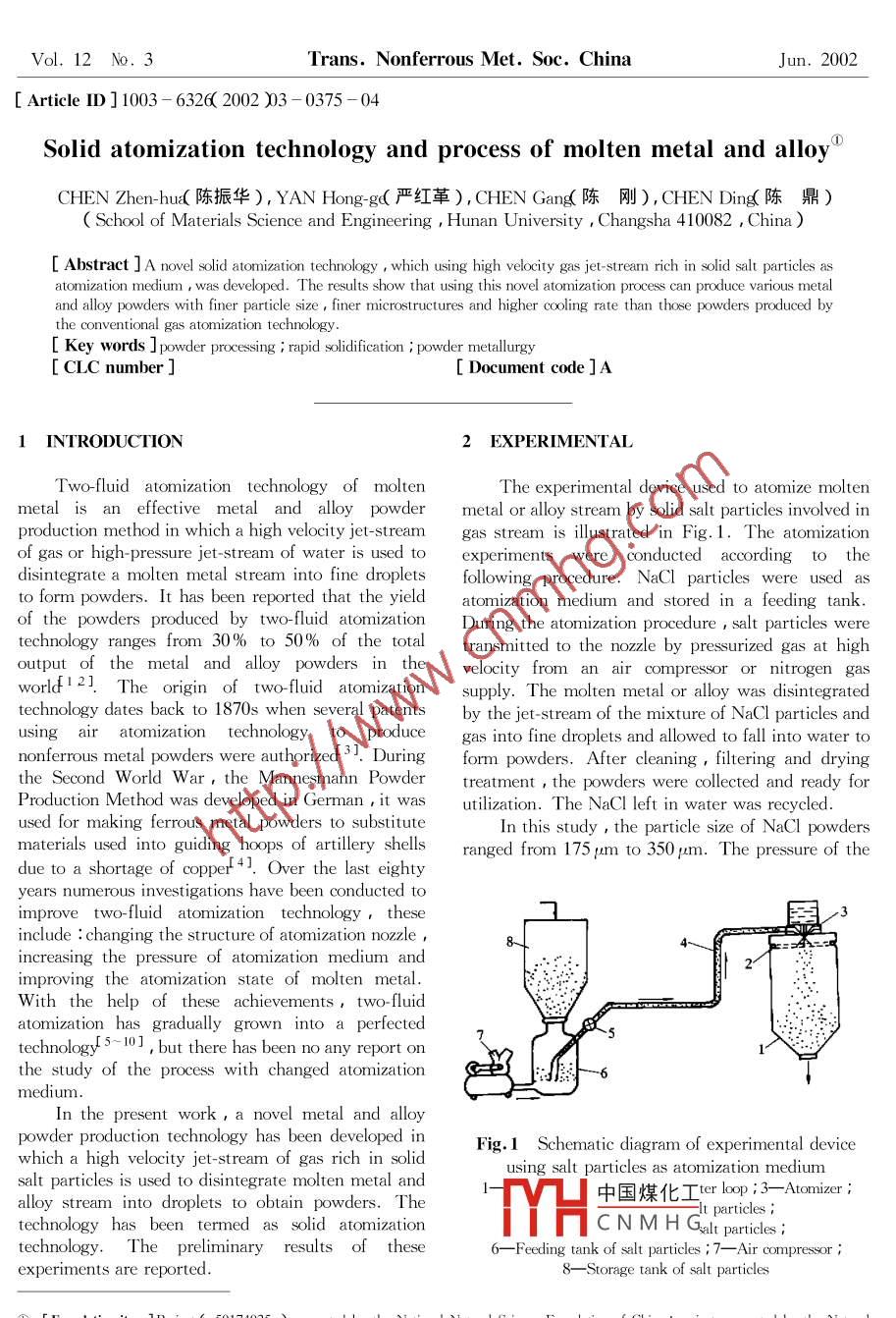 Vol.12 No. 3Trans. Nonferrous Met. Soc. ChinaJun.2002[ Article ID] 1003 - 6326( 2002 )3- 0375-04.Solid atomization technology and process of molten metal and alloyCHEN Zhen-hu:(陳振華), YAN Hong-g(嚴(yán)紅革),CHEN Gang(陳剛),CHEN Ding(陳鼎)( School of Materials Science and Engineering , Hunan University , Changsha 410082 , China )[ Abstract ] A novel solid atomization technology , which using high velocity gas jet- stream rich in solid salt particles asatomization medium , was developed. The results show that using this novel atomization process can produce various metaland alloy powders with finer particle size , finer microstructures and higher cooling rate than those powders produced bythe conventional gas atomization technology.[ Key words ] powder procssing ; rapid solidification ; powder metallurgy[ CLC number ][ Document code ]A1 INTRODUCTION2 EXPERIMENTALTwo-fluid atomization technology of moltenThe experimental device used to atomize moltenmetal is an effective metal and alloy powdermetal or alloy stream by solid salt particles involved inproduction method in which a high velocity jet-streamgas stream is ilustrated in Fig. 1. The atomizationof gas or high- pressure jet -stream of water is used toexperiments were conducted according to thedisintegrate a molten metal stream into fine dropletsfollowing procedure. NaCl particles were used asto form powders. It has been reported that the yieldatomization medium and stored in a feeding tank.of the powders produced by two-fluid atomizationDuring the atomization procedure , salt particles weretechnology ranges from 30% to 50% of the totaltransmitted to the nozzle by pressurized gas at highoutput of the metal and alloy powders in thvelocity from an air compressor or nitrogen gasworld121 The origin of two fluid atomizationsupply.' The molten metal or alloy was disintegratedtechnology dates back to 1870s when several patentsby the jet-stream of the mixture of NaCl particles andusing air atomization technology to producegas into fine droplets and allowed to fall into water tononferrous metal powders were authorized3l. Duringform powders. After cleaning , filtering and dryingthe Second World War , the Mannesmann Powdertreatment,the powders were collected and ready forProduction Method was developed in German , it wasutilization. The NaCl left in water was recycled.used for making ferrous metal powders to substituteIn this study , the particle size of NaCl powdersmaterials used into guiding hoops of artillery shellsranged from 175 pum to 350 pum. The pressure of thedue to a shortage of copper 41. Over the last eightyyears numerous investigations have been conducted toimprove two-fluid atomization technology ,these了include : changing the structure of atomization nozzle ,8increasing the pressure of atomization medium andimproving the atomization state of molten metal.With the help of these achievements ,two fluidatomization has gradually grown into a perfected?A5technology~ 101,but there has been no any report onhe study of the process with changed atomization↓medium.In the present work , a novel metal and alloypowder production technology has been developed inFig. 1 Schematic diagram of experimental devicewhich a high velocity jet-stream of gas rich in solidusing salt particles as atomization mediumsalt particles is used to disintegrate molten metal and中國煤化工ter lop;3- -Atomizer;lloy stream into droplets to obtain powders. TheIt particles ;technology has been termed as solid atomizationTYHC N M H Galt pricls;technology.The preliminary results of these6- -Feeding tank of salt particles ; 7- Air compressor ;experiments are reported.8- -Storage tank of salt particles①[ Foundation ite1Project ( 50174025 ) spprted by the National Natural Science Foundation of China ; project spprted by the NaturalDoctorate' FUm8Education Minister of China[ Received date ]2001 - 12 - 03 ;[ Accepted date ]2002 - 02- 27376.Trans. Nonferrous Met. Soc. ChinaJun.2002high velocity jet-stream of air or nitrogen gas wasTable 1 Comparison of particle size between0.9士0.1MPa. The volume flow rates of the air orgas atomized powders and powders atomized bynitrogen gaswere 6m/min and 3. 3 m2/minsolid salt particlesrespectively. Induction heating was adopted. TheAlloy or Sample Mean particle ParticleAtomizationsuperheat of the molten metal or alloy was betweenmetalnumbersize/ pumsize/ (umtechnology150K and 200K. The diameter of the melt streamAl-12%Si 1-188.2229. 19 Gas atomizationwas 3.5~ 3.8mm. The flow rate of NaCl particlesAl-12%Si1-242. 7313.27 Solid atomizationwas 1.5~4. 0 kg/ min.A laser diffraction particle size measuring meterb2-179. 448.65 Gas atomizationmade by Malvern Instruments Cooperation in Britain2b2-245. 414. 06 Solid atomizationand a Fisher Particle Size Measuring Meter were usedSn3-178. 1815. 39 Gas atomizationto test particle size of the powders. Standard .6n3-236.697.26 Solid atomizationmetallography techniques were used to examine themicrostructure of the particles. Chemical analyzingZn4-176. 428.64 Gas atomizationwas used to measure the residual NaCl content in the4-244.303.89 Solid atomizationas- prepared powders.)u5-184.2228. 67 Gas atomization3 RESULTS AND DISCUSSION5-240.2814.26 Solid atomization3. 1Mean particle size and particle sizedistribution of solid atomized powders3.2Effect of atomization process parameters onA series of comparative experiments wereparticle size of metal powdersconducted to examine the atomization effect of moltenIn this technology , the state of salt particles is ametal using solid salt particles. The mean particle sizekey parameter. Its effect on particle size of thof the produced powders andtheir particle sizeatomized powders was systematically investigated.distribution were measured. The results are given inThe result shows that the higher the mass fluid rateTable 1 and Table 2.and velocity of salt particles and the finer the saltThe mean particle size of NaCl atomized powdersparticles,the finer 