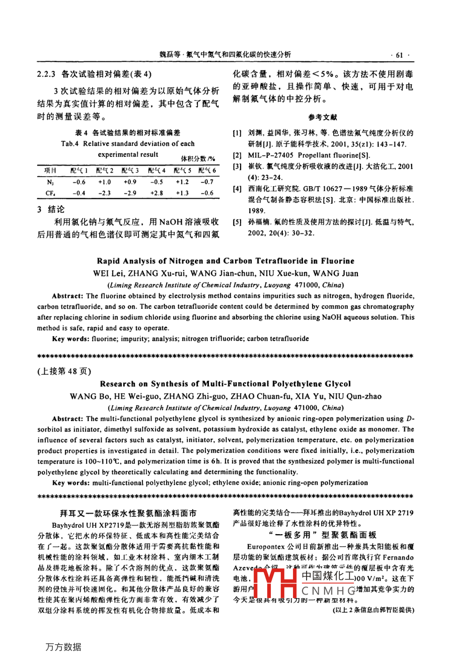 化學(xué)推進(jìn)劑與高分子材料Chemical Propellants Polymeric Materials2010年第8卷第2期·研究與開發(fā)多官能度聚乙二醇的合成研究王波,何偉國,張志國,趙傳富,夏宇,牛群釗(黎明化工研究院,河南洛陽471000)摘要:以D-山梨醇為引發(fā)劑,二甲亞砜為溶劑,氫氧化鉀為催化劑,環(huán)氧乙烷為單體,陰離子開環(huán)聚合合成了多官能度聚乙二醇。詳細(xì)考察了催化劑、引發(fā)劑、溶劑、聚合溫度等因素對聚合產(chǎn)物的性能影響。初步確定了聚合條件,聚合溫度100-110℃,聚合時間6h。通過官能度的理論計算和測試證明合成的聚合物為多官能度聚乙二醇。關(guān)鍵詞:多官能度聚乙二醇;環(huán)氧乙烷;陰離子開環(huán)聚合中圖分類號:TQ223.16文獻(xiàn)標(biāo)識碼:A文章編號:1672-2191(2010)02-0046-03隨著生物技術(shù)的飛速發(fā)展,越來越多具有生鉀、N,N-二甲基甲酰胺:天津市科密歐化學(xué)試物活性的多肽、蛋白質(zhì)和酶被用于臨床治療。但劑有限公司;二甲亞砜:成都市科龍化工試劑這些生物大分子直接用于人體時還存在快速排廠。以上試劑均為分析純,且試劑在使用前均經(jīng)除、被人體中的蛋白酶降解和免疫反應(yīng)等缺陷。過干燥處理聚乙二醇(PEG)對人體無毒,并具有生物相容性1.2多官能度PEG的合成和水溶性,因此被廣泛應(yīng)用于修飾蛋白質(zhì)、多肽將一定量的起始劑、催化劑和溶劑加入反應(yīng)及酶甚至一些小分子藥物。在當(dāng)今藥物傳送領(lǐng)瓶中,裝上分餾柱,油浴加熱,攪拌下于75-85域,PEG修飾是一類廣泛使用的重要方法,特℃真空脫水3~4h制得引發(fā)劑。將制備好的引發(fā)別是在改善蛋白質(zhì)及多肽藥物的臨床應(yīng)用方面被劑移入已干燥并升溫至90-130℃的聚合釜中,認(rèn)為是目前最成功的技術(shù)之一。但該技術(shù)在真空充N2置換3次,通入環(huán)氧乙烷(EO反應(yīng),通實際應(yīng)用中還存在一些問題,主要表現(xiàn)在蛋白質(zhì)過控制EO進(jìn)料量及冷卻水量調(diào)節(jié)體系溫度在80藥物經(jīng)線型PEG修飾后,通常會導(dǎo)致其生物活性110℃,保證反應(yīng)平穩(wěn)進(jìn)行,EO進(jìn)完后,繼續(xù)大大降低。近年來的研究表明”,多臂PEG不反應(yīng)1h,放空,真空除去未反應(yīng)的EO,然后僅可以最大限度地保留被修飾后藥物的生物活于95℃左右出料。產(chǎn)物經(jīng)水稀釋、離子交換、性,而且其特有的“類傘型”結(jié)構(gòu)可以更有效干燥后即得多官能度PEG地保護(hù)蛋白質(zhì)在體內(nèi)不被水解,阻止抗體接近蛋1.3分析方法白質(zhì)藥物,從而大大增加蛋白質(zhì)藥物在體內(nèi)的循131相對分子質(zhì)量的測定環(huán)半衰期,同時大大降低其在體內(nèi)的免疫源性。因此在修飾度相同的情況下,多臂PEG的修飾效儀器:日立635高效液相色譜儀;色譜柱:日立635凝膠滲透色譜(GPC)柱;流動相:四氫果優(yōu)于線形PEG。多臂星型PEG用于醫(yī)藥修飾具呋喃,使用前經(jīng)蒸餾處理,并用孔徑為045μm有良好的應(yīng)用前景6-10。文中采用D-山梨醇為引發(fā)劑、氫氧化鉀為催的過濾膜過濾;流速:1.0mL/min化劑與環(huán)氧乙烷開環(huán)聚合合成多官能度PEG。探GPC柱的標(biāo)準(zhǔn)方程討了催化劑、引發(fā)劑、溶劑和聚合溫度等因素對lgM=5.9029-0.2376V多官能度PEG性能影響的規(guī)律。式中V為流動相的體積,求得重均相對分子質(zhì)量(M)、數(shù)均相對分子質(zhì)量(M)。1實驗部分1.32羥值的測定1.1主要原料平田郃芒二田酐-吡啶法,在115環(huán)氧乙烷:揚子石化廠;山梨醇、氫氧化℃回中國煤化工劑催化與溶解。CNMHG收稿日期:2009-08-31作者簡介:王波(1972-),男,高級工程師,從事推進(jìn)劑原材料和高分子合成電子信箱: lyheweiguo@163com王波等·多官能度聚乙二醇的合成研究在吡啶中的鄰苯二甲酸酐進(jìn)行酯化反應(yīng),過量的發(fā)生不同程度的爆聚現(xiàn)象,結(jié)果導(dǎo)致產(chǎn)品顏色較鄰苯二甲酸酐用氫氧化鈉標(biāo)準(zhǔn)溶液滴定。深,副產(chǎn)物較多。KOH的催化活性較低,反應(yīng)1.33官能度的計算過程的溫度較易控制,反應(yīng)較平穩(wěn),因而聚合產(chǎn)聚合物M、羥值和數(shù)均官能度()之間有如物顏色較淺。因此,選擇氫氧化鉀作為制備多官下的計算關(guān)系:能度PEG的催化劑。以氫氧化鉀為催化劑時,催f=羥值xMn/(1000×561)化劑用量以0.6%為宜2結(jié)果與討論23溶劑種類及用量對多官能度PEG性能的影響由于起始劑D-山梨醇和KOH都是固體,故2.1引發(fā)劑用量對多官能度PEG性能的影響在陰離子開環(huán)聚合中,引發(fā)劑既控制聚合產(chǎn)制備引發(fā)體系時難以攪拌,反應(yīng)不完全。選用物的相對分子質(zhì)量,又控制產(chǎn)物的官能度。選用D-山梨醇為引發(fā)劑制備多官能度PEG,表1為其溶劑,在其他條件固定的情況下,考察溶劑種類他條件固定的情況下,D-山梨醇用量對聚合產(chǎn)及用量對多官能度PEG性能的影響,結(jié)果見表3。物性能的影響。表3溶劑種類及用量對多官能度聚乙二醇性能的影響Tab 3 Influence of solvent types and amount表1引發(fā)劑用量對多官能度聚乙二醇性能的影響properties of multi-functional polyethylene glycolTab. I Influence of initiator amount on properties ofmulti- functional polyethylene glycol溶劑用量m(DMSO)羥值相對分子質(zhì)量官能度mD-山梨醇n(EO)設(shè)計值實測后,理論值實測m(D-山梨醇)m(D-山梨醇)(mg.